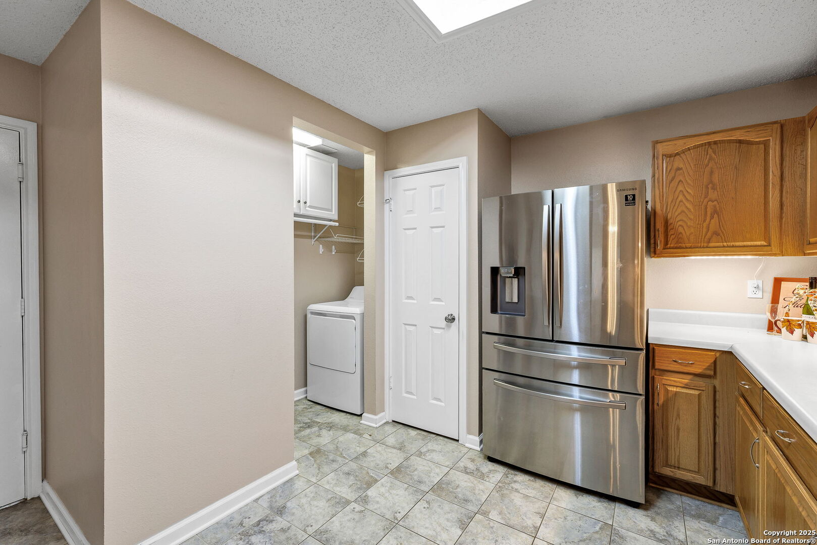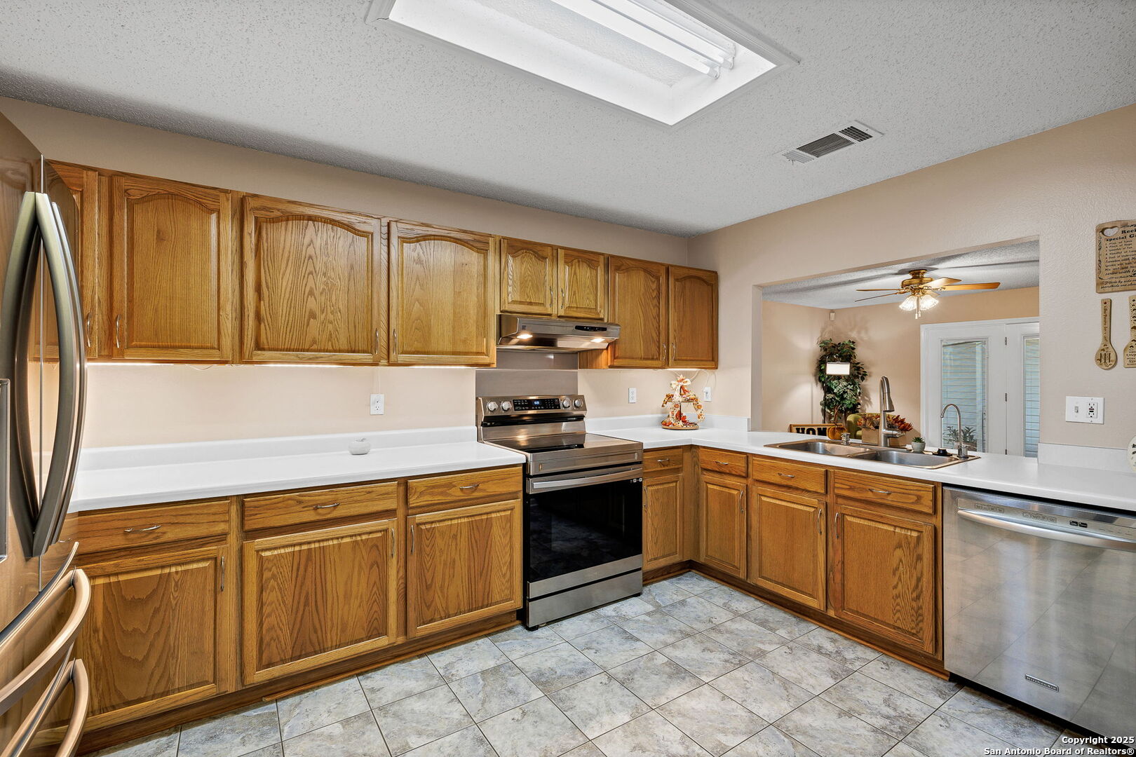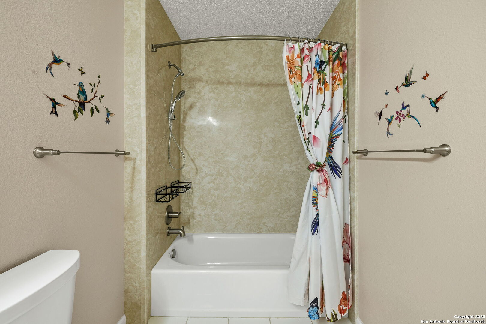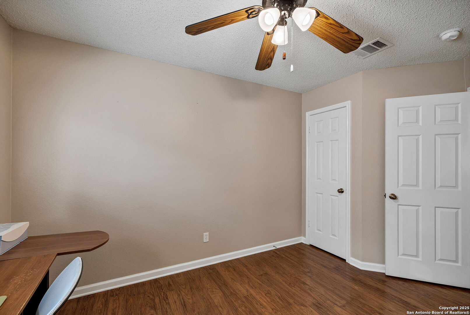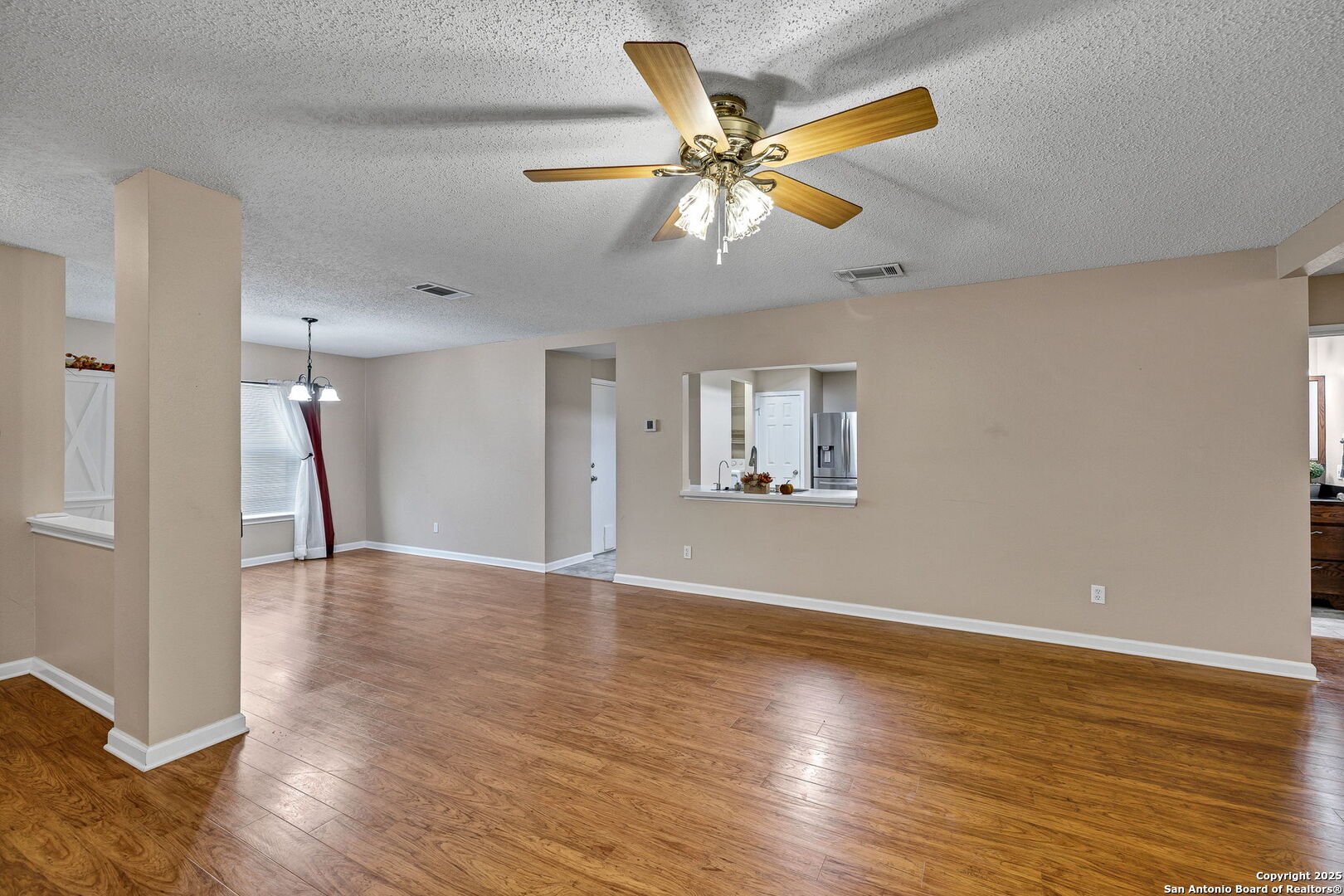 Like-new, immaculate, and move-in ready! This charming 3 BR/2 BA, 1,389 sq ft home has been meticulously cared for. Surrounded by lush landscaping and large shade trees, it offers an open, flowing floor plan with a spacious living area, hardwood floors throughout, ceiling fans, and a separate dining space. The sleek kitchen features tile flooring, stainless steel appliances, and an adjacent laundry area. The living room includes French doors with custom blinds and windows. The primary bedroom is large and boasts a custom, updated bathroom. Recent upgrades include new custom windows (2018), a new roof (2016), and a HVAC (2024). The living area opens to a private, covered side patio with a ceiling fan, leading to a spacious backyard. The property includes an oversized storage shed with electricity, all situated on a greenbelt. An outdoor seating area with a brick fire pit offers stunning views of wildlife and sunsets beyond the fence line. The insulated and organized garage is as pristine as the home, featuring added attic flooring for extra storage. If you're looking for a perfect home in an ideal location at a great price, this is it!
