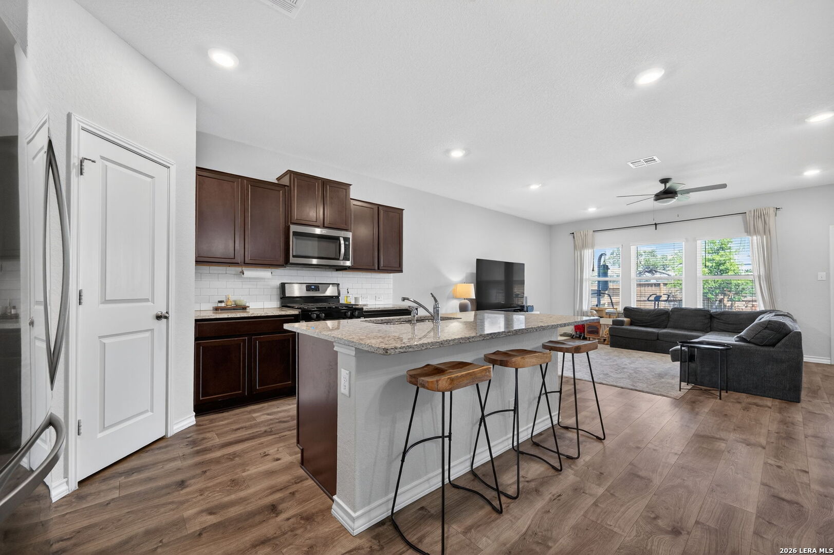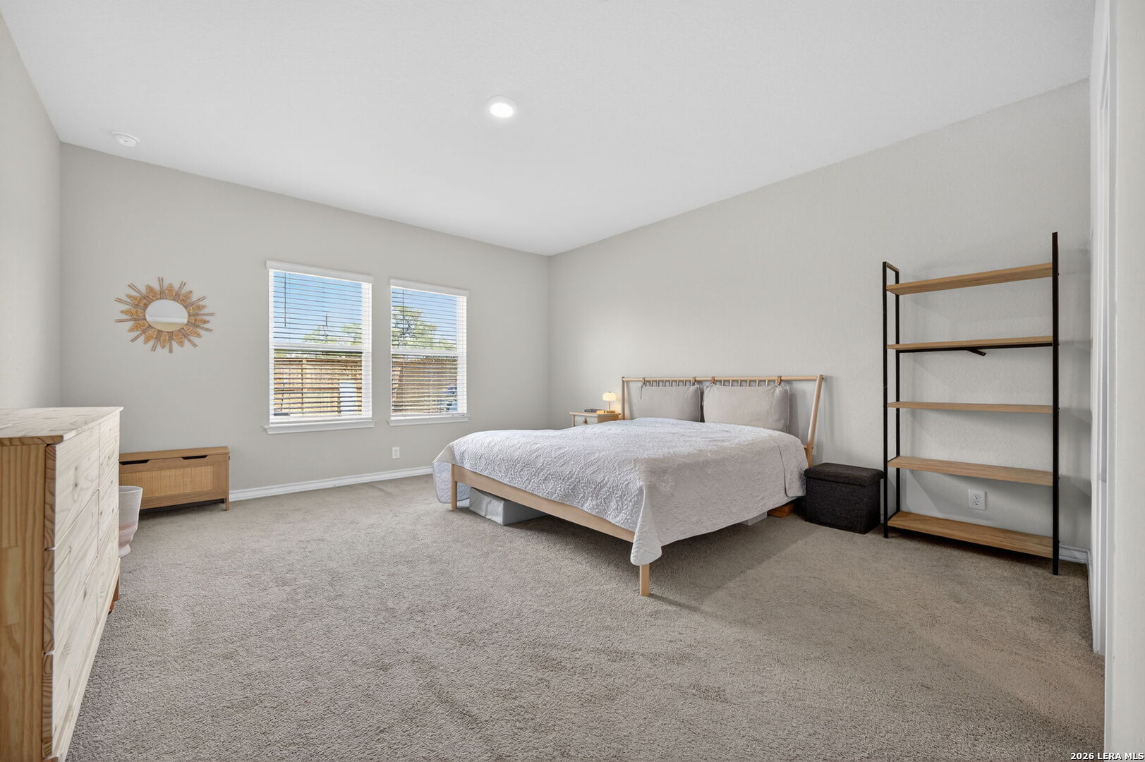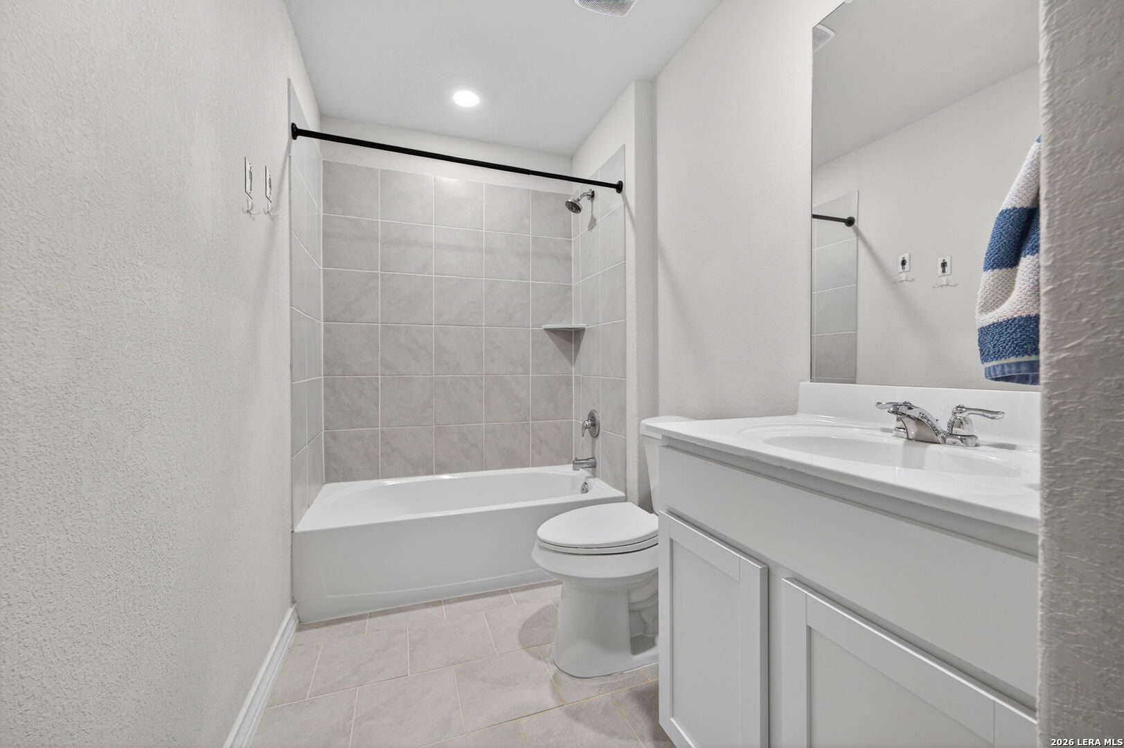 Ready for move-in April 15th. This lovely two-story home offers 2,257 sq. ft., 4 bedrooms, and 3 full bathrooms. Just off the inviting front entry, you'll find a secondary bedroom, full bathroom, utility room, and a grand kitchen. The entry opens into a spacious open-concept layout featuring the kitchen, dining area, and living room, perfect for both everyday living and entertaining. The kitchen is beautifully designed with granite countertops, stainless steel appliances, a gas range, classic white subway tile backsplash, a large island with dual sinks, and a generous walk-in corner pantry. The private primary suite is located downstairs and features a luxurious walk-in shower, separate water closet, and a spacious walk-in closet. Upstairs, you'll find a versatile game room, two additional bedrooms with walk-in closets, and a third full bathroom. Step outside to enjoy the large covered patio and a professionally landscaped yard with an irrigation system and putting green. The community offers great amenities, including a new pool and playground, and is conveniently located near Highways 281 and 1604, with easy access to shopping and restaurants.
