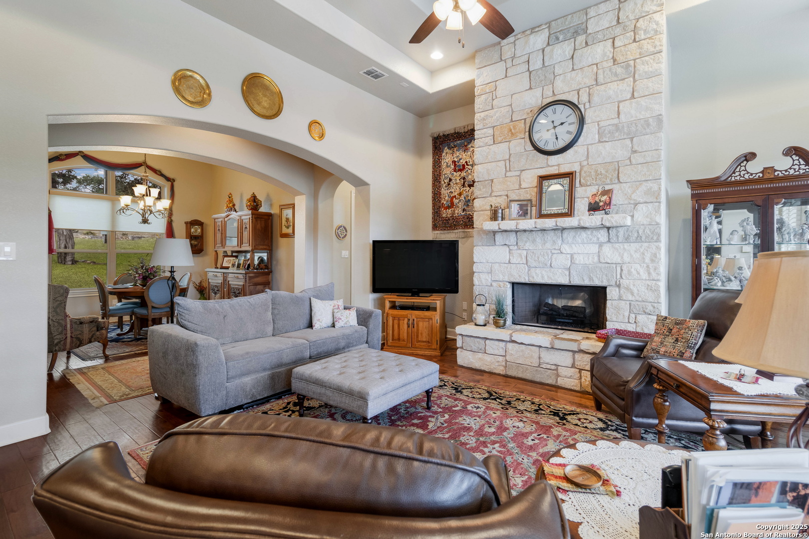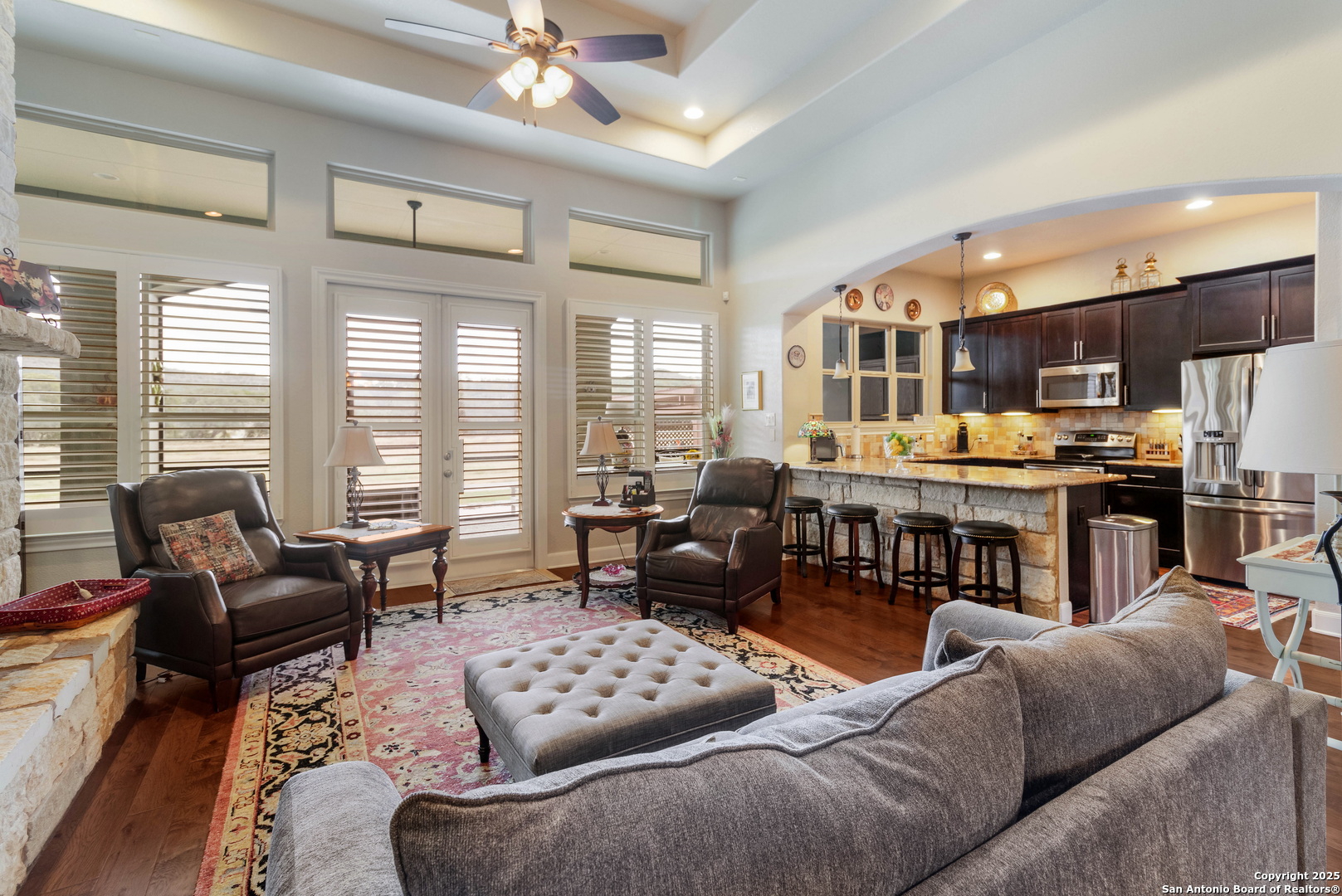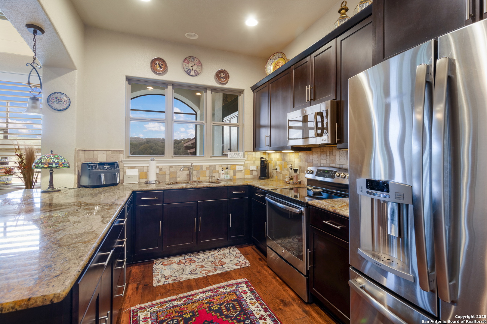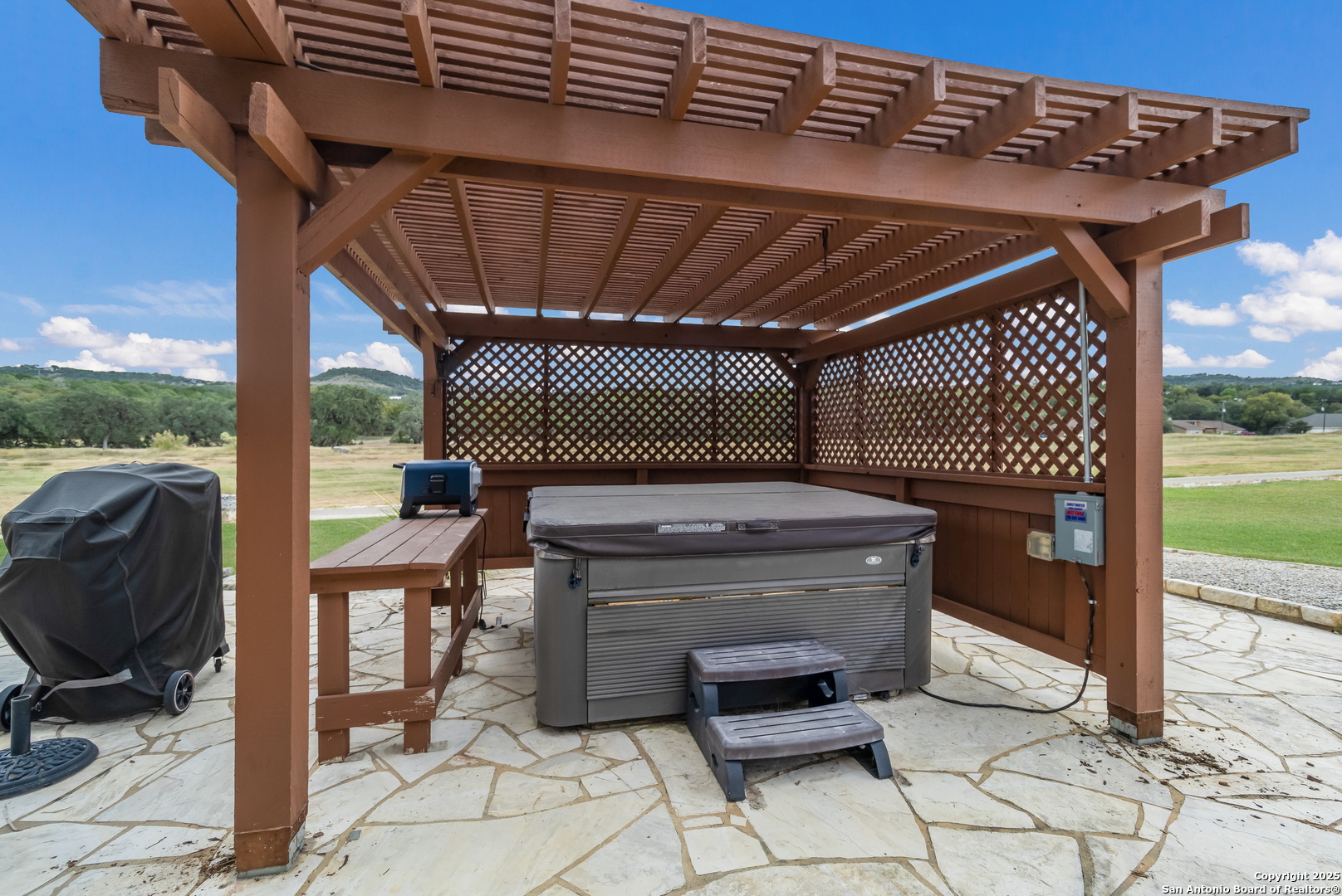 Experience Hill Country living in this beautifully maintained single-story home-featuring an expansive open layout, inviting natural light, and high-quality finishes throughout. Enjoy cooking in the modern kitchen with granite countertops, dark cabinetry, and stainless steel appliances, while the adjoining living room highlights a stone fireplace and scenic backyard views. The spacious primary suite offers a large walk-in closet and a private ensuite bath with a luxurious walk-in shower. Additional bedrooms provide versatility for guest accommodations or a home office. Outdoors, relax in the oversized, screened-in patio or soak in the covered hot tub while overlooking serene, landscaped grounds. The oversized garage also includes an extra bay, ideal for a golf cart or workshop space. Other features include a separate formal dining area, a dedicated laundry room with ample cabinetry, and a flexible floor plan with multiple storage options. The home sits in a picturesque neighborhood near Canyon Lake-offering quick access to recreational amenities, shopping, and dining. Schedule a private tour to discover the comfort and beauty of this exceptional Canyon Lake property.