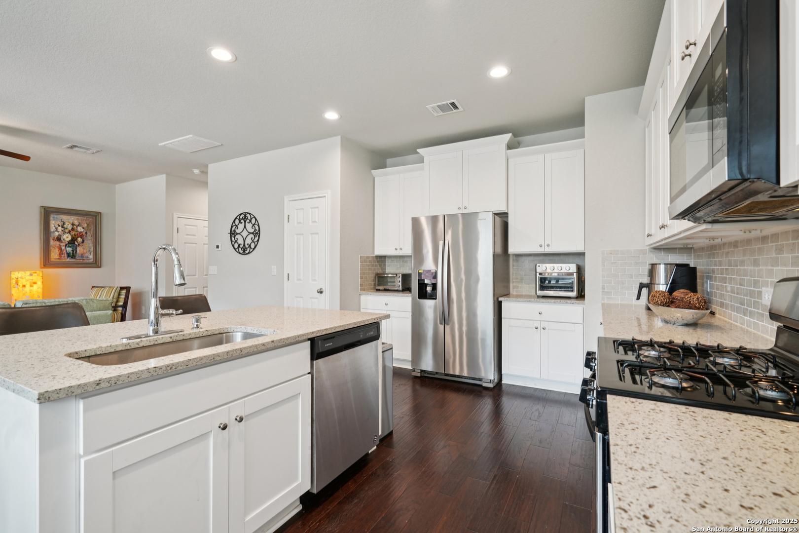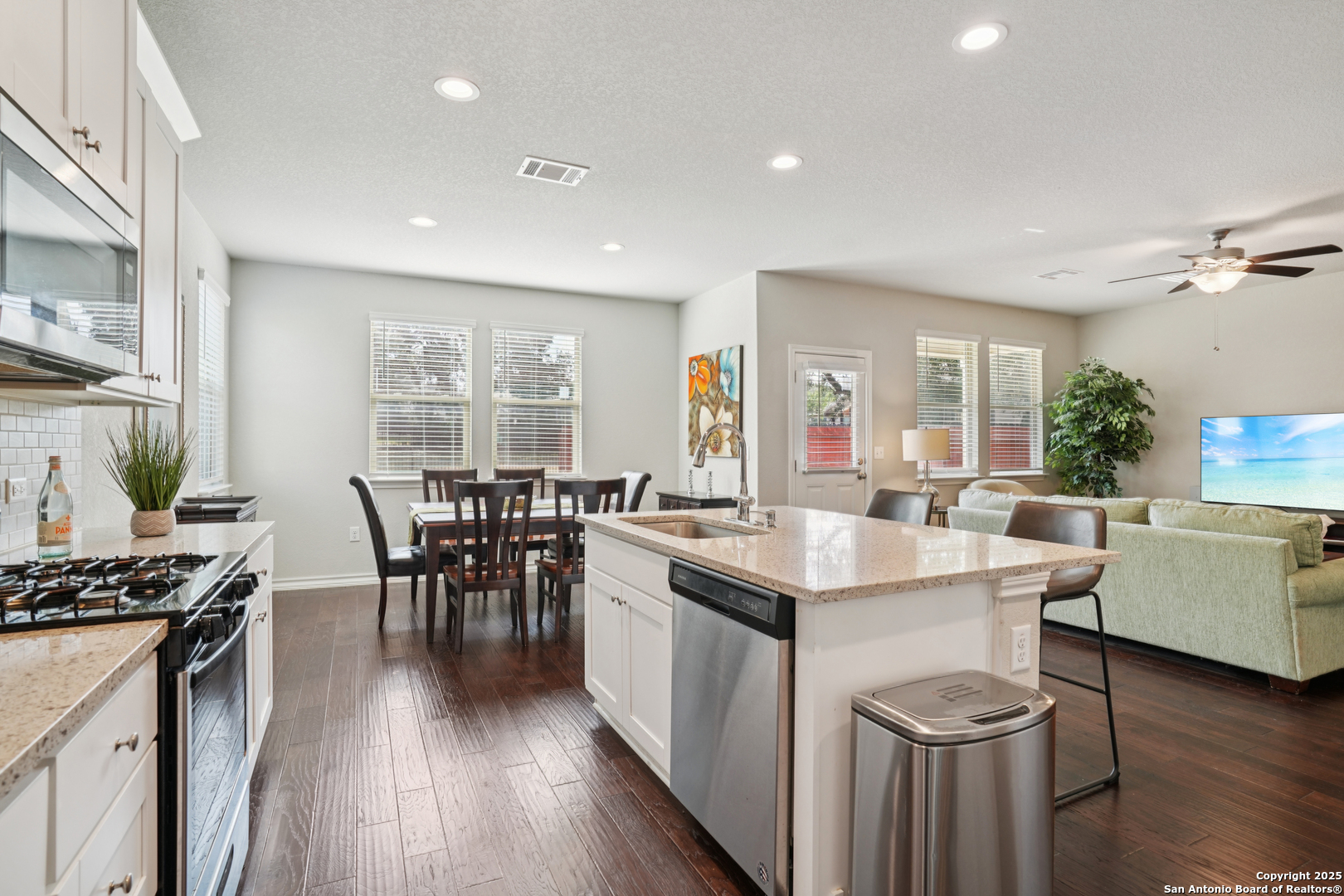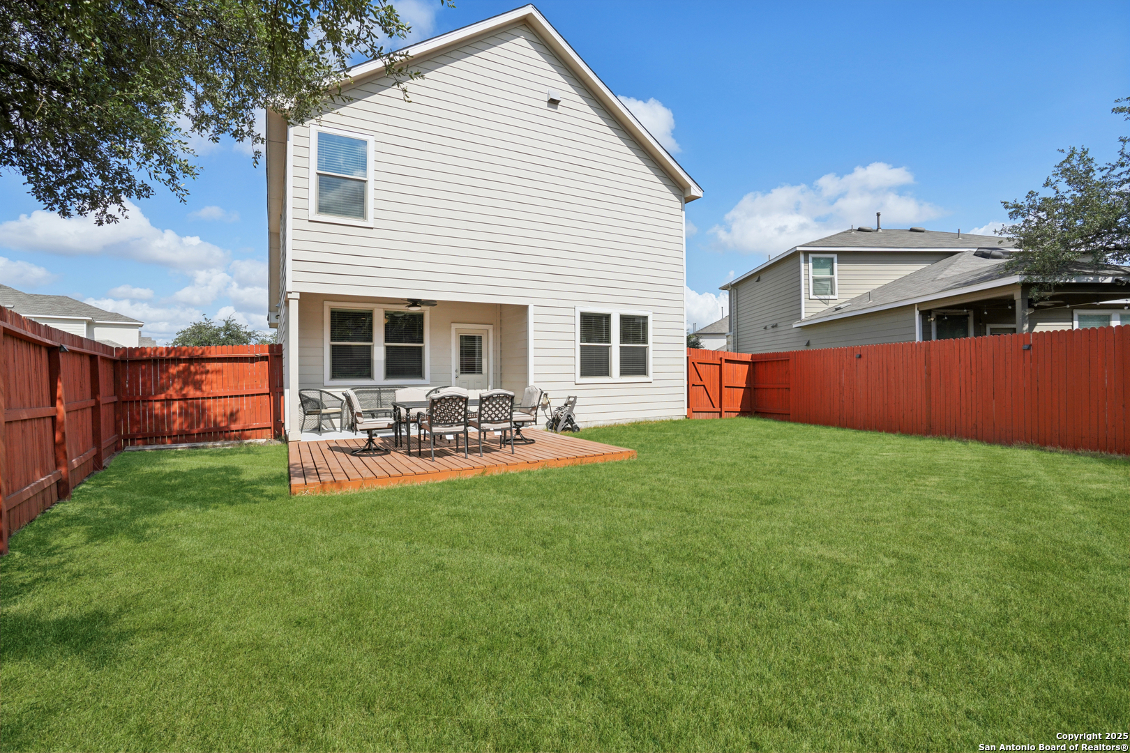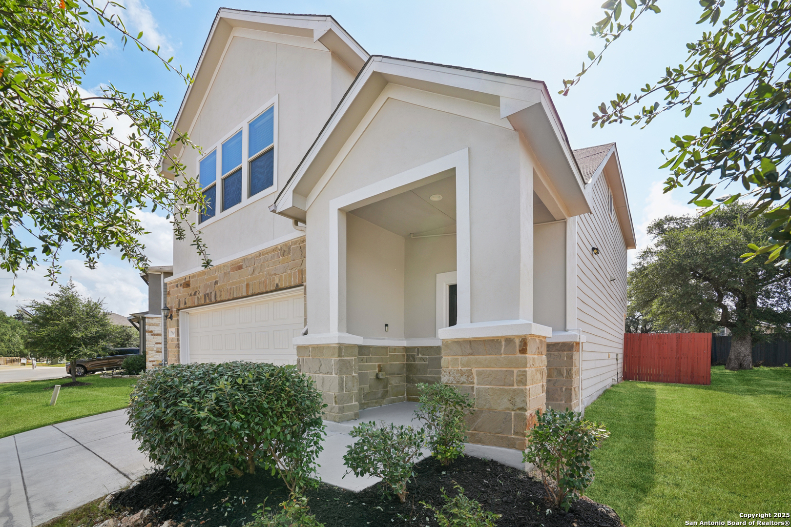 Welcome to this stunning home located in the sought-after gated community of Winding Oaks, within the top-rated NEISD school district! Perfectly designed for comfortable living and effortless entertaining, this home features a bright, open-concept layout where the spacious kitchen flows seamlessly into the family room. Enjoy durable and stylish wood-look tile flooring throughout the first floor. The chef's kitchen is a showstopper with gas cooking, white cabinetry, gray quartz countertops, stainless steel appliances, and a large breakfast bar-ideal for casual dining or hosting guests. Upstairs, you'll find all three generously sized bedrooms, including a versatile flex space perfect for a home office, reading nook, or workout area. The luxurious primary suite offers a spa-like experience with a large walk-in shower, dual quartz vanities, and a walk-in closet. Step outside to a private backyard with no rear neighbors and added privacy on both sides, creating a serene outdoor retreat. Community amenities include a gated entrance, sparkling pool, park, and playground. Centrally located with quick access to Loop 1604, Hwy 281, and I-35. Minutes from Fort Sam Houston, BAMC, Randolph AFB, shopping, dining, and entertainment.
