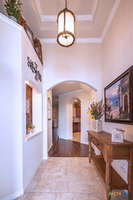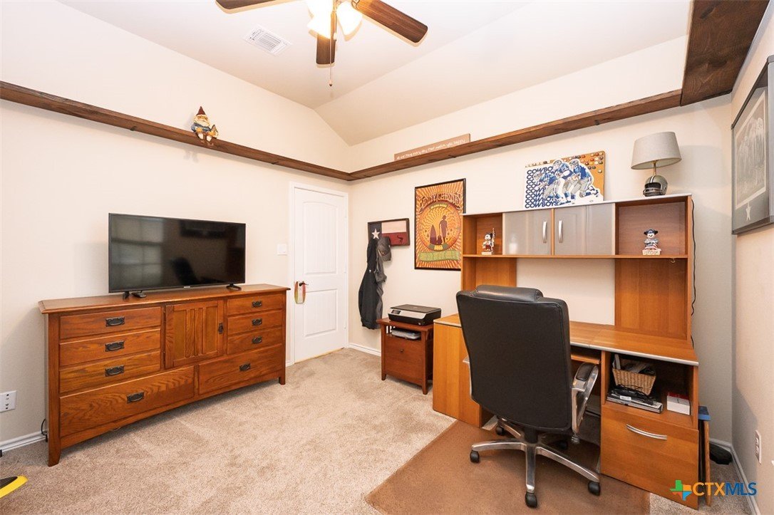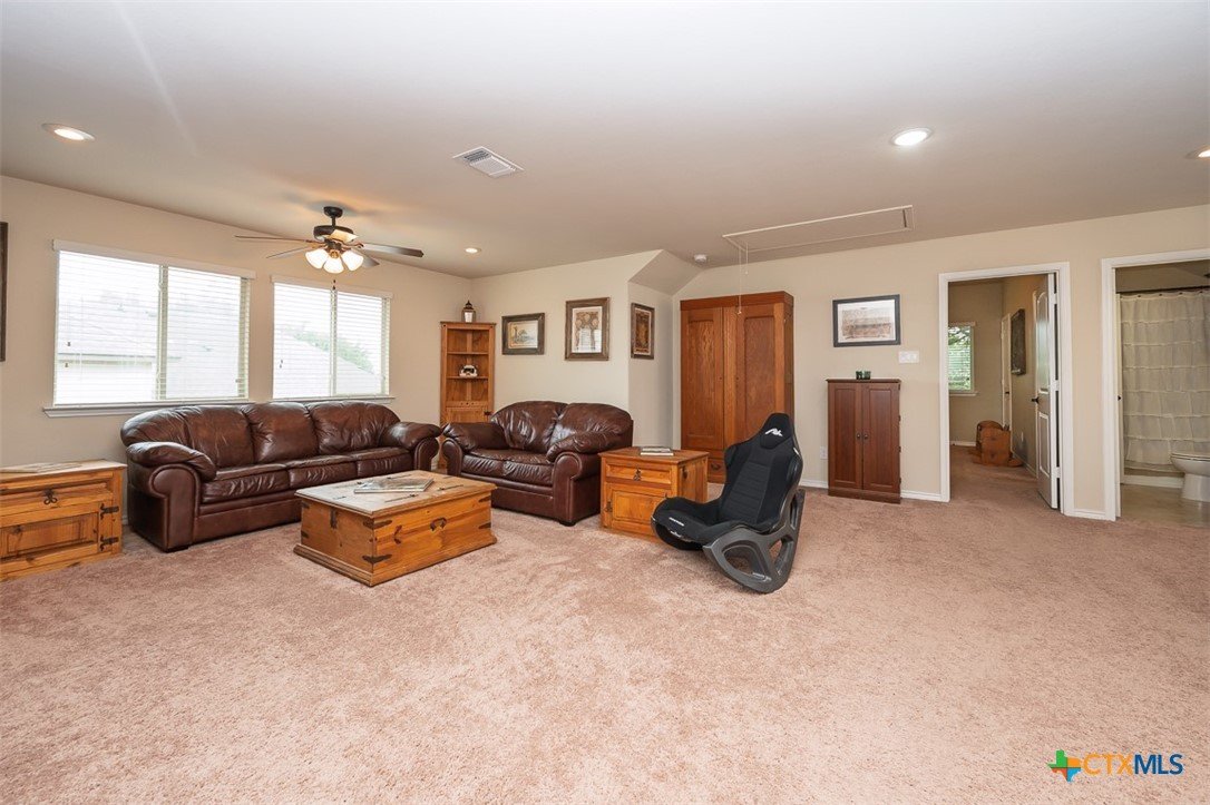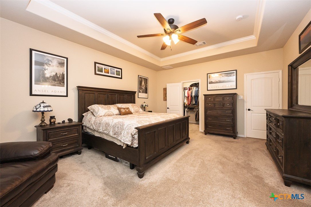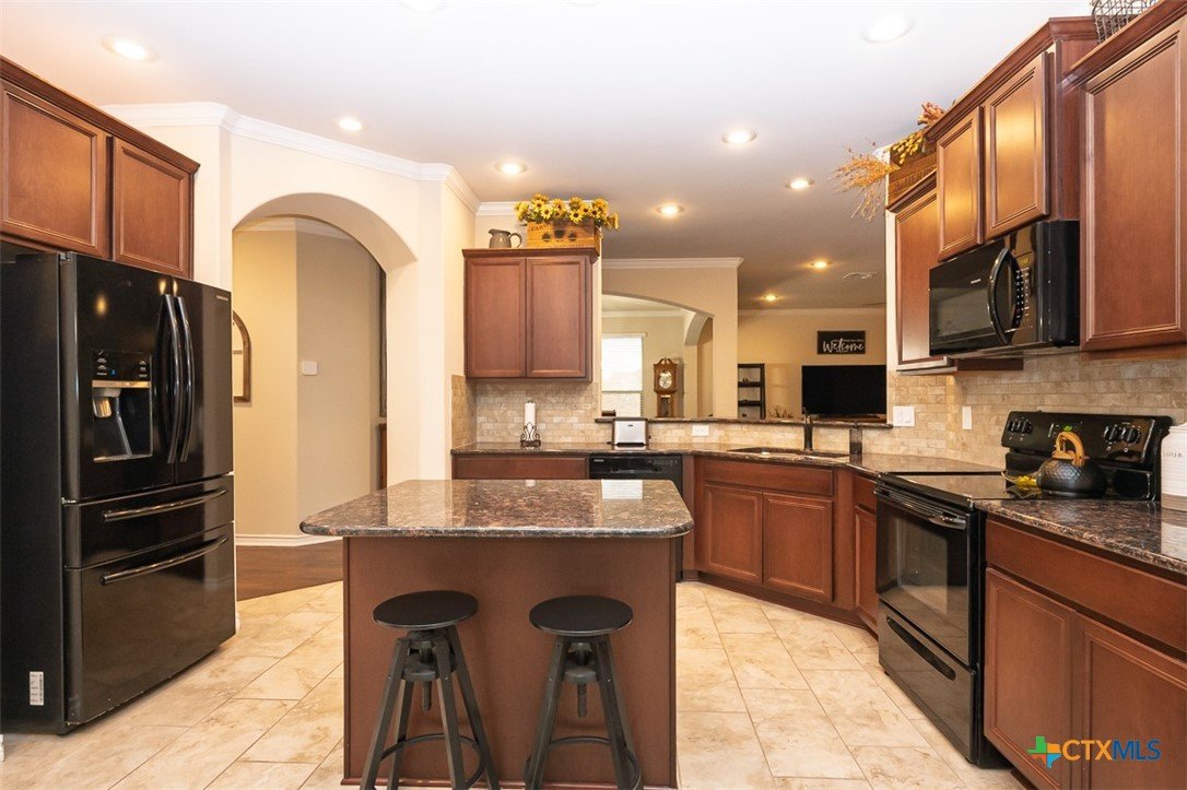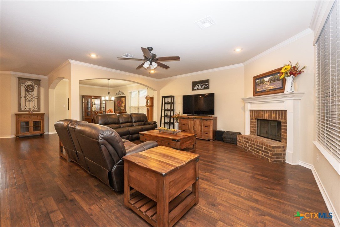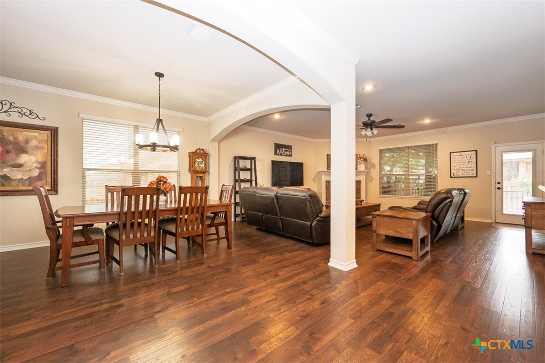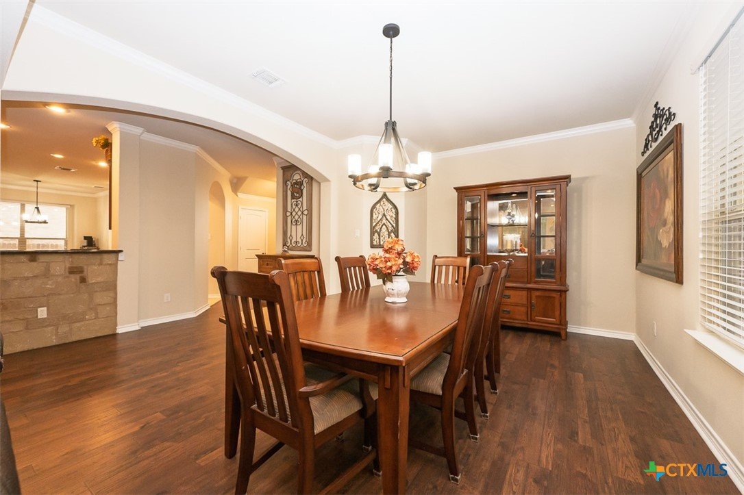 Set in a lake-adjacent neighborhood that keeps you close to the interstate for an easy commute, this spacious home offers the perfect balance of convenience and outdoor living, just minutes from Chalk Ridge Falls and nearby parks with scenic trails and gathering spaces. With over 3,160 square feet, a 3-car garage, and eye-catching curb appeal, this home makes a strong first impression from the moment you arrive. Inside, a welcoming entryway opens to a layout filled with character, including arched entries that add architectural charm throughout. The formal dining room seamlessly flows into a generous great room anchored by a corner fireplace, creating an inviting space for both everyday living and entertaining. The island kitchen is designed to impress, featuring granite counters, abundant cabinet space, and a bright breakfast area for casual meals. Upstairs, a spacious loft provides flexibility for a second living area, game room, or home office. The owner’s suite is a relaxing retreat with a tray ceiling accented by crown molding, while the ensuite bath stands out with a stylish wood accent wall and an upgraded sliding glass door on the shower. Step outside to a backyard designed for enjoyment, complete with a covered patio, mature landscaping, and a storage building for added convenience. Thoughtful updates by the current owner include a roof replaced in 2022, updated dishwasher and refrigerator, wood laminate flooring in the dining and great room, solar screens on all first-floor windows, and freshly painted exterior trim. This home delivers space, style, and a location that makes it easy to enjoy both daily life and the outdoors.