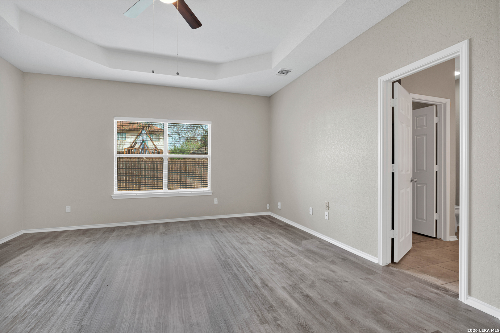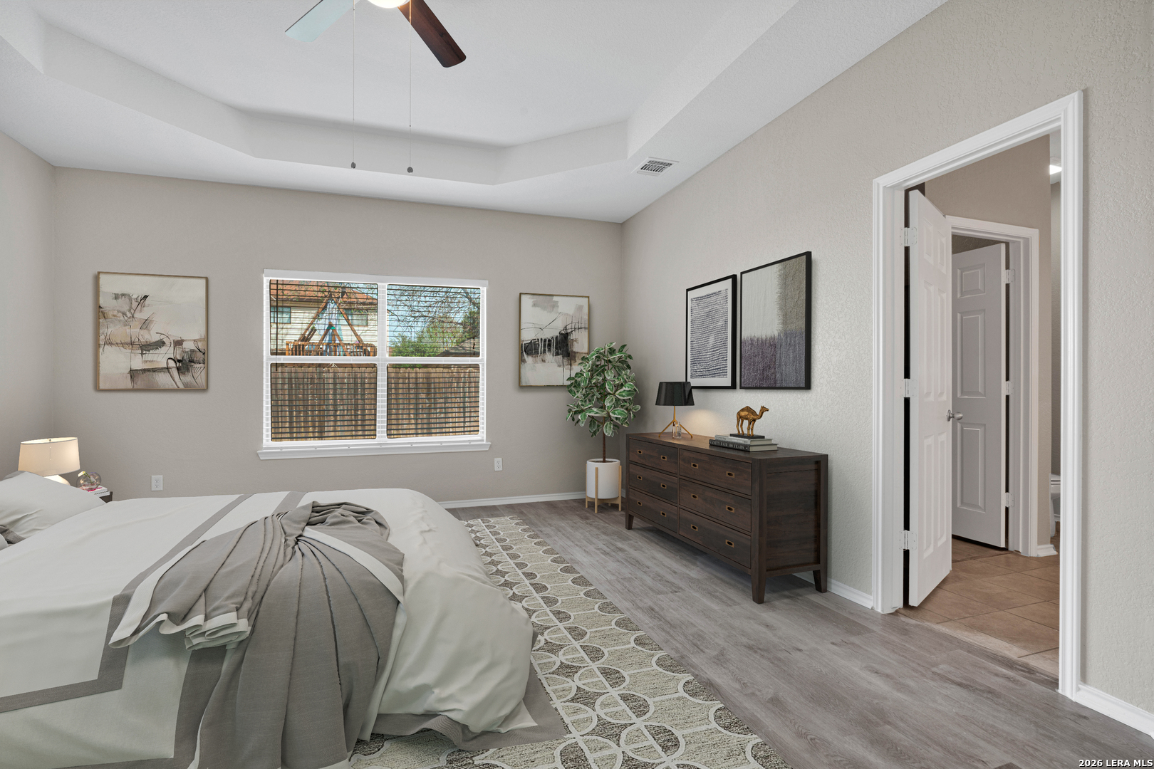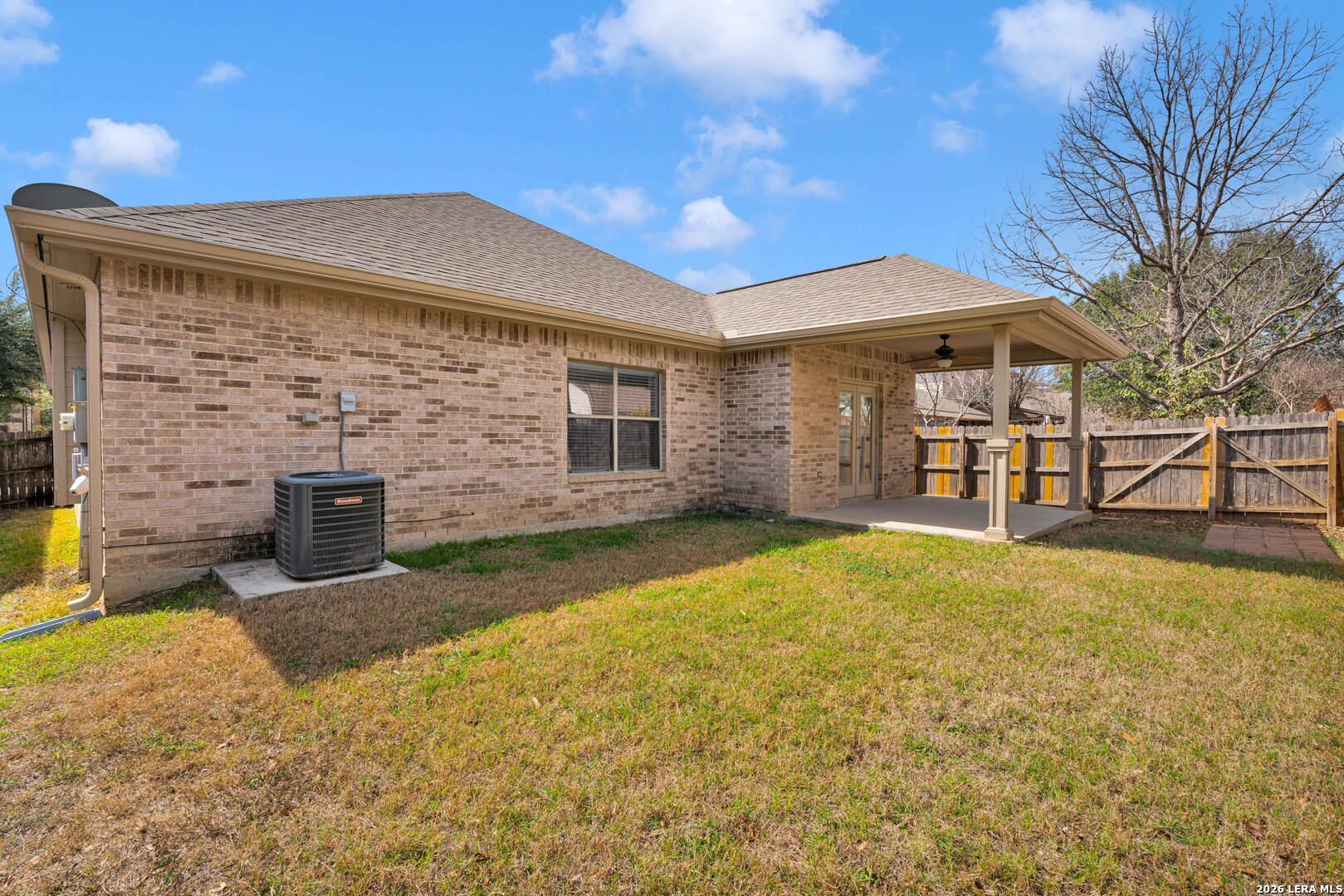 Perfect for multi-generational living, this beautifully designed 4-bedroom, 3-full-bath home features a highly desirable dual-master layout and spacious open living with soaring ceilings, architectural niches, and elegant tray ceilings. All bedrooms include spacious closets and ceiling fans for comfort and storage. The chef-inspired kitchen boasts 42" cabinetry, a pantry, center island, abundant counter and cabinet space, and a bright adjoining dining area - ideal for everyday living and entertaining. The primary suite offers double vanities, a relaxing garden tub, and an impressive oversized spacious shower. Enjoy the durability and curb appeal of four-sides brick construction plus a covered patio perfect for outdoor gatherings. Conveniently located near Loop 1604 and Bandera Road with easy access to University of Texas at San Antonio and shopping/dining at The Shops at La Cantera. Please note that some images in this listing have been virtually staged.