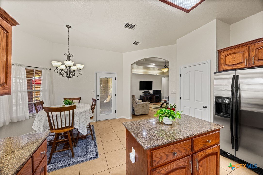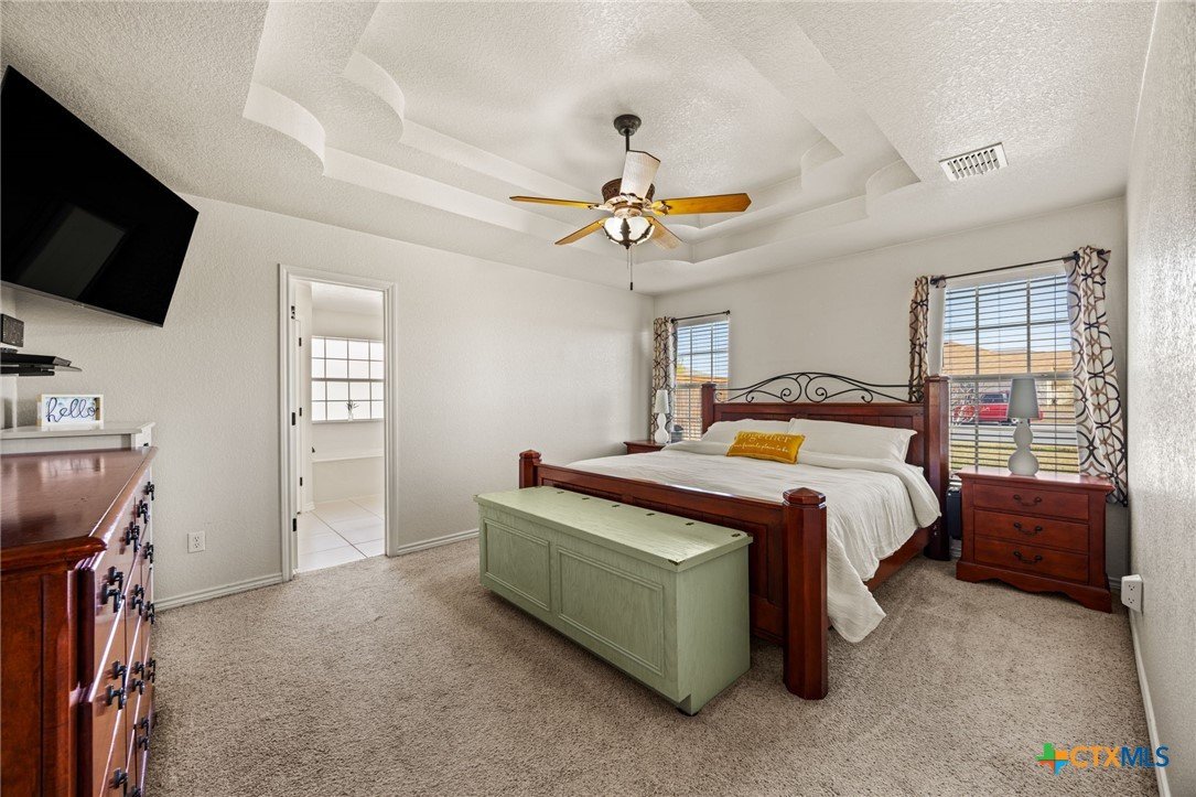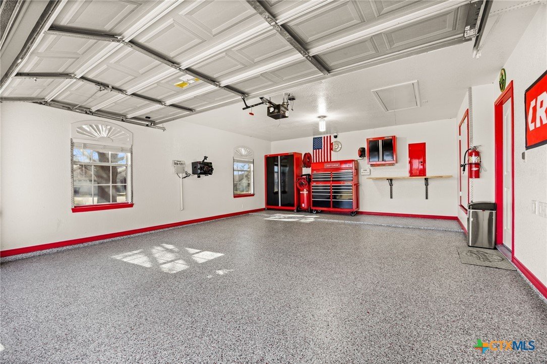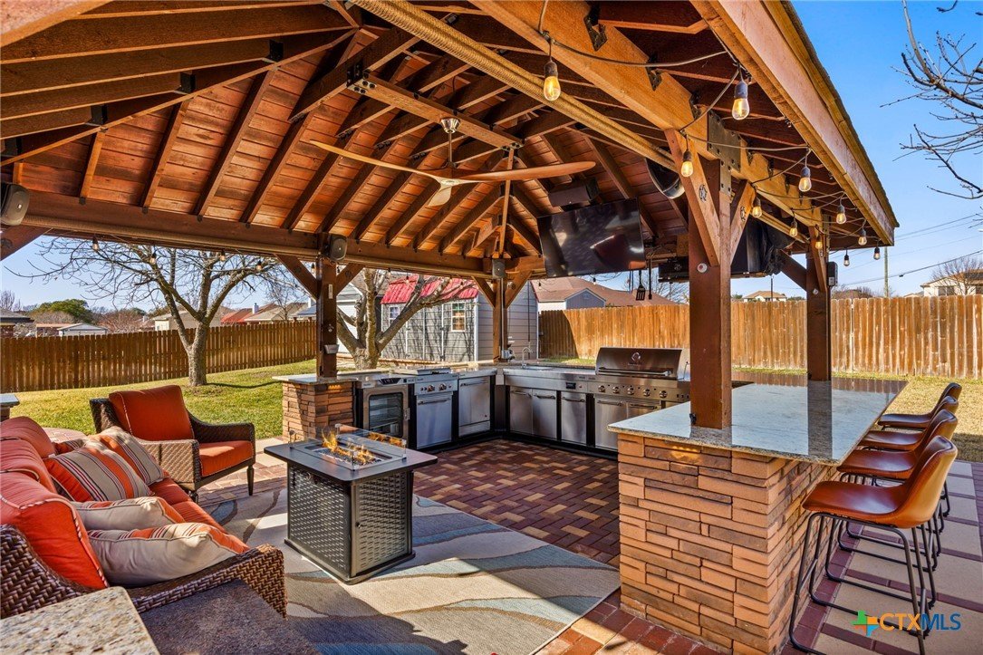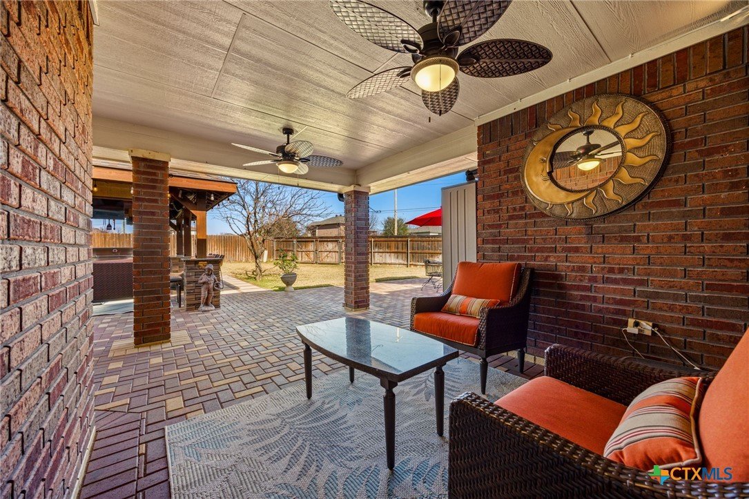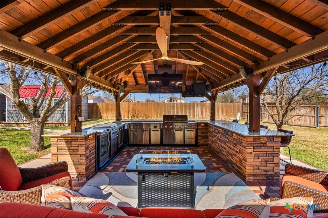 Welcome to this inviting 4 bedroom, 2 bathroom home on a spacious corner lot. This well-designed split floor plan features tray ceilings, tile flooring in the main living areas, and carpeted bedrooms. The kitchen offers plenty of cabinet space and a center island, ideal for both daily living and entertaining. The primary suite includes a relaxing bath with a separate tub and shower. Enjoy outdoor living on the large covered patio with a TV and built-in outdoor kitchen, perfect for year-round entertaining. The fully fenced yard is equipped with an in-ground sprinkler system for easy lawn maintenance. The garage features a durable epoxied floor, adding both style and functionality. Situated on a 0.31-acre lot, the property also includes two storage sheds for added convenience. This home offers the perfect blend of comfort, space, and functionality and is ready for you to make it your own.