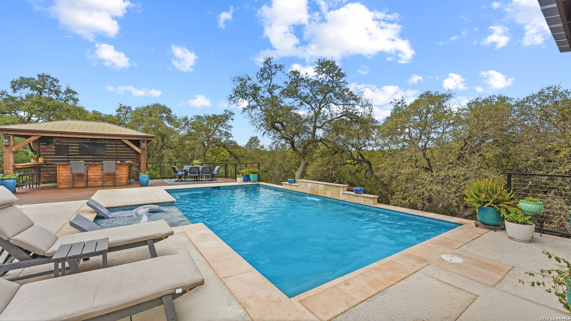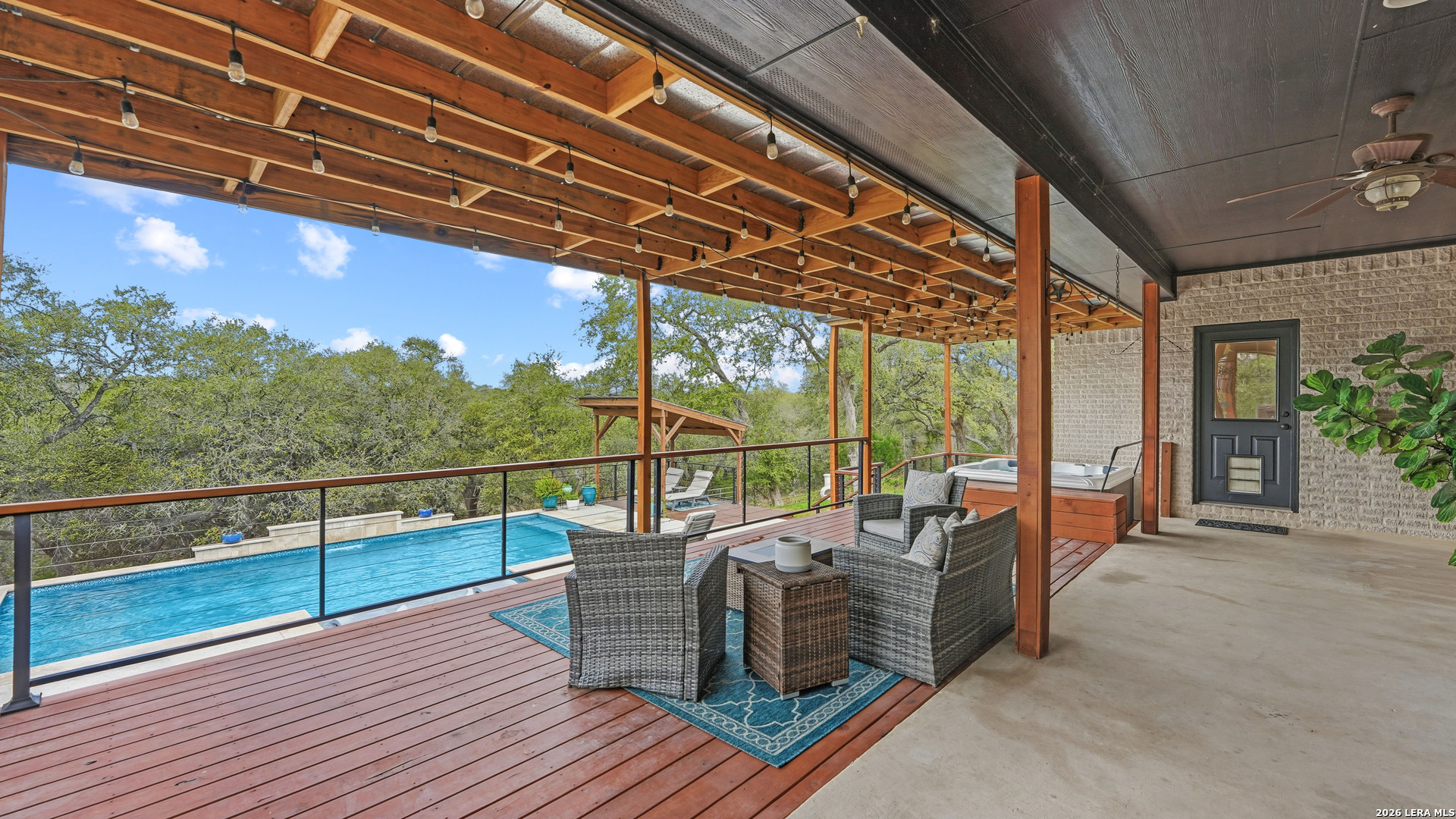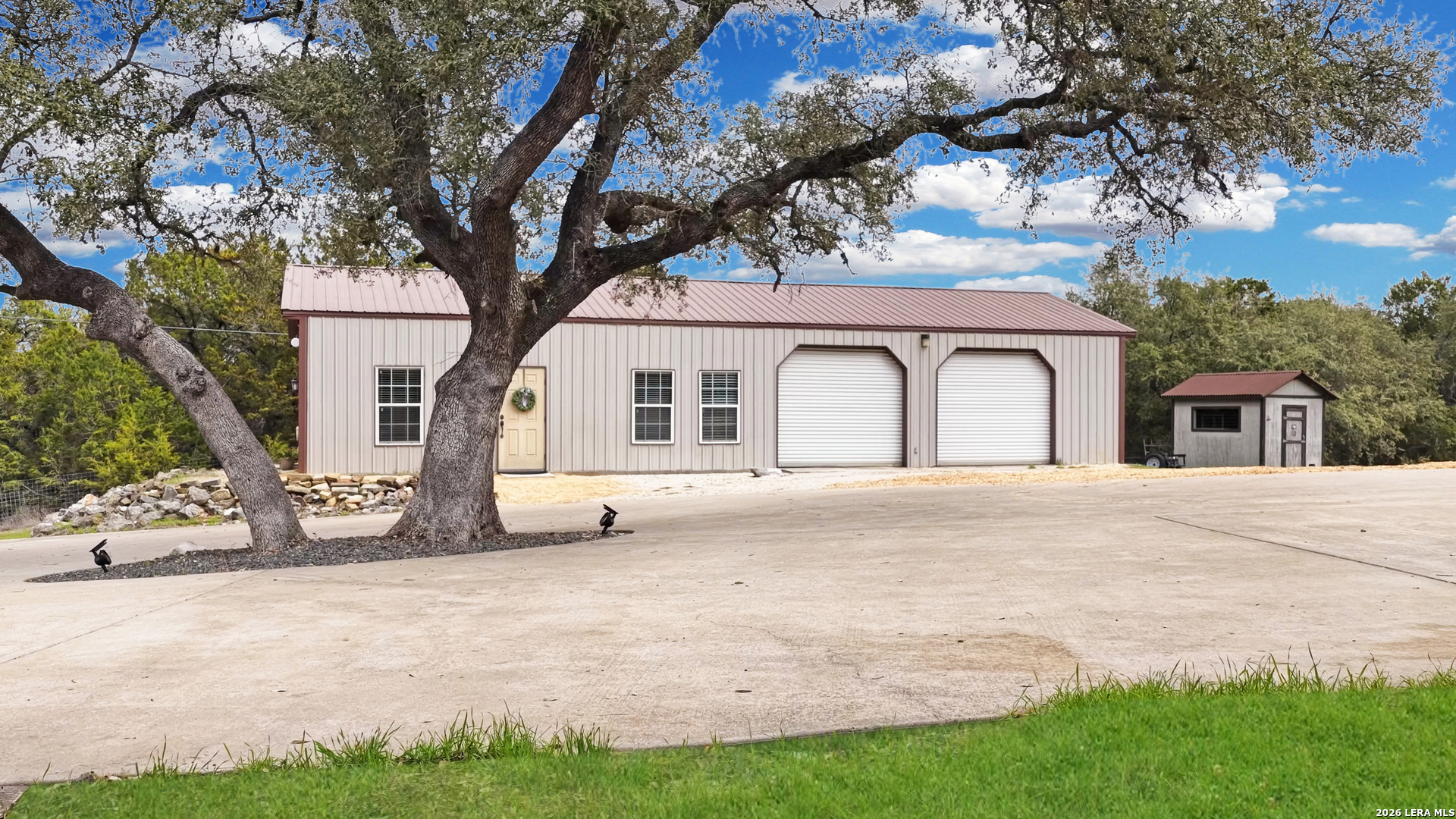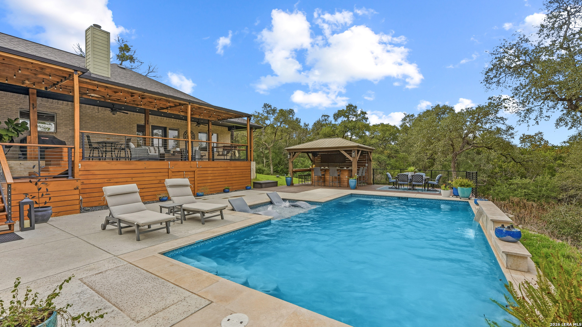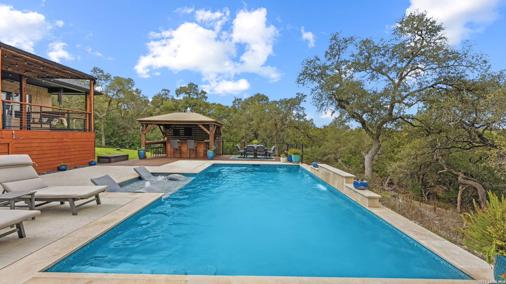 Experience the freedom and versatility of Hill Country living on 3.58 acres with no HOA and no restrictions, offering endless possibilities for use as a primary residence, vacation home, or short-term rental investment. This custom single-story home is freshly painted inside and thoughtfully designed to blend comfort, functionality, and outdoor living. The open-concept kitchen features granite countertops, custom cabinetry, and generous workspace, flowing seamlessly into a bright living room filled with natural light and anchored by a corner wood-burning fireplace. Additional spaces include a welcoming dining area and a dedicated home office, ideal for working from home or flexible living. The spacious primary suite provides a relaxing retreat with a garden tub, separate shower, dual vanities, and multiple closets. Stained concrete floors throughout offer durability and easy maintenance while complementing the home's Hill Country style. Large windows showcase the property's spectacular outdoor oasis, where an expansive covered patio overlooks a sparkling swimming pool with waterfall feature, cabana with refrigerator, kegerator, and high-bar seating, a separate sunbathing area, and a jacuzzi hot tub-perfect for entertaining or relaxing in total privacy. Mature oak trees, including nearly 100 oaks, surround the property and create a peaceful, secluded setting. The property is fully fenced, including the pool area and extended acreage. A dry-weather creek meanders through the back portion of the property, adding natural charm and the occasional opportunity to discover arrowheads. Ideal for multi-generational living or guest accommodations, the 800 sq ft detached garage apartment features an open-concept kitchen and living area, private bedroom and bath, and is fully ADA accessible with wide doorways and a walk-in shower. An additional two-car workshop space provides excellent room for hobbies, storage, or projects. Wildlife abounds with frequent sightings of white-tailed deer and axis deer, enhancing the true Hill Country experience. The property features a gated entrance, circular driveway, and abundant parking, with plenty of room for RV or boat storage. A private well serves the property. Conveniently located just minutes from Gruene, New Braunfels, Canyon Lake, and San Marcos, and close to local services including the nearby fire station, this unique property offers the perfect combination of privacy, flexibility, and accessibility.
