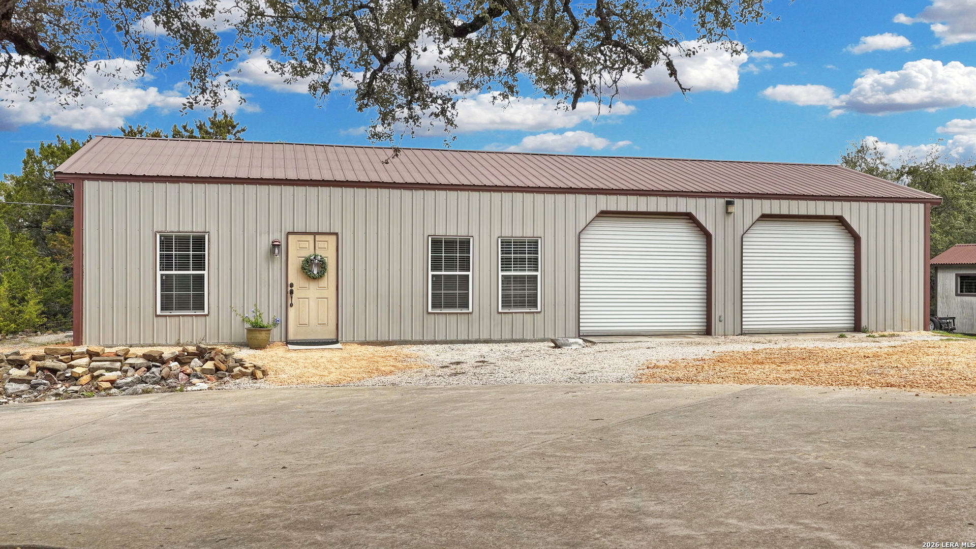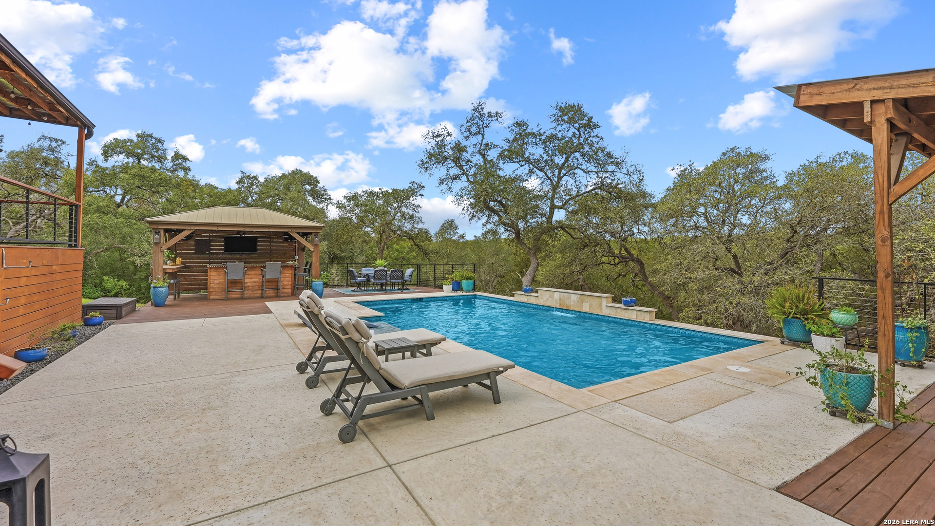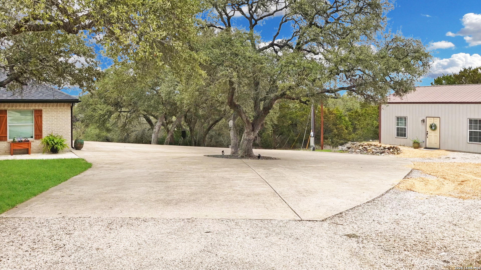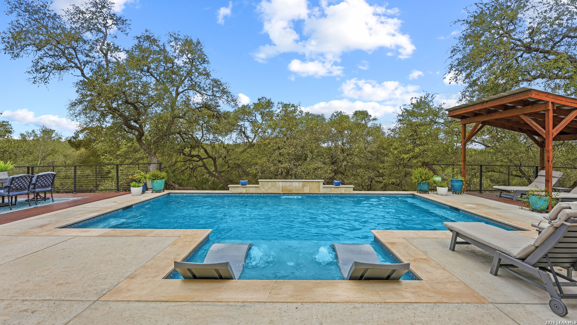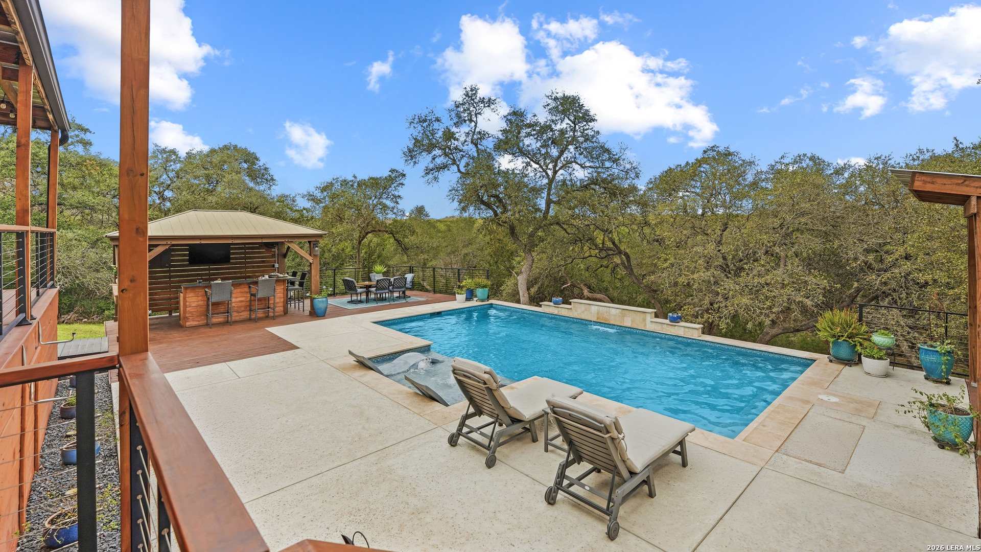 Experience the freedom and versatility of Hill Country living on 3.58 acres with no HOA and no restrictions, offering endless possibilities for use as a primary residence, vacation home, or short-term rental investment. This custom single-story home is freshly painted inside and thoughtfully designed to blend comfort, functionality, and outdoor living. The open-concept kitchen features granite countertops, custom cabinetry, and generous workspace, flowing seamlessly into a bright living room filled with natural light and anchored by a corner wood-burning fireplace. Additional spaces include a welcoming dining area and a dedicated home office, ideal for working from home or flexible living. The spacious primary suite provides a relaxing retreat with a garden tub, separate shower, dual vanities, and multiple closets. Stained concrete floors throughout offer durability and easy maintenance while complementing the home's Hill Country style. Large windows showcase the property's spectacular outdoor oasis, where an expansive covered patio overlooks a sparkling swimming pool with waterfall feature, cabana with refrigerator, kegerator, and high-bar seating, a separate sunbathing area, and a jacuzzi hot tub-perfect for entertaining or relaxing in total privacy. Mature oak trees, including nearly 100 oaks, surround the property and create a peaceful, secluded setting. The property is fully fenced, including the pool area and extended acreage. A dry-weather creek meanders through the back portion of the property, adding natural charm and the occasional opportunity to discover arrowheads. Ideal for multi-generational living or guest accommodations, the 800 sq ft detached garage apartment features an open-concept kitchen and living area, private bedroom and bath, and is fully ADA accessible with wide doorways and a walk-in shower. An additional two-car workshop space provides excellent room for hobbies, storage, or projects. Wildlife abounds with frequent sightings of white-tailed deer and axis deer, enhancing the true Hill Country experience. The property features a gated entrance, circular driveway, and abundant parking, with plenty of room for RV or boat storage. A private well serves the property. Conveniently located just minutes from Gruene, New Braunfels, Canyon Lake, and San Marcos, and close to local services including the nearby fire station, this unique property offers the perfect combination of privacy, flexibility, and accessibility.