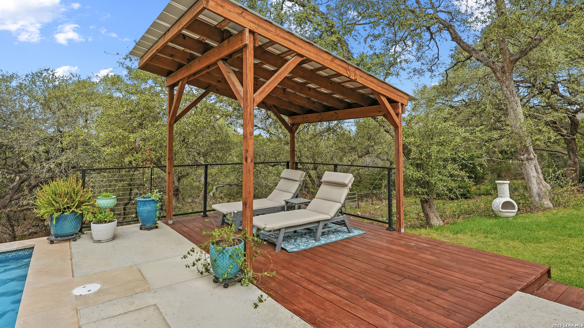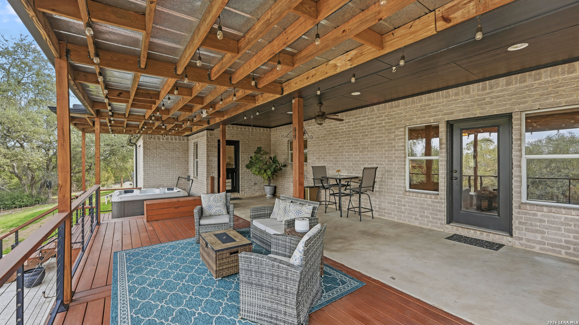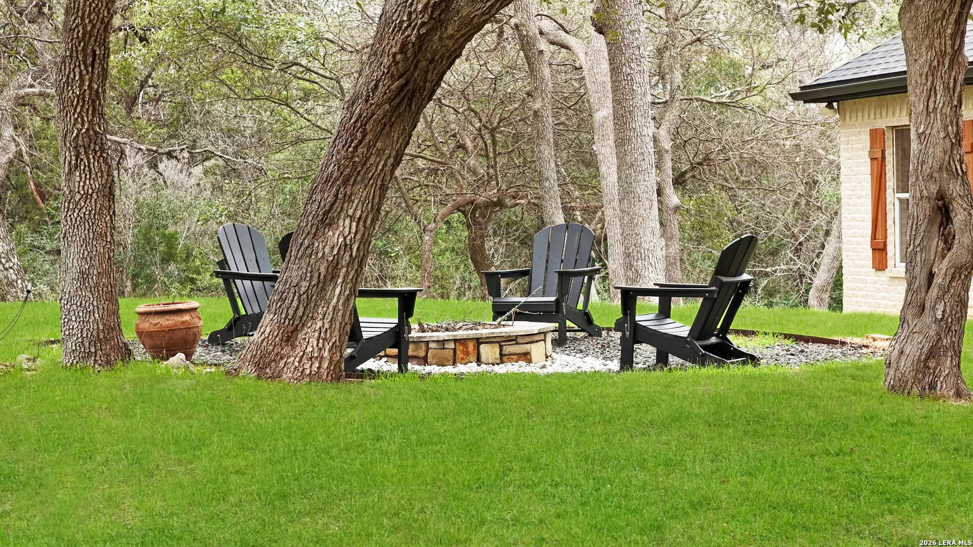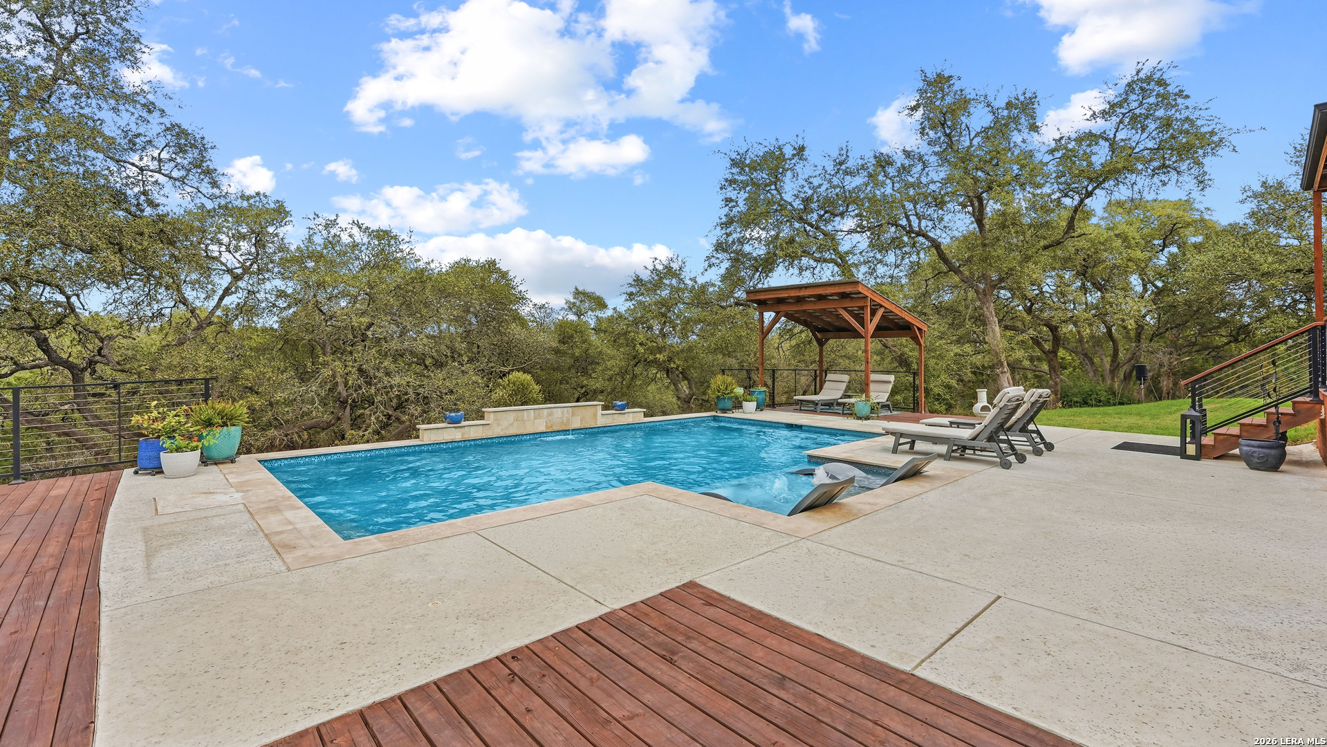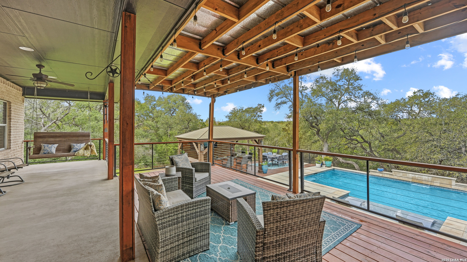Experience the freedom and versatility of Hill Country living on 3.58 acres with no HOA and no restrictions, offering endless possibilities for use as a primary residence, vacation home, or short-term rental investment. This custom single-story home is freshly painted inside and thoughtfully designed to blend comfort, functionality, and outdoor living. The open-concept kitchen features granite countertops, custom cabinetry, and generous workspace, flowing seamlessly into a bright living room filled with natural light and anchored by a corner wood-burning fireplace. Additional spaces include a welcoming dining area and a dedicated home office, ideal for working from home or flexible living. The spacious primary suite provides a relaxing retreat with a garden tub, separate shower, dual vanities, and multiple closets. Stained concrete floors throughout offer durability and easy maintenance while complementing the home's Hill Country style. Large windows showcase the property's spectacular outdoor oasis, where an expansive covered patio overlooks a sparkling swimming pool with waterfall feature, cabana with refrigerator, kegerator, and high-bar seating, a separate sunbathing area, and a jacuzzi hot tub-perfect for entertaining or relaxing in total privacy. Mature oak trees, including nearly 100 oaks, surround the property and create a peaceful, secluded setting. The property is fully fenced, including the pool area and extended acreage. A dry-weather creek meanders through the back portion of the property, adding natural charm and the occasional opportunity to discover arrowheads. Ideal for multi-generational living or guest accommodations, the 800 sq ft detached garage apartment features an open-concept kitchen and living area, private bedroom and bath, and is fully ADA accessible with wide doorways and a walk-in shower. An additional two-car workshop space provides excellent room for hobbies, storage, or projects. Wildlife abounds with frequent sightings of white-tailed deer and axis deer, enhancing the true Hill Country experience. The property features a gated entrance, circular driveway, and abundant parking, with plenty of room for RV or boat storage. A private well serves the property. Conveniently located just minutes from Gruene, New Braunfels, Canyon Lake, and San Marcos, and close to local services including the nearby fire station, this unique property offers the perfect combination of privacy, flexibility, and accessibility.