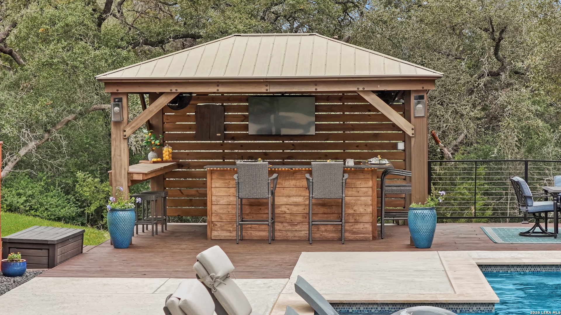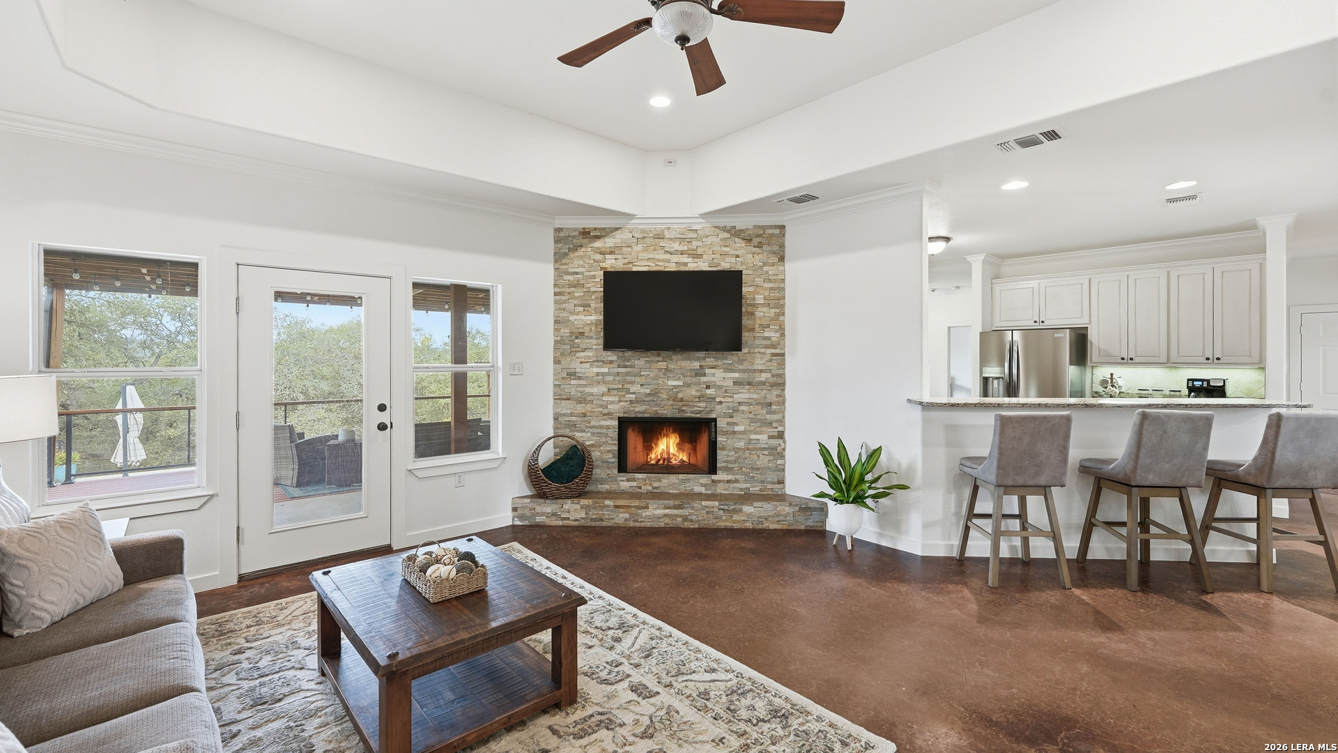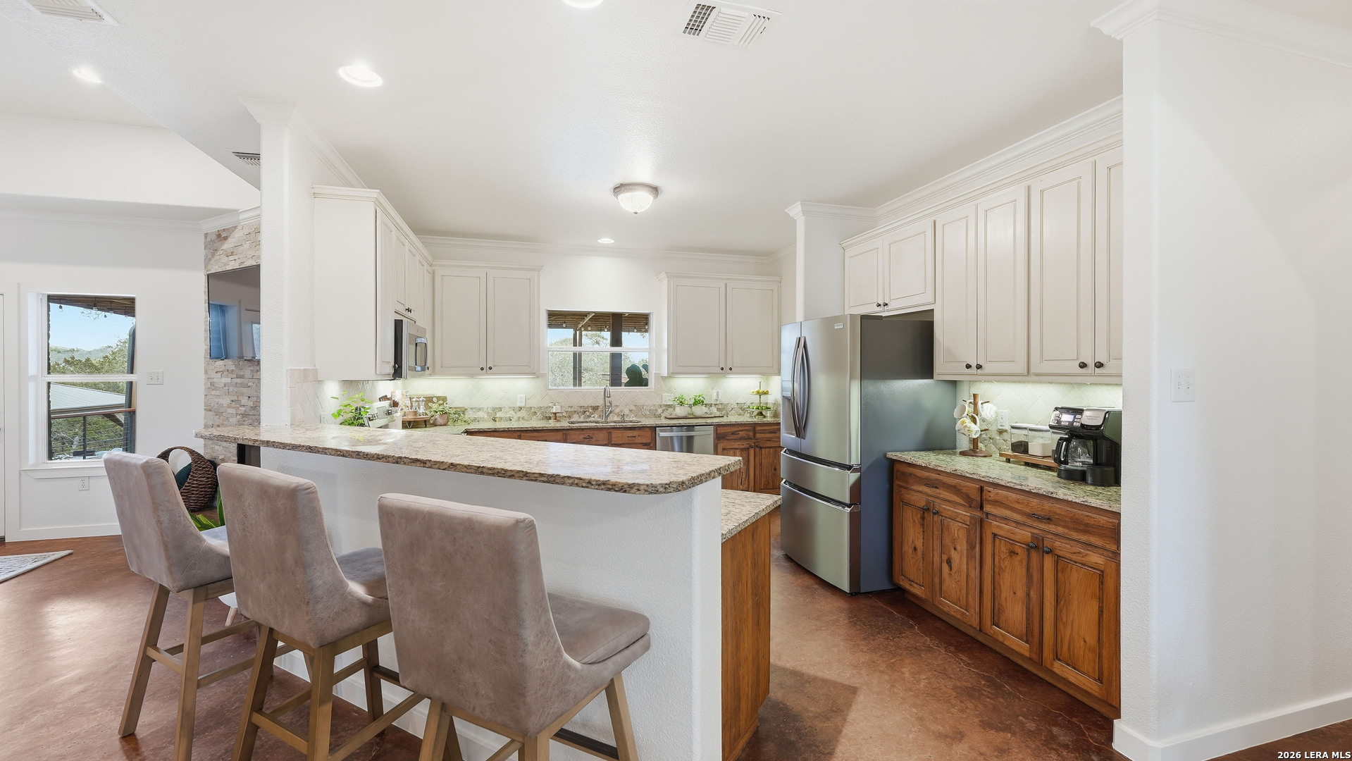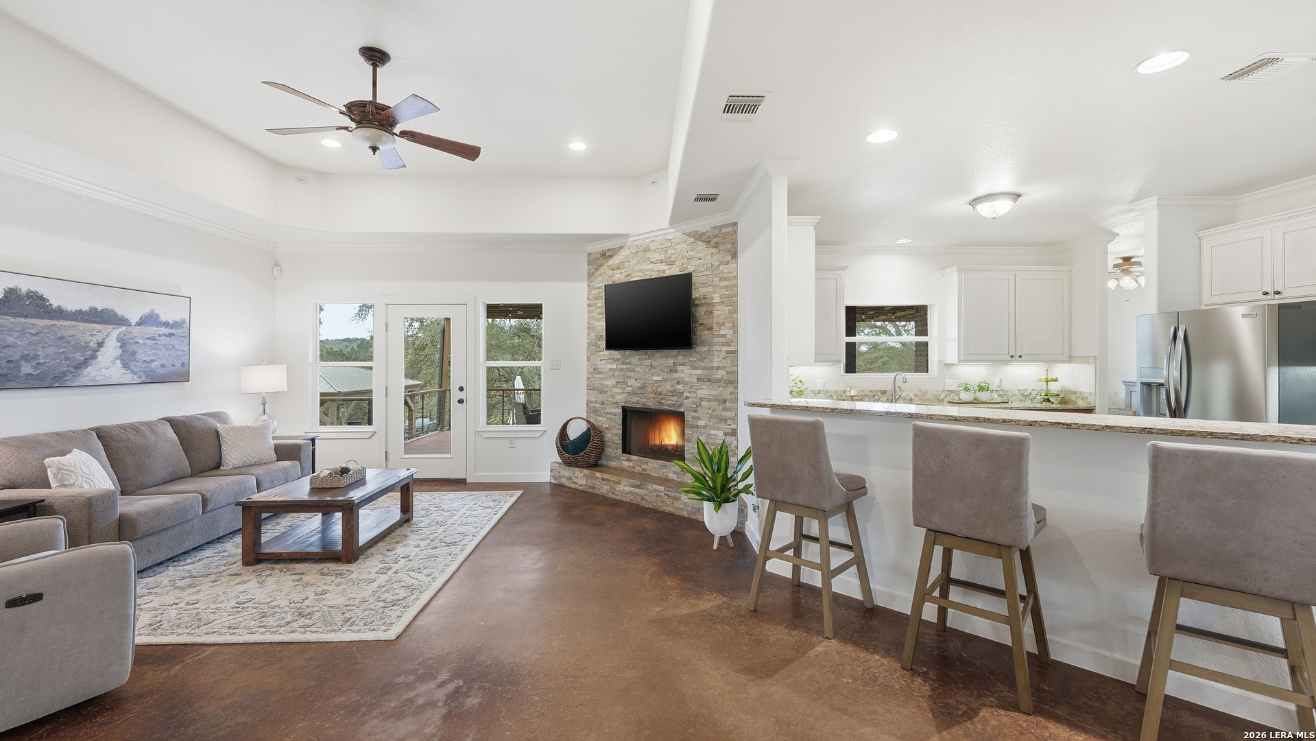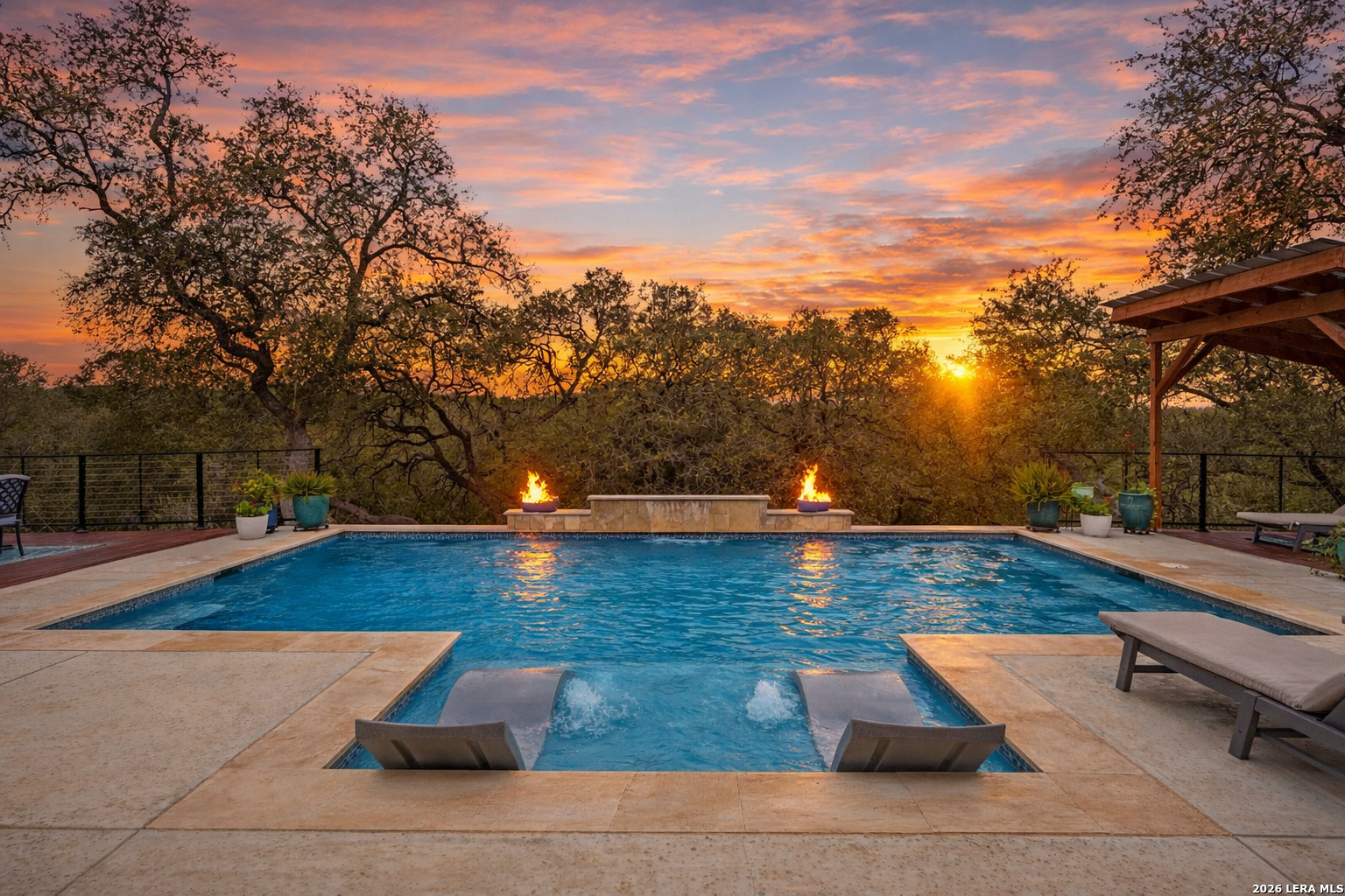 Experience the freedom and versatility of Hill Country living on 3.58 acres with no HOA and no restrictions, offering endless possibilities for use as a primary residence, vacation home, or short-term rental investment. This custom single-story home is freshly painted inside and thoughtfully designed to blend comfort, functionality, and outdoor living. The open-concept kitchen features granite countertops, custom cabinetry, and generous workspace, flowing seamlessly into a bright living room filled with natural light and anchored by a corner wood-burning fireplace. Additional spaces include a welcoming dining area and a dedicated home office, ideal for working from home or flexible living. The spacious primary suite provides a relaxing retreat with a garden tub, separate shower, dual vanities, and multiple closets. Stained concrete floors throughout offer durability and easy maintenance while complementing the home's Hill Country style. Large windows showcase the property's spectacular outdoor oasis, where an expansive covered patio overlooks a sparkling swimming pool with waterfall feature, cabana with refrigerator, kegerator, and high-bar seating, a separate sunbathing area, and a jacuzzi hot tub-perfect for entertaining or relaxing in total privacy. Mature oak trees, including nearly 100 oaks, surround the property and create a peaceful, secluded setting. The property is fully fenced, including the pool area and extended acreage. A dry-weather creek meanders through the back portion of the property, adding natural charm and the occasional opportunity to discover arrowheads. Ideal for multi-generational living or guest accommodations, the 800 sq ft detached garage apartment features an open-concept kitchen and living area, private bedroom and bath, and is fully ADA accessible with wide doorways and a walk-in shower. An additional two-car workshop space provides excellent room for hobbies, storage, or projects. Wildlife abounds with frequent sightings of white-tailed deer and axis deer, enhancing the true Hill Country experience. The property features a gated entrance, circular driveway, and abundant parking, with plenty of room for RV or boat storage. A private well serves the property. Conveniently located just minutes from Gruene, New Braunfels, Canyon Lake, and San Marcos, and close to local services including the nearby fire station, this unique property offers the perfect combination of privacy, flexibility, and accessibility.