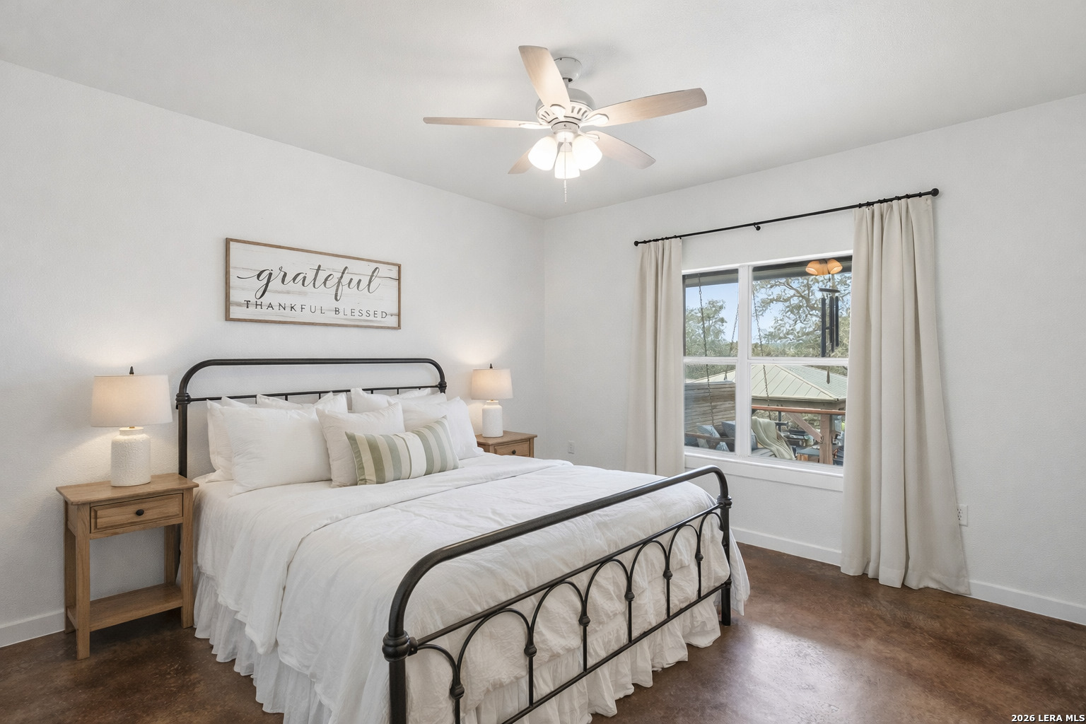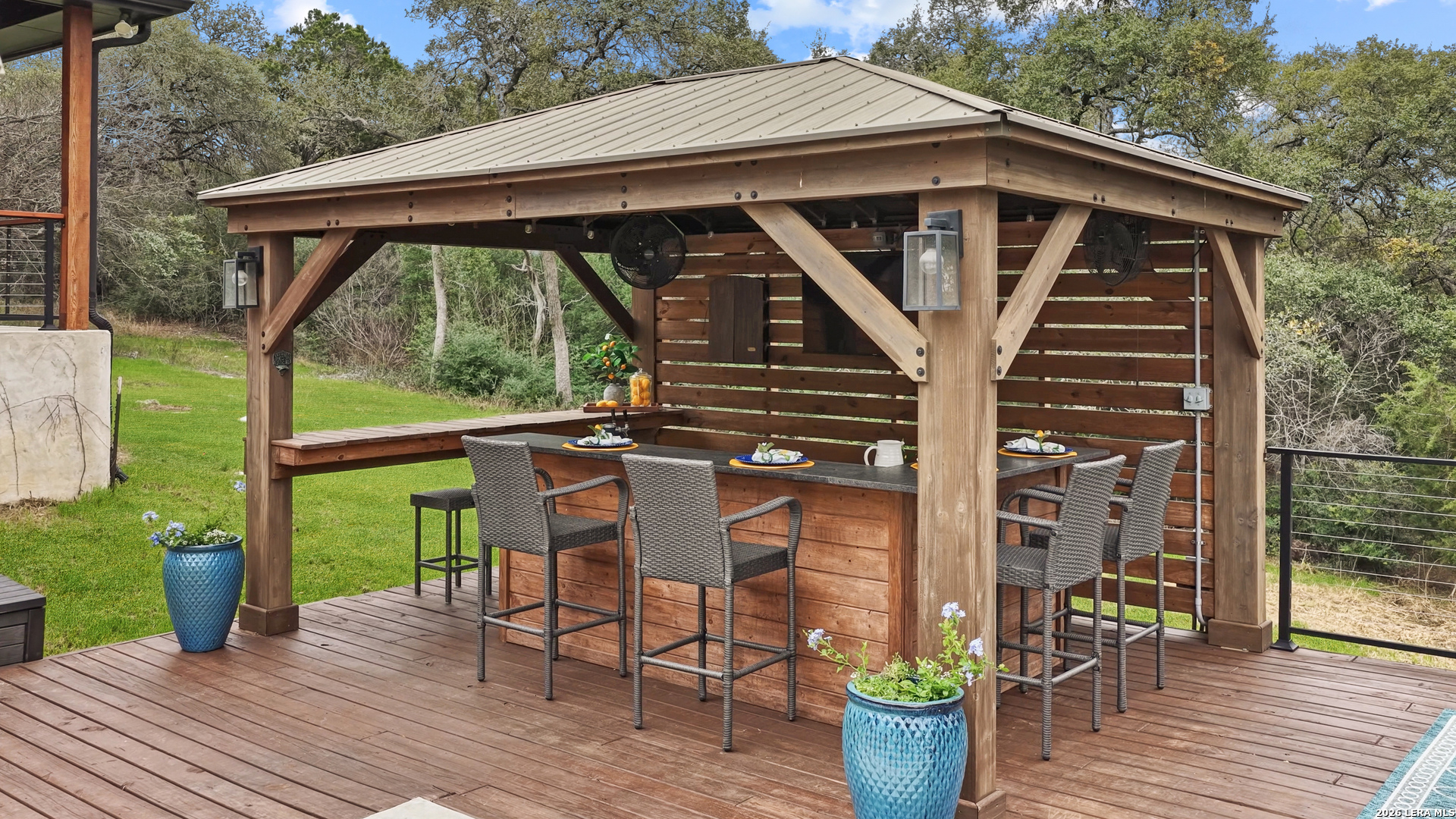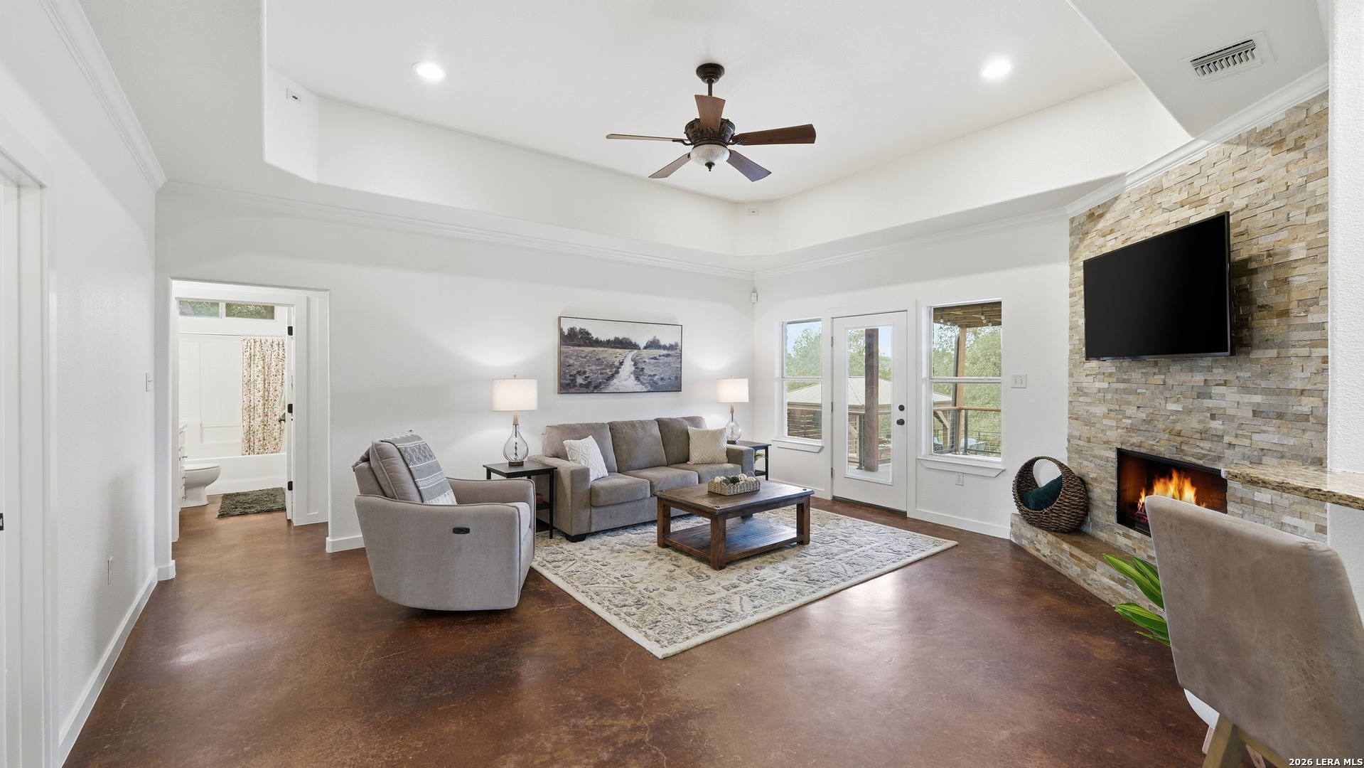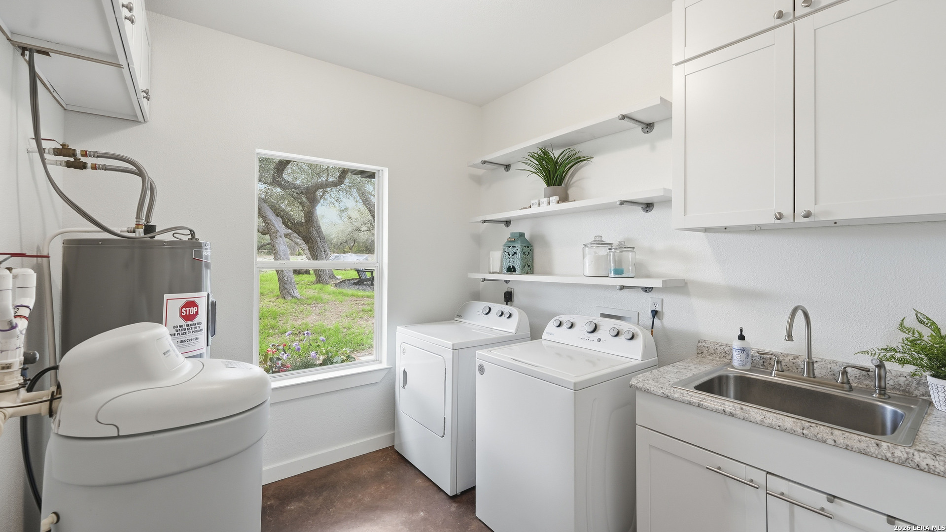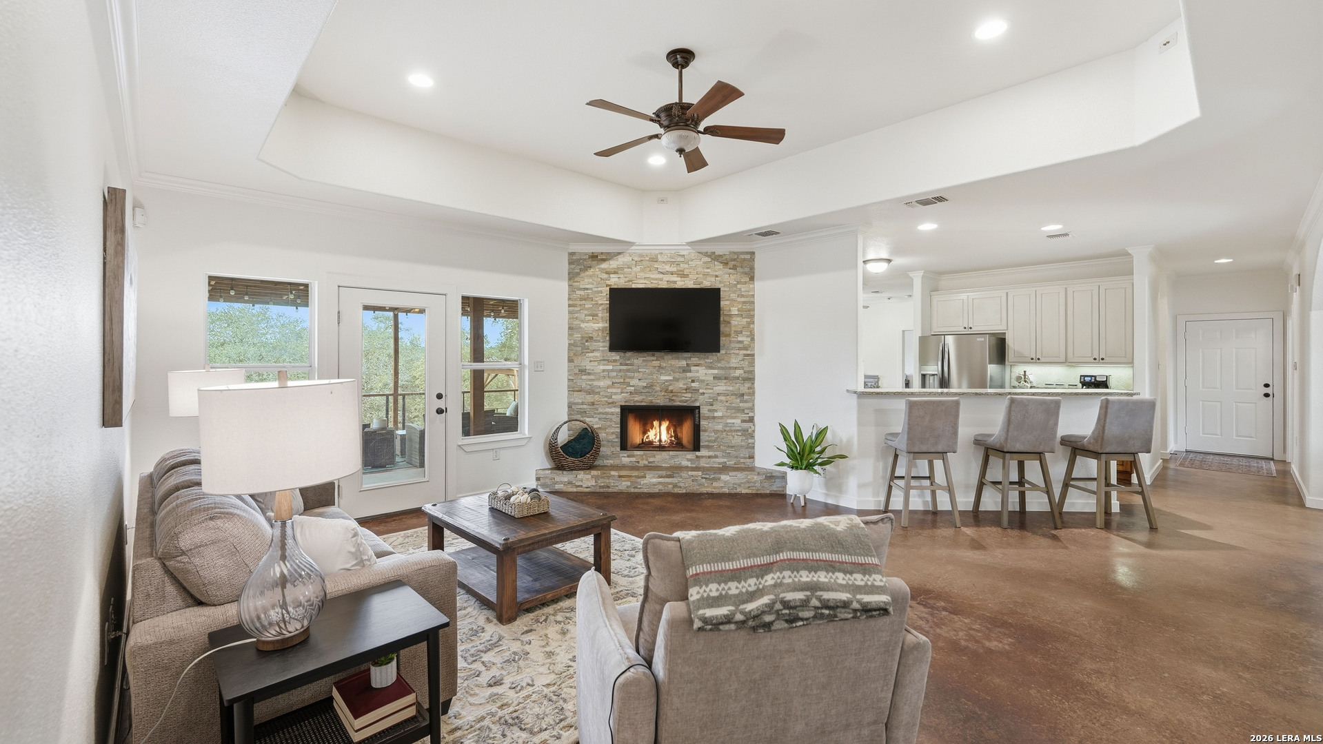 Experience the freedom and versatility of Hill Country living on 3.58 acres with no HOA and no restrictions, offering endless possibilities for use as a primary residence, vacation home, or short-term rental investment. This custom single-story home is freshly painted inside and thoughtfully designed to blend comfort, functionality, and outdoor living. The open-concept kitchen features granite countertops, custom cabinetry, and generous workspace, flowing seamlessly into a bright living room filled with natural light and anchored by a corner wood-burning fireplace. Additional spaces include a welcoming dining area and a dedicated home office, ideal for working from home or flexible living. The spacious primary suite provides a relaxing retreat with a garden tub, separate shower, dual vanities, and multiple closets. Stained concrete floors throughout offer durability and easy maintenance while complementing the home's Hill Country style. Large windows showcase the property's spectacular outdoor oasis, where an expansive covered patio overlooks a sparkling swimming pool with waterfall feature, cabana with refrigerator, kegerator, and high-bar seating, a separate sunbathing area, and a jacuzzi hot tub-perfect for entertaining or relaxing in total privacy. Mature oak trees, including nearly 100 oaks, surround the property and create a peaceful, secluded setting. The property is fully fenced, including the pool area and extended acreage. A dry-weather creek meanders through the back portion of the property, adding natural charm and the occasional opportunity to discover arrowheads. Ideal for multi-generational living or guest accommodations, the 800 sq ft detached garage apartment features an open-concept kitchen and living area, private bedroom and bath, and is fully ADA accessible with wide doorways and a walk-in shower. An additional two-car workshop space provides excellent room for hobbies, storage, or projects. Wildlife abounds with frequent sightings of white-tailed deer and axis deer, enhancing the true Hill Country experience. The property features a gated entrance, circular driveway, and abundant parking, with plenty of room for RV or boat storage. A private well serves the property. Conveniently located just minutes from Gruene, New Braunfels, Canyon Lake, and San Marcos, and close to local services including the nearby fire station, this unique property offers the perfect combination of privacy, flexibility, and accessibility.