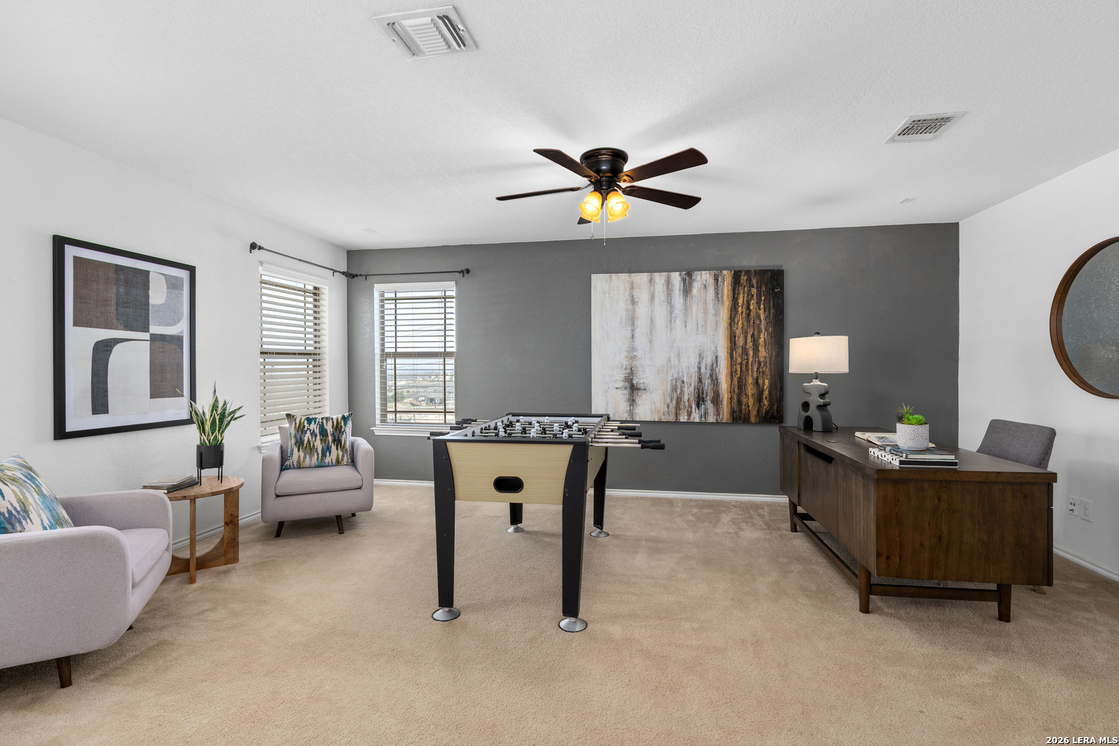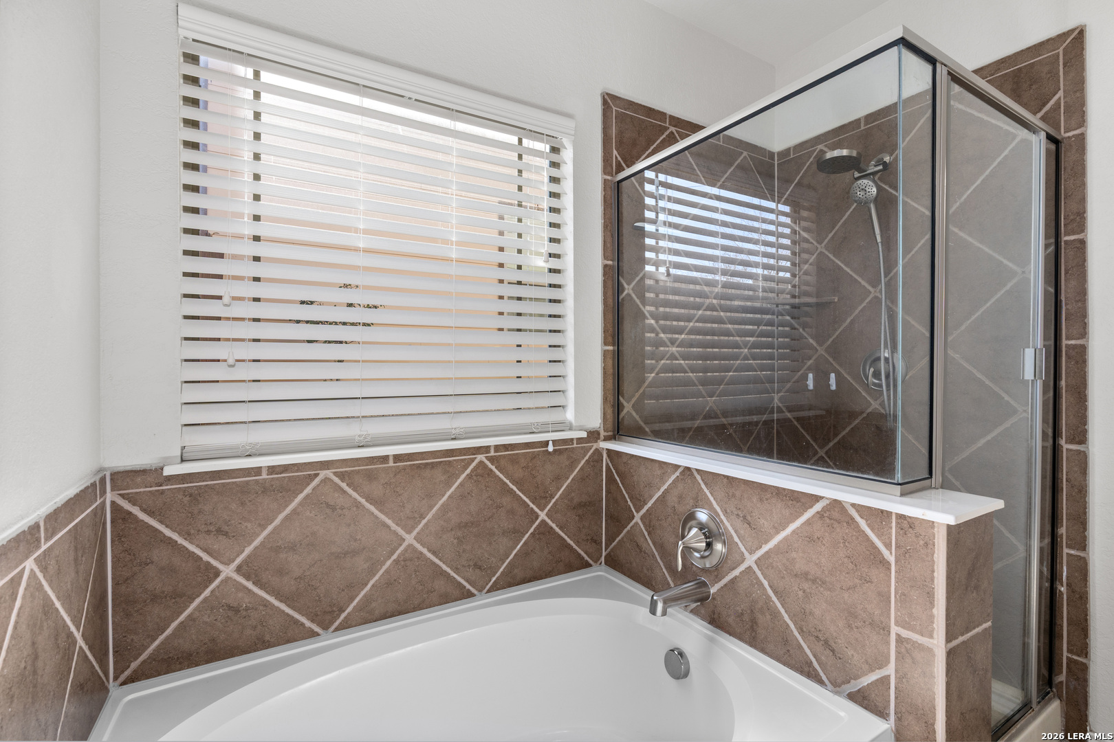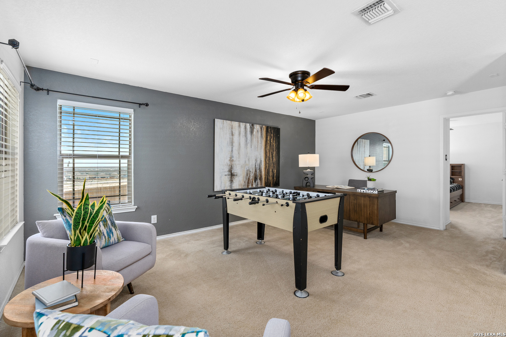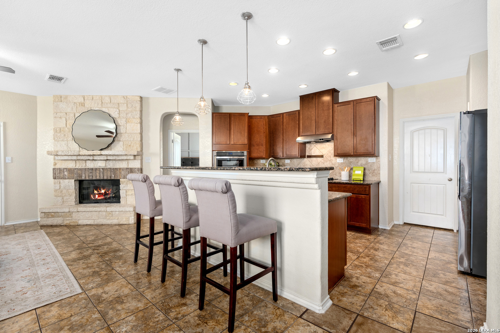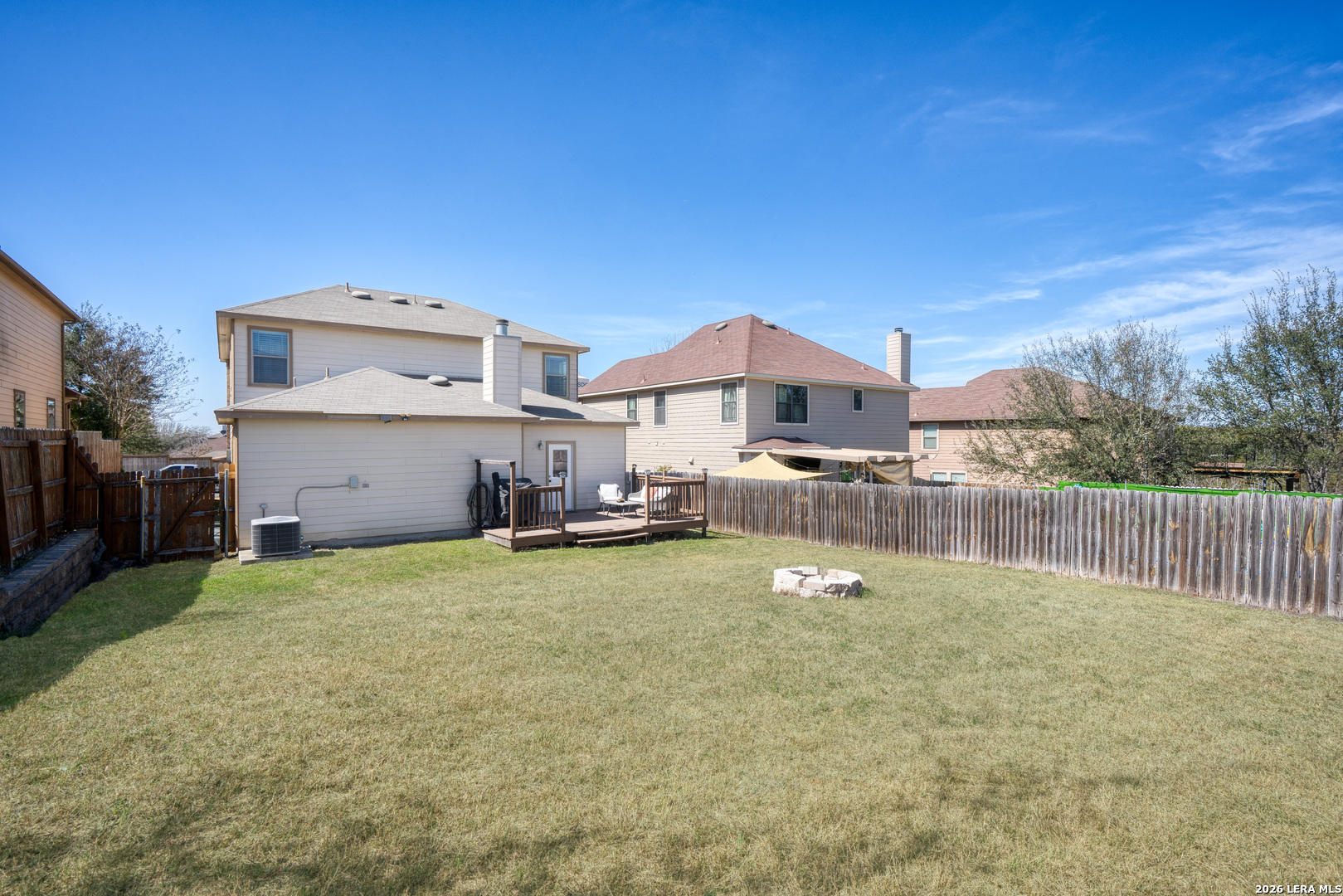 Welcome to this beautifully designed 4-bedroom, 2.5-bath home featuring an open floor plan perfect for both everyday living and entertaining. The inviting living-dining combo showcases a stunning stone fireplace, creating a warm and welcoming focal point. The spacious kitchen offers granite countertops, a breakfast bar, and stainless steel appliances - all of which convey - making it move-in ready for the next owner. With three separate living areas, there's plenty of room for everyone to spread out, work, or relax. The primary suite is conveniently located downstairs and features a walk-in closet, double vanity, separate shower, and a relaxing garden tub. Upstairs, you'll find three generously sized secondary bedrooms along with two additional living areas, offering flexible space for a game room, media room, or home office. Step outside to a large backyard that backs to a peaceful greenbelt, providing added privacy and beautiful views. The spacious deck is ideal for entertaining, weekend BBQs, or simply enjoying the outdoors.This home offers space, functionality, and a fantastic setting - don't miss the opportunity to make it yours!