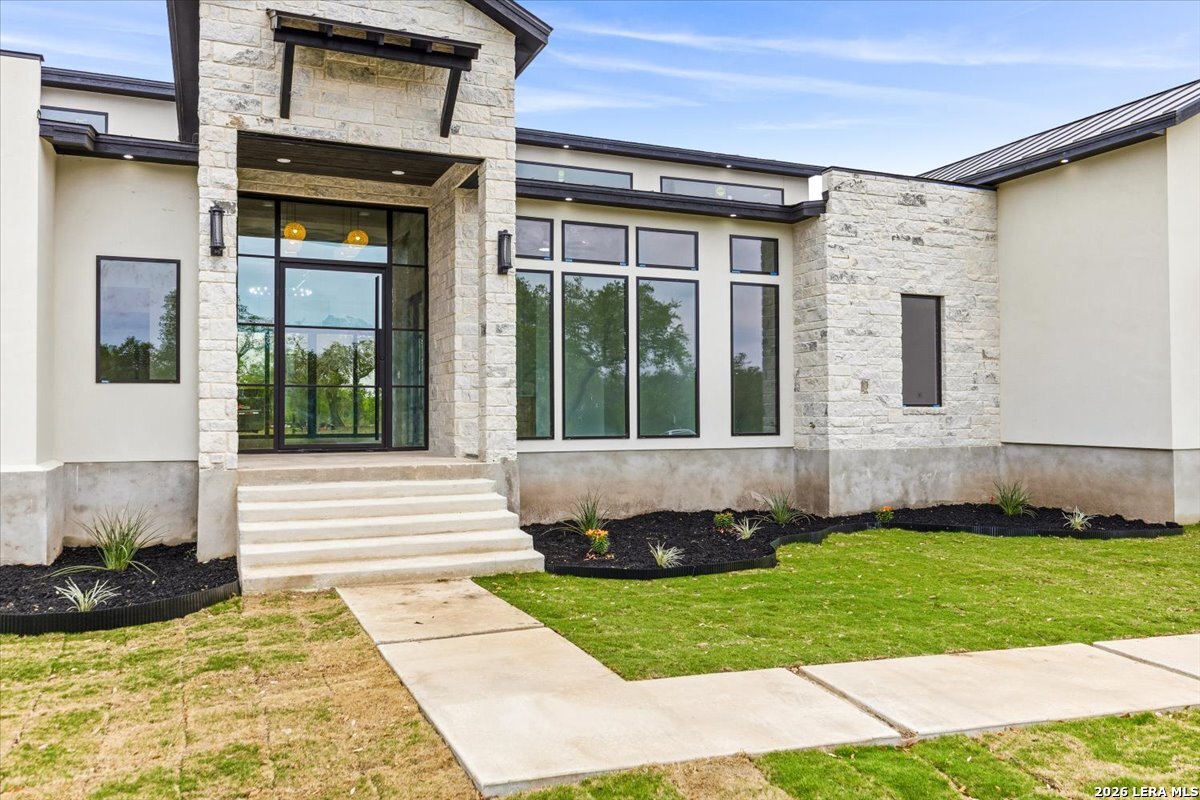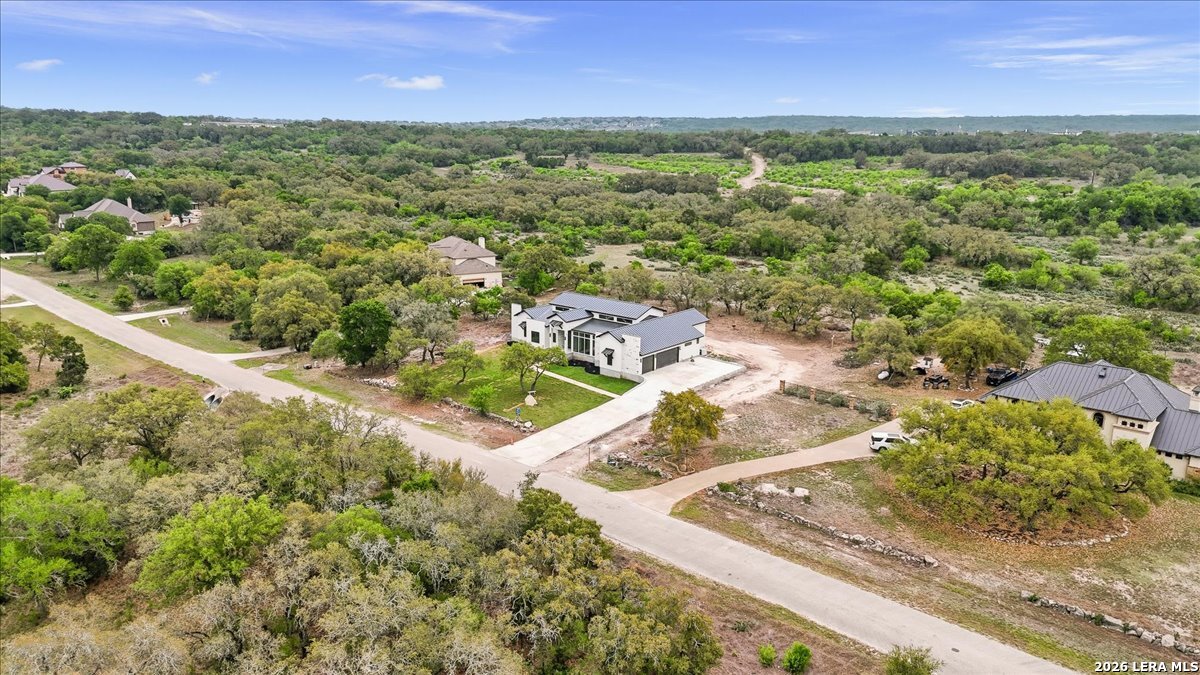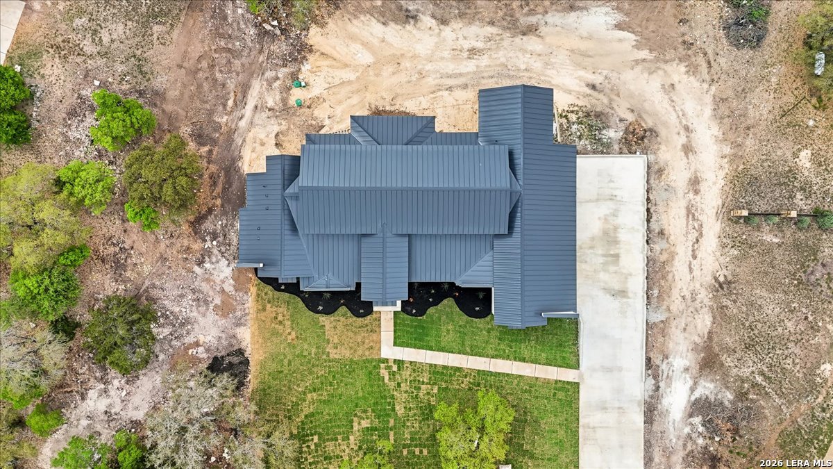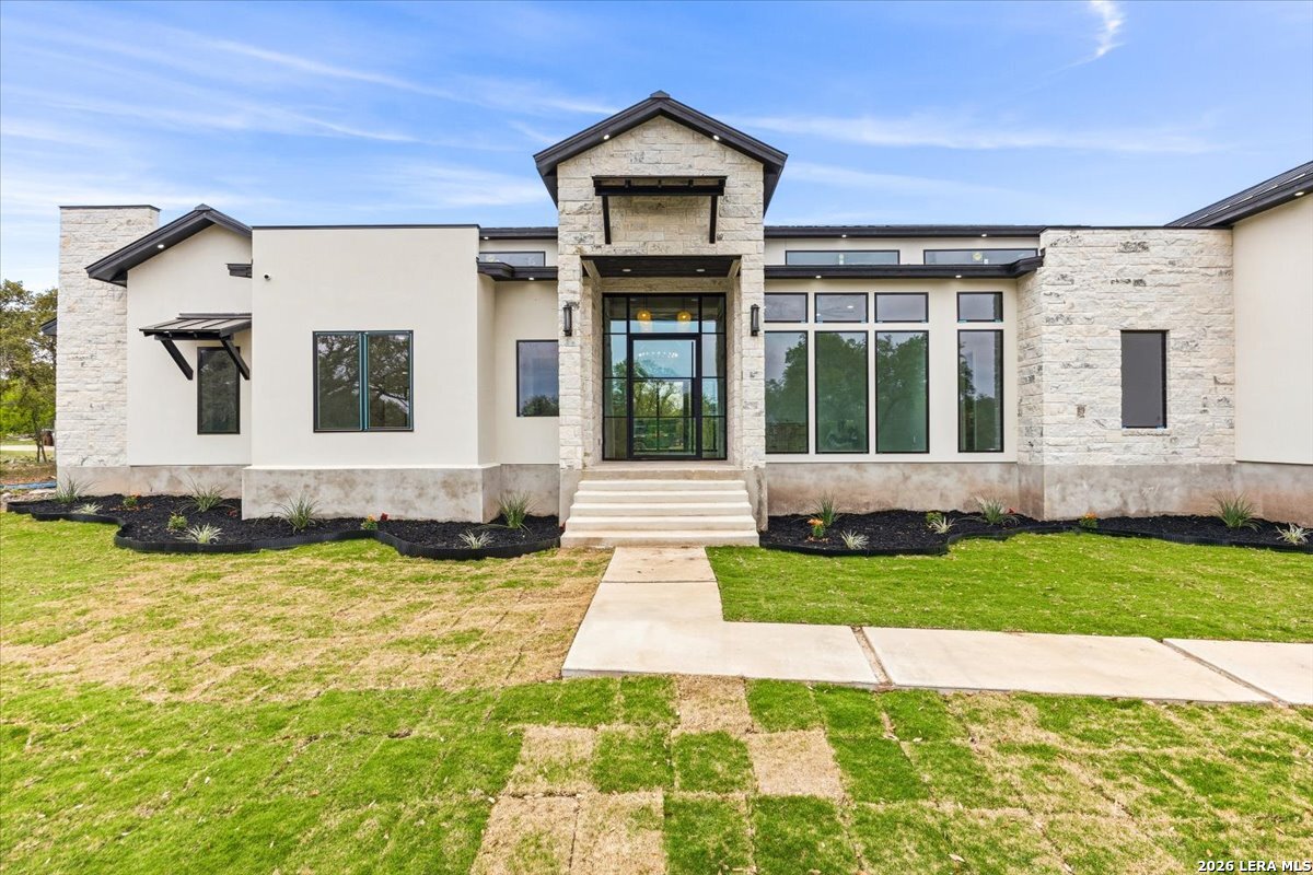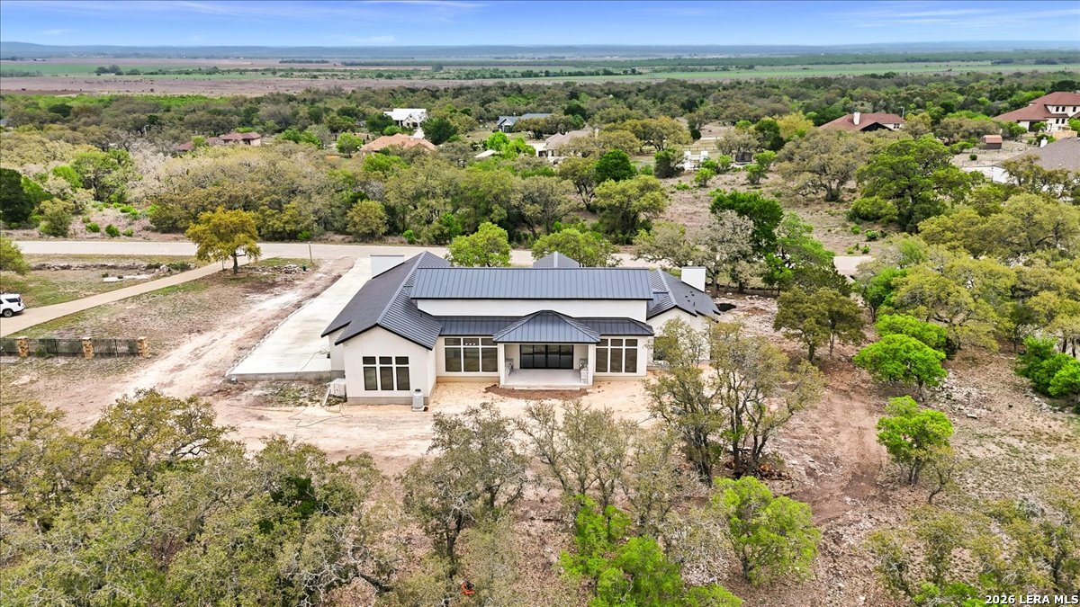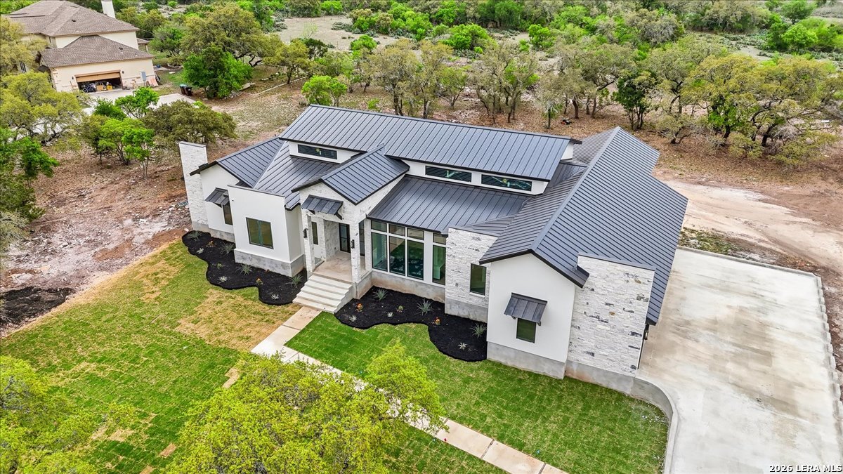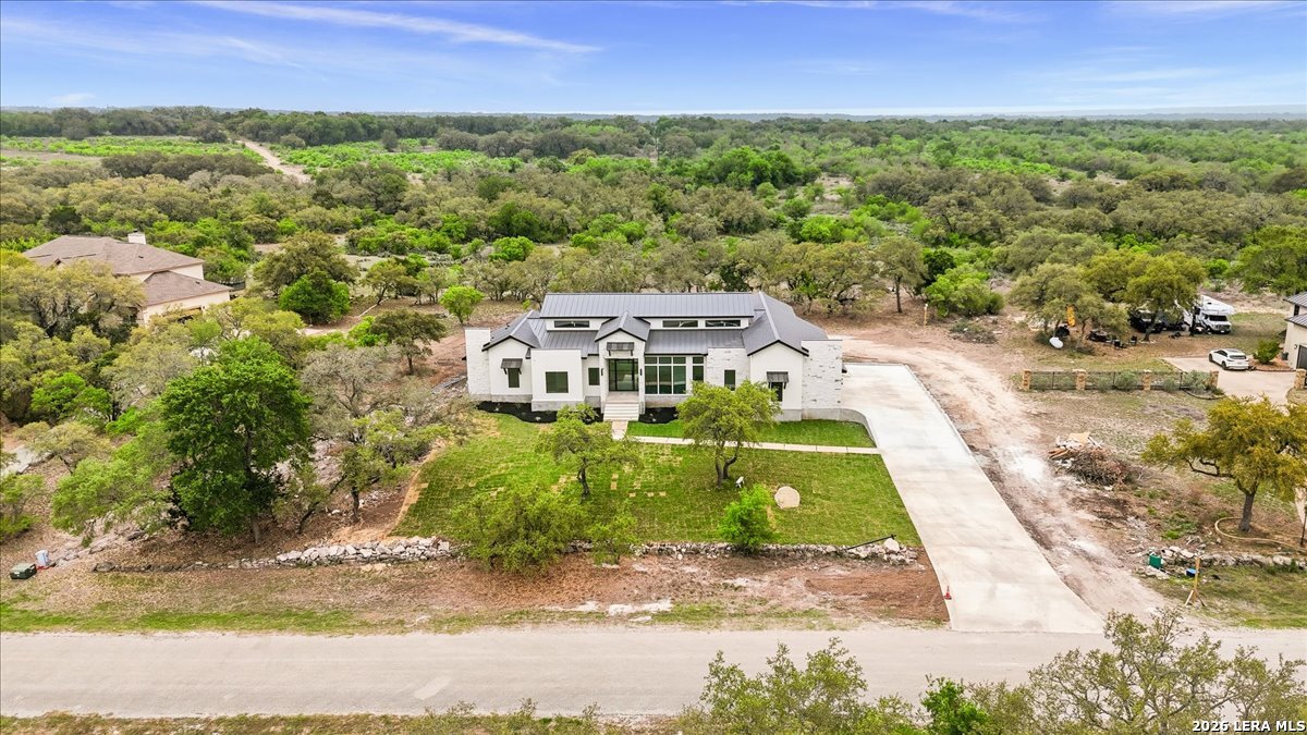 Modern Hill Country Estate | One-Story | Metal Roof | 1.5 Acres | Gated Located in prestigious Ridgeview Ranch, this Aurora Lux custom home offers 3,656 sq ft of elevated single-story living on a private 1.5-acre gated homesite. Designed with 4 bedrooms, 4.5 baths, a study, and a media/game room with bar, it blends refined design with everyday comfort. A grand pivot door opens to a dramatic living area featuring a statement coffered ceiling and expansive sliding glass doors that create seamless indoor-outdoor living. The covered patio with outdoor kitchen is ideal for entertaining. The chef's kitchen showcases an oversized island, premium Forno appliances, 48" gas range, butler's pantry, and striking two-tone cabinetry with warm wood accents. The private primary suite offers a stone feature wall, floating ceiling detail, fireplace, and a spa-like bath with dual vanities, walk-in shower, and freestanding tub. All secondary bedrooms include en-suite baths and walk-in closets. Additional features: 3-car side-entry garage, metal roof, dual HVAC systems, two water heaters, and a spacious backyard with room for a pool.
