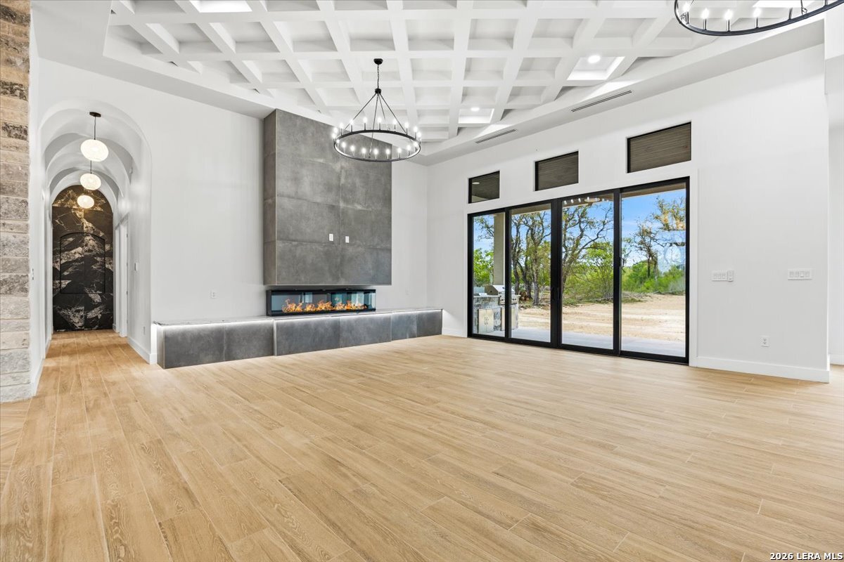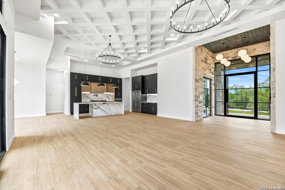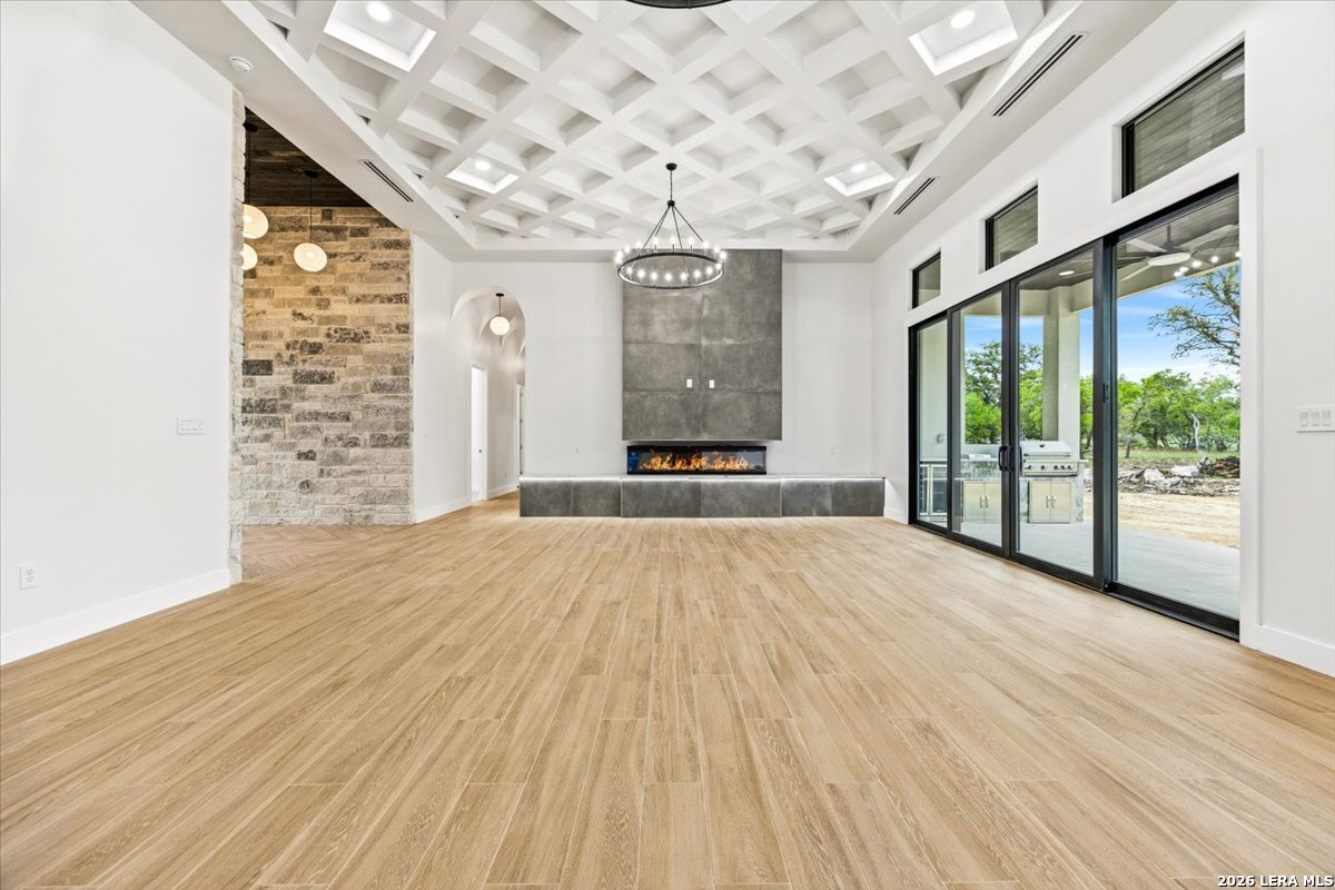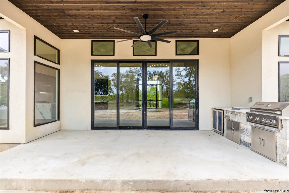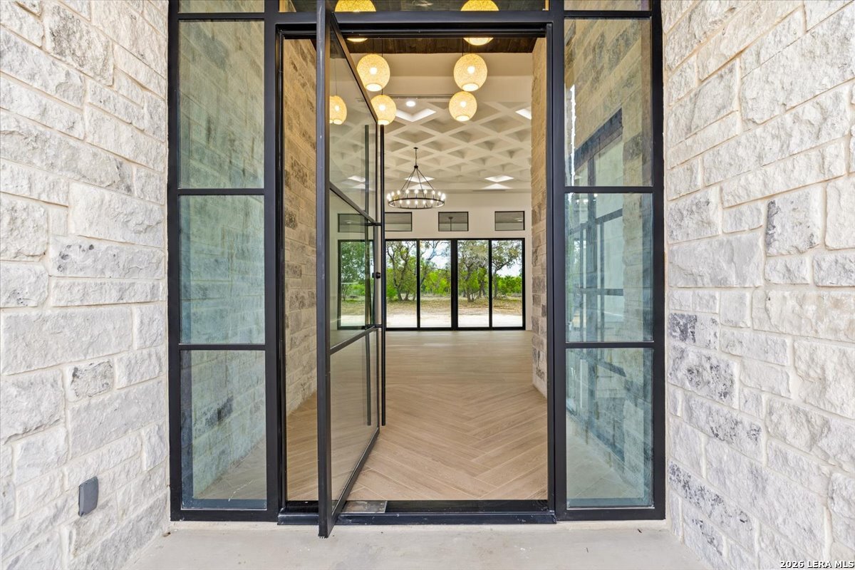 Modern Hill Country Estate | One-Story | Metal Roof | 1.5 Acres | Gated Located in prestigious Ridgeview Ranch, this Aurora Lux custom home offers 3,656 sq ft of elevated single-story living on a private 1.5-acre gated homesite. Designed with 4 bedrooms, 4.5 baths, a study, and a media/game room with bar, it blends refined design with everyday comfort. A grand pivot door opens to a dramatic living area featuring a statement coffered ceiling and expansive sliding glass doors that create seamless indoor-outdoor living. The covered patio with outdoor kitchen is ideal for entertaining. The chef's kitchen showcases an oversized island, premium Forno appliances, 48" gas range, butler's pantry, and striking two-tone cabinetry with warm wood accents. The private primary suite offers a stone feature wall, floating ceiling detail, fireplace, and a spa-like bath with dual vanities, walk-in shower, and freestanding tub. All secondary bedrooms include en-suite baths and walk-in closets. Additional features: 3-car side-entry garage, metal roof, dual HVAC systems, two water heaters, and a spacious backyard with room for a pool.