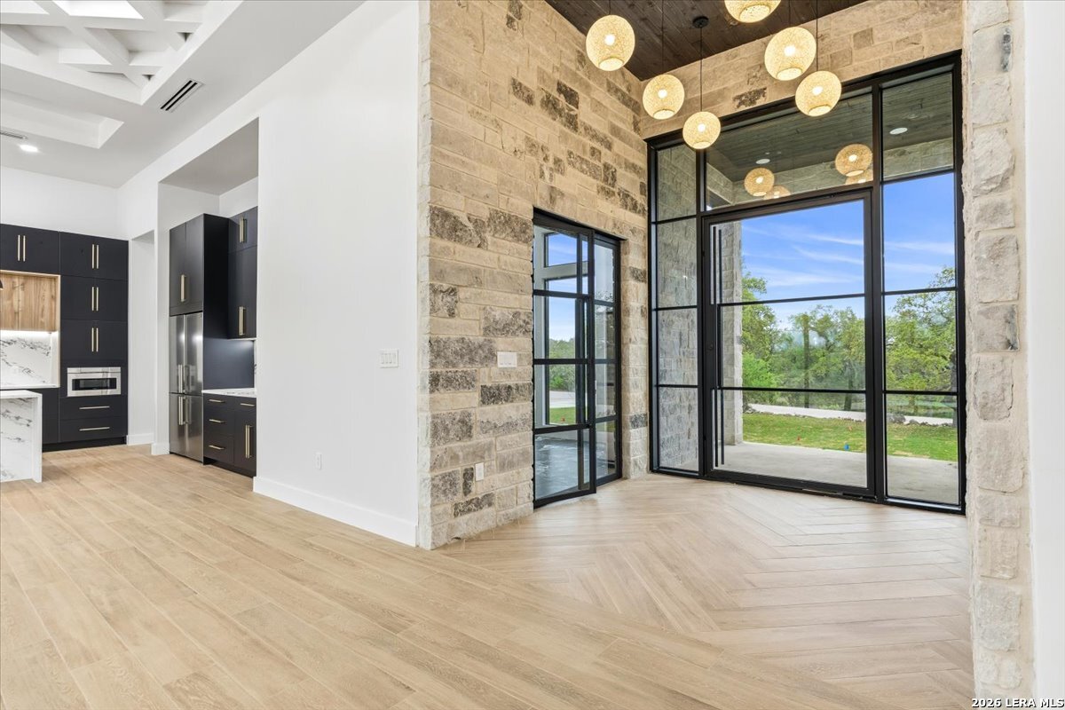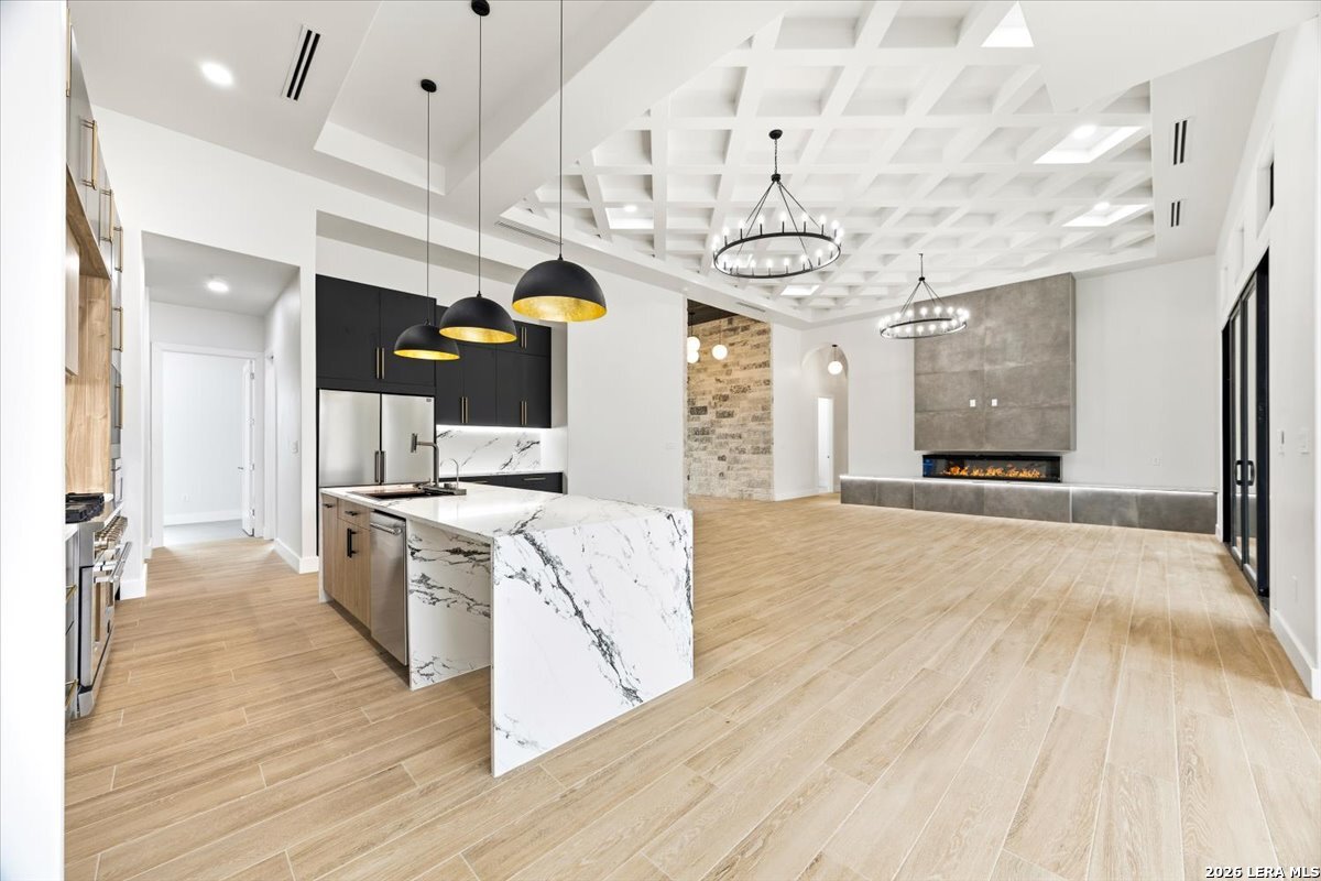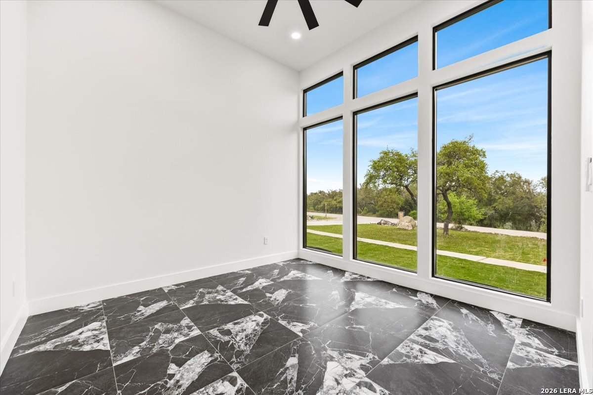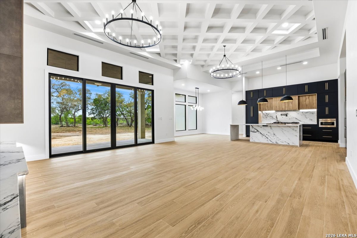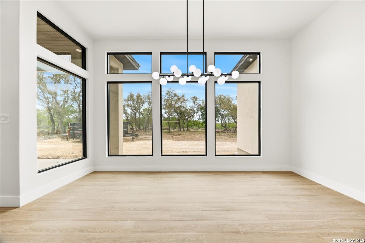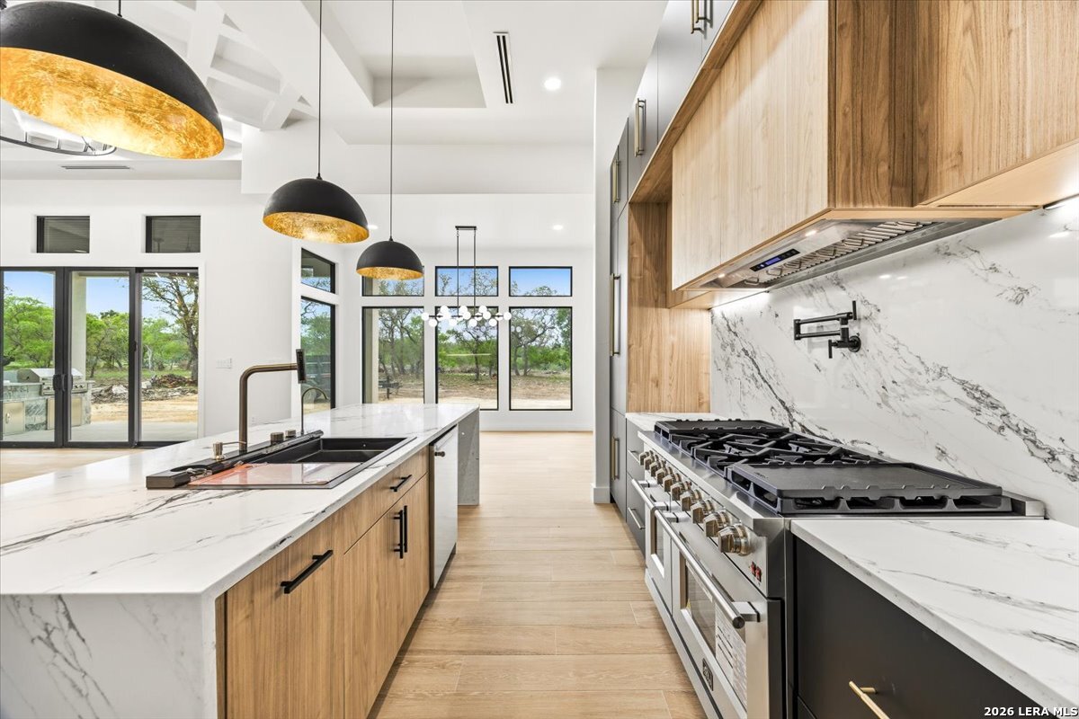 Modern Hill Country Estate | One-Story | Metal Roof | 1.5 Acres | Gated Located in prestigious Ridgeview Ranch, this Aurora Lux custom home offers 3,656 sq ft of elevated single-story living on a private 1.5-acre gated homesite. Designed with 4 bedrooms, 4.5 baths, a study, and a media/game room with bar, it blends refined design with everyday comfort. A grand pivot door opens to a dramatic living area featuring a statement coffered ceiling and expansive sliding glass doors that create seamless indoor-outdoor living. The covered patio with outdoor kitchen is ideal for entertaining. The chef's kitchen showcases an oversized island, premium Forno appliances, 48" gas range, butler's pantry, and striking two-tone cabinetry with warm wood accents. The private primary suite offers a stone feature wall, floating ceiling detail, fireplace, and a spa-like bath with dual vanities, walk-in shower, and freestanding tub. All secondary bedrooms include en-suite baths and walk-in closets. Additional features: 3-car side-entry garage, metal roof, dual HVAC systems, two water heaters, and a spacious backyard with room for a pool.