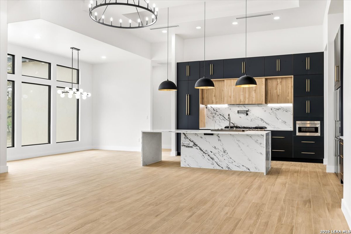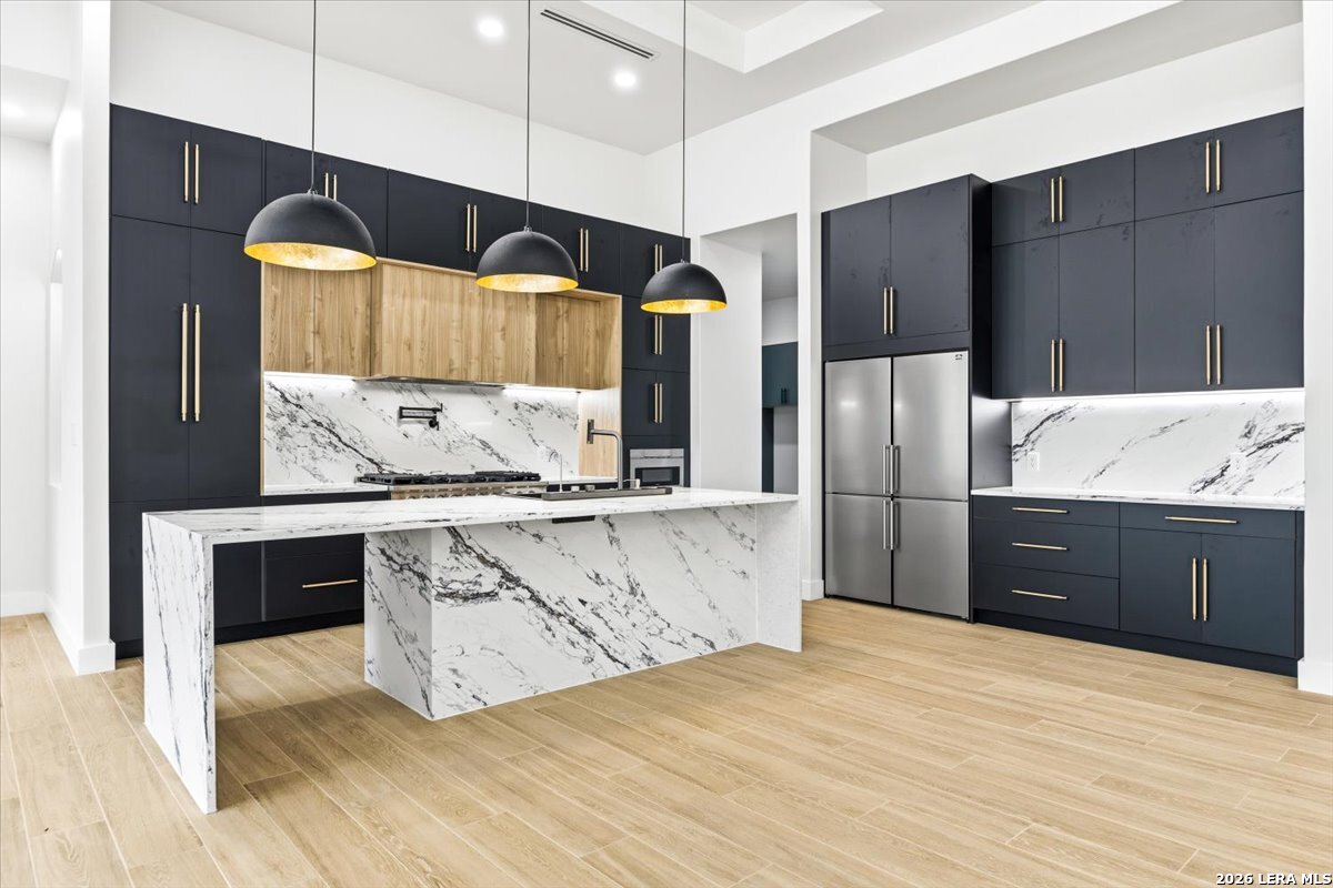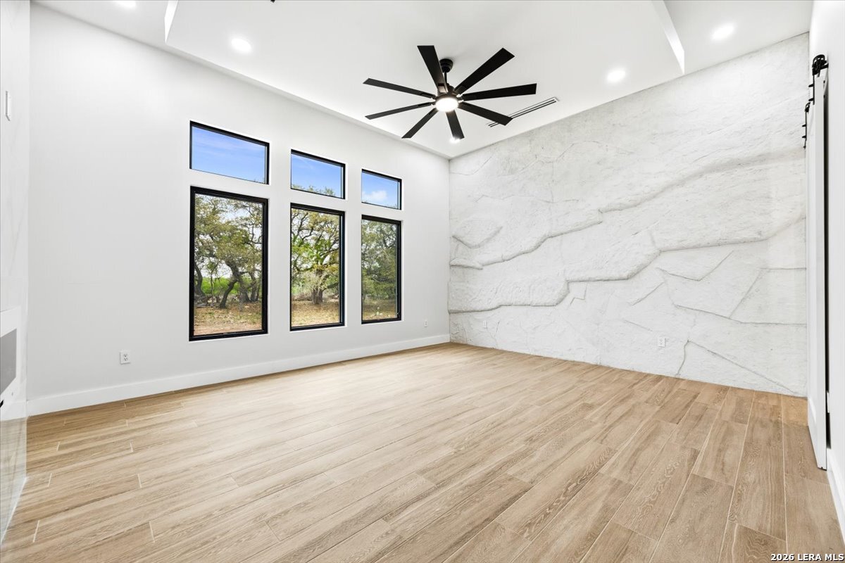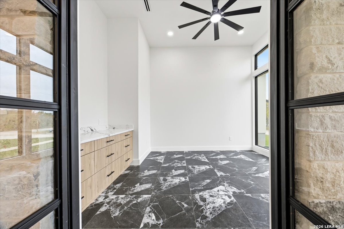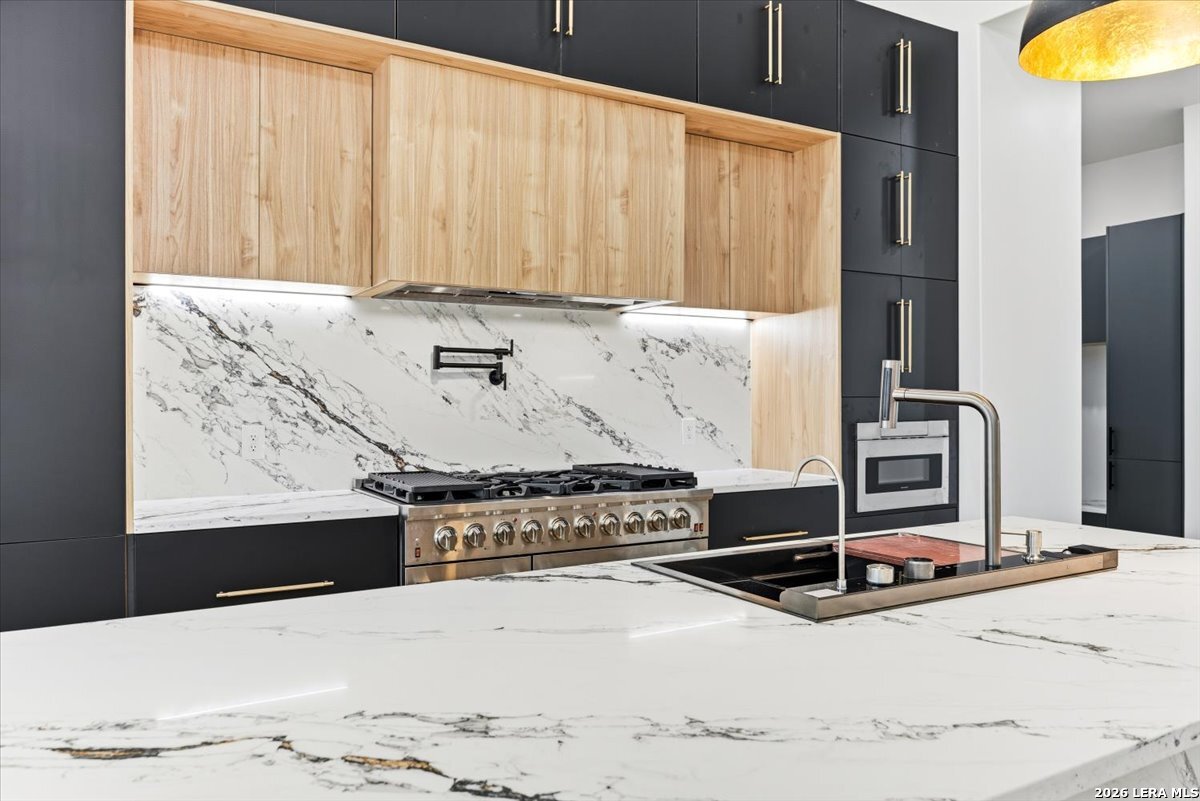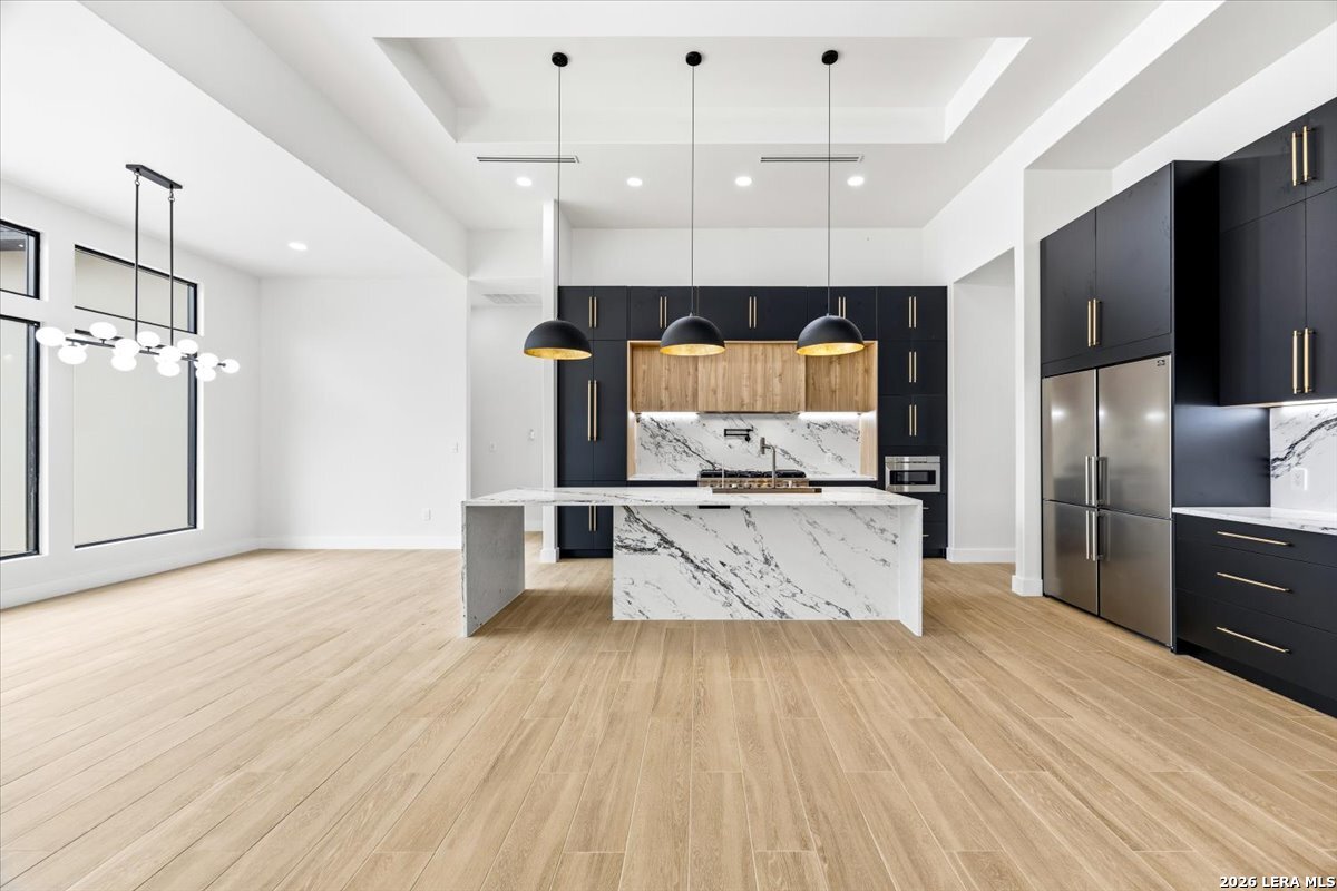 Modern Hill Country Estate | One-Story | Metal Roof | 1.5 Acres | Gated Located in prestigious Ridgeview Ranch, this Aurora Lux custom home offers 3,656 sq ft of elevated single-story living on a private 1.5-acre gated homesite. Designed with 4 bedrooms, 4.5 baths, a study, and a media/game room with bar, it blends refined design with everyday comfort. A grand pivot door opens to a dramatic living area featuring a statement coffered ceiling and expansive sliding glass doors that create seamless indoor-outdoor living. The covered patio with outdoor kitchen is ideal for entertaining. The chef's kitchen showcases an oversized island, premium Forno appliances, 48" gas range, butler's pantry, and striking two-tone cabinetry with warm wood accents. The private primary suite offers a stone feature wall, floating ceiling detail, fireplace, and a spa-like bath with dual vanities, walk-in shower, and freestanding tub. All secondary bedrooms include en-suite baths and walk-in closets. Additional features: 3-car side-entry garage, metal roof, dual HVAC systems, two water heaters, and a spacious backyard with room for a pool.