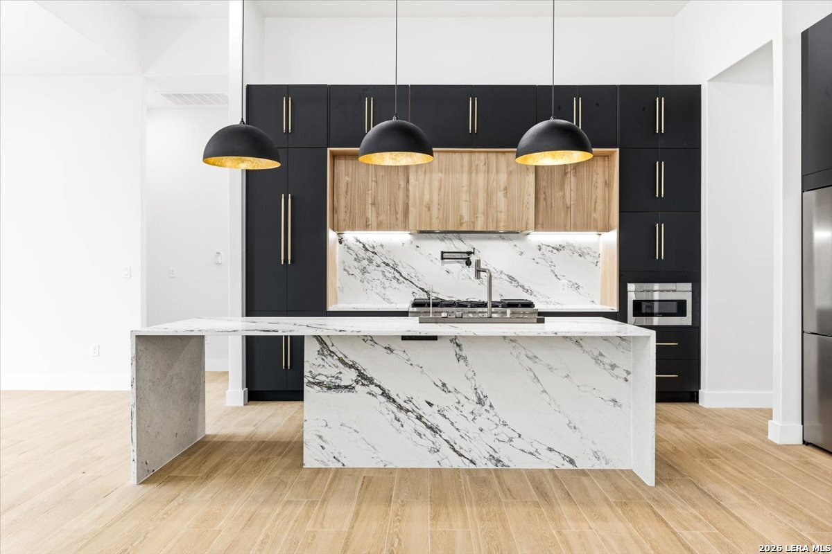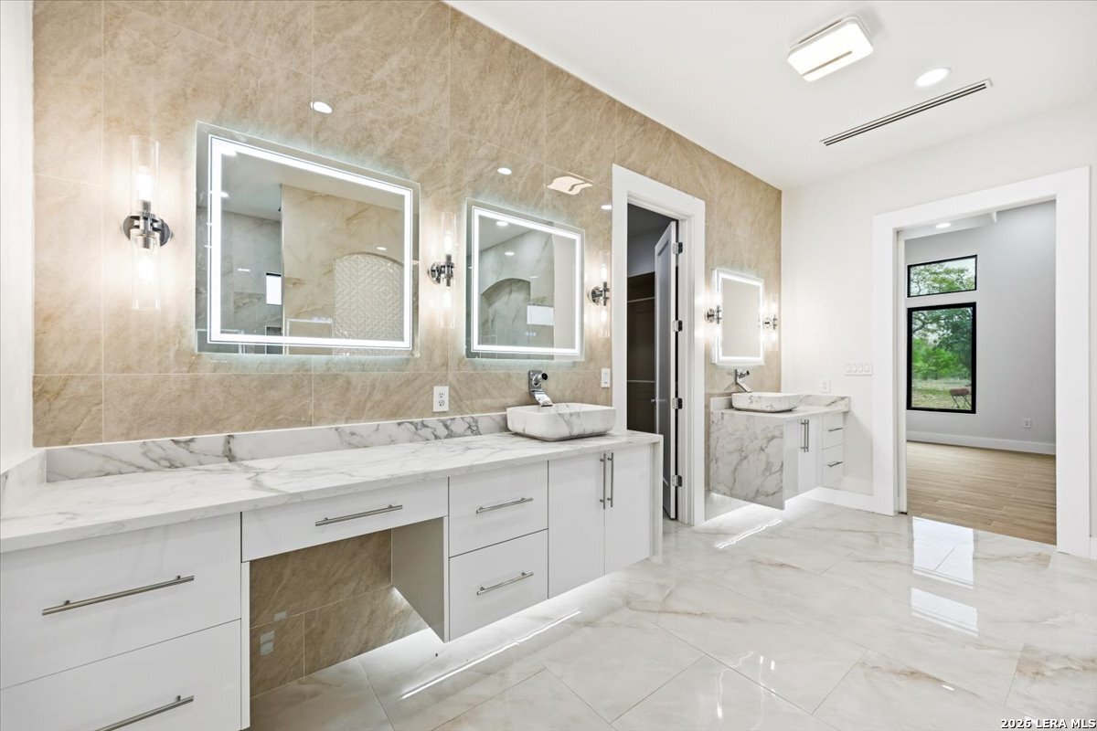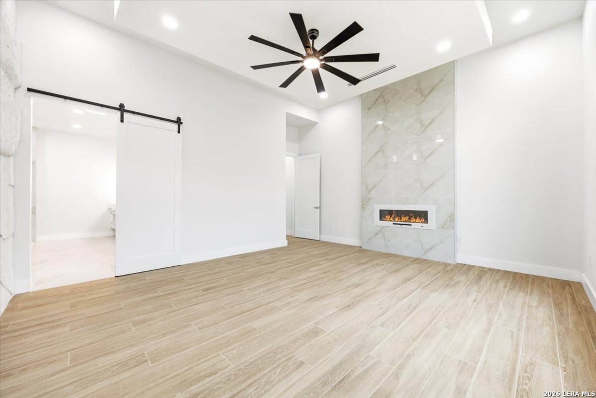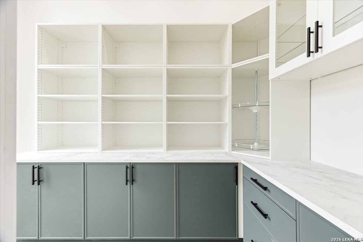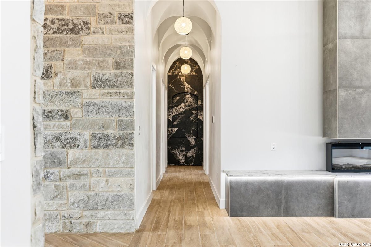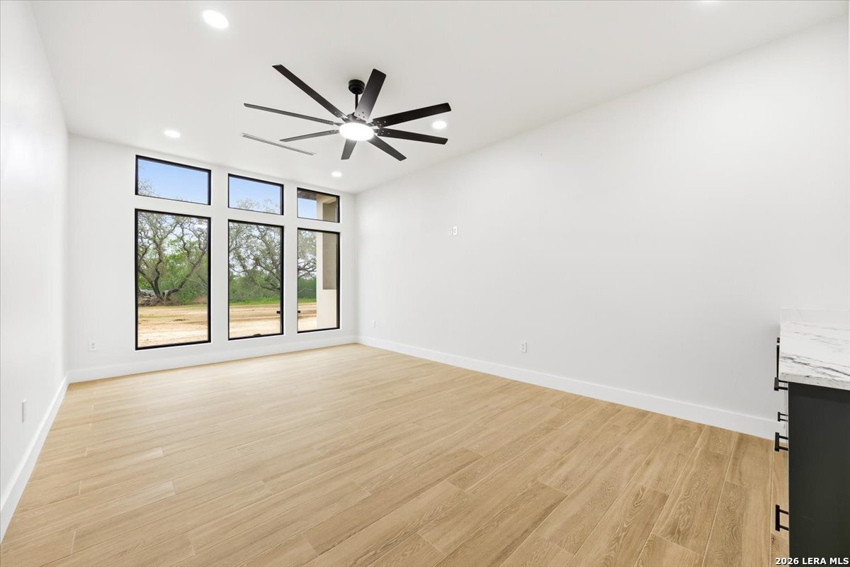 Modern Hill Country Estate | One-Story | Metal Roof | 1.5 Acres | Gated Located in prestigious Ridgeview Ranch, this Aurora Lux custom home offers 3,656 sq ft of elevated single-story living on a private 1.5-acre gated homesite. Designed with 4 bedrooms, 4.5 baths, a study, and a media/game room with bar, it blends refined design with everyday comfort. A grand pivot door opens to a dramatic living area featuring a statement coffered ceiling and expansive sliding glass doors that create seamless indoor-outdoor living. The covered patio with outdoor kitchen is ideal for entertaining. The chef's kitchen showcases an oversized island, premium Forno appliances, 48" gas range, butler's pantry, and striking two-tone cabinetry with warm wood accents. The private primary suite offers a stone feature wall, floating ceiling detail, fireplace, and a spa-like bath with dual vanities, walk-in shower, and freestanding tub. All secondary bedrooms include en-suite baths and walk-in closets. Additional features: 3-car side-entry garage, metal roof, dual HVAC systems, two water heaters, and a spacious backyard with room for a pool.