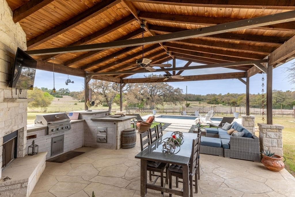 Situated between Johnson City and Hye with convenient access to Fredericksburg and the Hwy 290 Wine Corridor, this 7-acre ag-exempt property features a well-maintained main home, guest house, and multiple improvements suitable for residential, multi-generational, or investment use. Built in 2017, the 2,435 sq ft main residence offers 3 bedrooms and 2 full bathrooms with an open-concept layout designed for everyday living and entertaining. The kitchen features custom cabinetry, generous counter space, and a large island that flows into the living and dining areas. The primary suite includes dual vanities and a walk-in shower. Spray foam insulation provides added energy efficiency. Outdoor amenities include a pool, outdoor kitchen, small producing vineyard, scenic Hill Country views, and usable acreage suitable for recreation, livestock, or future improvements. The 1,134 sq ft guest house includes 2 bedrooms and 2 bathrooms and is currently income-producing, with financials available upon request. It also offers flexible space for guests, extended family, or continued rental use. Additional improvements include two RV sites, a 20x30 shop with grind pump, and a non-lined tank. Utilities and infrastructure are in place to support both primary and secondary living spaces. This property offers the privacy of country living while remaining centrally located near wineries, breweries, dining, and shopping along the 290 corridor.