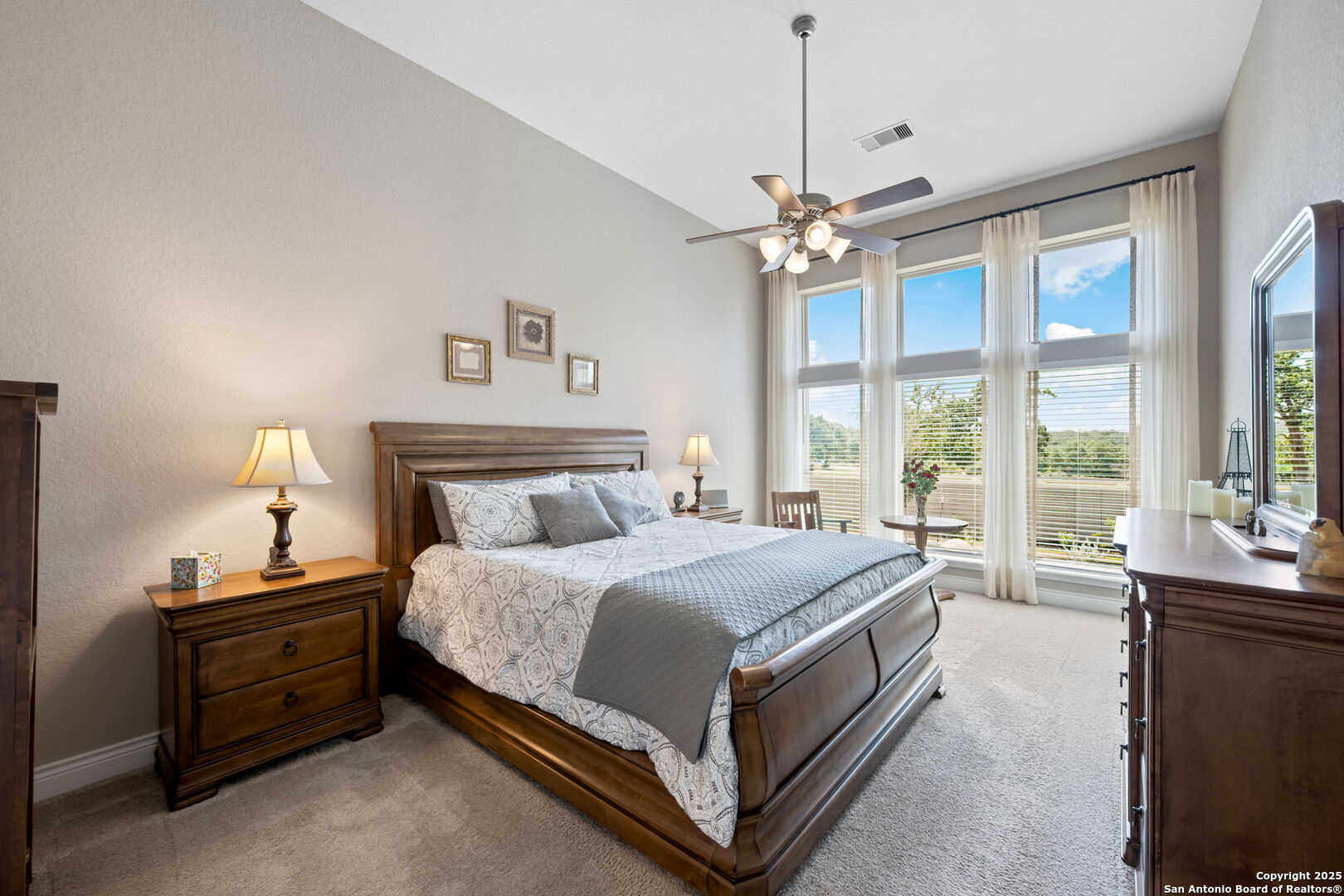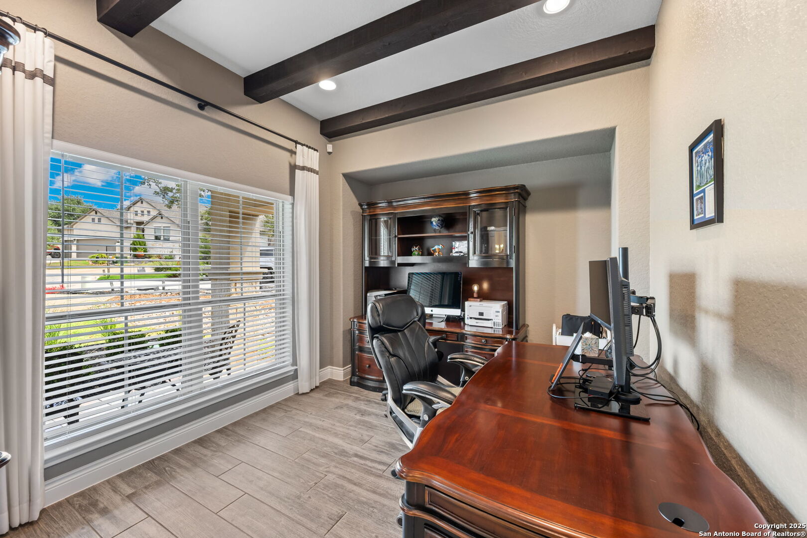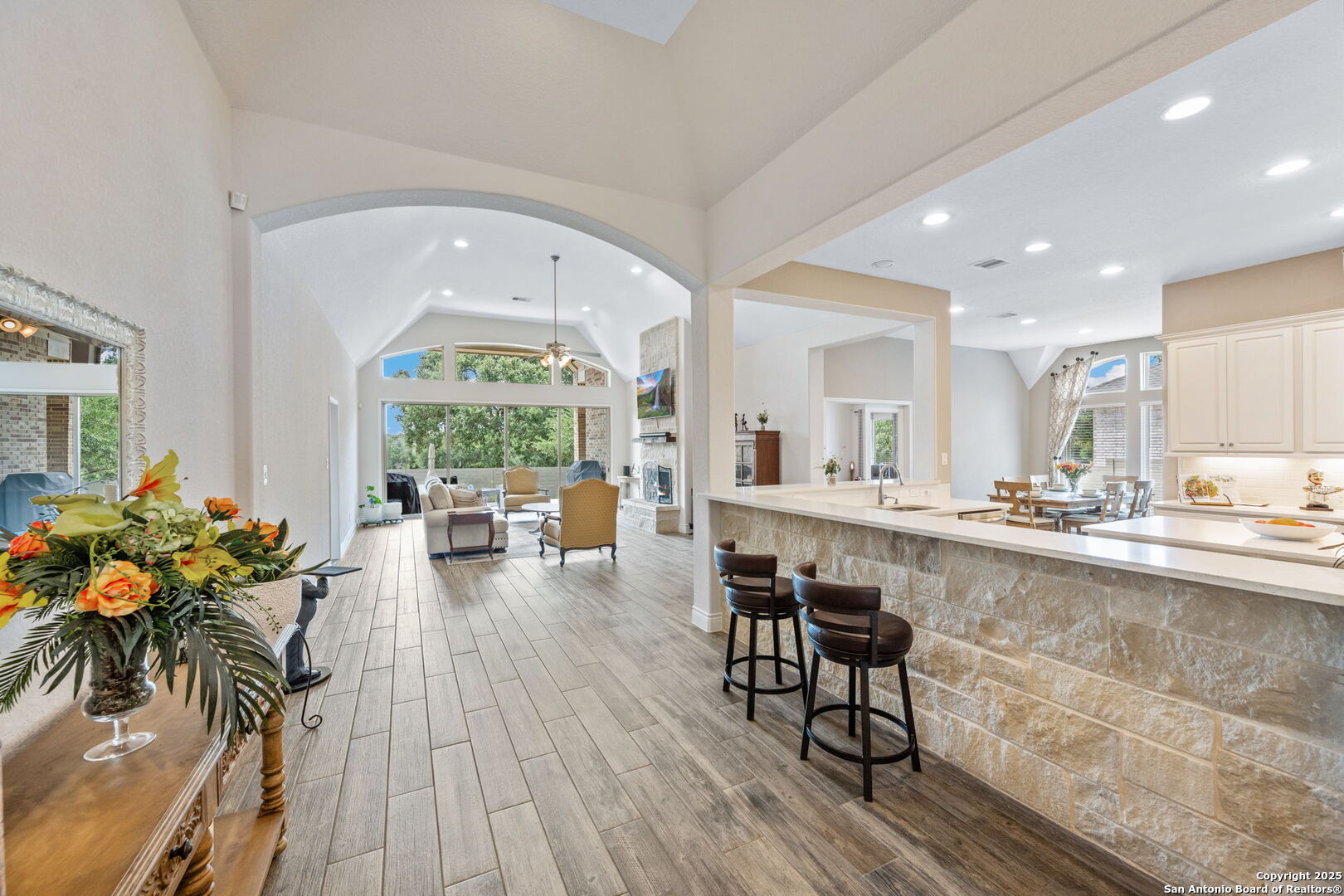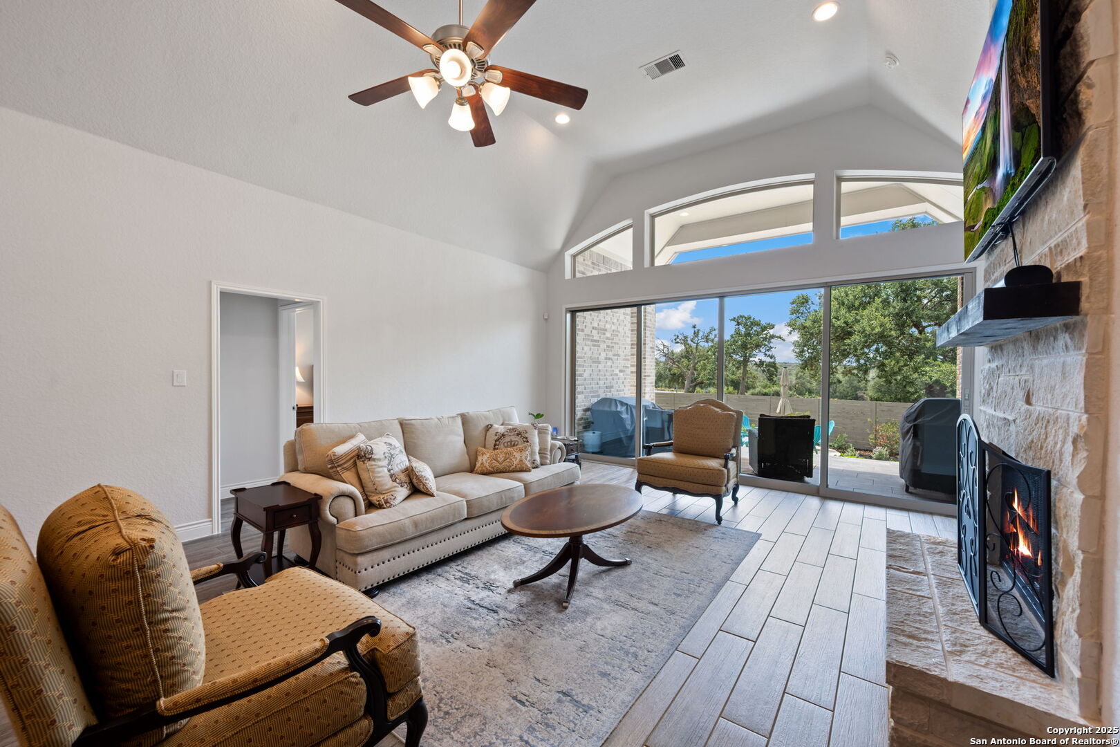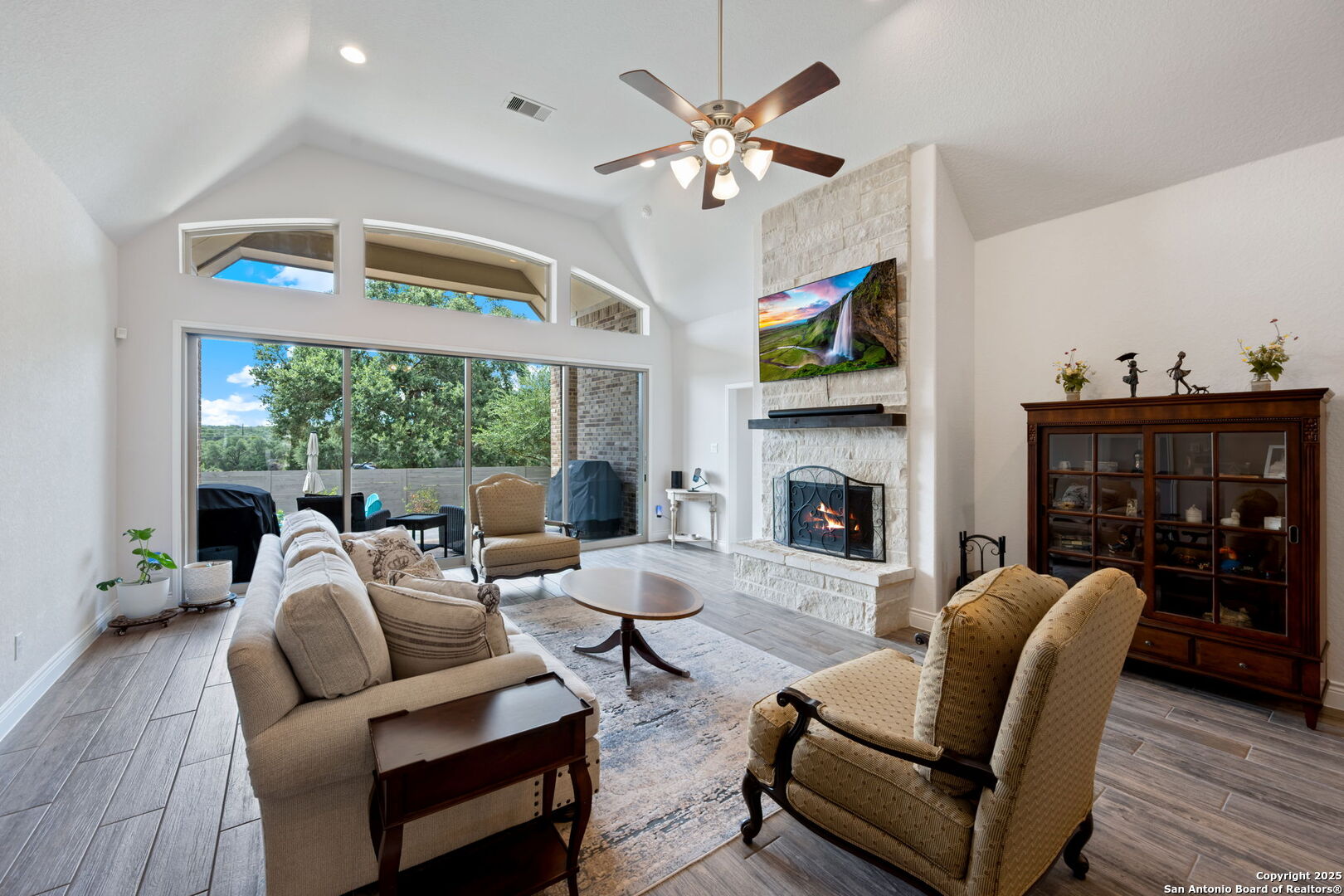 Located in the highly sought-after Grove section of Vintage Oaks, this 2017 Perry Home offers 3,491 square feet of thoughtfully designed living space with 4 bedrooms, 3 bathrooms, and exceptional finishes throughout. Step inside to an open-concept layout that effortlessly connects the well-appointed kitchen, dining, and living areas. The gourmet kitchen features a large center island with bar seating, abundant cabinet space, and sleek finishes - perfect for entertaining or everyday living. The spacious living room is highlighted by oversized windows that flood the space with natural light and frame peaceful backyard views. The home also includes a separate formal dining room for hosting gatherings, as well as a dedicated office that's ideal for working from home. The generous primary suite is a private retreat with a luxurious bath featuring a soaking tub, separate shower, dual vanities, and a walk-in closet. Step outside to your backyard oasis, complete with mature trees, a built-in firepit, and a full sprinkler system - an inviting space to enjoy Hill Country evenings. Enjoy all the incredible amenities Vintage Oaks has to offer, including multiple pools, walking trails, fitness center, clubhouse, and more.