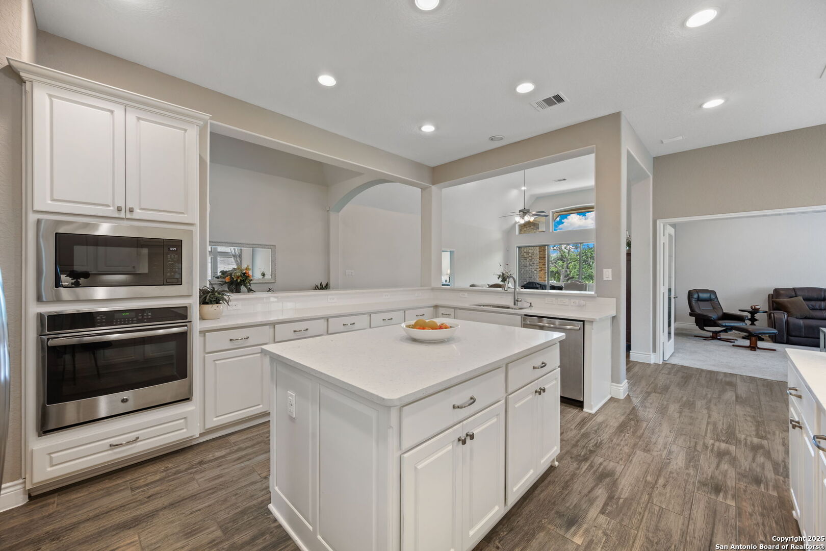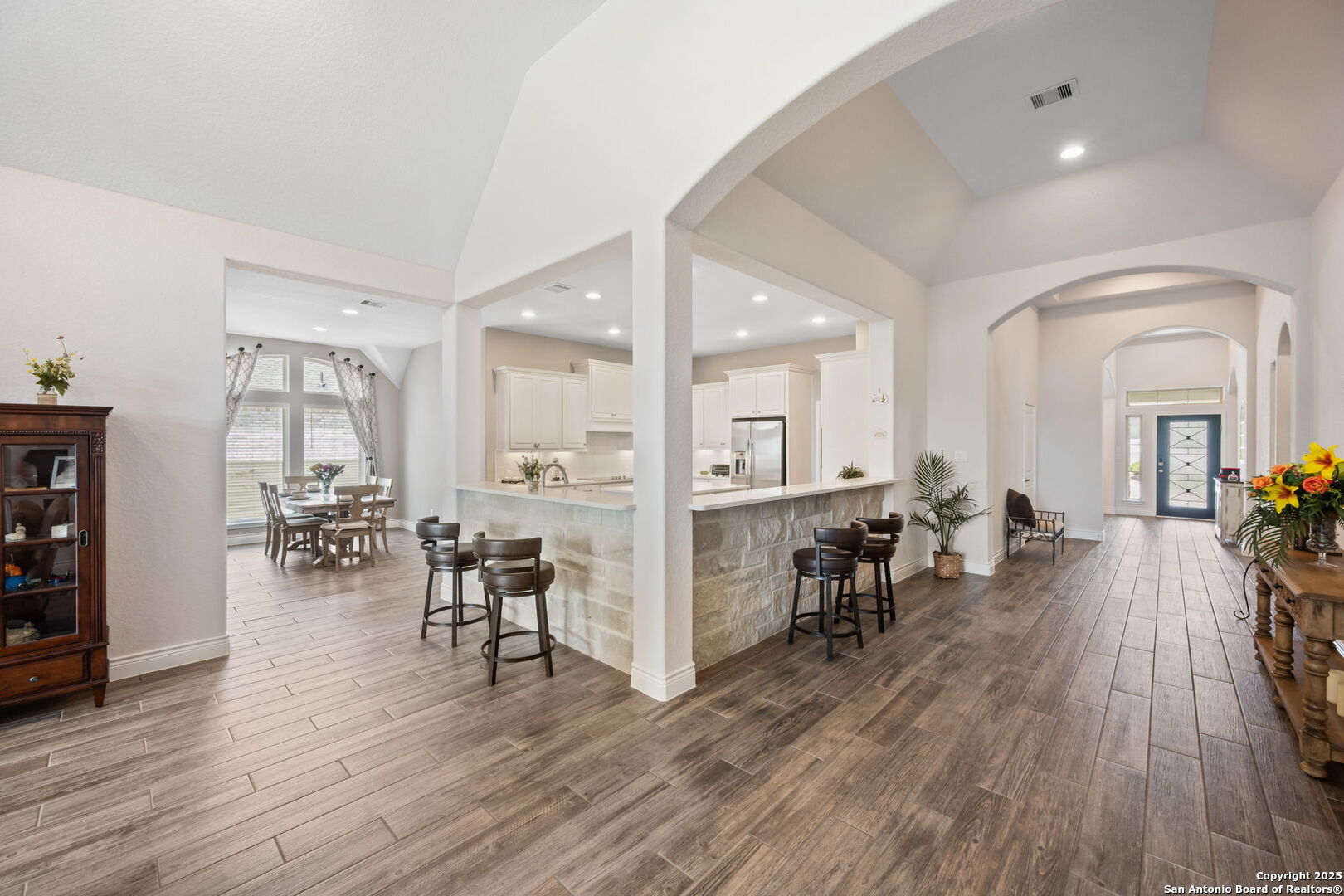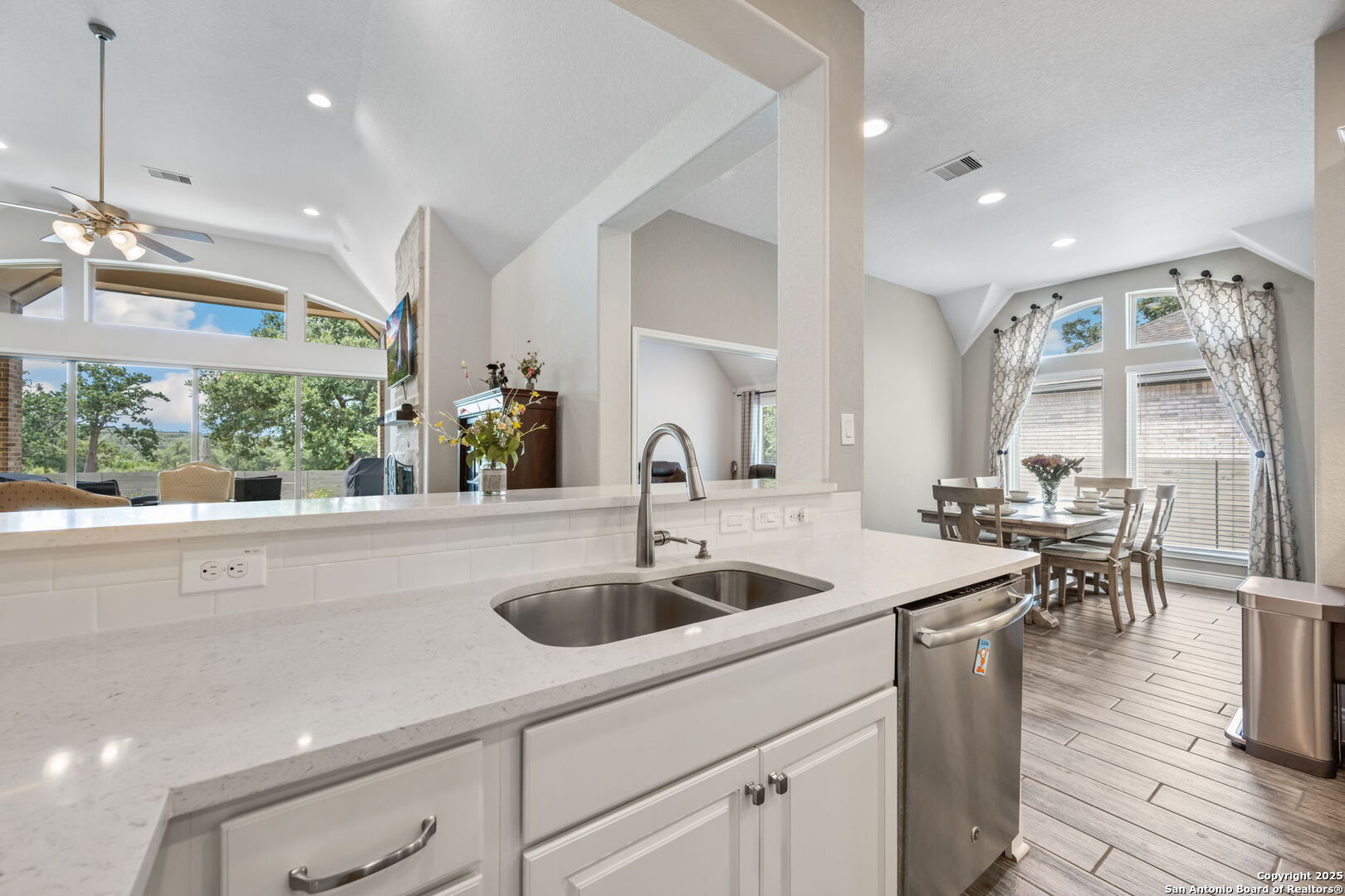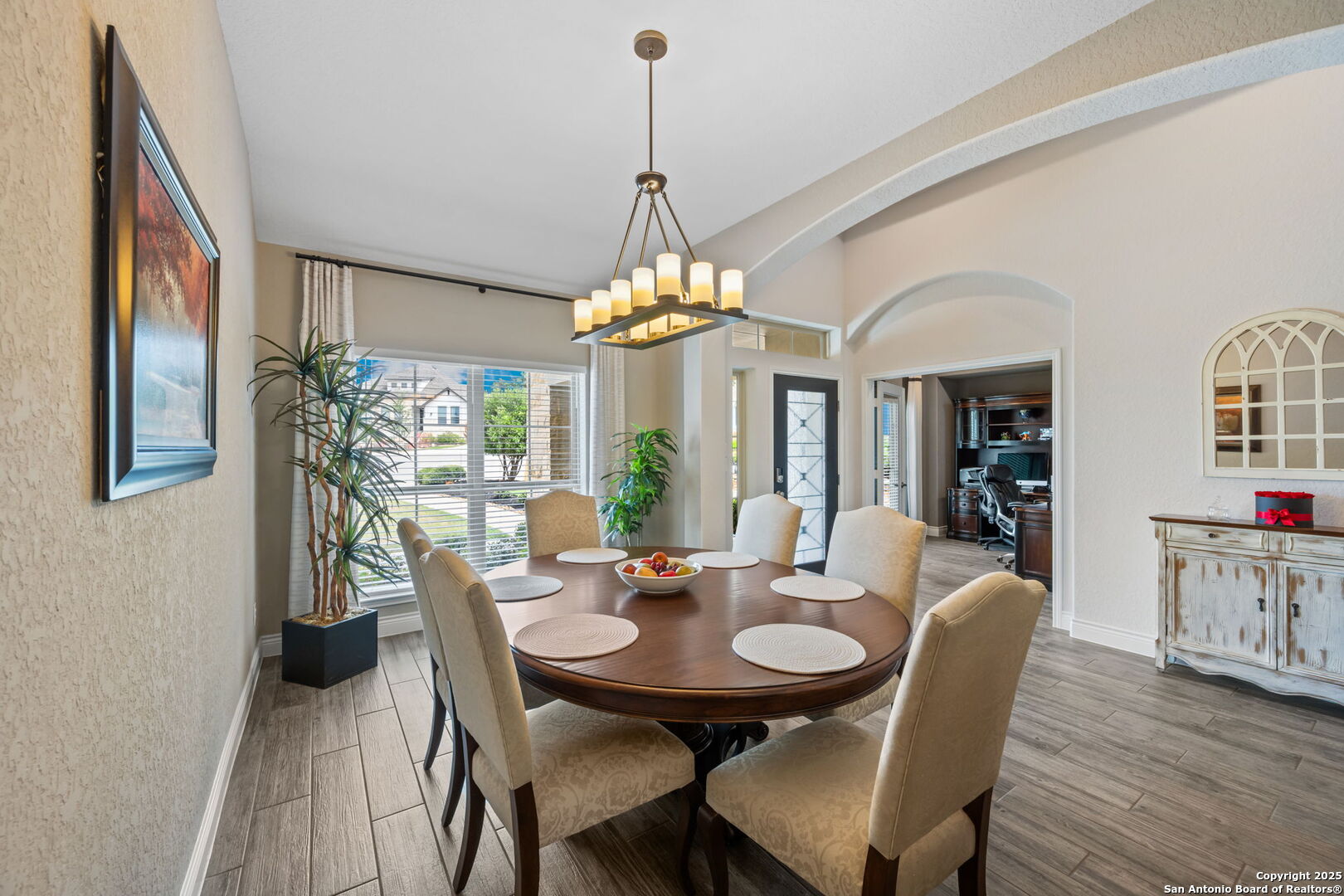 Located in the highly sought-after Grove section of Vintage Oaks, this 2017 Perry Home offers 3,491 square feet of thoughtfully designed living space with 4 bedrooms, 3 bathrooms, and exceptional finishes throughout. Step inside to an open-concept layout that effortlessly connects the well-appointed kitchen, dining, and living areas. The gourmet kitchen features a large center island with bar seating, abundant cabinet space, and sleek finishes - perfect for entertaining or everyday living. The spacious living room is highlighted by oversized windows that flood the space with natural light and frame peaceful backyard views. The home also includes a separate formal dining room for hosting gatherings, as well as a dedicated office that's ideal for working from home. The generous primary suite is a private retreat with a luxurious bath featuring a soaking tub, separate shower, dual vanities, and a walk-in closet. Step outside to your backyard oasis, complete with mature trees, a built-in firepit, and a full sprinkler system - an inviting space to enjoy Hill Country evenings. Enjoy all the incredible amenities Vintage Oaks has to offer, including multiple pools, walking trails, fitness center, clubhouse, and more.