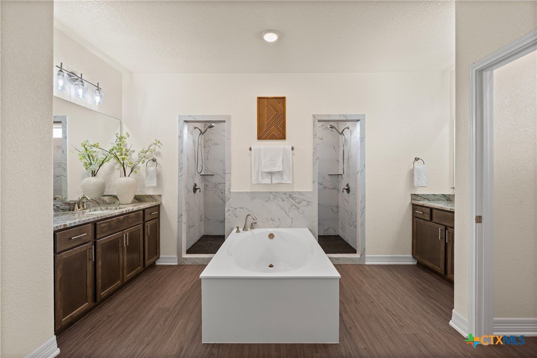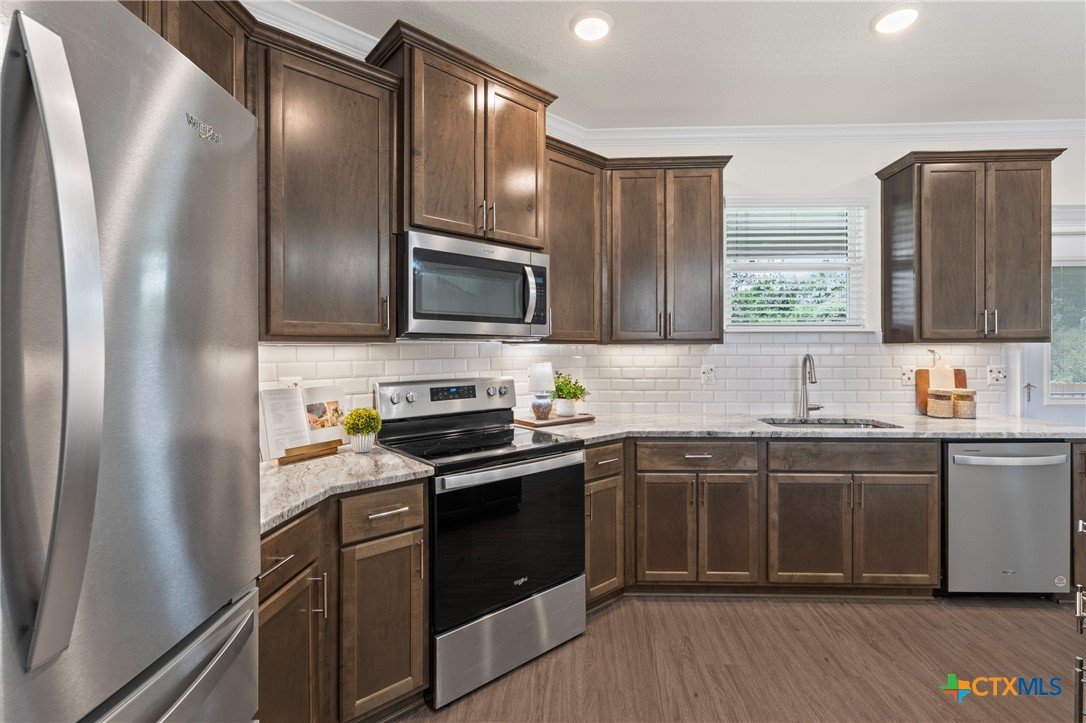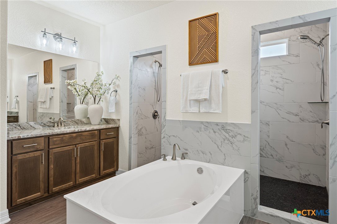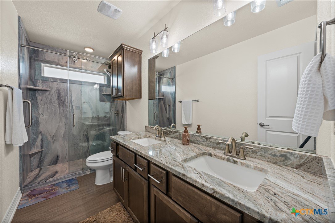 Welcome to 5818 Hamlet Drive—a beautifully updated home in the highly desirable Three Creeks community in Belton! Featuring 4 bedrooms, 2.5 bathrooms, and thoughtful upgrades throughout, this home is truly move-in ready. Step inside to find luxury vinyl plank flooring flowing seamlessly through the main living spaces, creating a modern, low-maintenance interior. The kitchen is both functional and stylish with upgraded countertops, generous storage, and an open layout perfect for entertaining. The primary suite offers a peaceful retreat, complete with separate dual vanities, a huge walk-in shower, and a garden tub—a perfect blend of luxury and convenience. Upstairs, the secondary bathroom has been fully remodeled, offering a fresh, updated feel for guests or family. A brand new roof (2024) adds peace of mind, while the greenbelt lot provides privacy and natural beauty in your own backyard—ideal for relaxing evenings or morning coffee. Located in the scenic Three Creeks neighborhood, you’ll enjoy community hiking trails, Stillhouse Hollow Lake access, parks, and proximity to I-14, Fort Hood, shopping, and top-rated Belton schools. This home checks all the boxes, so schedule your private tour today and make it yours before it’s gone!