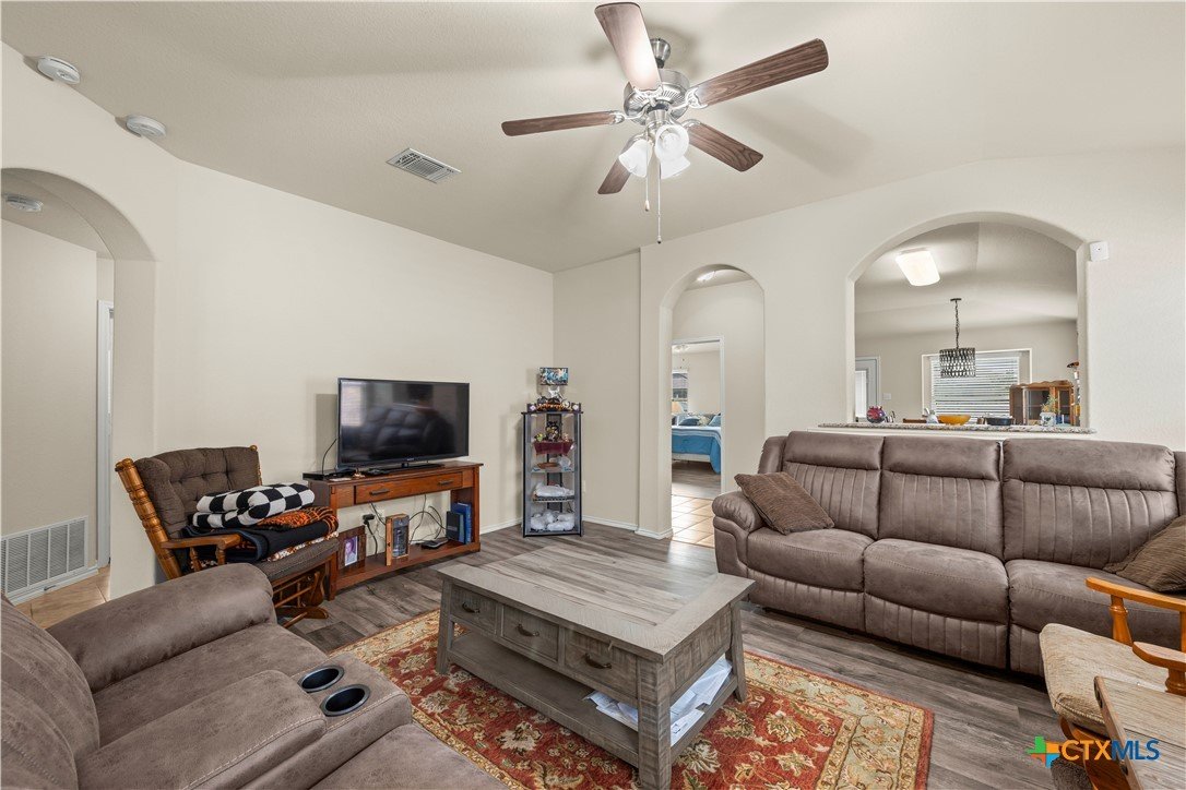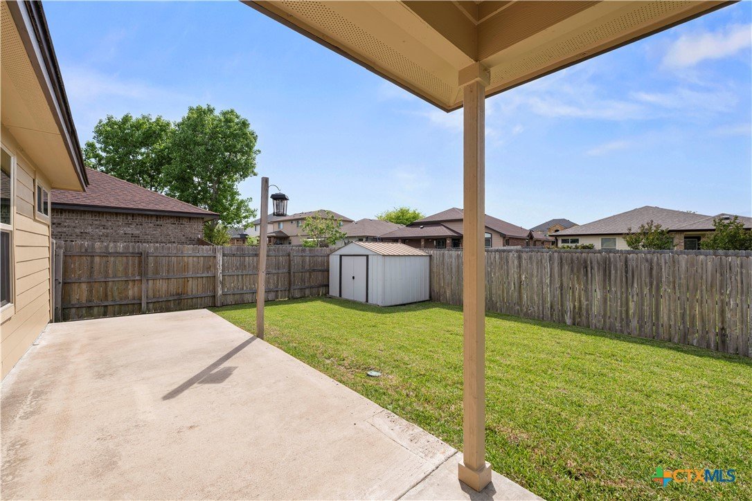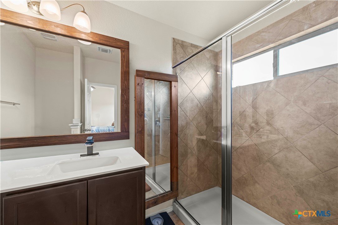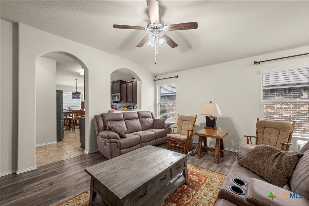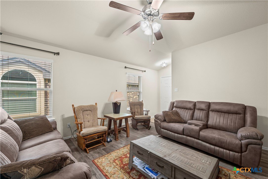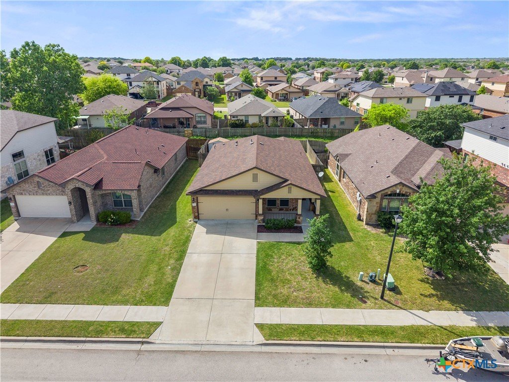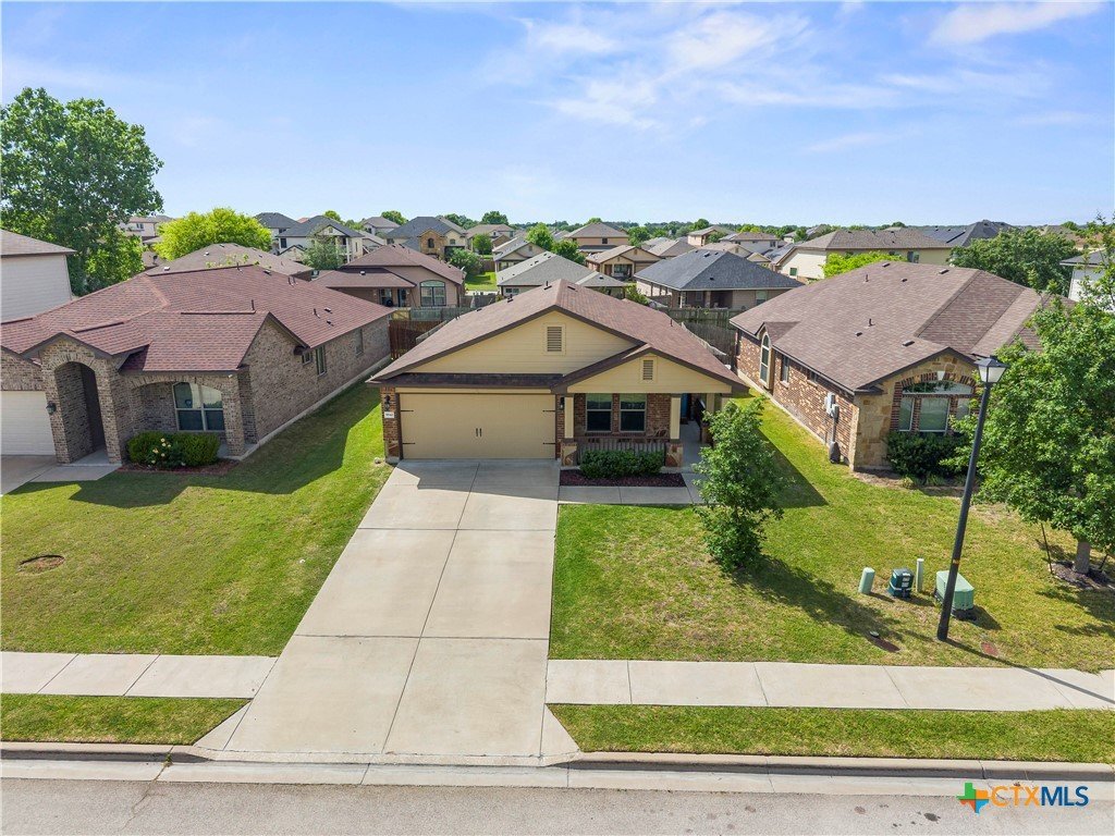 Beautiful home located in Academy ISD featuring a welcoming oversized front porch and an extended covered patio overlooking a private, fenced backyard—perfect for outdoor enjoyment and entertaining. The open-concept floor plan offers an eat-in kitchen that flows seamlessly into the living area, creating a functional space for everyday living and gatherings. The kitchen provides ample cabinet and counter space along with a comfortable dining area. The primary bedroom includes a walk-in closet, double sinks, and a walk-in shower. Additional highlights include durable LVT flooring in the main living areas and a garage equipped with a professionally installed mini-split A/C system, offering flexible space for a workshop, gym, hobby area, or future conversion. Well-maintained and move-in ready, this home combines comfort, functionality, and added upgrades. Schedule your showing today!
