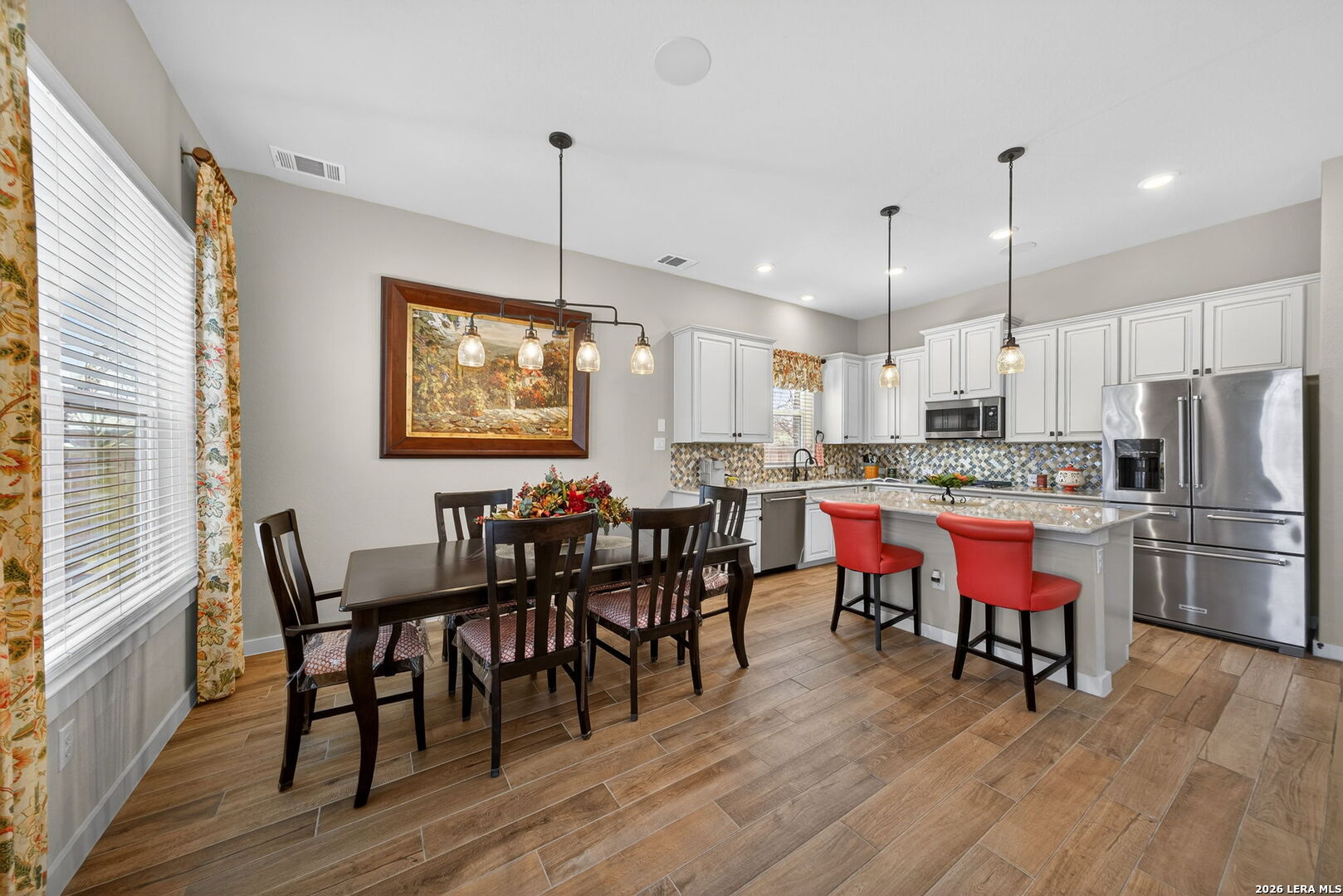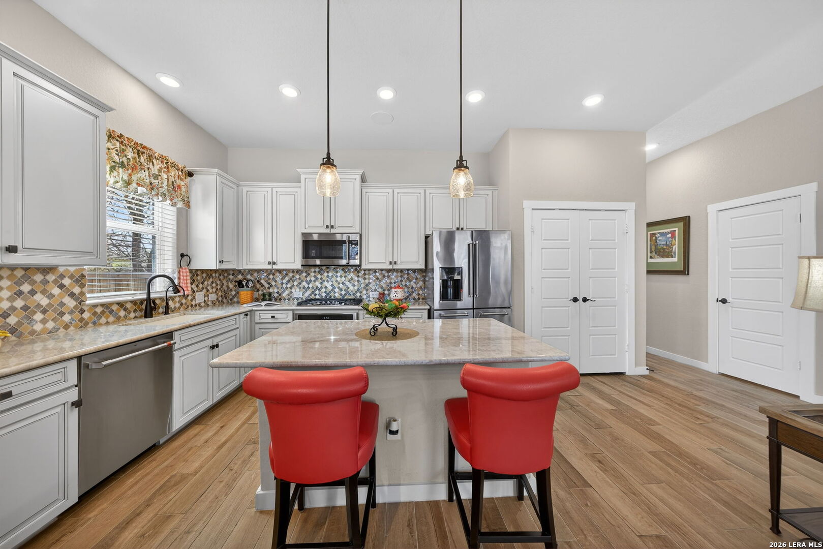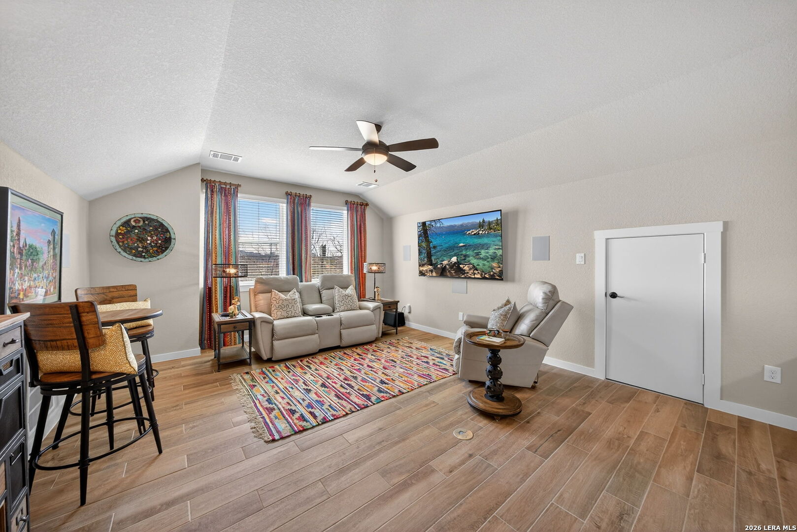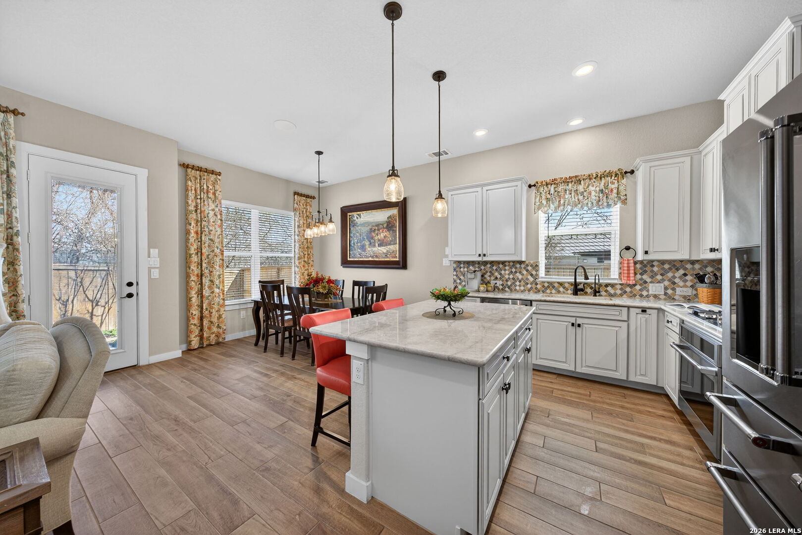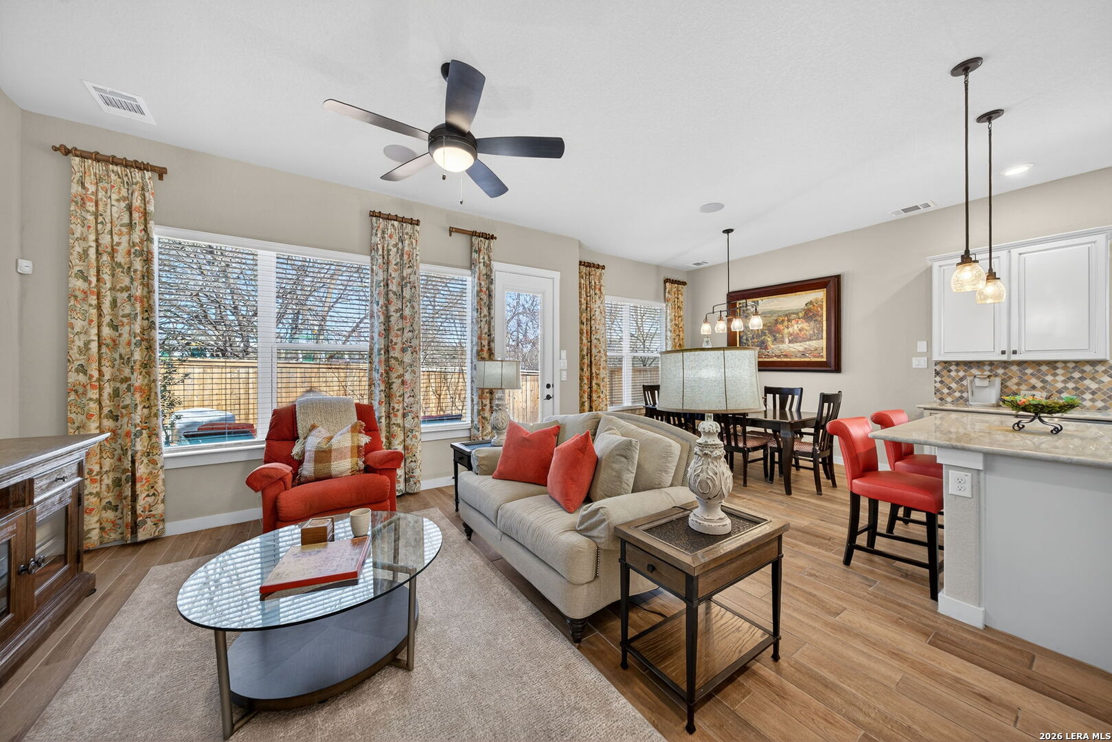 Located directly beside the serene HOA park, this impeccably upgraded modern home offers the very best in low-maintenance living. Designed with both comfort and style in mind, the residence features ceramic wood-look tile throughout all three levels-no carpet anywhere-creating a cohesive and sophisticated feel. Thoughtful upgrades abound, including a tankless water heater, remote-controlled power blinds, whole-home sound system, custom drapery, and premium kitchen finishes. The chef's kitchen is beautifully appointed with high-end countertops, upgraded appliances, custom cabinetry, and convenient roll-out drawers for effortless organization. The main level welcomes you with an inviting entry and an open-concept layout that seamlessly connects the kitchen and family room, all overlooking the private backyard. Outdoors, the xeriscaped yard offers a tranquil, low-maintenance retreat with thoughtfully selected plantings-perfect for relaxing or entertaining. On the second level, you'll find the spacious primary suite, a secondary bedroom, and a versatile flex space currently used as a music room-ideal as an additional bedroom, home office, or creative studio. The third level provides a generous bonus room complete with a kitchenette, making it the perfect media room, game room, guest retreat, or private escape. Modern luxury, functional design, and an unbeatable location next to open green space-this home truly has it all.