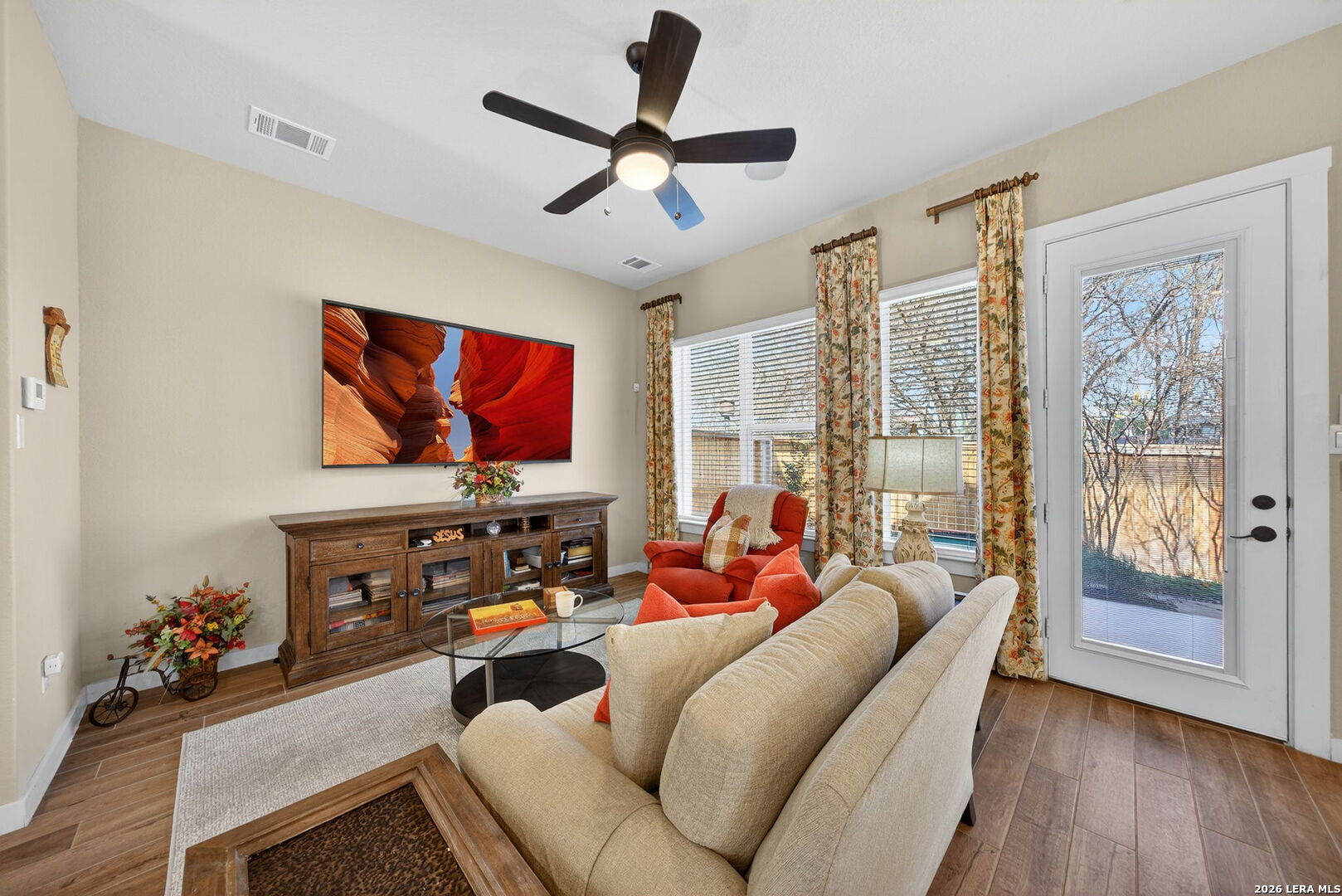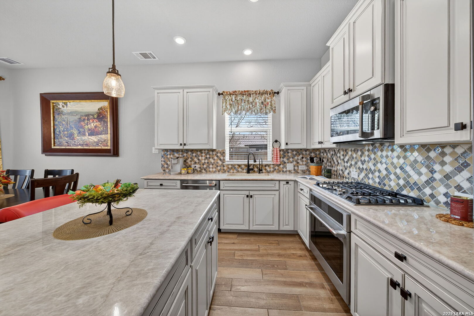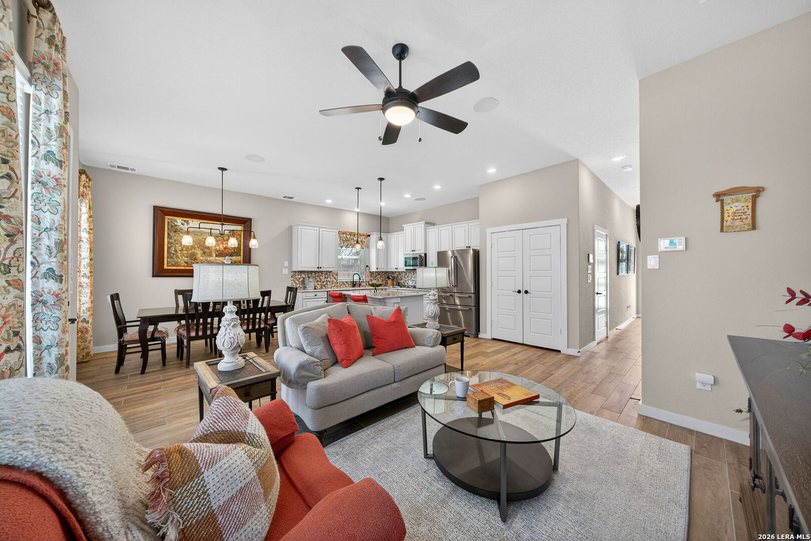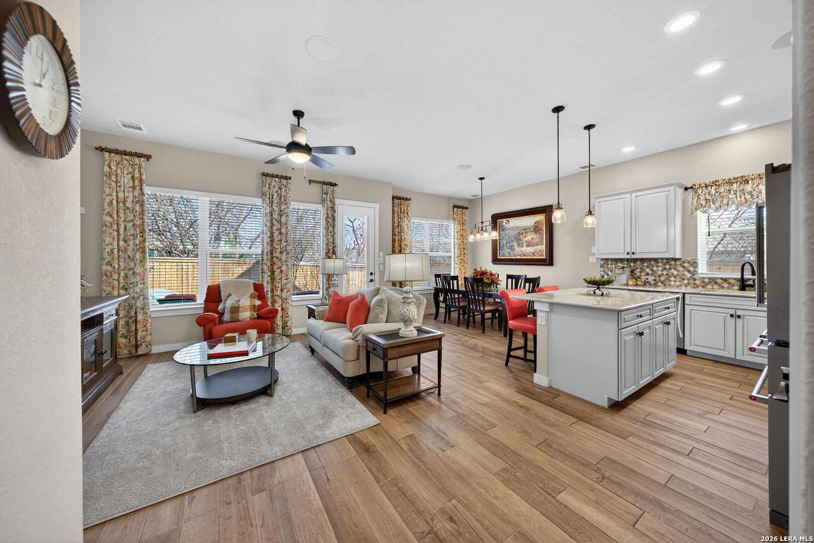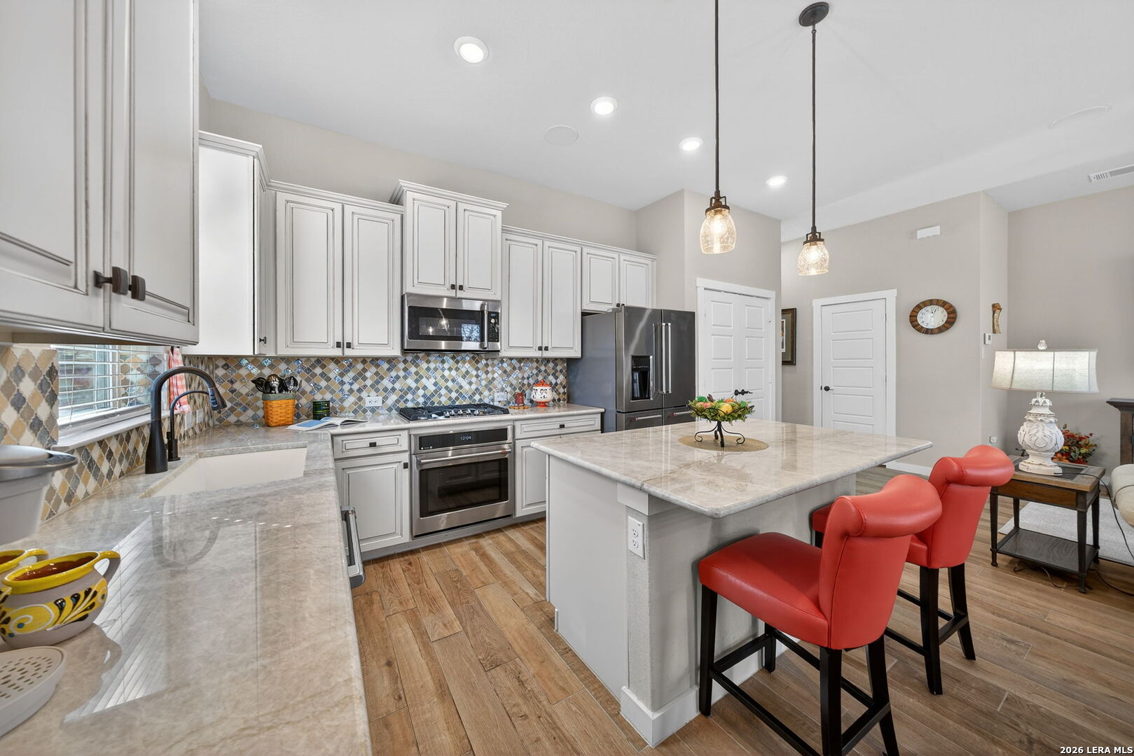 Located directly beside the serene HOA park, this impeccably upgraded modern home offers the very best in low-maintenance living. Designed with both comfort and style in mind, the residence features ceramic wood-look tile throughout all three levels-no carpet anywhere-creating a cohesive and sophisticated feel. Thoughtful upgrades abound, including a tankless water heater, remote-controlled power blinds, whole-home sound system, custom drapery, and premium kitchen finishes. The chef's kitchen is beautifully appointed with high-end countertops, upgraded appliances, custom cabinetry, and convenient roll-out drawers for effortless organization. The main level welcomes you with an inviting entry and an open-concept layout that seamlessly connects the kitchen and family room, all overlooking the private backyard. Outdoors, the xeriscaped yard offers a tranquil, low-maintenance retreat with thoughtfully selected plantings-perfect for relaxing or entertaining. On the second level, you'll find the spacious primary suite, a secondary bedroom, and a versatile flex space currently used as a music room-ideal as an additional bedroom, home office, or creative studio. The third level provides a generous bonus room complete with a kitchenette, making it the perfect media room, game room, guest retreat, or private escape. Modern luxury, functional design, and an unbeatable location next to open green space-this home truly has it all.
