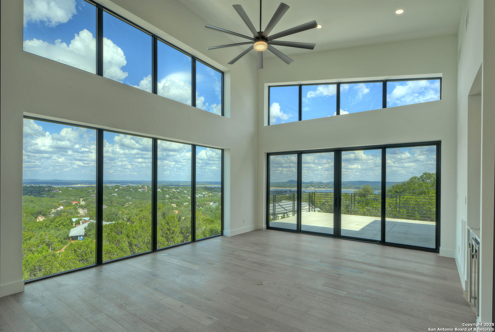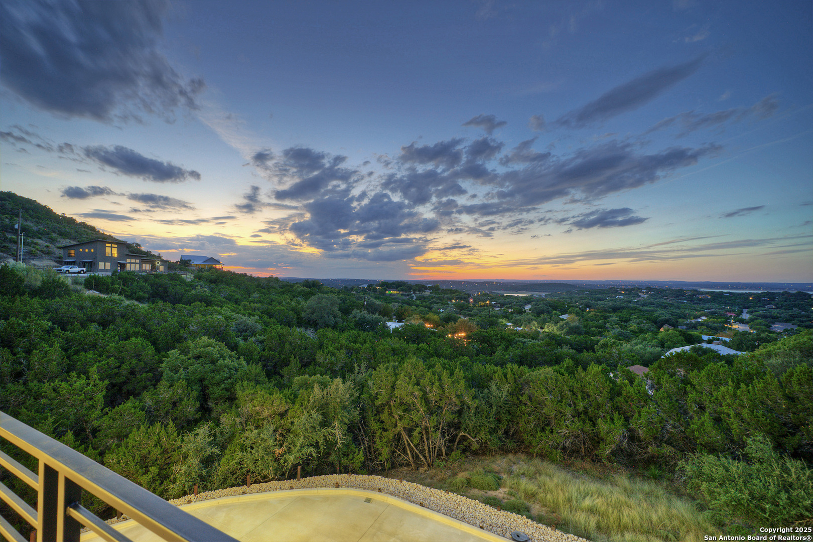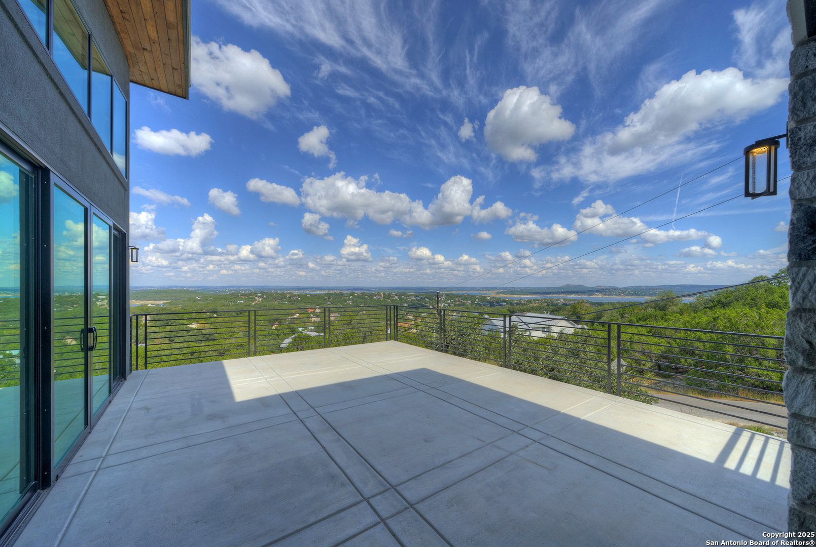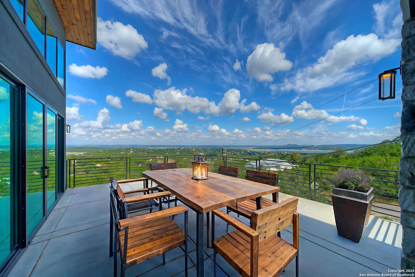 Soaring high above the Texas Hill Country, this 4,000+ square foot custom estate offers breathtaking panoramic views of Canyon Lake from nearly every room. Built for luxury and designed to showcase the stunning natural surroundings, the property provides an exceptional blend of elegant indoor living and spectacular outdoor entertaining. The house is built with insulated concrete forms (ICF), which combines the strength of steel-reinforced concrete with the energy efficiency of foam insulation. A grand-scale, open-concept living area with soaring ceilings, fireplace, and a wall of floor-to-ceiling windows that perfectly frame the mesmerizing lake views. Wood floors flow throughout the main living spaces, reflecting the abundant natural light. Gourmet chef's kitchen featuring premium, professional-grade stainless steel appliances, custom cabinetry, and an oversized island with generous prep space and bar seating. The luxurious owner's retreat boasts floor-to-ceiling windows, a spa-style bathroom with a freestanding soaking tub and rainfall shower, walk-in closet with direct access to the laundry room, and a private balcony overlooking the water. A residential elevator provides effortless access to all levels of the expansive floor plan. Flexible bonus spaces that can be used as a home theater, a fitness room, safe room, wine cellar, or a dedicated home office, providing a customized experience for the discerning homeowner. Multiple expansive outdoor decks offer spectacular 360-degree vistas of the lake and rolling hills.