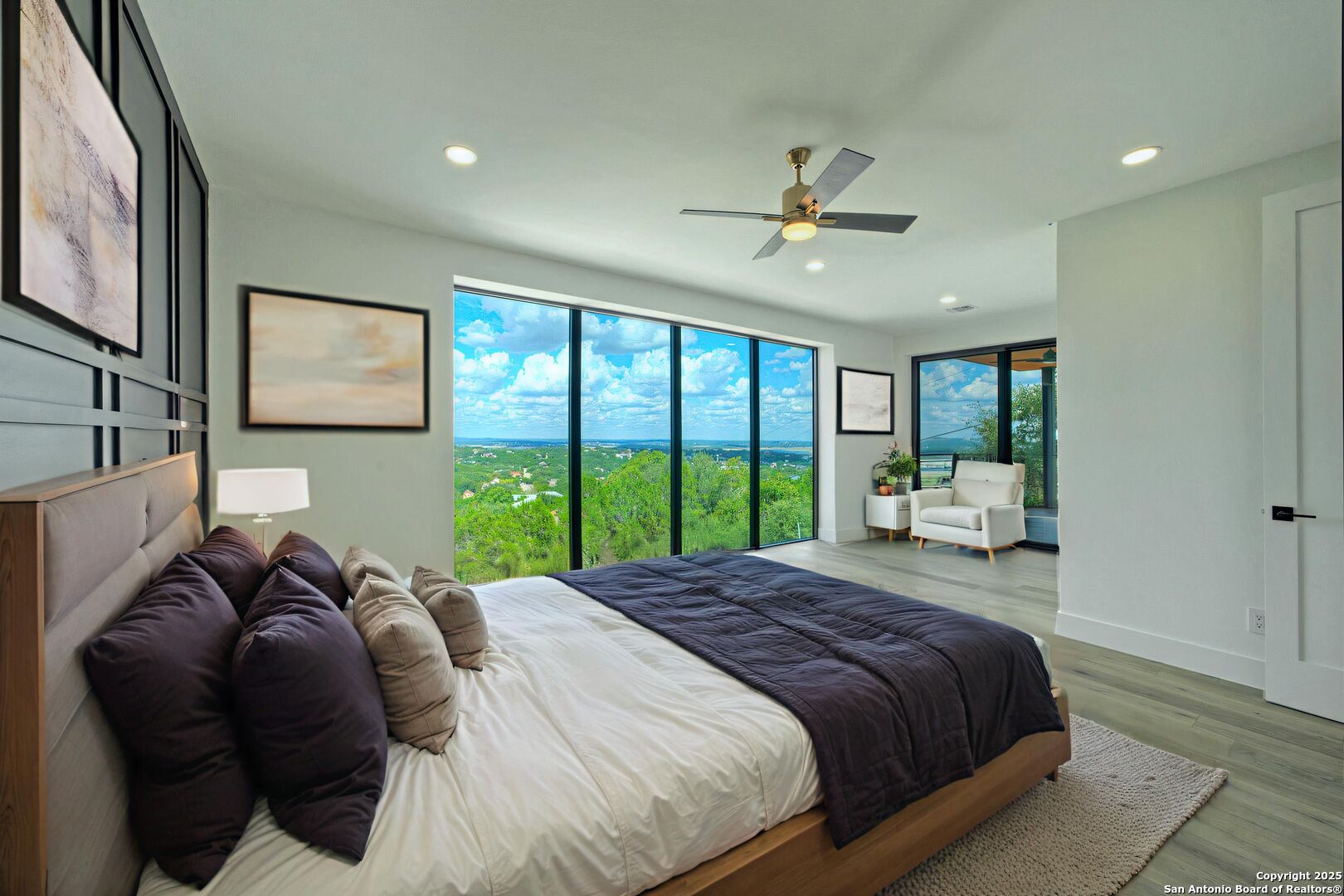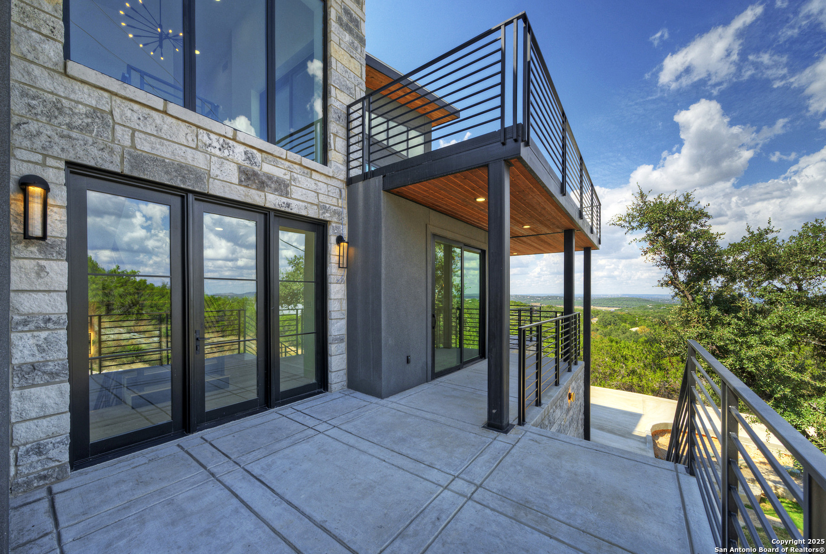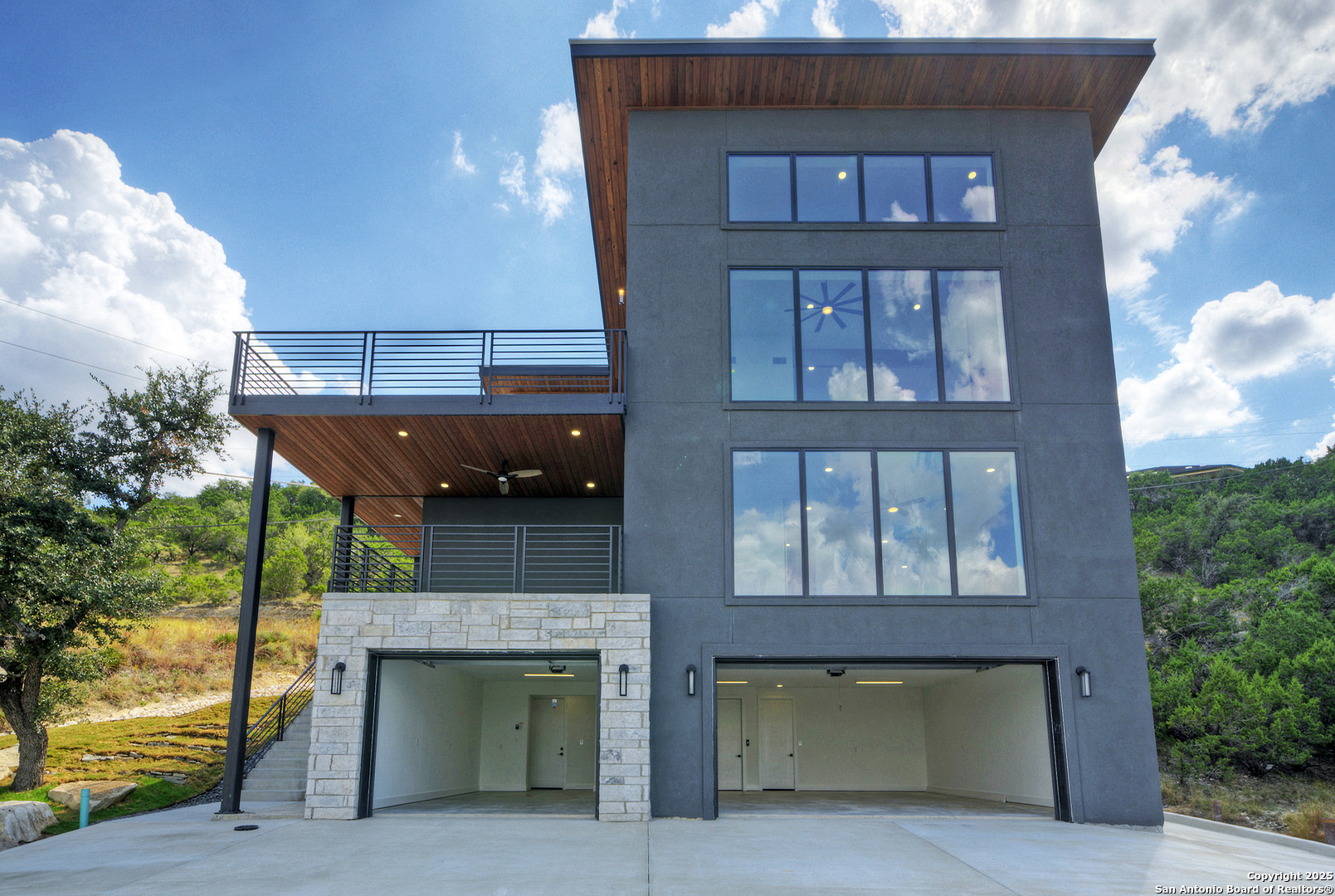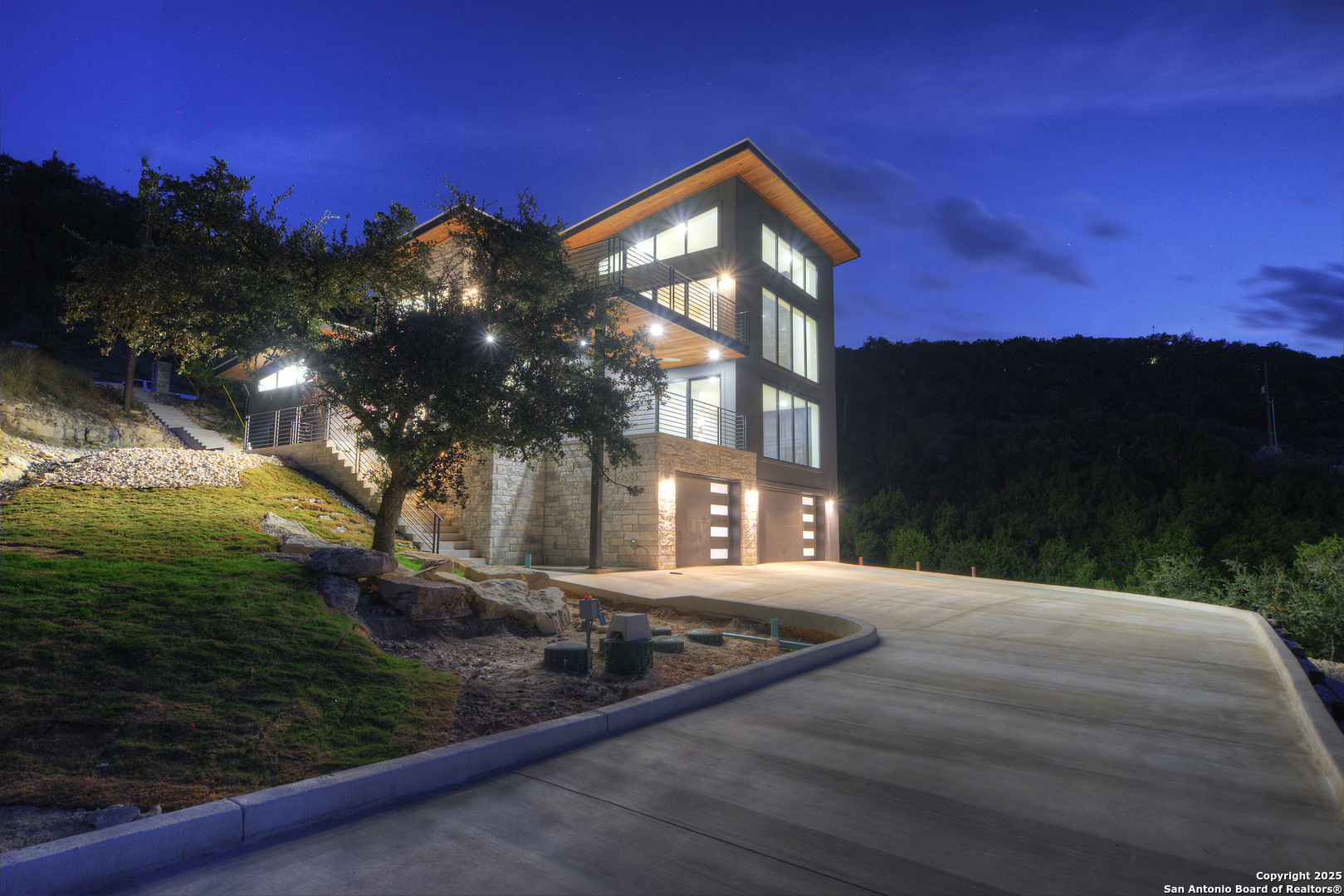 Soaring high above the Texas Hill Country, this 4,000+ square foot custom estate offers breathtaking panoramic views of Canyon Lake from nearly every room. Built for luxury and designed to showcase the stunning natural surroundings, the property provides an exceptional blend of elegant indoor living and spectacular outdoor entertaining. The house is built with insulated concrete forms (ICF), which combines the strength of steel-reinforced concrete with the energy efficiency of foam insulation. A grand-scale, open-concept living area with soaring ceilings, fireplace, and a wall of floor-to-ceiling windows that perfectly frame the mesmerizing lake views. Wood floors flow throughout the main living spaces, reflecting the abundant natural light. Gourmet chef's kitchen featuring premium, professional-grade stainless steel appliances, custom cabinetry, and an oversized island with generous prep space and bar seating. The luxurious owner's retreat boasts floor-to-ceiling windows, a spa-style bathroom with a freestanding soaking tub and rainfall shower, walk-in closet with direct access to the laundry room, and a private balcony overlooking the water. A residential elevator provides effortless access to all levels of the expansive floor plan. Flexible bonus spaces that can be used as a home theater, a fitness room, safe room, wine cellar, or a dedicated home office, providing a customized experience for the discerning homeowner. Multiple expansive outdoor decks offer spectacular 360-degree vistas of the lake and rolling hills.