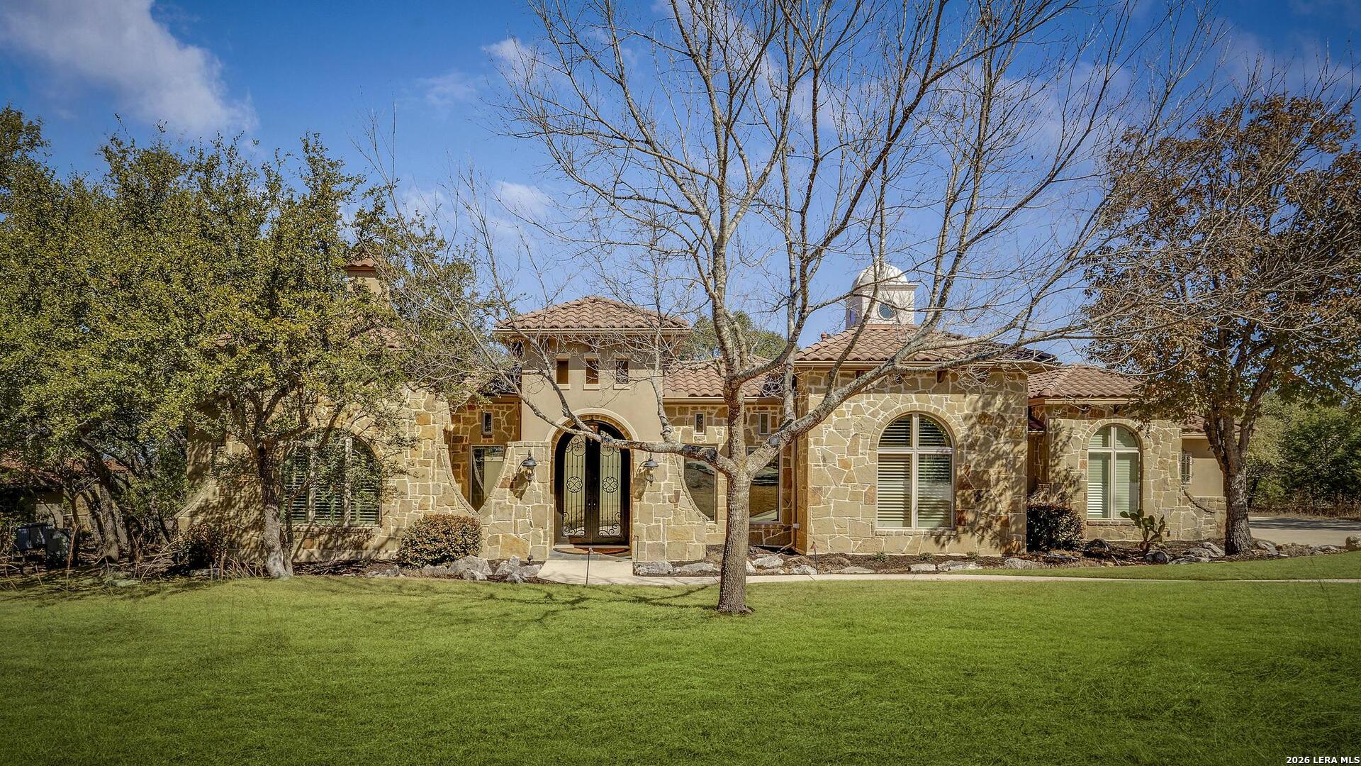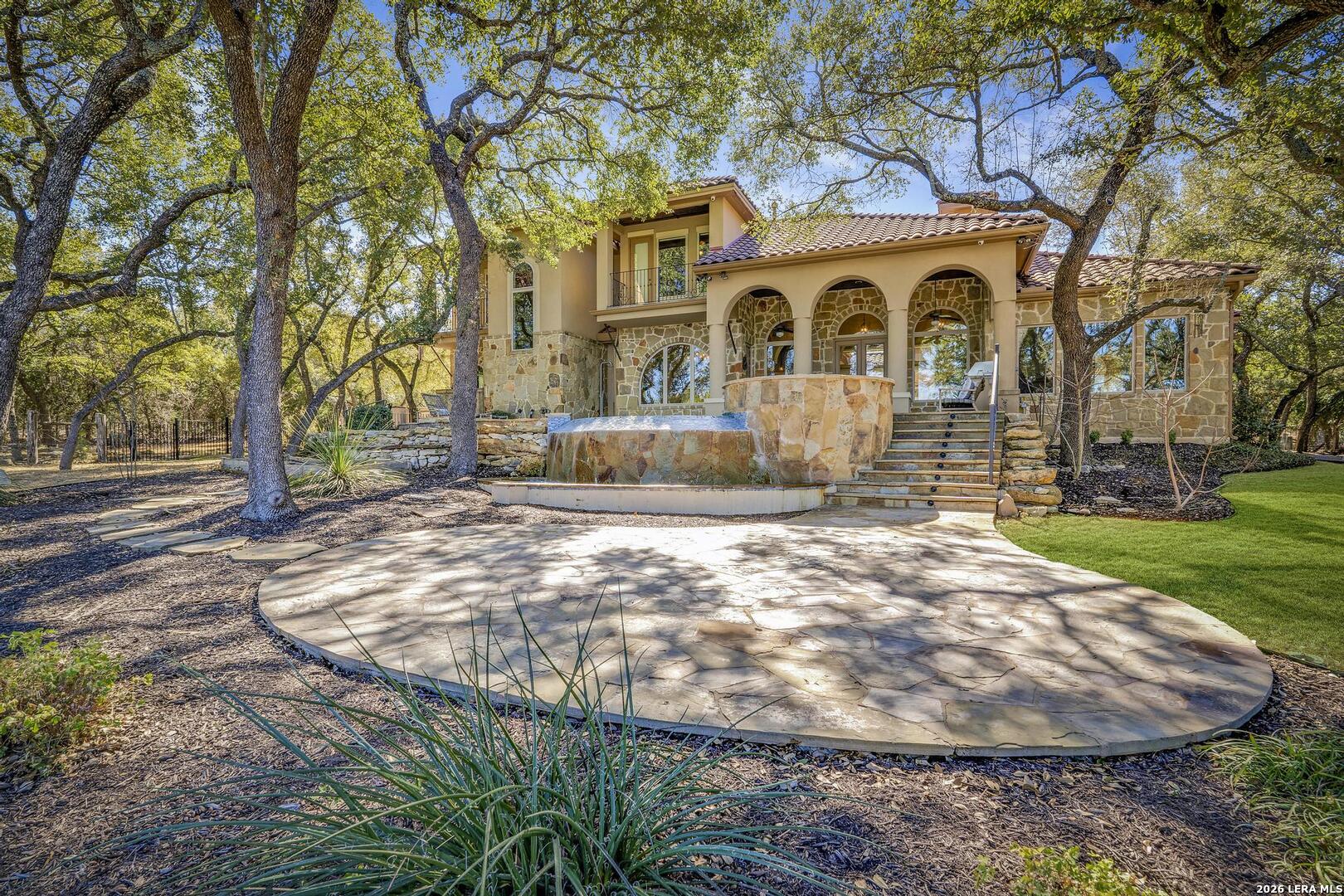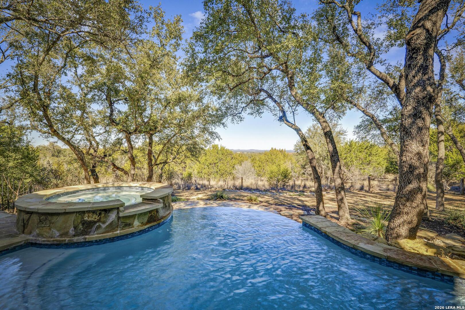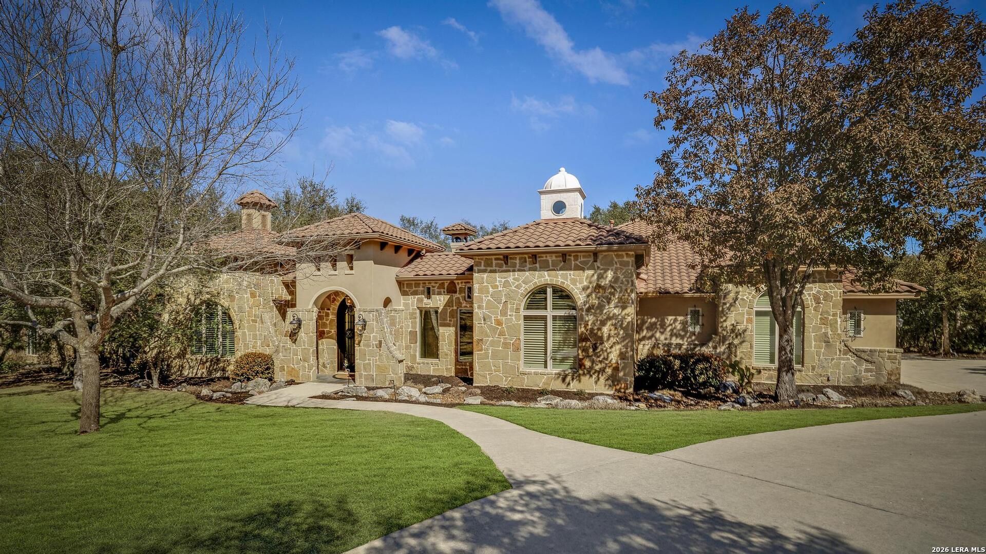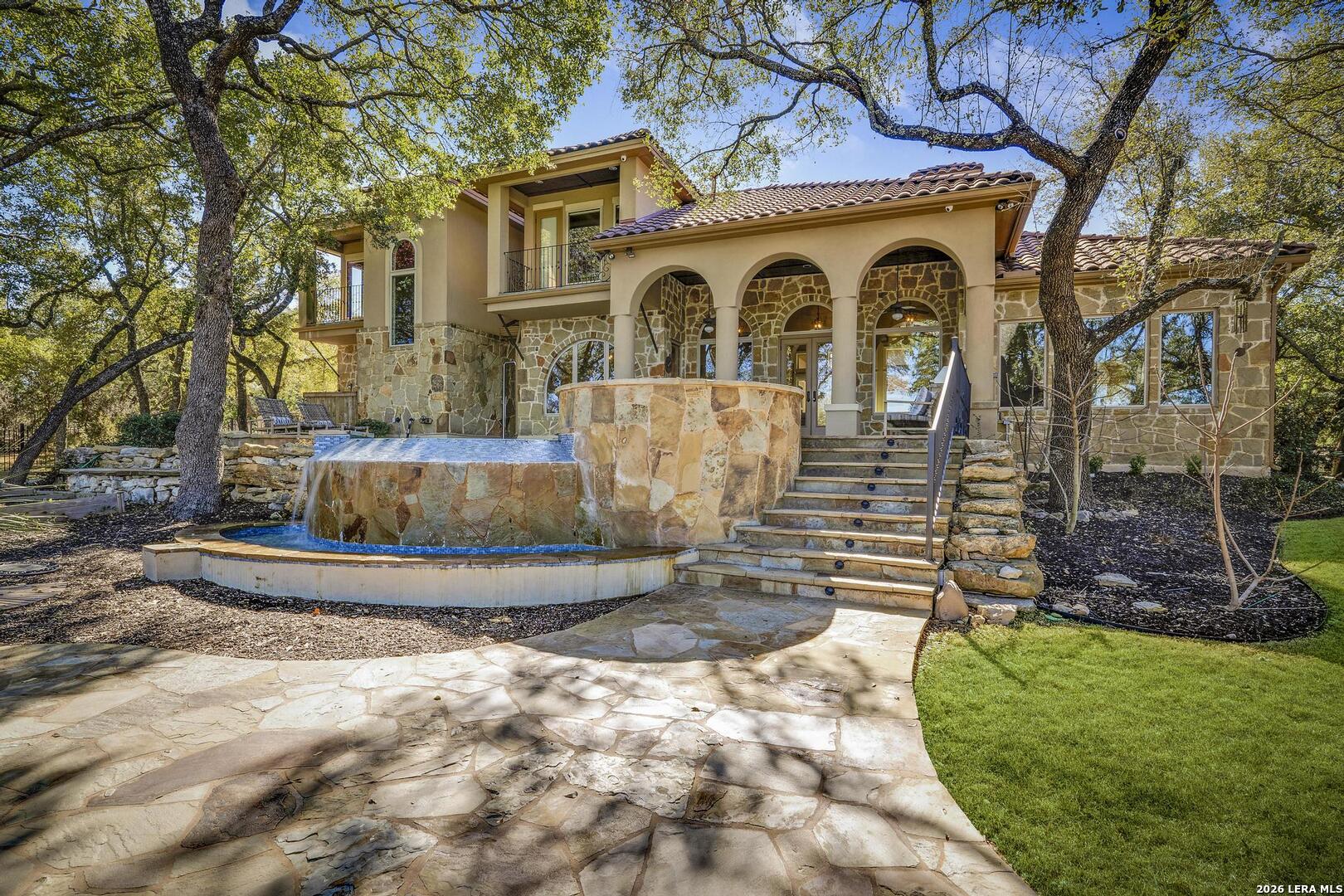 Master Golf Membership available for purchase. Perfectly positioned on 1.07 acres within the highly coveted Clubs Village of Cordillera Ranch, this elegant Hill Country retreat offers exceptional privacy and the convenience of a short golf cart ride to the clubhouse and championship golf course. A pair of striking iron doors opens to a grand entry, where serene courtyard views frame a tranquil koi pond and waterfall-an inviting setting for morning coffee or quiet reflection. The formal living or sitting room is ideally proportioned to accommodate a grand piano, creating a refined space for music-filled evenings conversation, while the dining room provides an elegant backdrop for memorable dinners and celebrations. The heart of the home is a beautifully appointed chef's kitchen featuring custom cabinetry, double ovens, an 8-burner WOLF gas cooktop, double ovens, Sub-Zero refrigeration, and a generous walk-in pantry. A large central island anchors the space, flowing seamlessly into both the breakfast room and family room-ideal for everyday living and effortless entertaining. The grand family room, centered around a warm fireplace, overlooks the covered patio and resort-style pool, creating a welcoming backdrop for gatherings, movie nights, or relaxed evenings at home. The owner's suite is a true sanctuary, showcasing hardwood floors and a spa-inspired bath with soaking tub, walk-in shower, dual vanities, and an expansive custom wardrobe room. Guests are well accommodated with a private main-level suite near the courtyard, while two additional upstairs bedrooms each offer ensuite baths. A dedicated study with built-in desk and shelving provides a quiet, functional work-from-home space. Fabulous views of the Twin Sisters grace the outdoor space providing a year-round oasis with a covered patio, built-in outdoor kitchen, and multiple areas for lounging or dining, all overlooking a sparkling negative-edge pool and spa with outdoor shower. Completing the home is a GENERAC propane generator, an attached three-car garage and abundant storage. Experience refined Hill Country living at its finest in one of Cordillera Ranch's most desirable settings.