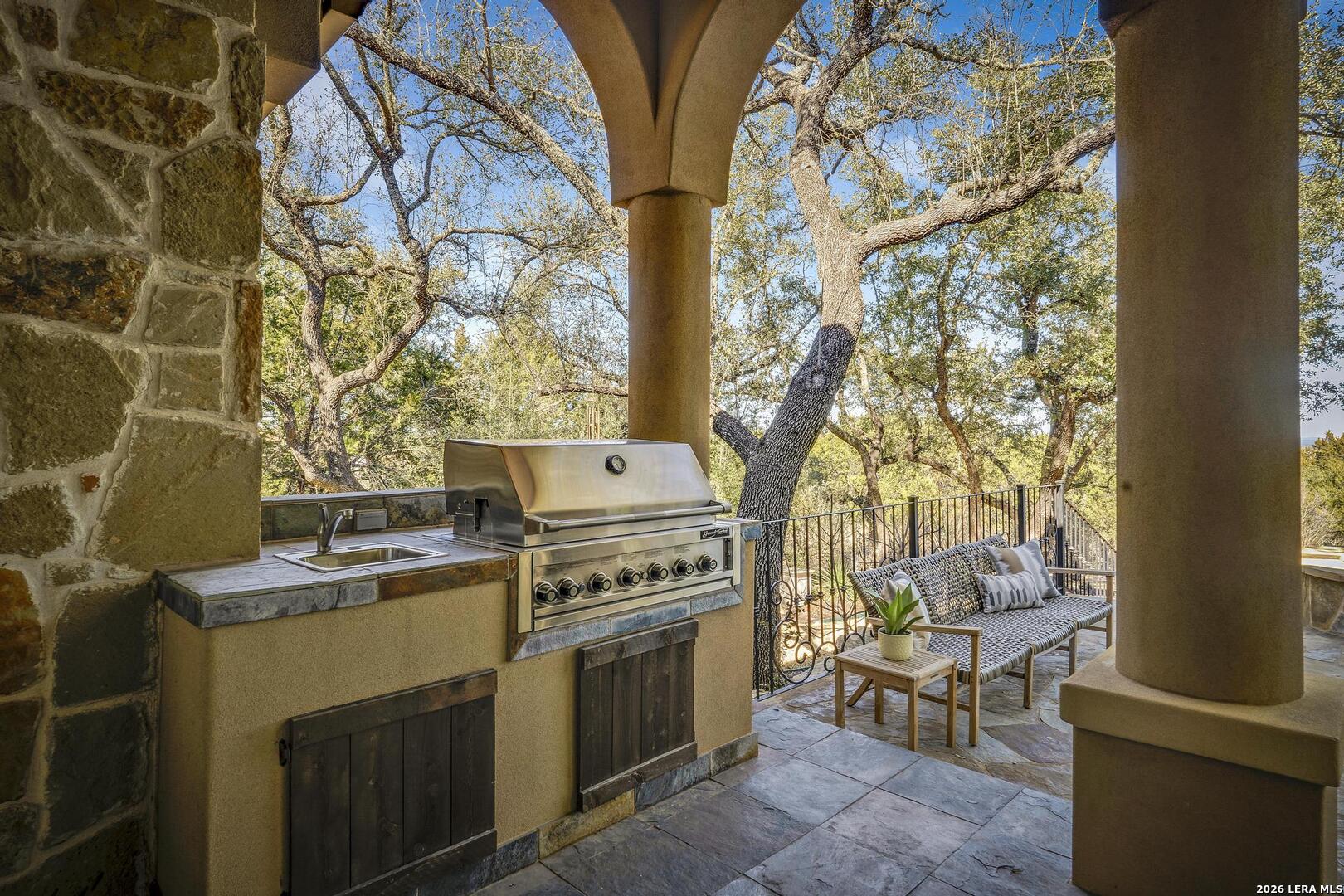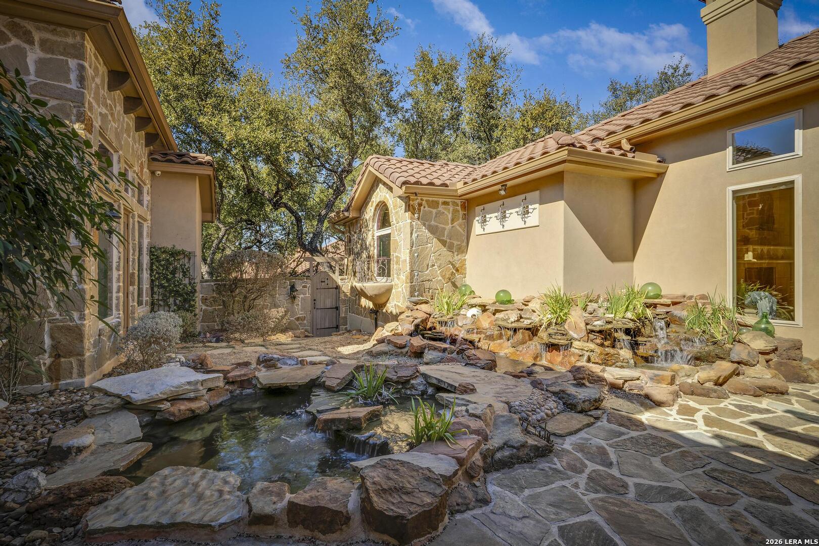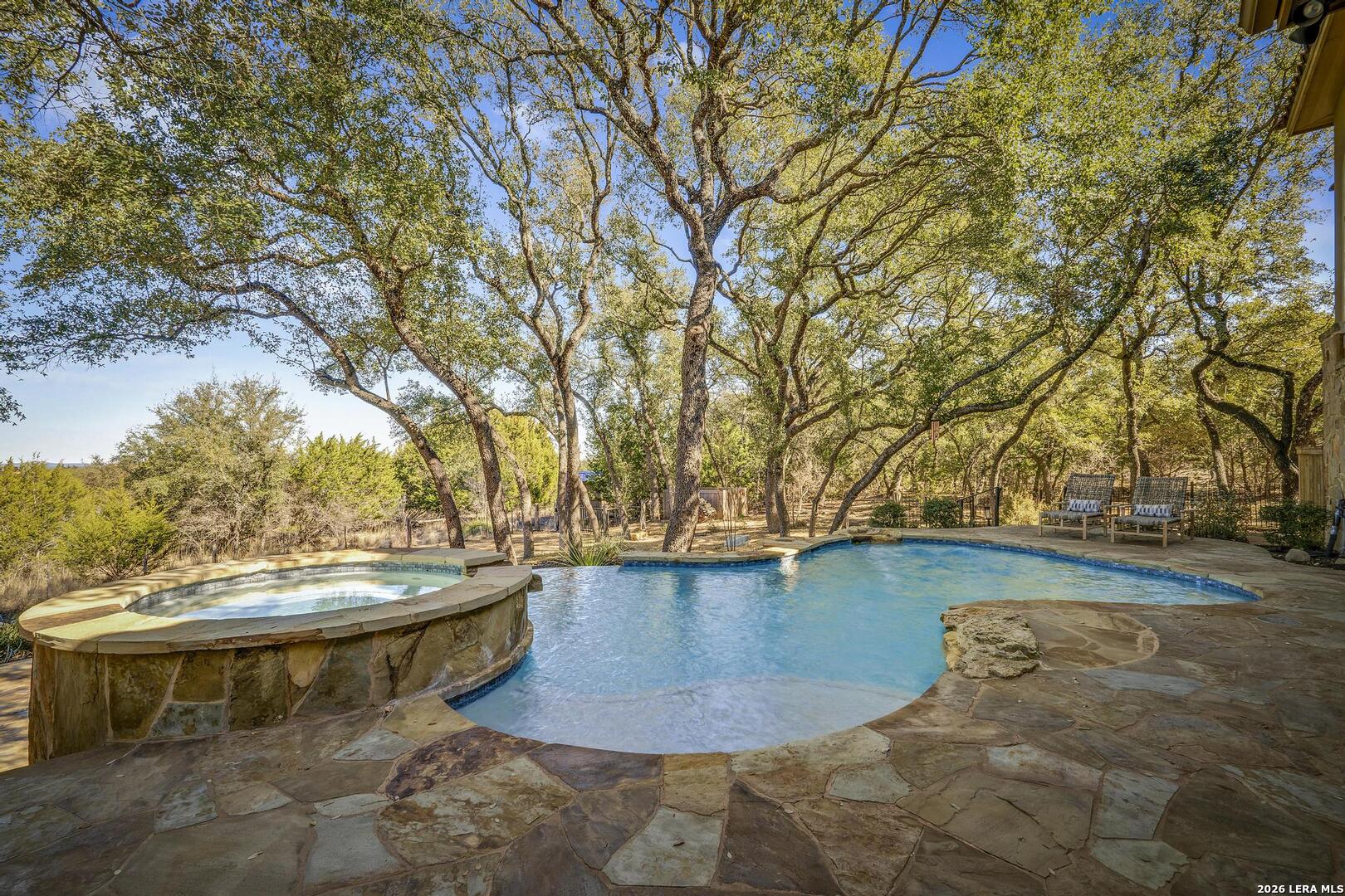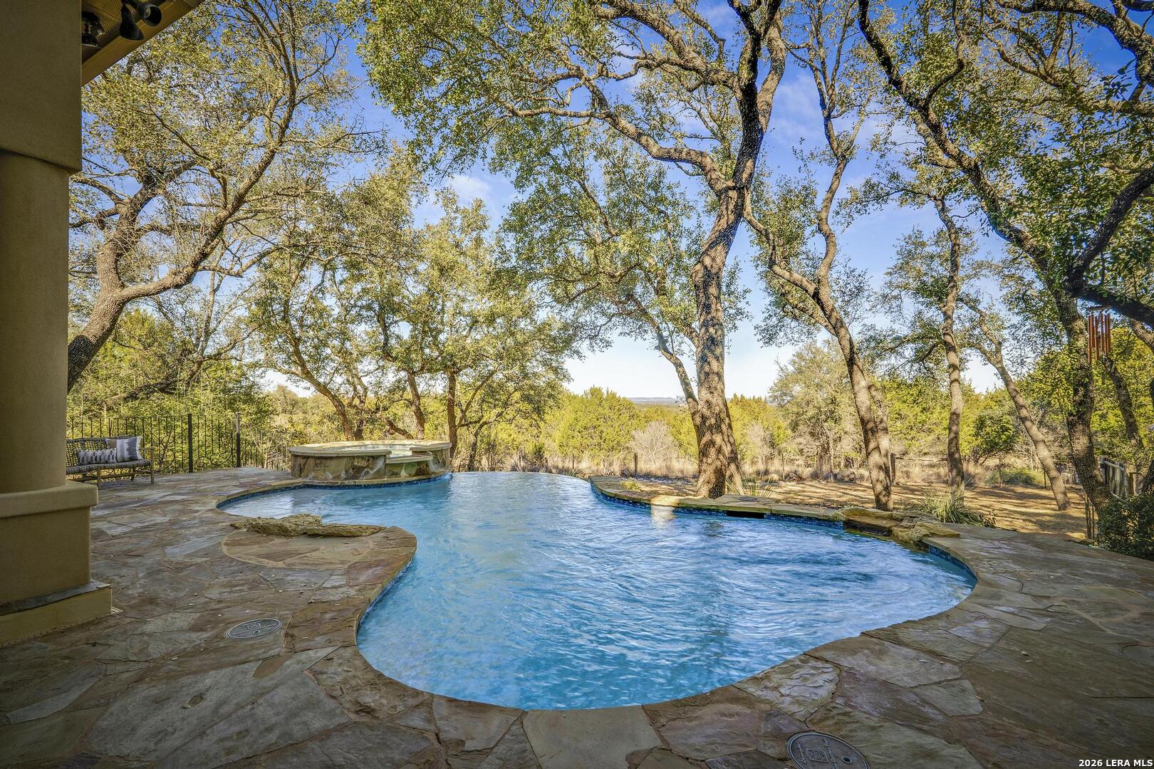 Master Golf Membership available for purchase. Perfectly positioned on 1.07 acres within the highly coveted Clubs Village of Cordillera Ranch, this elegant Hill Country retreat offers exceptional privacy and the convenience of a short golf cart ride to the clubhouse and championship golf course. A pair of striking iron doors opens to a grand entry, where serene courtyard views frame a tranquil koi pond and waterfall-an inviting setting for morning coffee or quiet reflection. The formal living or sitting room is ideally proportioned to accommodate a grand piano, creating a refined space for music-filled evenings conversation, while the dining room provides an elegant backdrop for memorable dinners and celebrations. The heart of the home is a beautifully appointed chef's kitchen featuring custom cabinetry, double ovens, an 8-burner WOLF gas cooktop, double ovens, Sub-Zero refrigeration, and a generous walk-in pantry. A large central island anchors the space, flowing seamlessly into both the breakfast room and family room-ideal for everyday living and effortless entertaining. The grand family room, centered around a warm fireplace, overlooks the covered patio and resort-style pool, creating a welcoming backdrop for gatherings, movie nights, or relaxed evenings at home. The owner's suite is a true sanctuary, showcasing hardwood floors and a spa-inspired bath with soaking tub, walk-in shower, dual vanities, and an expansive custom wardrobe room. Guests are well accommodated with a private main-level suite near the courtyard, while two additional upstairs bedrooms each offer ensuite baths. A dedicated study with built-in desk and shelving provides a quiet, functional work-from-home space. Fabulous views of the Twin Sisters grace the outdoor space providing a year-round oasis with a covered patio, built-in outdoor kitchen, and multiple areas for lounging or dining, all overlooking a sparkling negative-edge pool and spa with outdoor shower. Completing the home is a GENERAC propane generator, an attached three-car garage and abundant storage. Experience refined Hill Country living at its finest in one of Cordillera Ranch's most desirable settings.