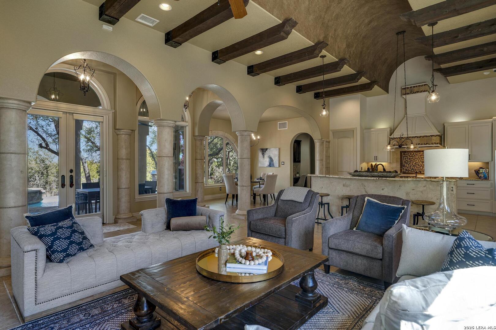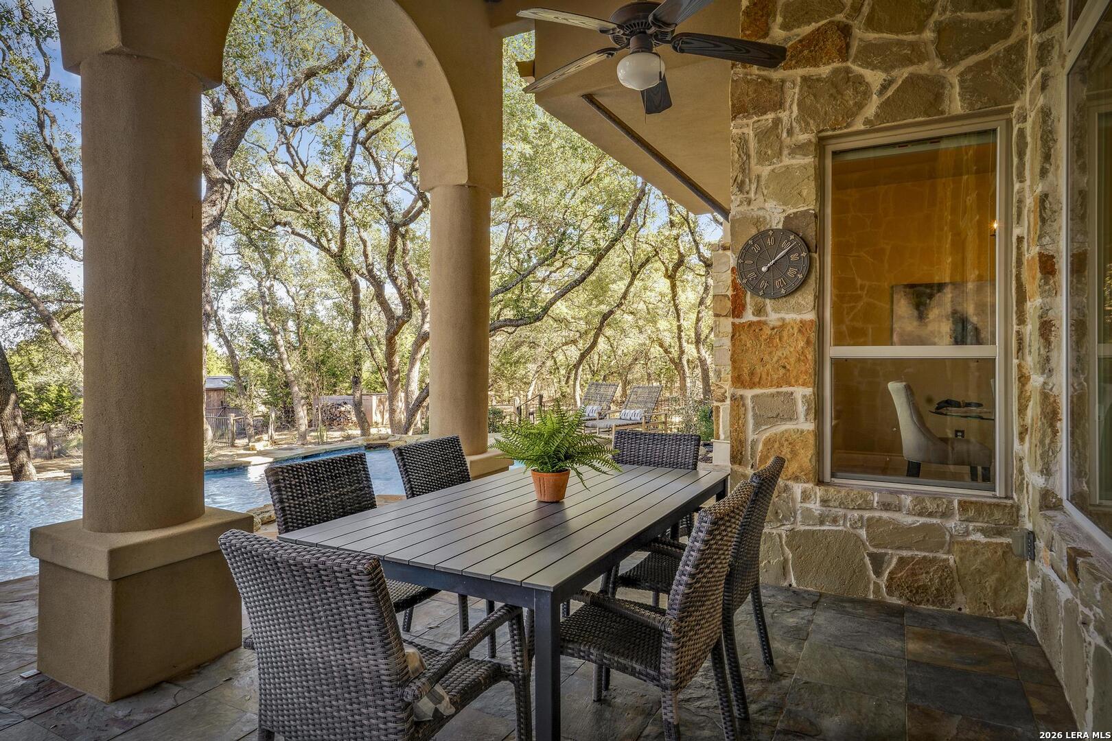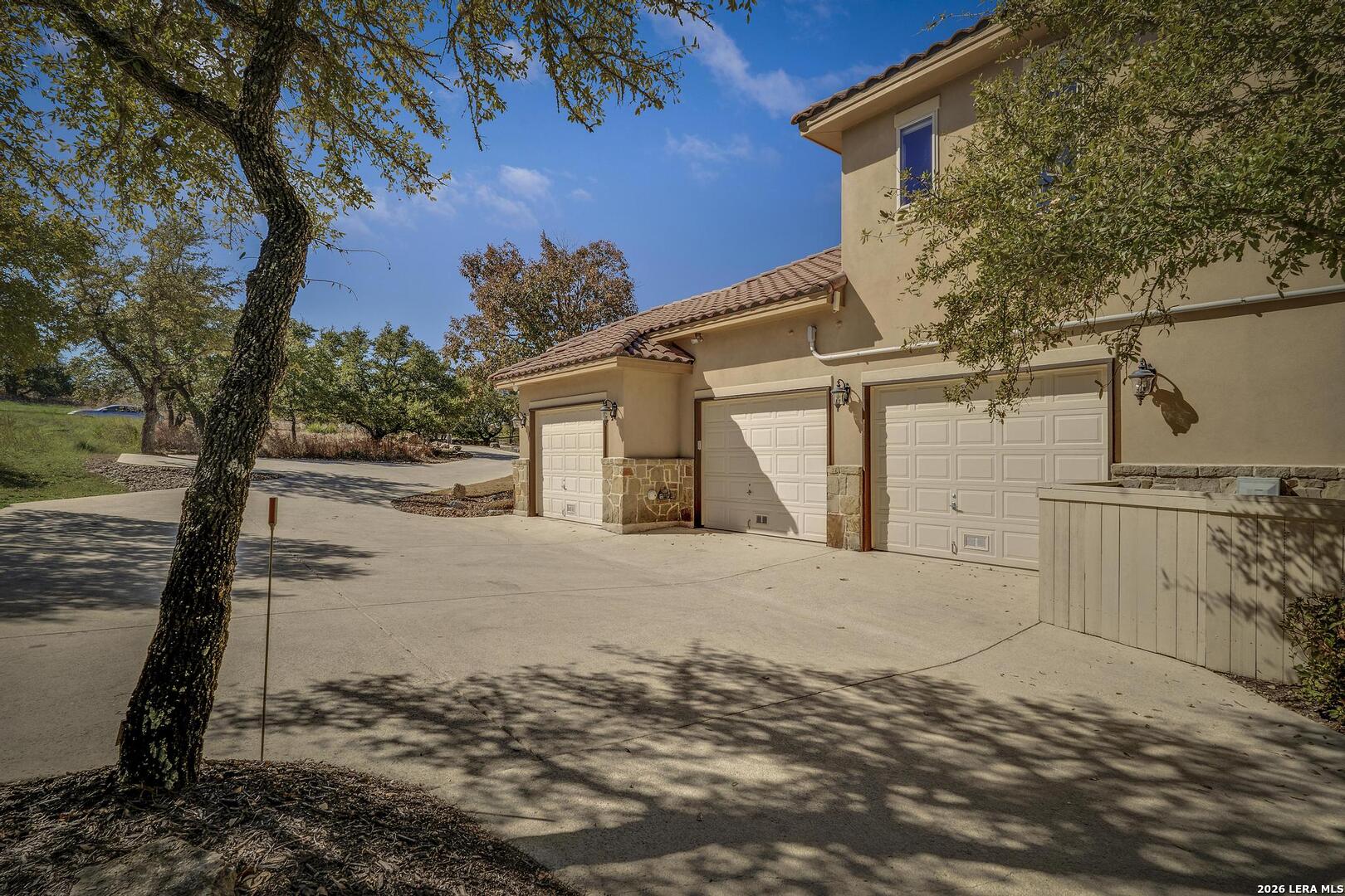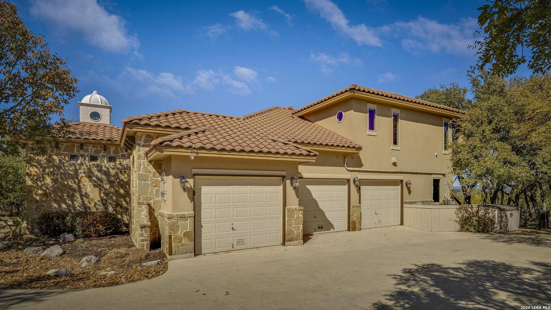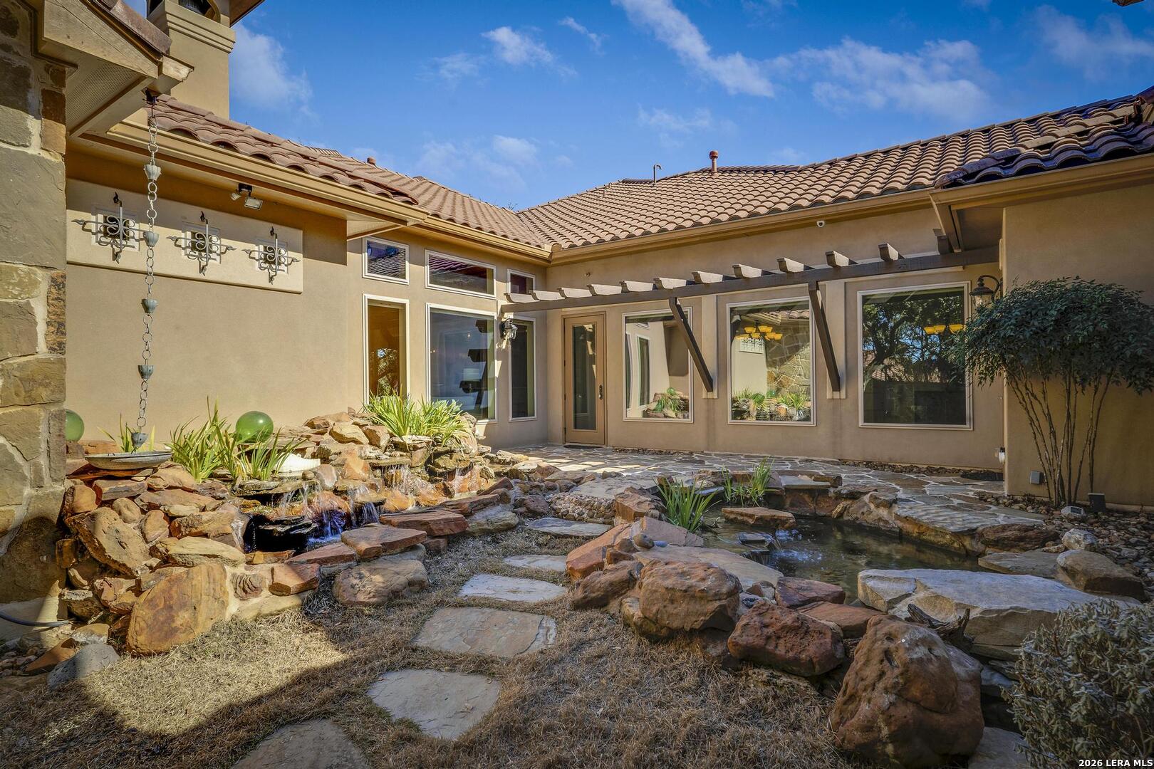 Master Golf Membership available for purchase. Perfectly positioned on 1.07 acres within the highly coveted Clubs Village of Cordillera Ranch, this elegant Hill Country retreat offers exceptional privacy and the convenience of a short golf cart ride to the clubhouse and championship golf course. A pair of striking iron doors opens to a grand entry, where serene courtyard views frame a tranquil koi pond and waterfall-an inviting setting for morning coffee or quiet reflection. The formal living or sitting room is ideally proportioned to accommodate a grand piano, creating a refined space for music-filled evenings conversation, while the dining room provides an elegant backdrop for memorable dinners and celebrations. The heart of the home is a beautifully appointed chef's kitchen featuring custom cabinetry, double ovens, an 8-burner WOLF gas cooktop, double ovens, Sub-Zero refrigeration, and a generous walk-in pantry. A large central island anchors the space, flowing seamlessly into both the breakfast room and family room-ideal for everyday living and effortless entertaining. The grand family room, centered around a warm fireplace, overlooks the covered patio and resort-style pool, creating a welcoming backdrop for gatherings, movie nights, or relaxed evenings at home. The owner's suite is a true sanctuary, showcasing hardwood floors and a spa-inspired bath with soaking tub, walk-in shower, dual vanities, and an expansive custom wardrobe room. Guests are well accommodated with a private main-level suite near the courtyard, while two additional upstairs bedrooms each offer ensuite baths. A dedicated study with built-in desk and shelving provides a quiet, functional work-from-home space. Fabulous views of the Twin Sisters grace the outdoor space providing a year-round oasis with a covered patio, built-in outdoor kitchen, and multiple areas for lounging or dining, all overlooking a sparkling negative-edge pool and spa with outdoor shower. Completing the home is a GENERAC propane generator, an attached three-car garage and abundant storage. Experience refined Hill Country living at its finest in one of Cordillera Ranch's most desirable settings.