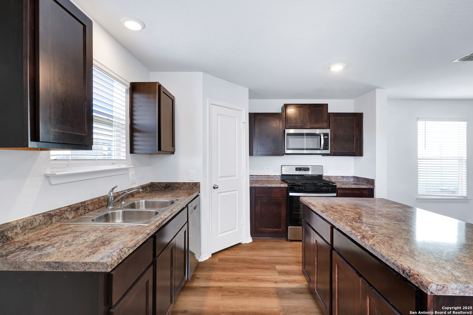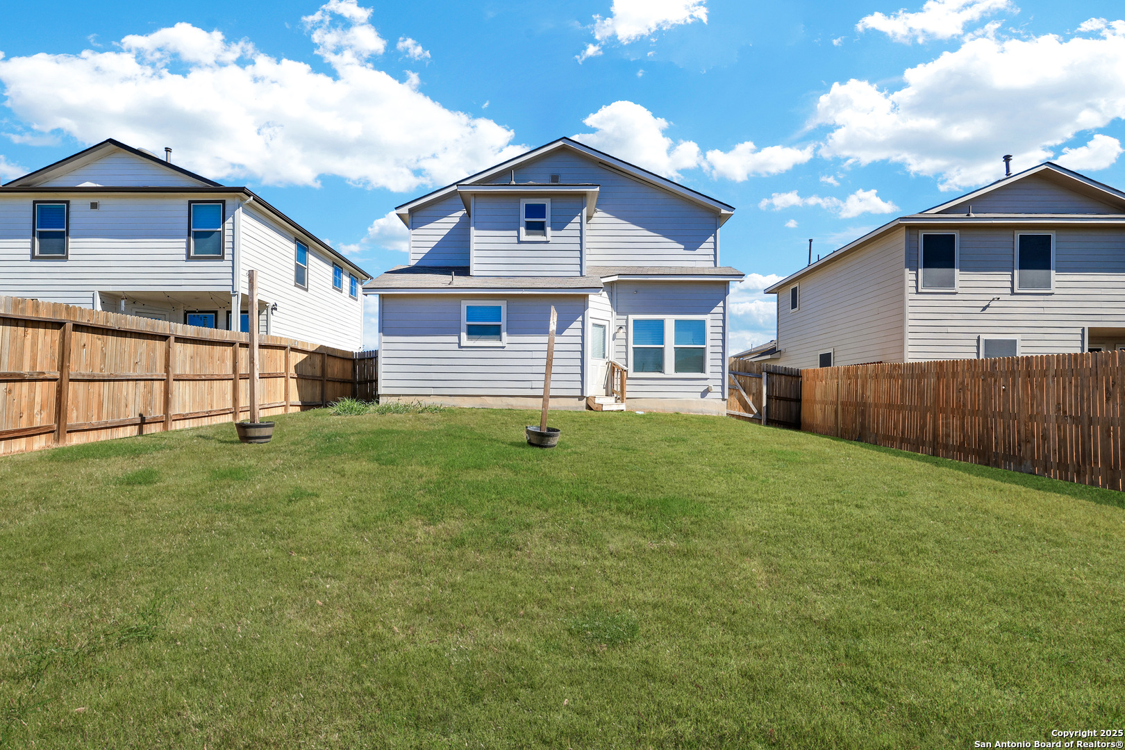 Inside, the open-concept living and kitchen area includes recessed lighting, gas cooking, a large island, and a walk-in pantry. A front flex room is ideal for an office, playroom, or guest space. Upstairs features all four bedrooms, including a spacious primary suite. Smart home upgrades, a full sprinkler system, and a large backyard complete the offering. Conveniently located near JBSA Randolph, major highways, shopping, and dining.