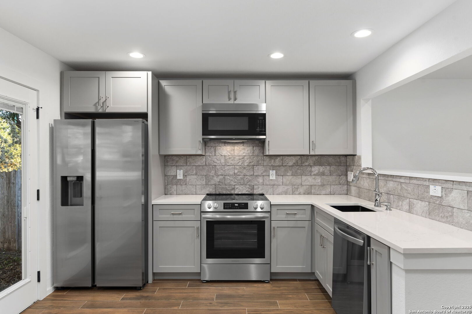 Tucked away on a quiet cul-de-sac in a gated neighborhood, this beautifully remodeled 3-bedroom, 2-bath home offers comfort, style, and thoughtful upgrades throughout. A dedicated front office provides flexible space for working from home, studying, or creative pursuits. The interior was remodeled in early 2025, including the kitchen, bathrooms, bedrooms, closets, drywall, cabinetry, countertops, paint, tile flooring with a wood-look finish, new carpet and updated fixtures. The kitchen features brand-new appliances and opens to the main living area, creating a welcoming space for everyday living and entertaining. Other improvements include the HVAC unit, hot water heater, and a new metal roof. The finished two-car garage has been painted and detailed with baseboards, offering a clean and functional extension of the home. Out back, mature trees provide shade and privacy, creating a peaceful outdoor setting. Conveniently located on the Northwest side of town with easy access to shopping, dining, and major roadways, this move-in-ready home combines modern updates with a warm, inviting feel.