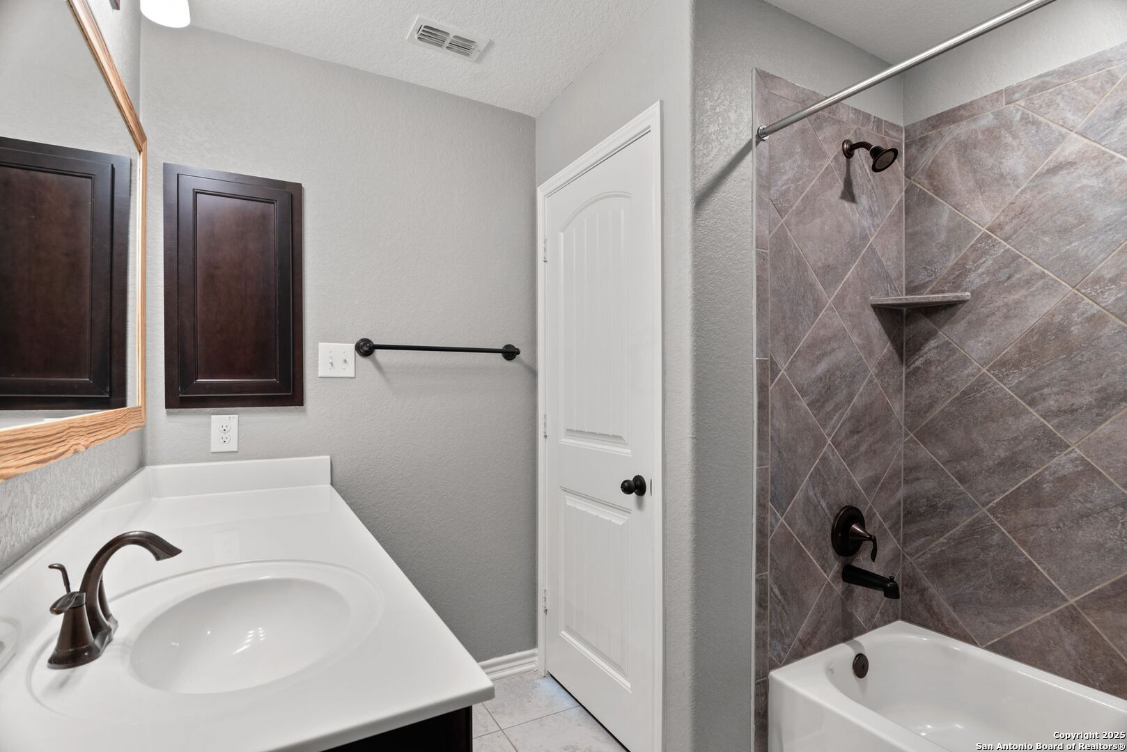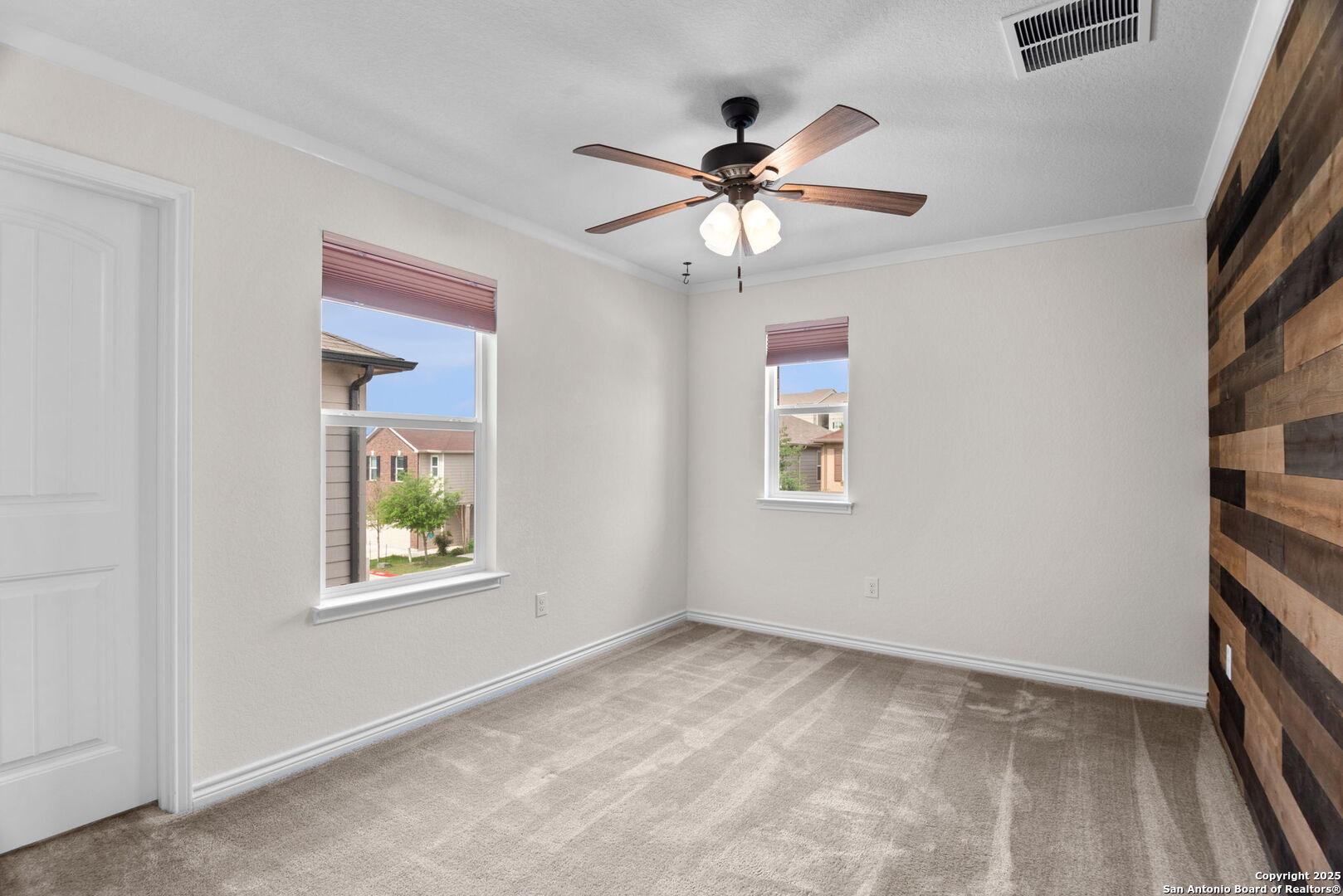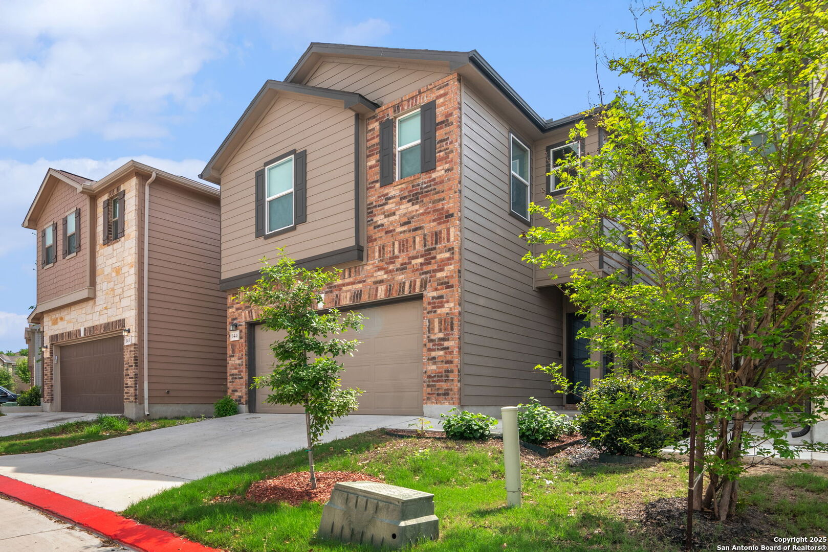 Discover this stunning two-story home in a gated Medical Center community, offering the perfect blend of privacy and convenience. The chef's kitchen showcases gleaming quartz countertops, elegant white cabinetry with gold hardware, stylish pendant lighting, and premium stainless steel appliances. Enjoy modern open-concept living with upscale flooring throughout-plush carpet in bedrooms and stairs, sleek tile in bathrooms and kitchen, and durable LVP in common areas-plus spacious rooms, including an upstairs game room, three comfortable bedrooms, and a luxurious master bath. Outside, entertain guests on the expansive patio beneath mature shade trees for ideal privacy. Ideally situated near UTSA, USAA, La Cantera shopping, and Six Flags, this home combines upscale features with an unbeatable location-all within a private, gated setting.