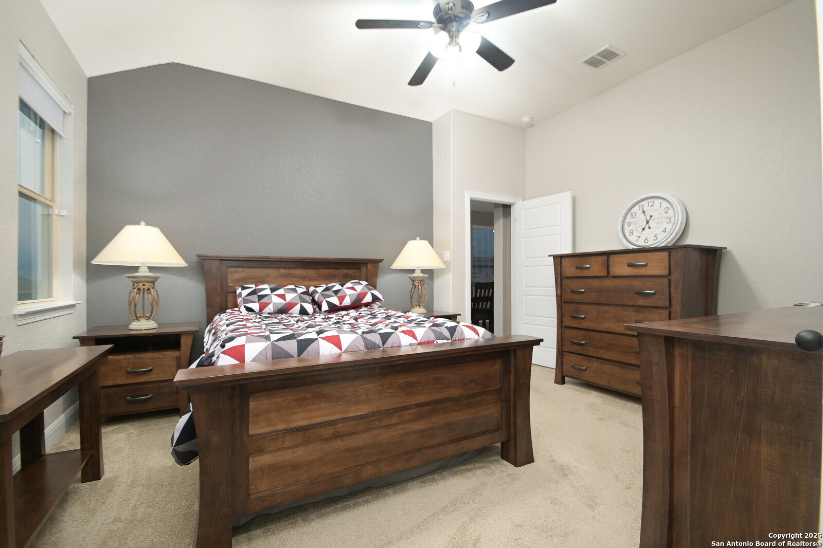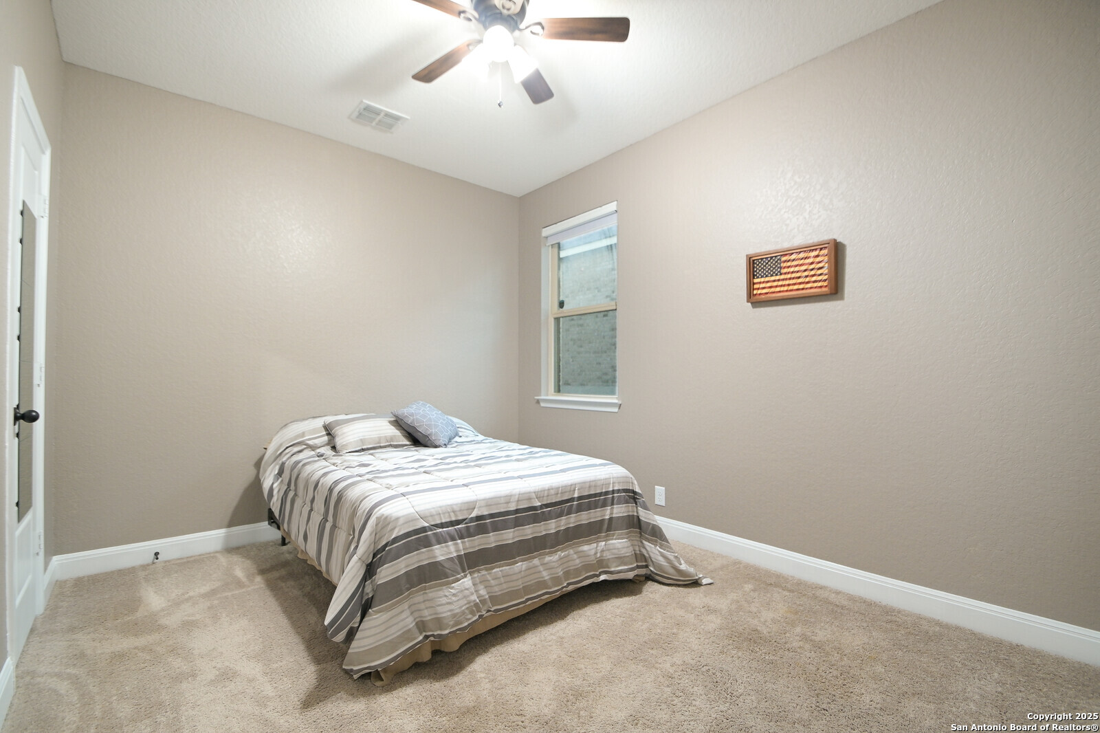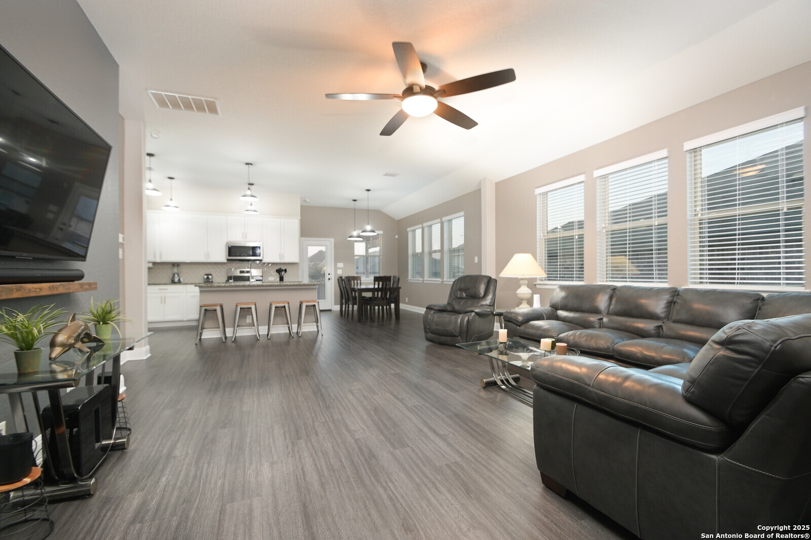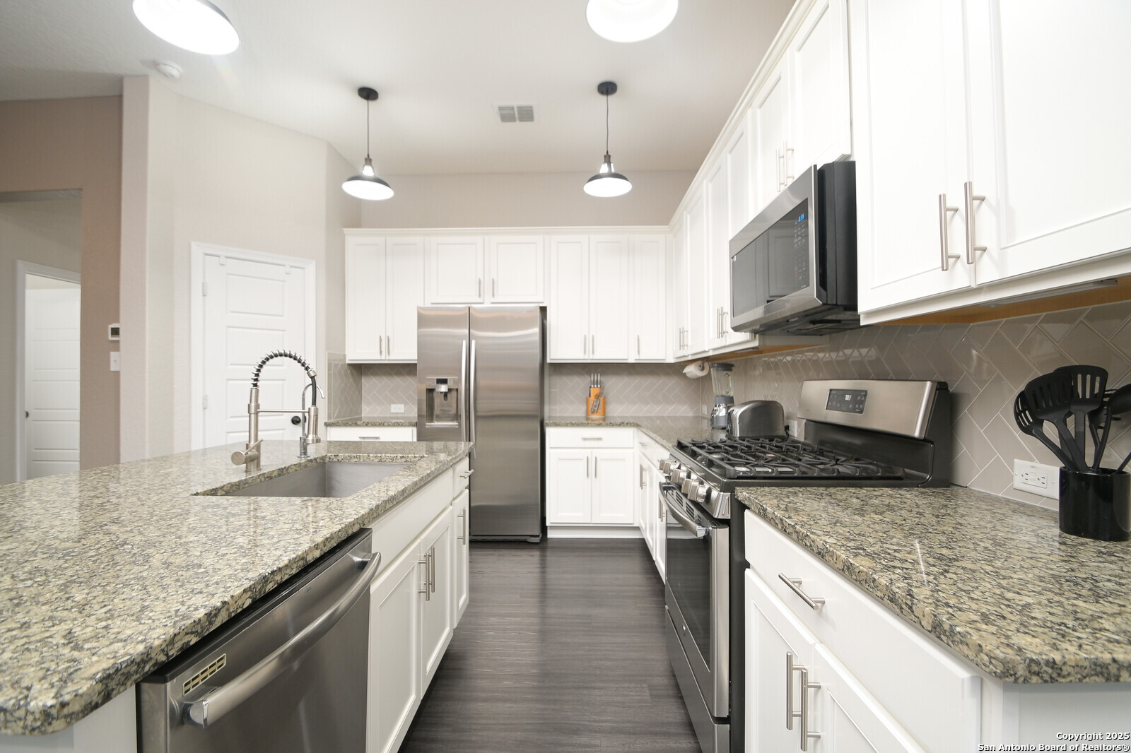 This meticulously maintained one-story 2018 Chesmar home offers 4 bedrooms 2 full bathroom, and a thoughtfully designed living space with high cielings in the desirable Wortham Oaks GATED community. The soaring ceilings and an open floor plan create a bright and inviting atmosphere, while modern finishes add a touch of elegance. The chef's kitchen is both stylish and functional, featuring granite countertops, a spacious island, 42" white cabinetry, a farm sink, gas range, stainless steel appliances and a walk-in pantry. The refrigerator, washer, dryer and water softener with reverse osmosis system all convey with the home! The primary suite is a true retreat with an oversized shower, dual sinks, and a generous walk-in closet. Step outside to a beautifully landscaped backyard with a covered patio, privacy fence, and a full sprinkler system, perfect for outdoor entertaining or quiet evenings. Located in a family-friendly neighborhood, residents enjoy access to a community pool, basketball court, and walking trails, with an elementary school at the entrance and a new middle school coming soon. With easy access to Loop 1604, shopping, dining, and top-rated schools, this move-in-ready home is an exceptional opportunity.