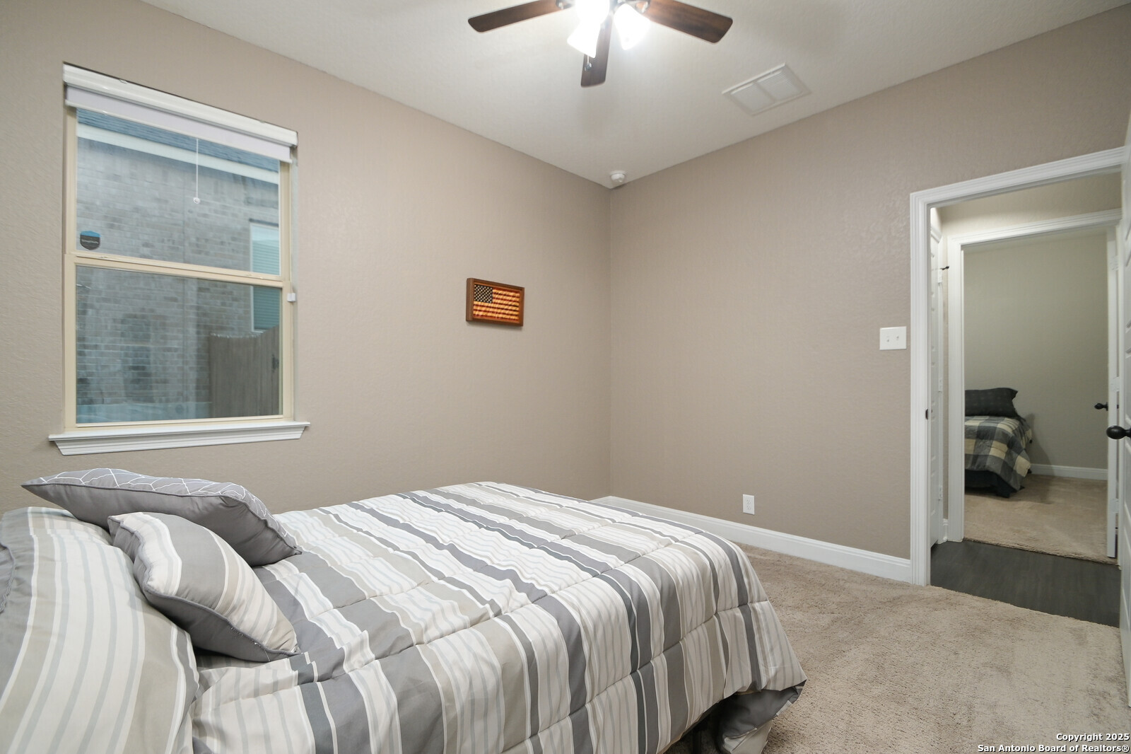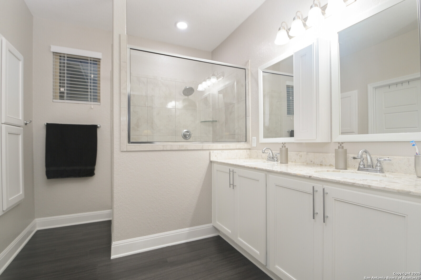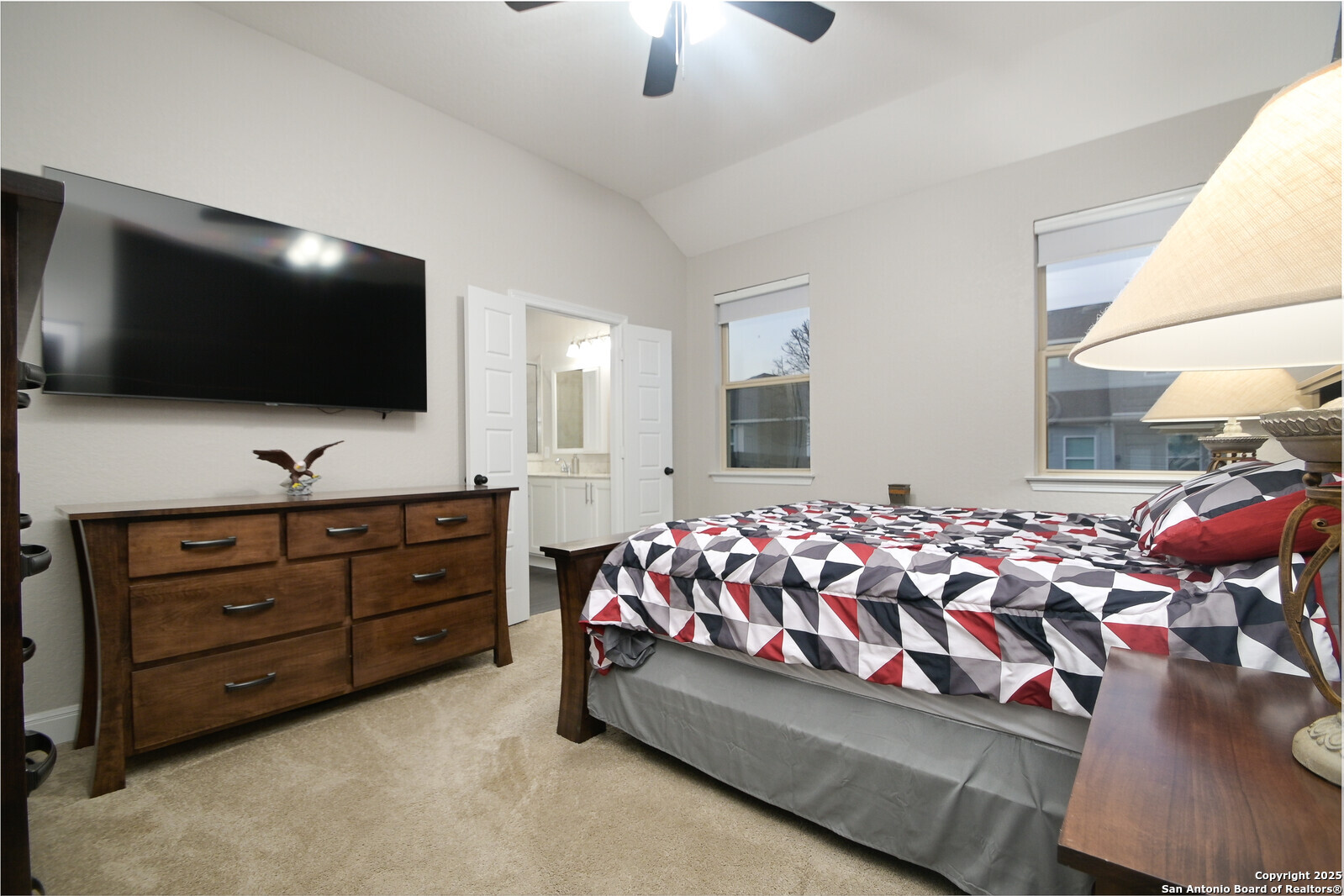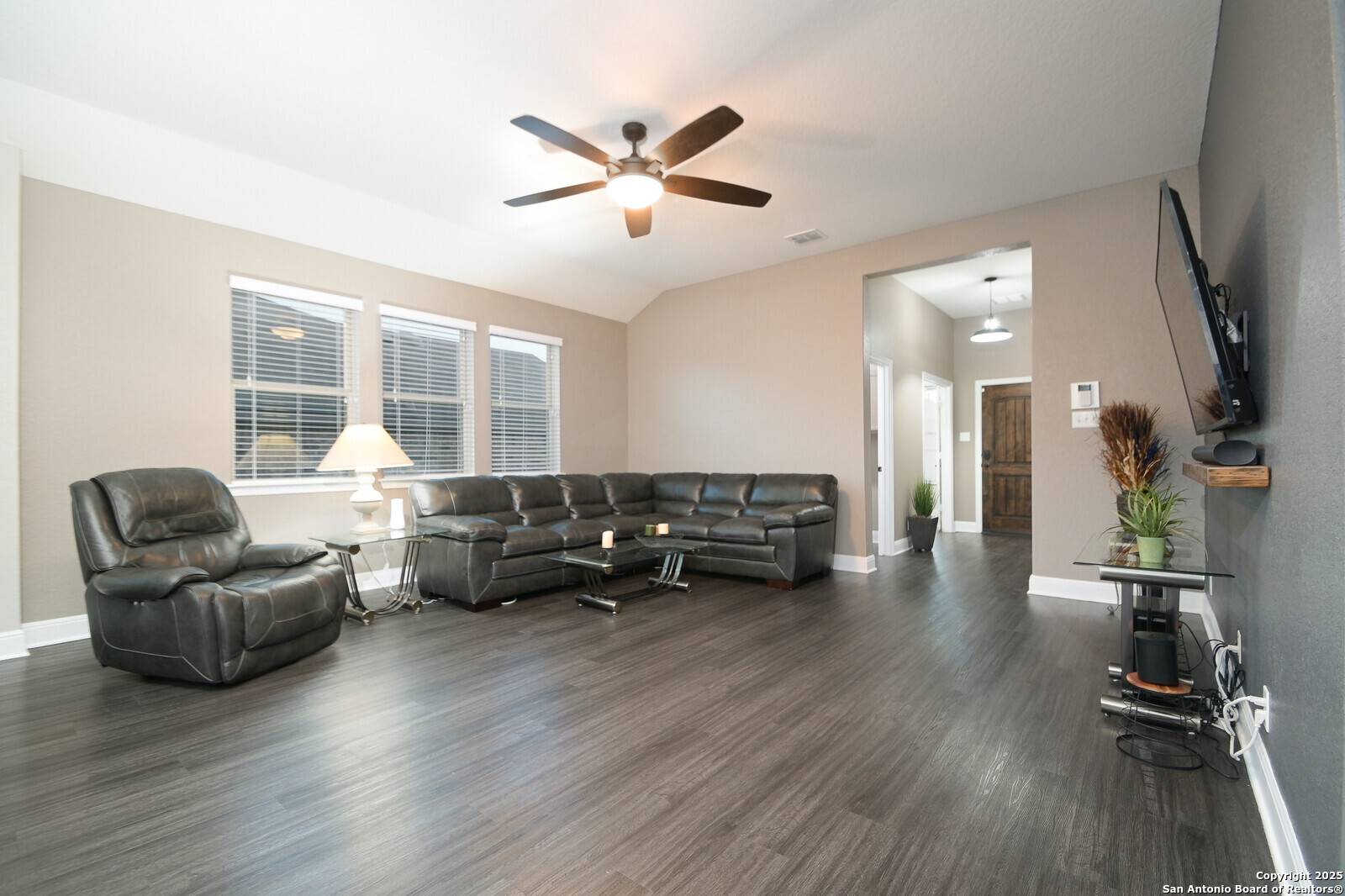 This meticulously maintained one-story 2018 Chesmar home offers 4 bedrooms 2 full bathroom, and a thoughtfully designed living space with high cielings in the desirable Wortham Oaks GATED community. The soaring ceilings and an open floor plan create a bright and inviting atmosphere, while modern finishes add a touch of elegance. The chef's kitchen is both stylish and functional, featuring granite countertops, a spacious island, 42" white cabinetry, a farm sink, gas range, stainless steel appliances and a walk-in pantry. The refrigerator, washer, dryer and water softener with reverse osmosis system all convey with the home! The primary suite is a true retreat with an oversized shower, dual sinks, and a generous walk-in closet. Step outside to a beautifully landscaped backyard with a covered patio, privacy fence, and a full sprinkler system, perfect for outdoor entertaining or quiet evenings. Located in a family-friendly neighborhood, residents enjoy access to a community pool, basketball court, and walking trails, with an elementary school at the entrance and a new middle school coming soon. With easy access to Loop 1604, shopping, dining, and top-rated schools, this move-in-ready home is an exceptional opportunity.