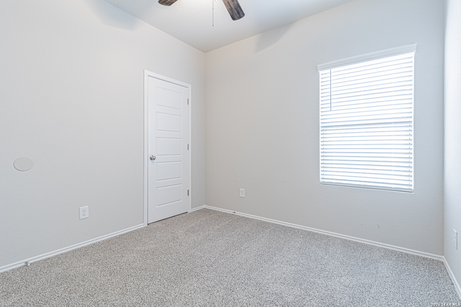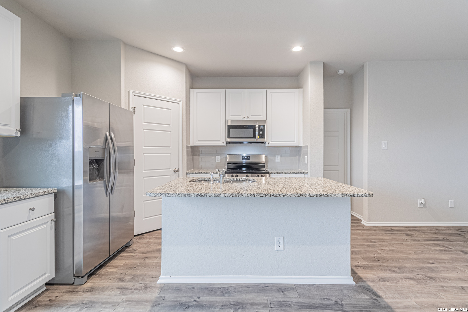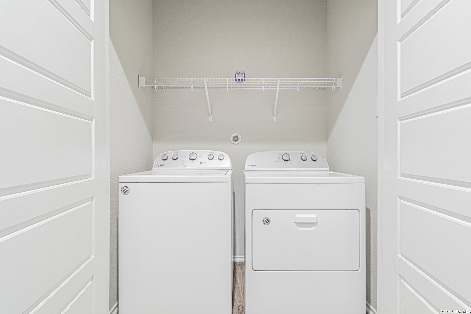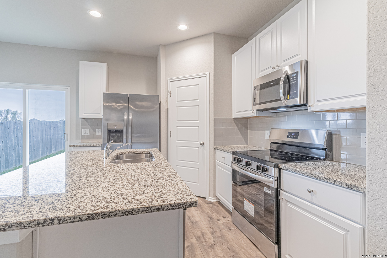 This beautifully maintained home offers thoughtful upgrades and a bright, open design that truly sets it apart. The spacious floor plan features nine-foot ceilings throughout, creating an airy and inviting atmosphere. At the heart of the home, the island kitchen impresses with granite countertops, a modern backsplash, and rich wood cabinetry perfect for cooking and entertaining alike. The primary bedroom is a relaxing retreat, featuring upgraded vinyl plank flooring with no carpet for a clean, modern look. The ensuite bath includes a spacious walk-in shower and a large walk-in closet for added comfort and convenience. Additional highlights include a smart programmable thermostat, accessible flooring throughout the home, and all appliances included: refrigerator, washer, and dryer, making this home truly move-in ready. This is a fantastic opportunity to own a well-cared-for home in a desirable community close to JBSA-Lackland!