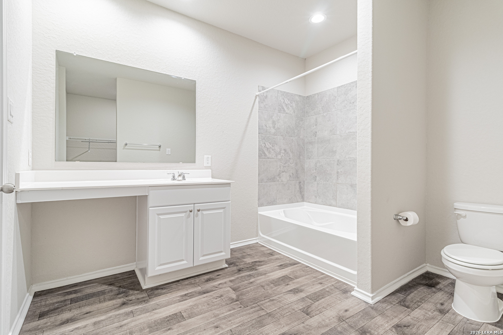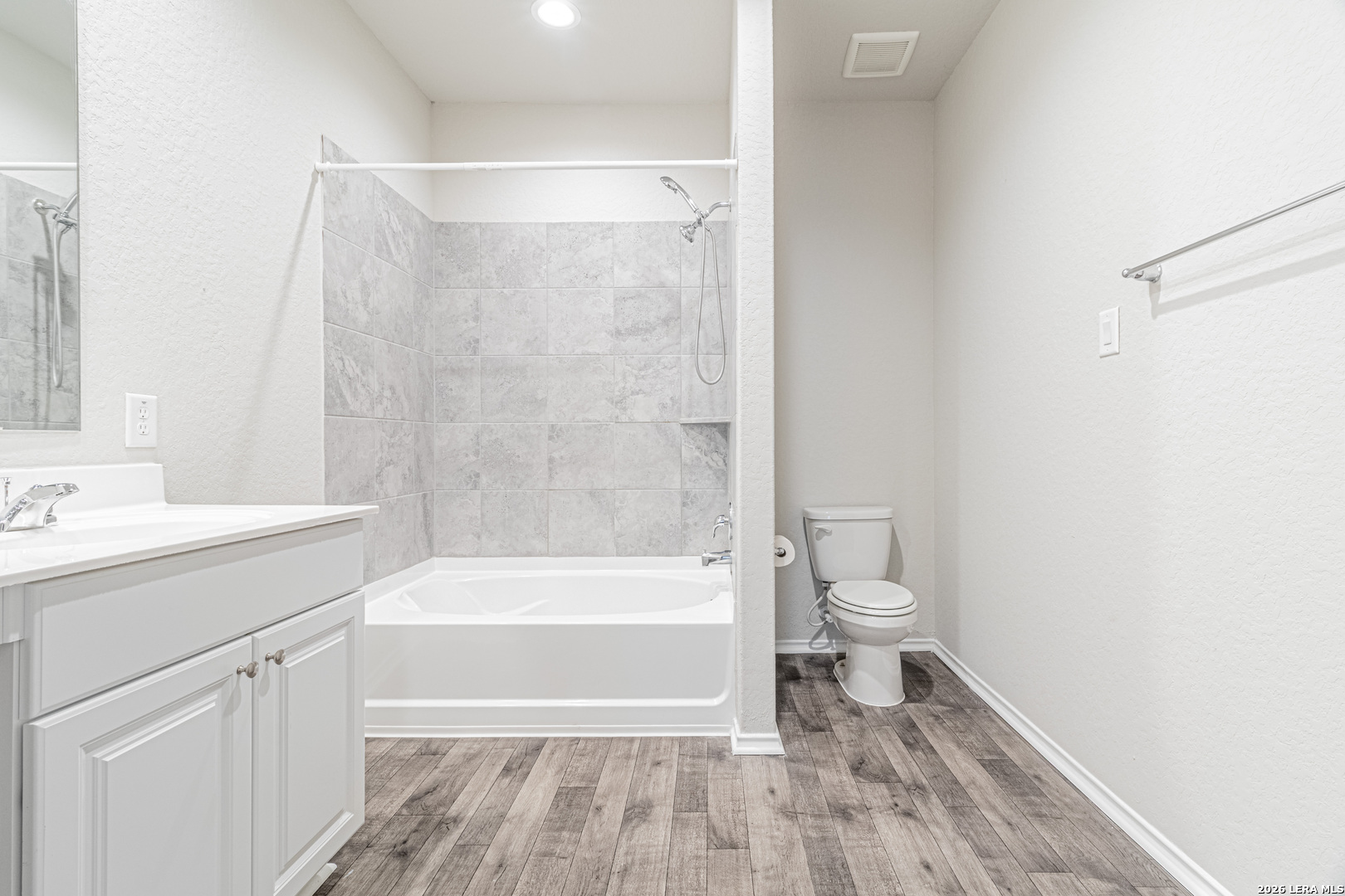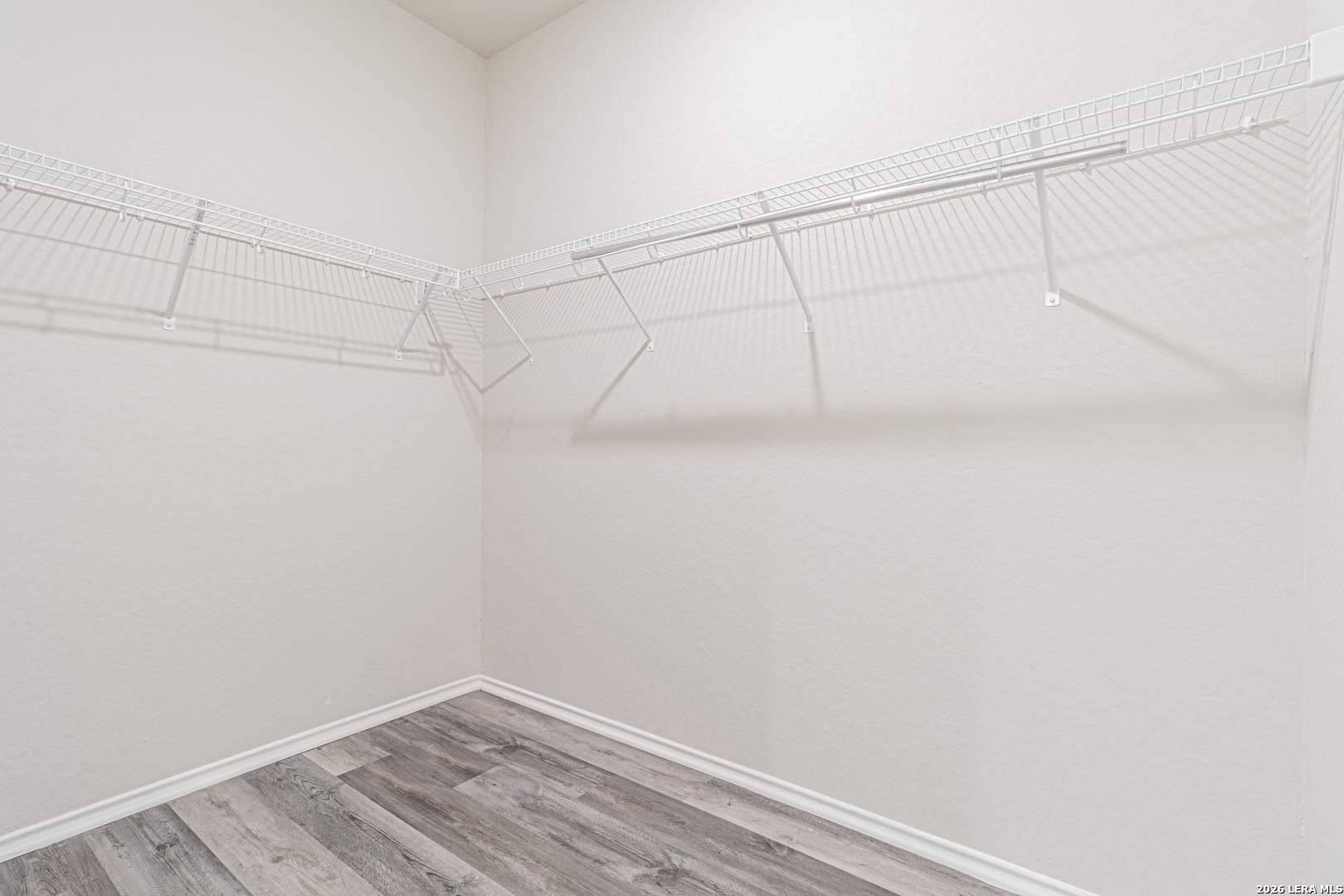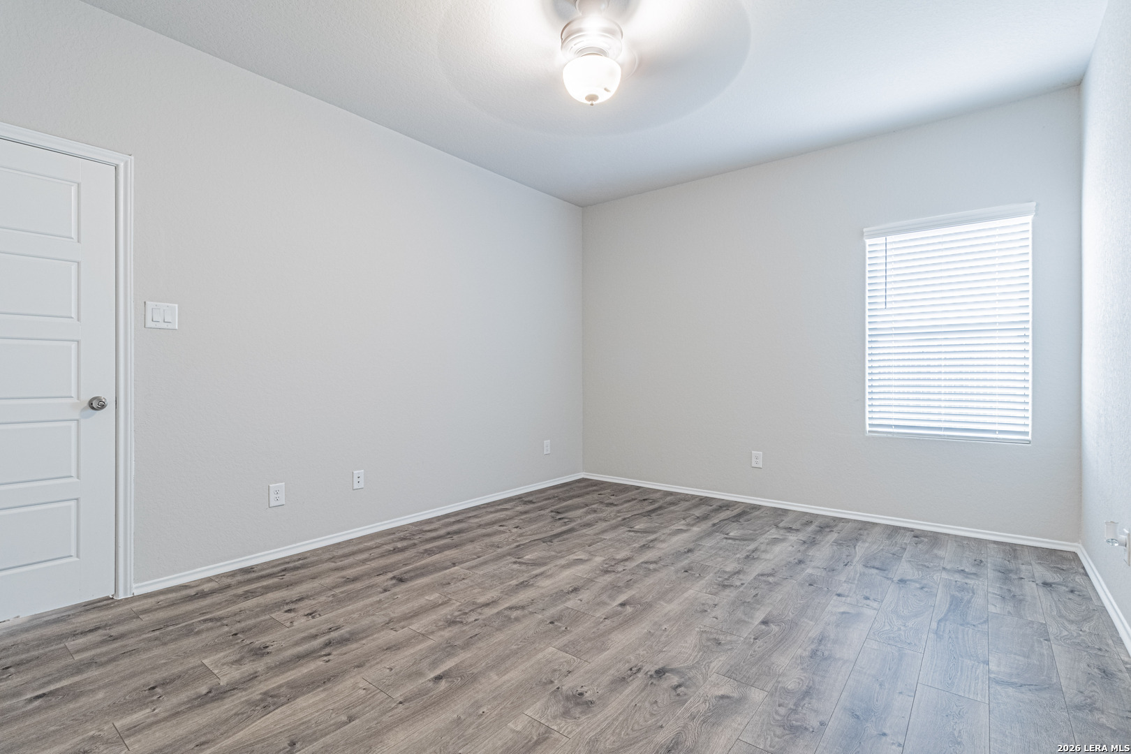 This beautifully maintained home offers thoughtful upgrades and a bright, open design that truly sets it apart. The spacious floor plan features nine-foot ceilings throughout, creating an airy and inviting atmosphere. At the heart of the home, the island kitchen impresses with granite countertops, a modern backsplash, and rich wood cabinetry perfect for cooking and entertaining alike. The primary bedroom is a relaxing retreat, featuring upgraded vinyl plank flooring with no carpet for a clean, modern look. The ensuite bath includes a spacious walk-in shower and a large walk-in closet for added comfort and convenience. Additional highlights include a smart programmable thermostat, accessible flooring throughout the home, and all appliances included: refrigerator, washer, and dryer, making this home truly move-in ready. This is a fantastic opportunity to own a well-cared-for home in a desirable community close to JBSA-Lackland!