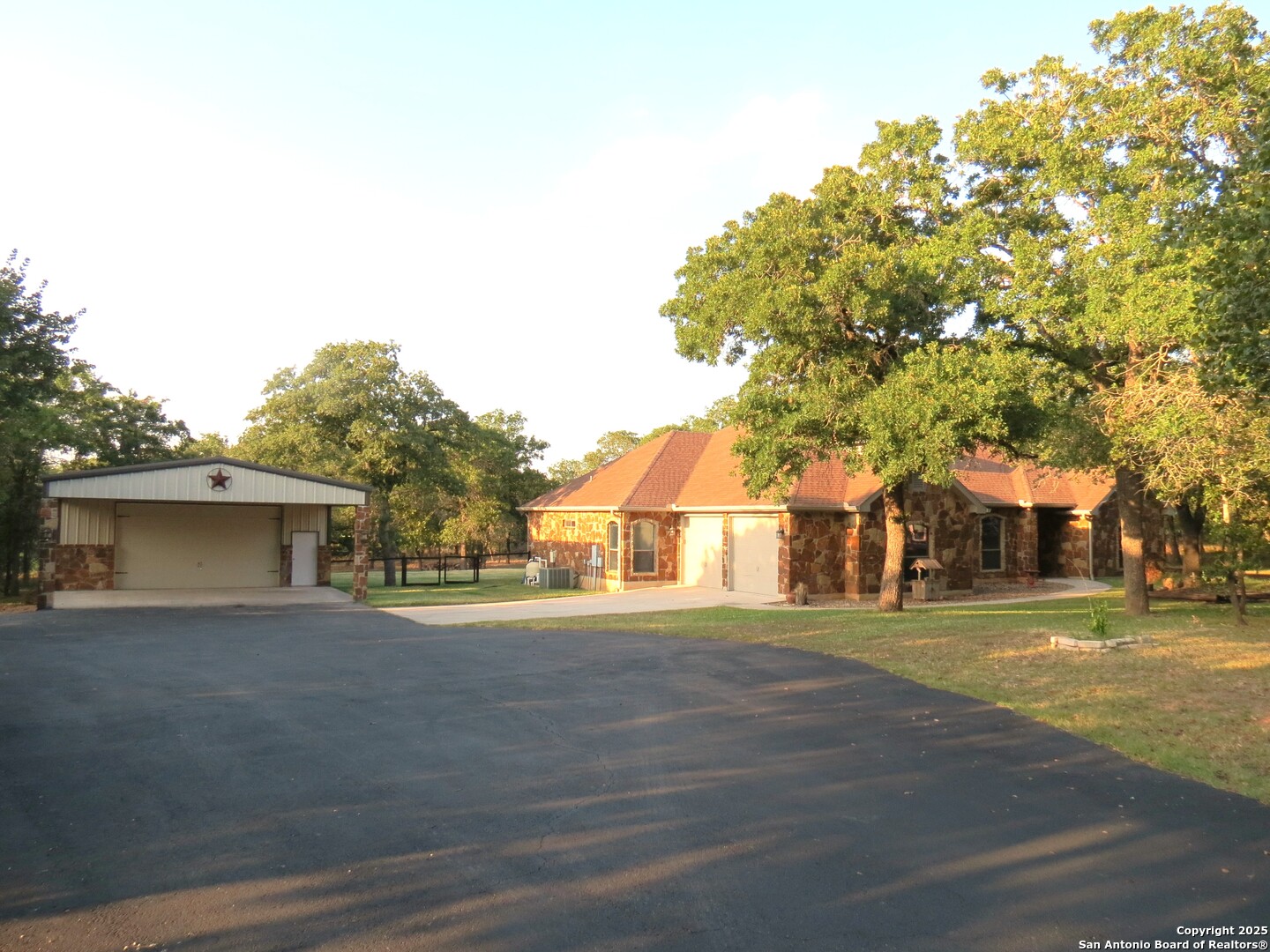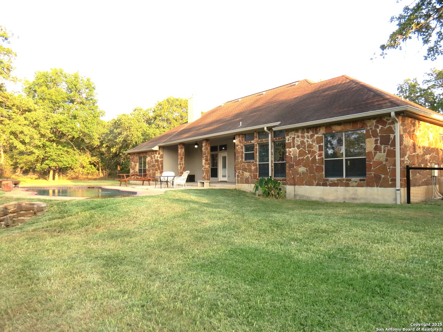 Incredible property privately located at the end of the road on over 2 acres with beautiful mature trees. Gorgeous inground pool. Spacious home with 4 bedrooms, 2.5 baths, 2 living, and 2 dining areas. Island kitchen features built-in stainless appliances, granite counters, tile backsplash, and a breakfast bar. Inviting stone fireplace. High ceilings. Open floor plan. Home freshly painted inside and out. All tile and faux wood flooring. Primary bath offers soaking tub, separate shower, and double vanity. 4 sides rock exterior for easy maintenance. Covered patio. Fully fenced and cross fenced. Gated entry. Large 900 sq ft workshop in addition to oversized side entry garage.