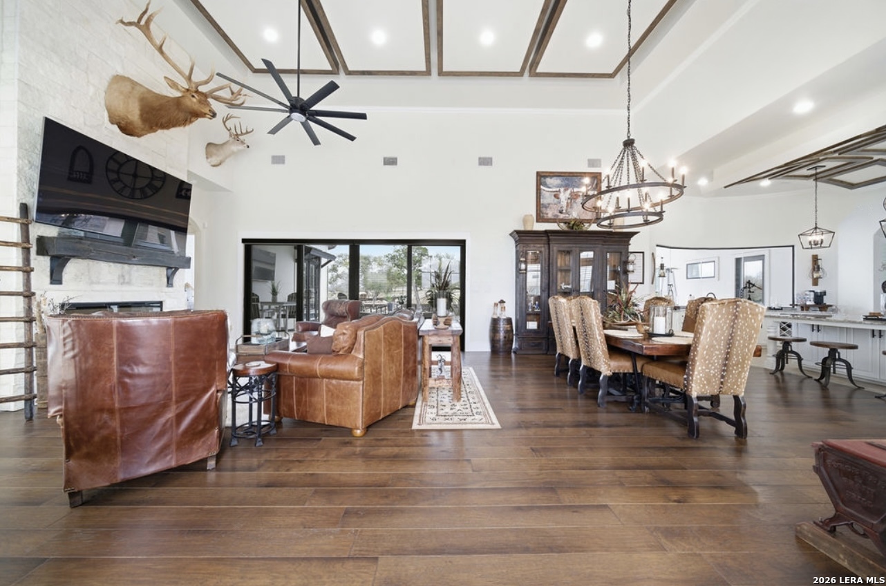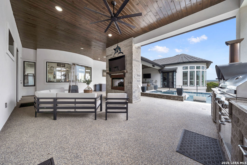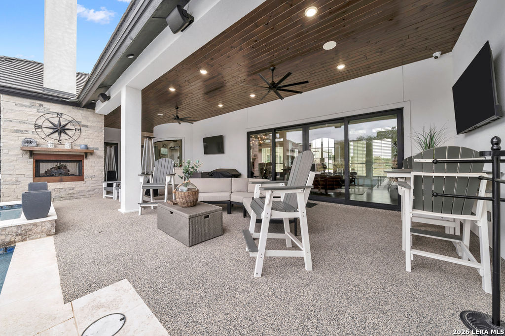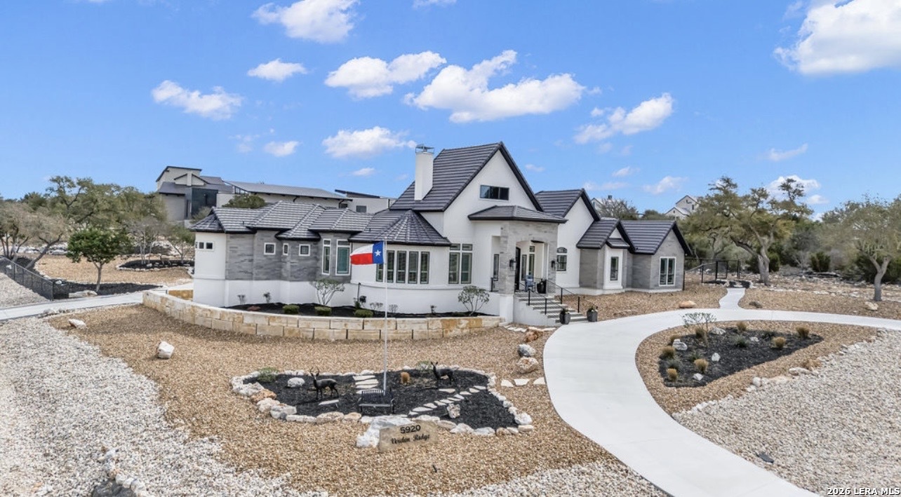Presenting 5920 Verden Ridge- a scenic hilltop setting with sweeping views of the Texas Hill Country, and breathtaking west-facing sunset views. This exceptional estate delivers luxury living with a design centered around light, space, and effortless entertaining. Thoughtfully crafted with 4 bedrooms, 4 full bathrooms, and 2 half baths, the home offers both grand gathering spaces and private retreats. From the moment you enter, soaring ceilings and expansive windows frame the surrounding landscape while filling the home with abundant natural light. Light-toned walls and an open, airy layout create a refined yet welcoming atmosphere throughout. The kitchen features kitchen aid appliances throughout and a Zline range offering gas and electric cooking options. Multiple glass doors along the back of the home seamlessly connect the interior living spaces to the outdoor retreat, allowing the stunning views to remain the focal point. Designed for both relaxation and entertaining, the outdoor living area features an inviting inground pool and generous entertaining spaces, ideal for hosting guests or enjoying quiet evenings overlooking the rolling Hill Country. The property features an impressive four-car garage with rear entrance and slab, ample storage space, and a layout that perfectly blends luxury, comfort, and connection to the surrounding landscape. The home has a whole house generator, bluetooth sound speakers inside and outside, a primary bathroom steam shower, a Pentair setup hot tub and heated pool, and front irrigation in garden beds. This is a rare opportunity to own a hilltop sanctuary, where elevated design meets breathtaking Texas Hill Country views!