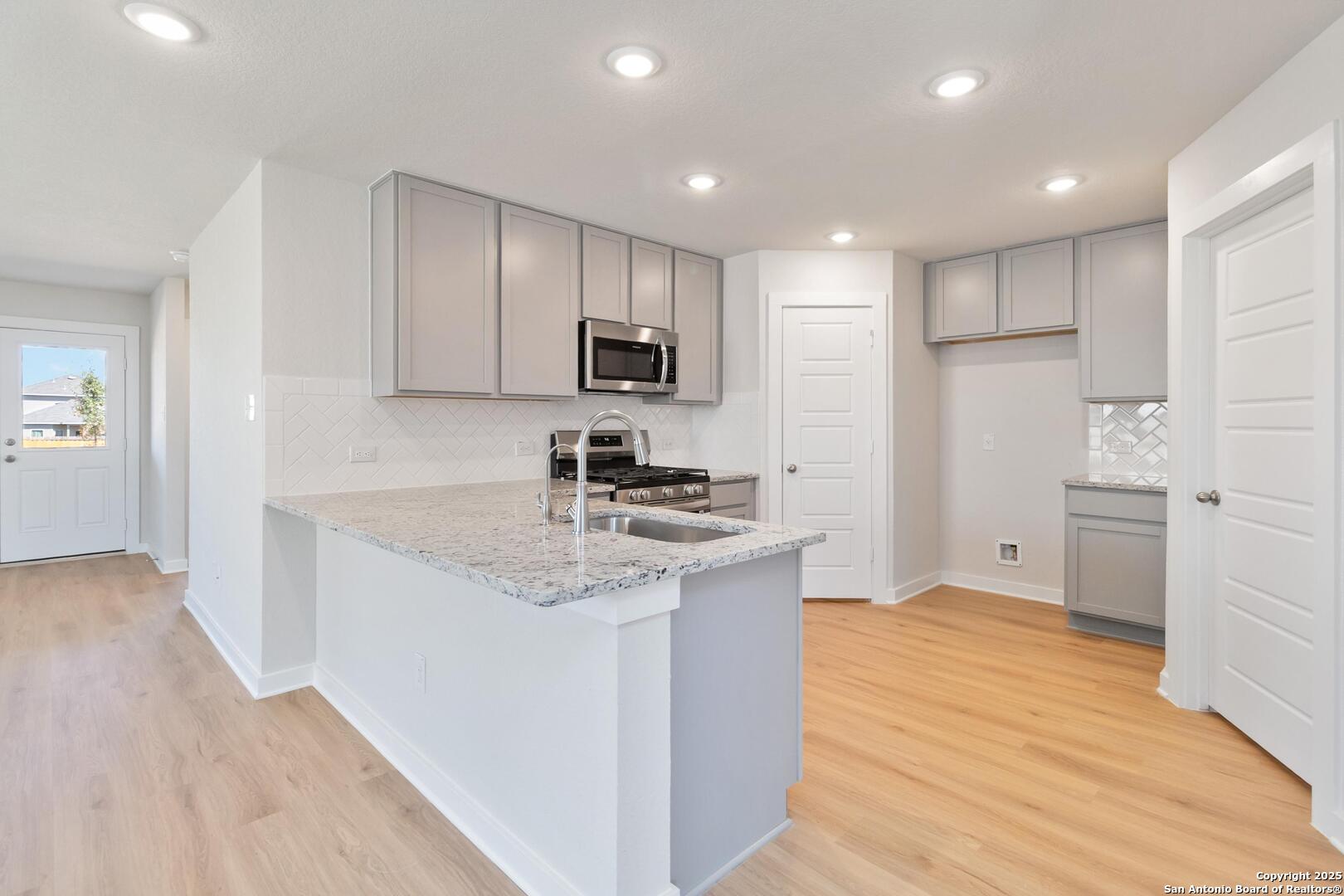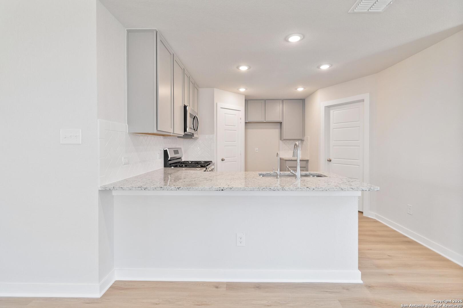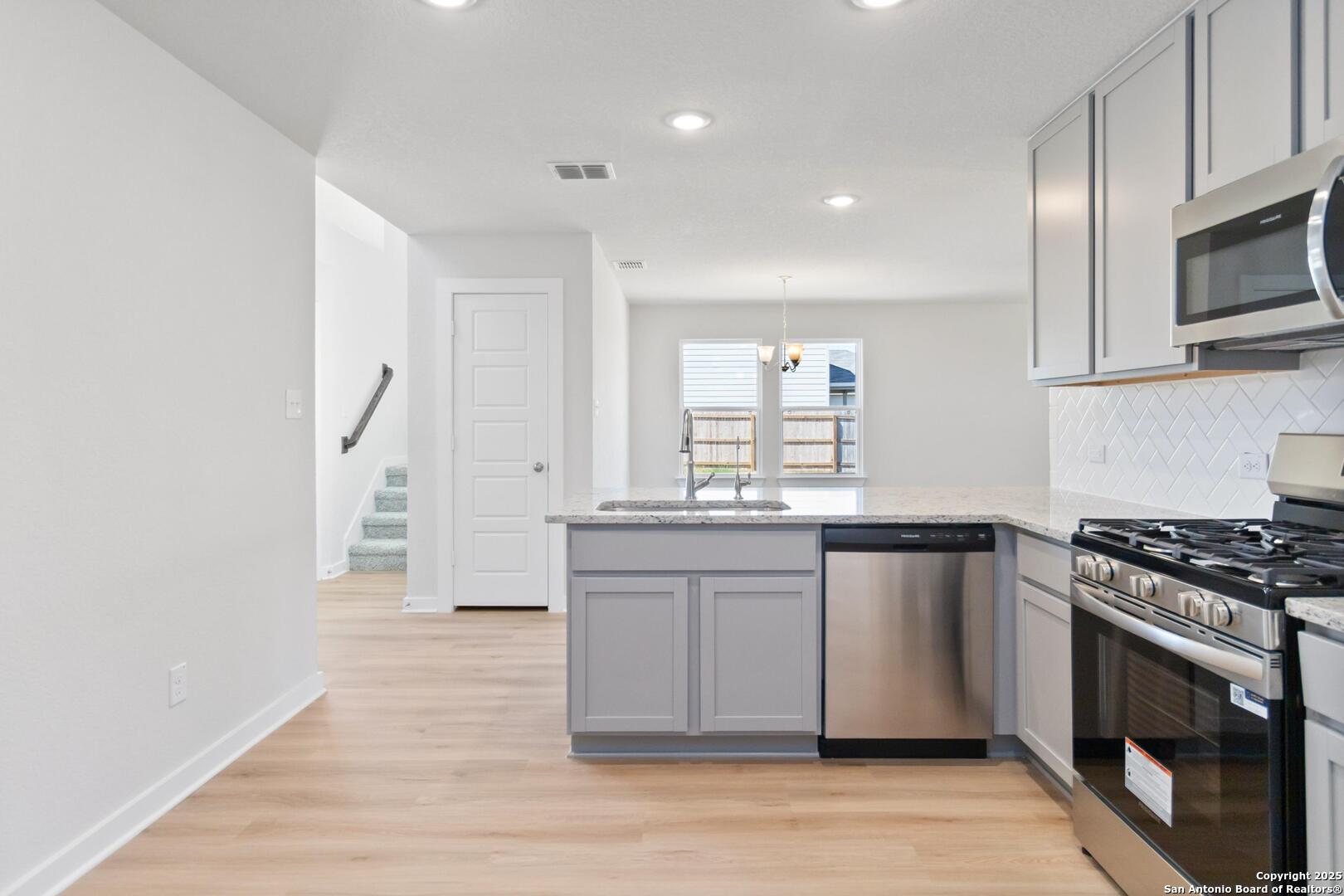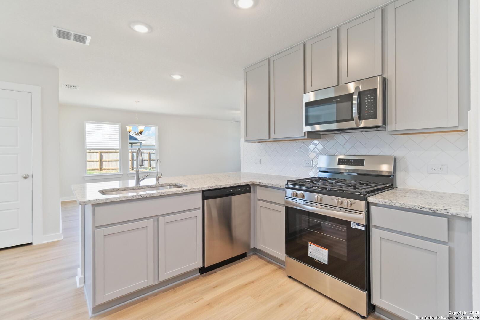The Vail floorplan is a stylish and functional four-bedroom, two-and-a-half bath home located on a greenbelt lot. The open living and dining areas seamlessly flow into the kitchen, creating a welcoming atmosphere for gatherings. The generously sized owner's suite features an ensuite bathroom for a private retreat, while the upstairs gameroom offers additional space for recreation and relaxation. To enhance your outdoor living experience, an added covered back patio provides a comfortable and shaded area away from the summer sun. Photos are representative.