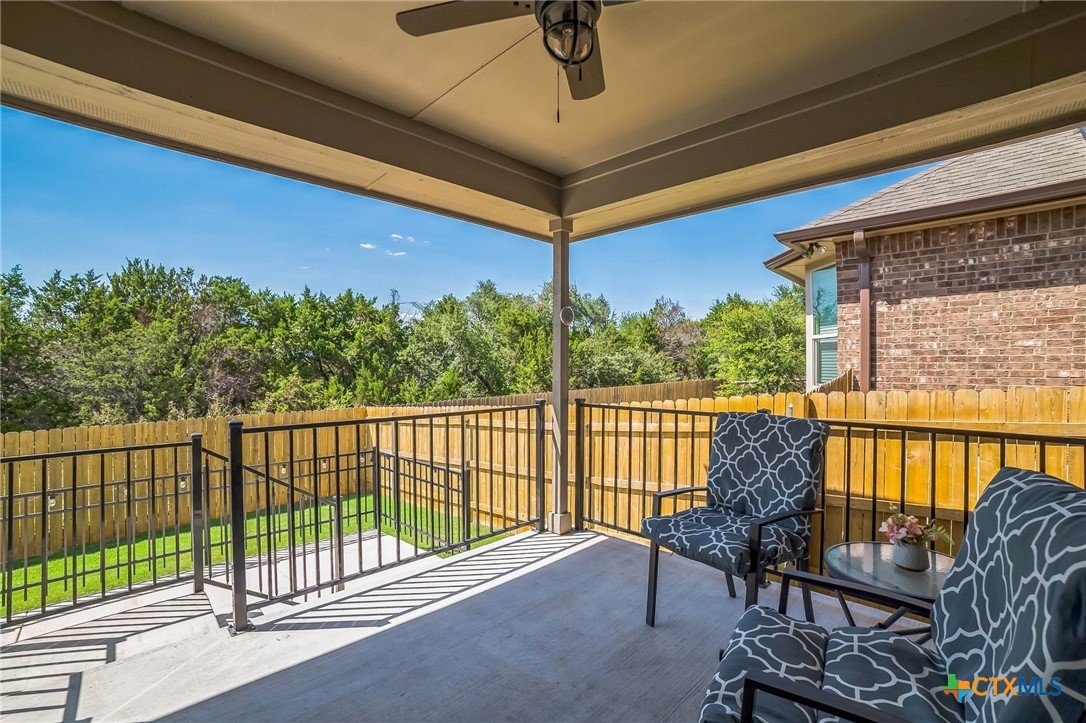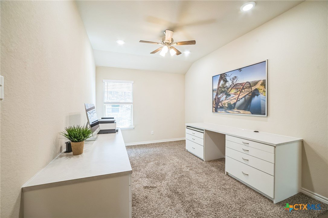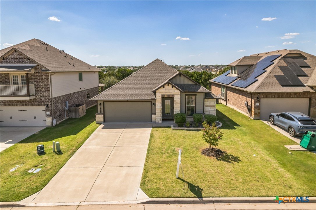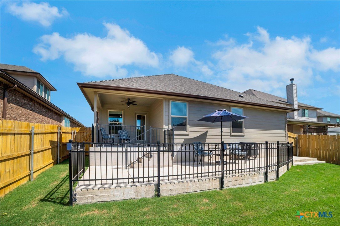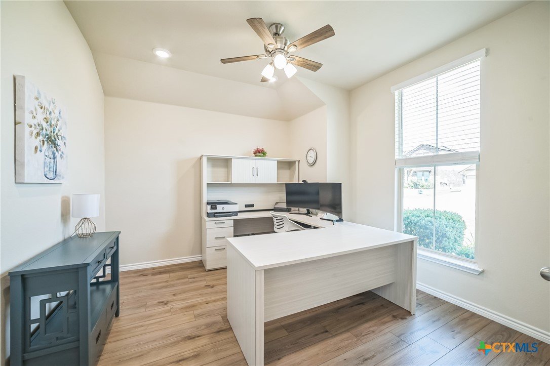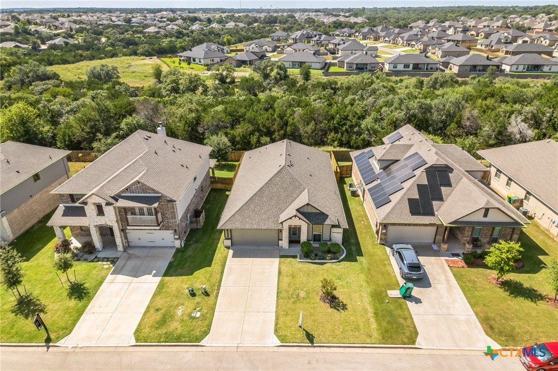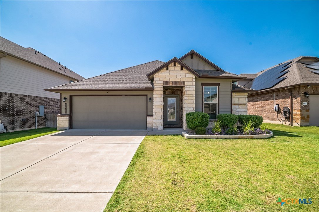 The green space lot and immaculate condition make this a buyer favorite! Look no further than the highly sought-after Three Creeks neighborhood, featuring a super clean, single-story home combining charm, functionality, and upgrades that the other homes can't touch. Nestled on a premier lot backing to dedicated green space, you'll enjoy the perfect blend of privacy and nature from a covered back patio with a ceiling fan, and the upgraded, extended patio area and fenced backyard; ideal for peaceful evenings or entertaining guests. The home has a thoughtfully designed floor plan with 3 spacious bedrooms, 2 full bathrooms, a dedicated office, large living and dining rooms that flow together, plus a versatile flex space between the secondary bedrooms ideal for crafts, homework, gaming, or a second office. Tall ceilings and the open-concept create a bright and airy atmosphere, where natural light streams through the dining window to the kitchen. A few key features include wood-look LVP floors throughout the home, with carpet in bedrooms. The kitchen offers a breakfast bar, counters topped with granite, stainless appliances, a slide-in double oven, pull-out tray slides in lower cabinets, and a large pantry. A spacious owner’s suite near the rear of the house is split from the secondary bedrooms and has a large ensuite with a separate soaking tub and shower, double vanities, and a large walk-in closet. Located in the award-winning Belton School District, this home is centrally located to major cities along the I-35 corridor, including Temple, Killeen, Salado, Georgetown, Austin, and Waco. The neighborhood features a wealth of outdoor amenities, including a private pavilion with tables, restrooms, and walking trails, and nearby Chalk Ridge Falls and stunning Stillhouse Hollow Lake. We promise, the picturesque lake views as you enter and exit the community create an immediate wow-factor and a desire to see that kind of beauty as often as you can.