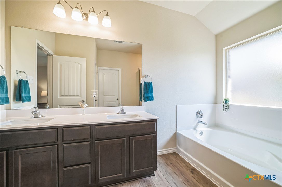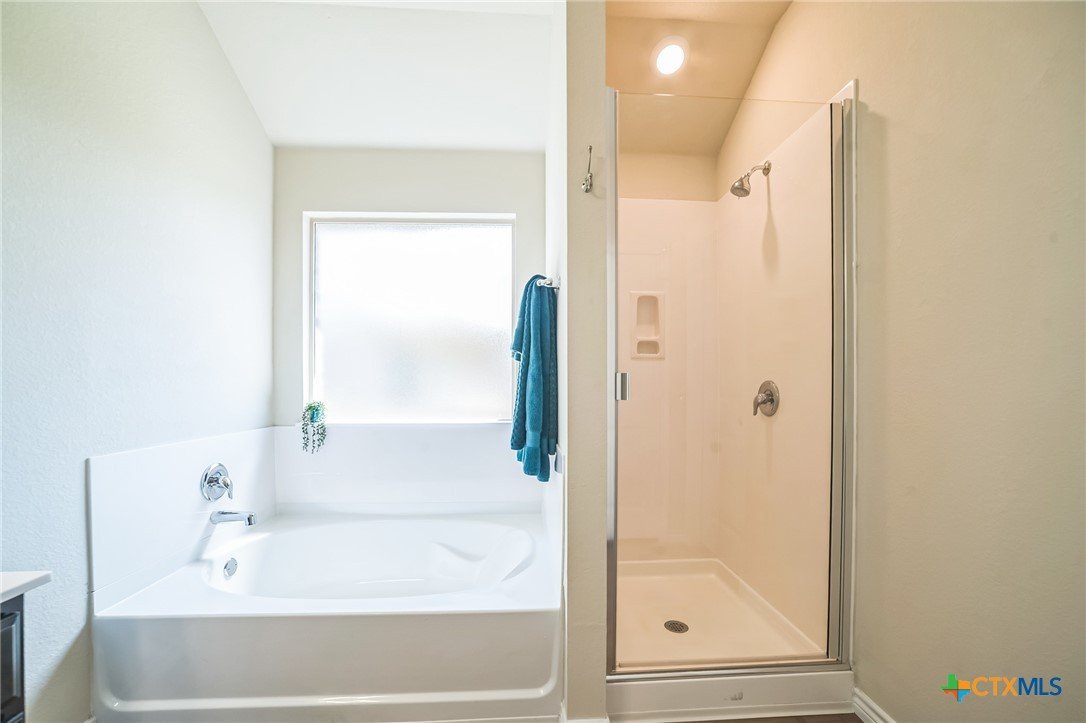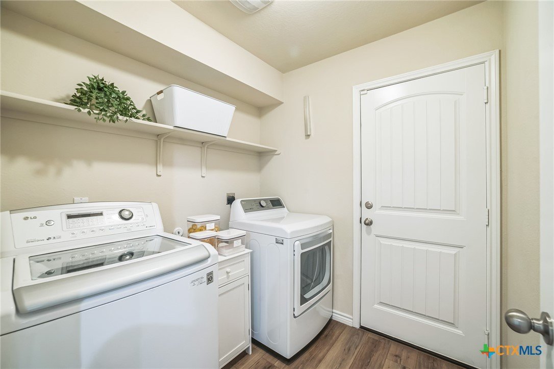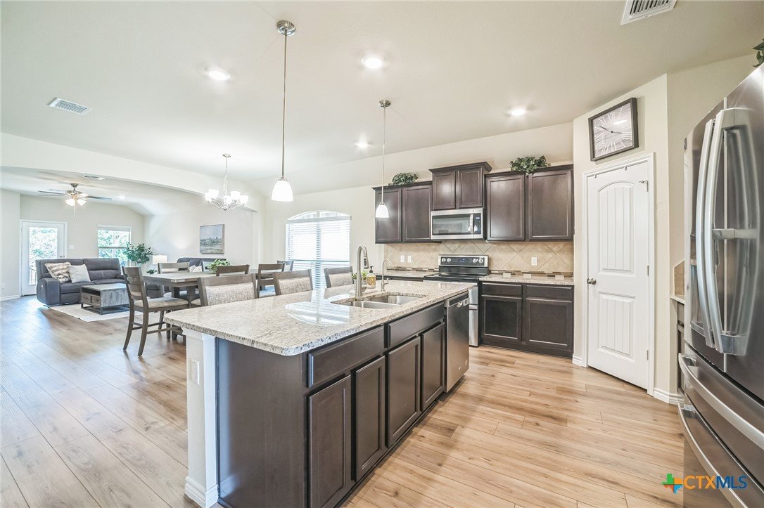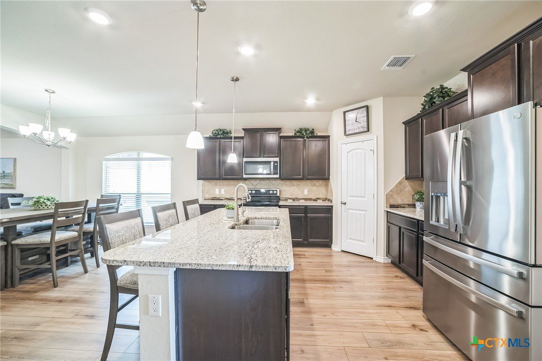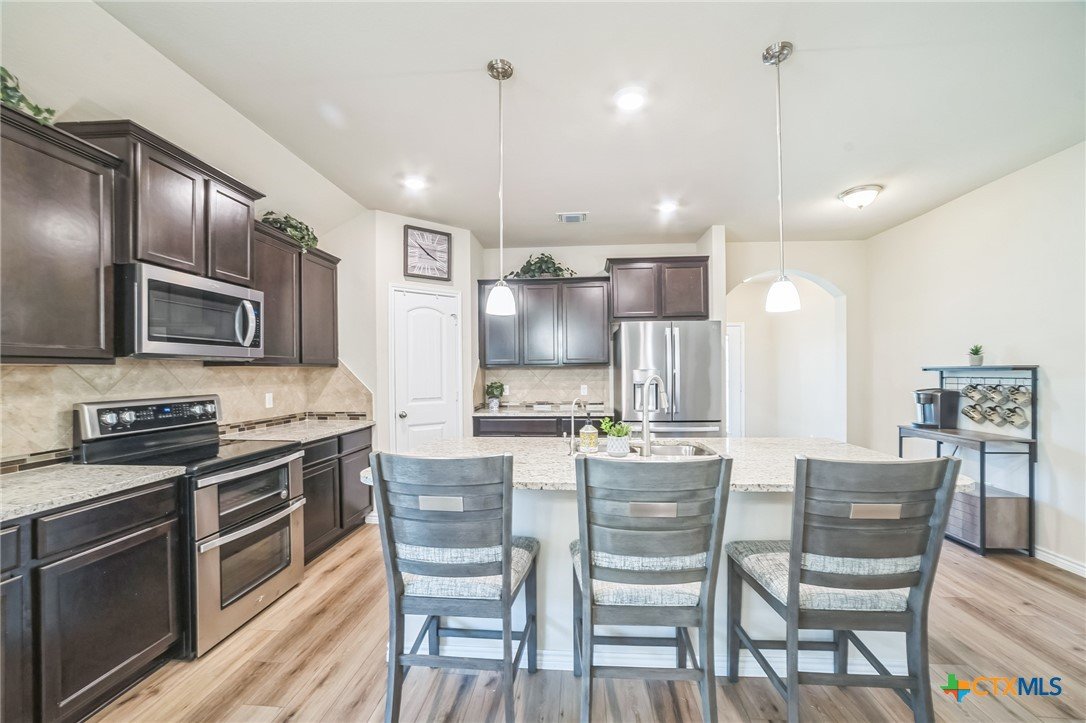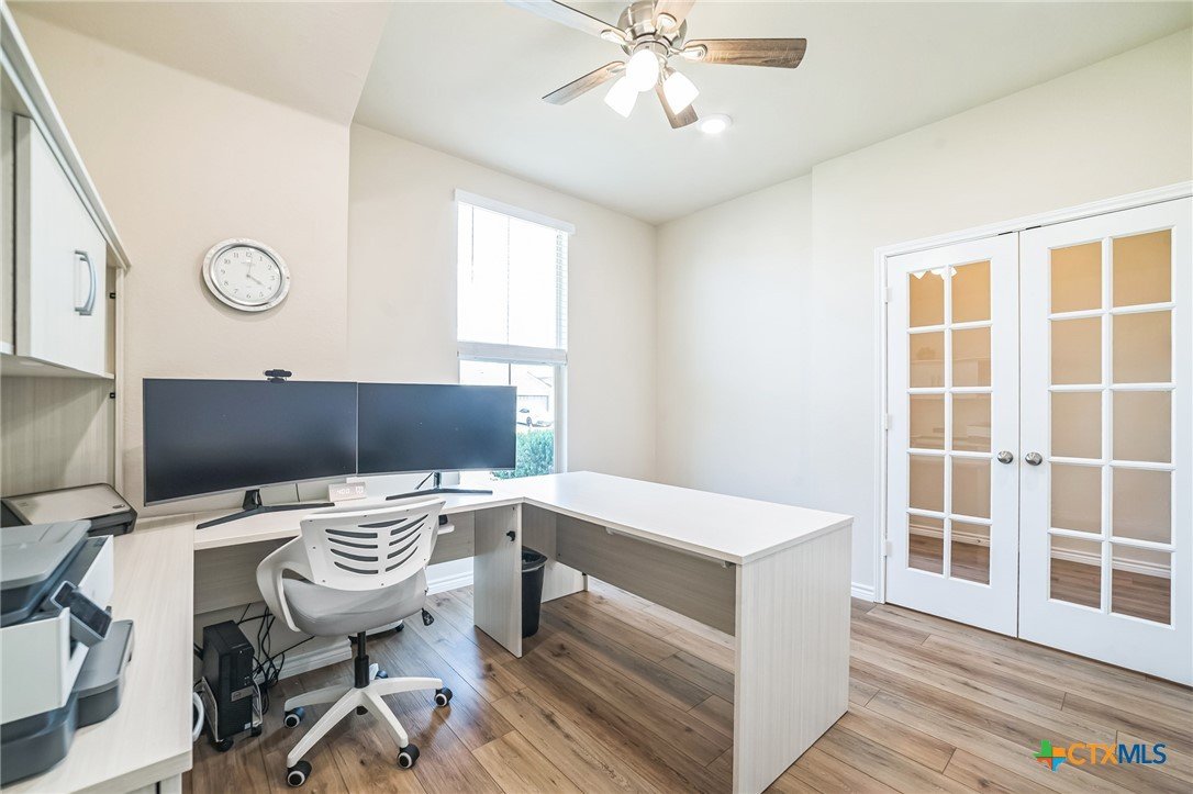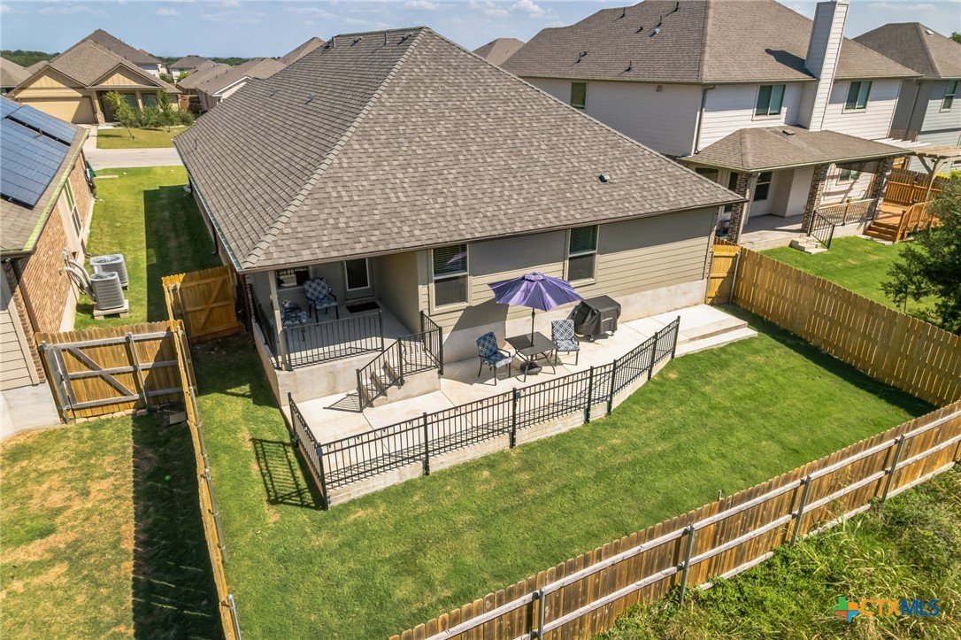 The green space lot and immaculate condition make this a buyer favorite! Look no further than the highly sought-after Three Creeks neighborhood, featuring a super clean, single-story home combining charm, functionality, and upgrades that the other homes can't touch. Nestled on a premier lot backing to dedicated green space, you'll enjoy the perfect blend of privacy and nature from a covered back patio with a ceiling fan, and the upgraded, extended patio area and fenced backyard; ideal for peaceful evenings or entertaining guests. The home has a thoughtfully designed floor plan with 3 spacious bedrooms, 2 full bathrooms, a dedicated office, large living and dining rooms that flow together, plus a versatile flex space between the secondary bedrooms ideal for crafts, homework, gaming, or a second office. Tall ceilings and the open-concept create a bright and airy atmosphere, where natural light streams through the dining window to the kitchen. A few key features include wood-look LVP floors throughout the home, with carpet in bedrooms. The kitchen offers a breakfast bar, counters topped with granite, stainless appliances, a slide-in double oven, pull-out tray slides in lower cabinets, and a large pantry. A spacious owner’s suite near the rear of the house is split from the secondary bedrooms and has a large ensuite with a separate soaking tub and shower, double vanities, and a large walk-in closet. Located in the award-winning Belton School District, this home is centrally located to major cities along the I-35 corridor, including Temple, Killeen, Salado, Georgetown, Austin, and Waco. The neighborhood features a wealth of outdoor amenities, including a private pavilion with tables, restrooms, and walking trails, and nearby Chalk Ridge Falls and stunning Stillhouse Hollow Lake. We promise, the picturesque lake views as you enter and exit the community create an immediate wow-factor and a desire to see that kind of beauty as often as you can.