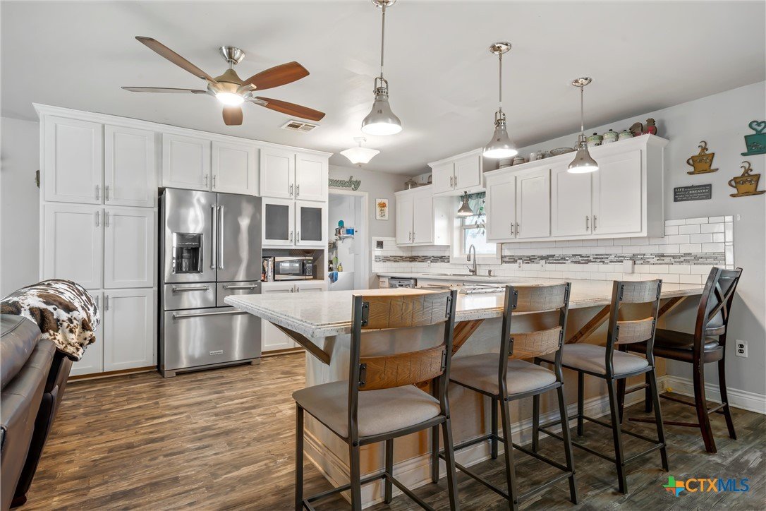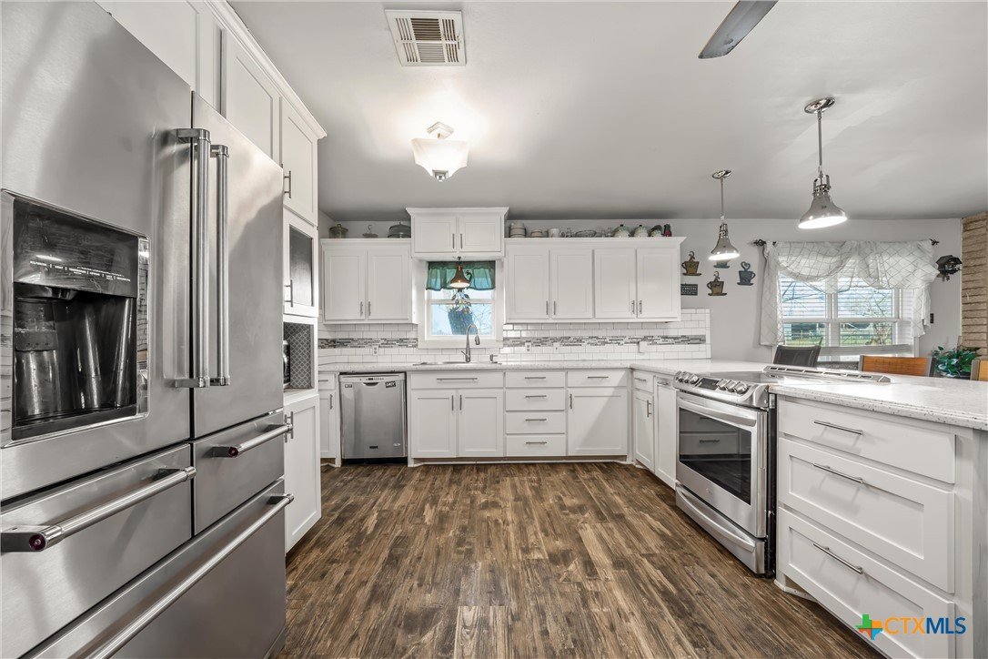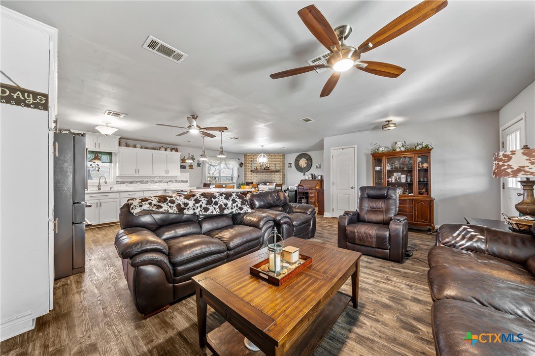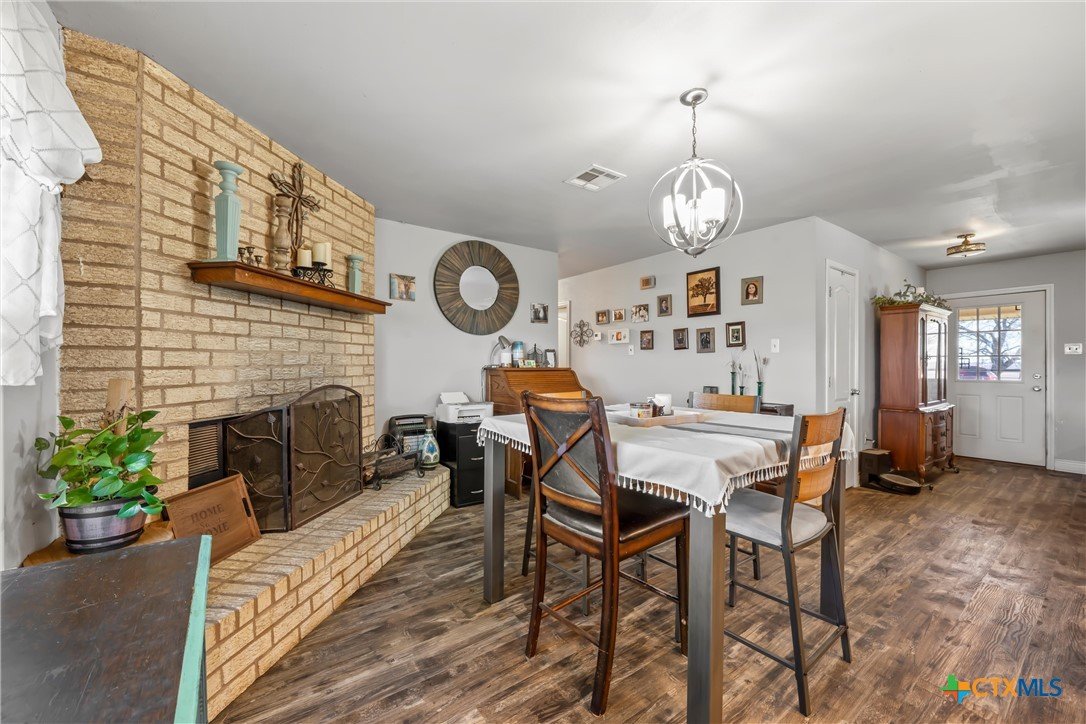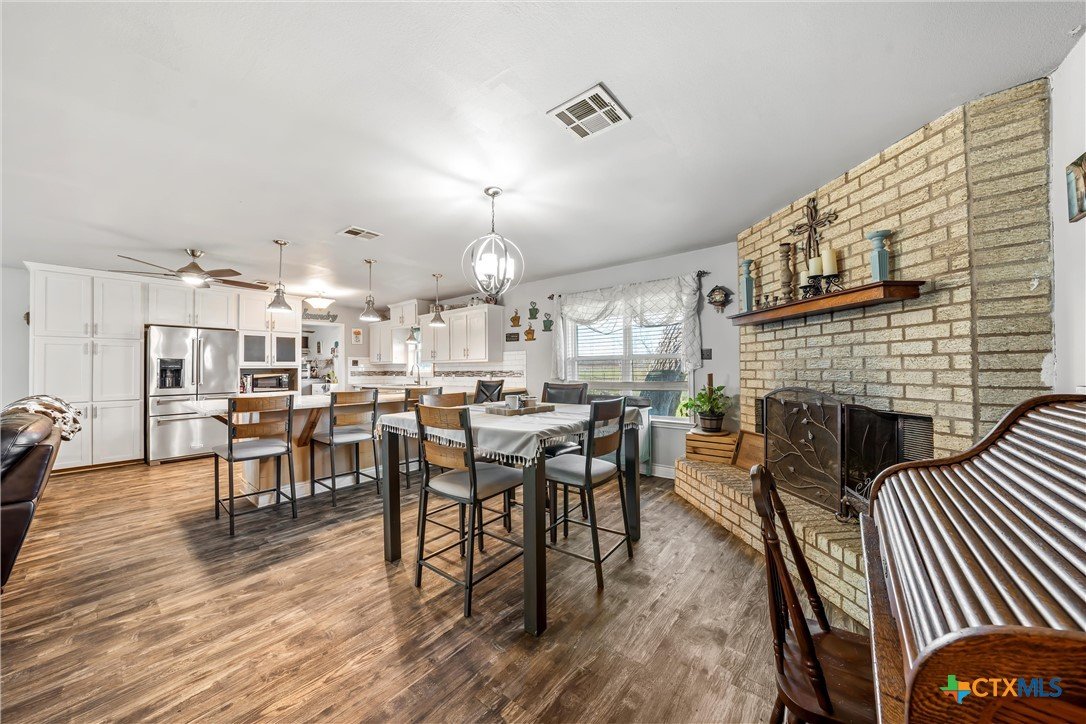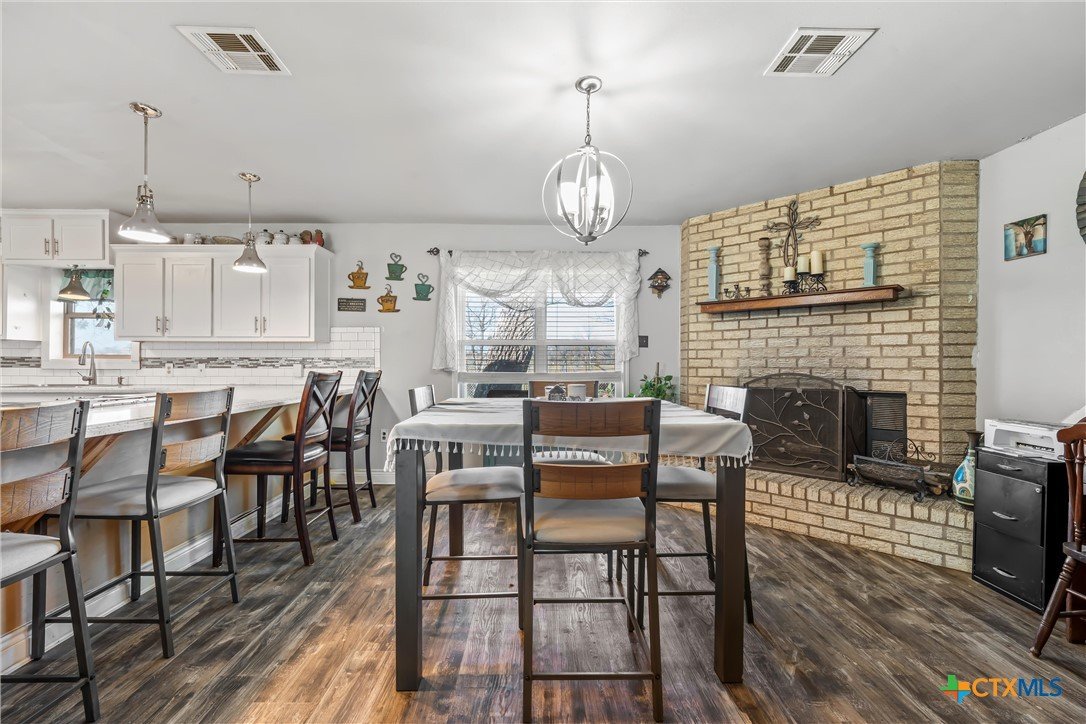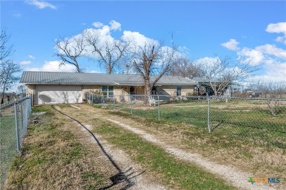 Discover the perfect blend of country charm and modern updates in this three-bedroom, two-bathroom brick home on approximately 7 acres of land in Chilton. This property offers a large barn, stock tank, and full fencing—ideal for those seeking tranquility and a connection to nature. Step into an open-concept living space where the living room, kitchen, and dining area flow seamlessly together, providing an inviting atmosphere for both relaxation and entertaining. The focal point of the living area is a striking corner wood-burning fireplace, offering warmth and character to the home. The kitchen is a true standout with its custom-built wood cabinetry, updated features, and durable vinyl laminate flooring that extends throughout the house for a cohesive and stylish look. The primary suite features a newly installed walk-in tile shower, adding a touch of luxury to your daily routine. Updated windows coupled with foam insulation ensure energy efficiency and comfort all year round, making this home as practical as it is beautiful. The home's exterior is a classic brick facade paired with a durable metal roof, providing both visual appeal and longevity. For outdoor enthusiasts, the property includes a spacious gazebo and a versatile greenhouse, perfect for gardening or simply enjoying the great outdoors. The expansive barn enhances the property's functionality, whether you're managing livestock or need extra storage space. This unique property in Chilton is more than just a home; it's an opportunity to embrace a lifestyle.