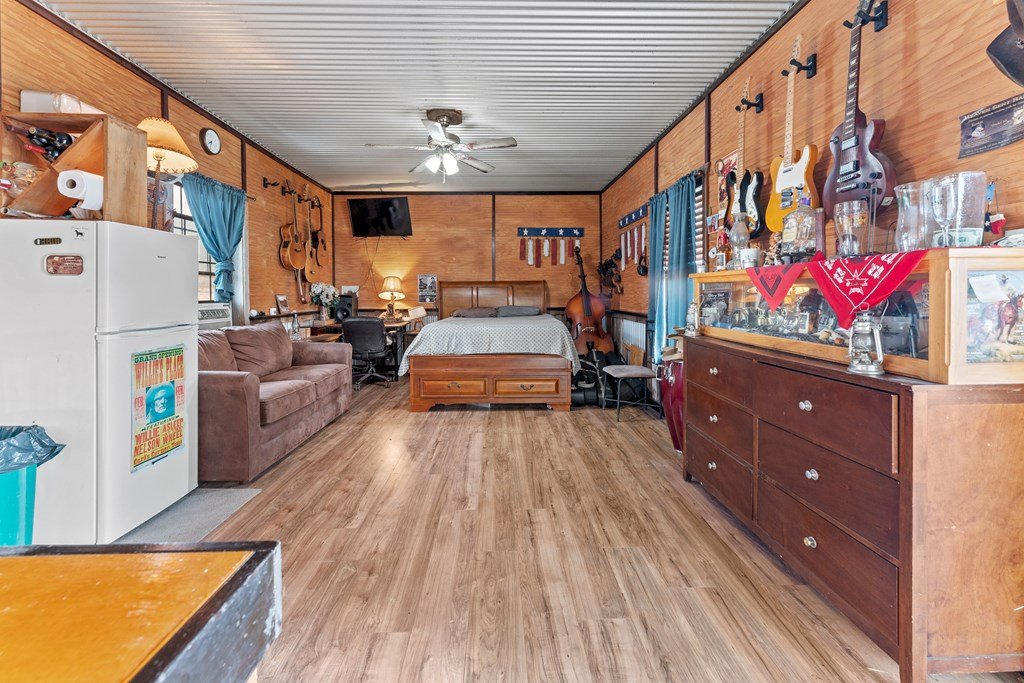 Tucked away just a mile down the road from the legendary Luckenbach, Texas, this scenic 8-acre property offers the perfect blend of rustic charm and modern convenience. The main home, built of stone and timber, features one oversized bedroom, two full bathrooms, and a spacious open-concept living and kitchen area-ideal for entertaining or simply soaking in the serene surroundings. Take in sweeping Hill Country views and stunning sunsets from both the front and back porches. Two charming guest cabins-currently leased month-to-month-provide immediate rental income potential or space for guests. A large barn offers ample storage, complemented by a two-car carport and a beautifully crafted stone tank house that serves as a utility room. Fully perimeter-fenced and surrounded by rolling hills, this property is a rare opportunity to own your own slice of Texas tranquility, with the music and magic of Luckenbach just down the road.