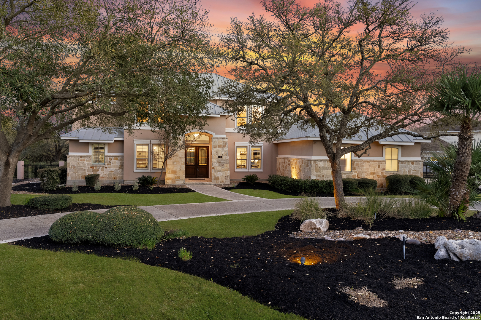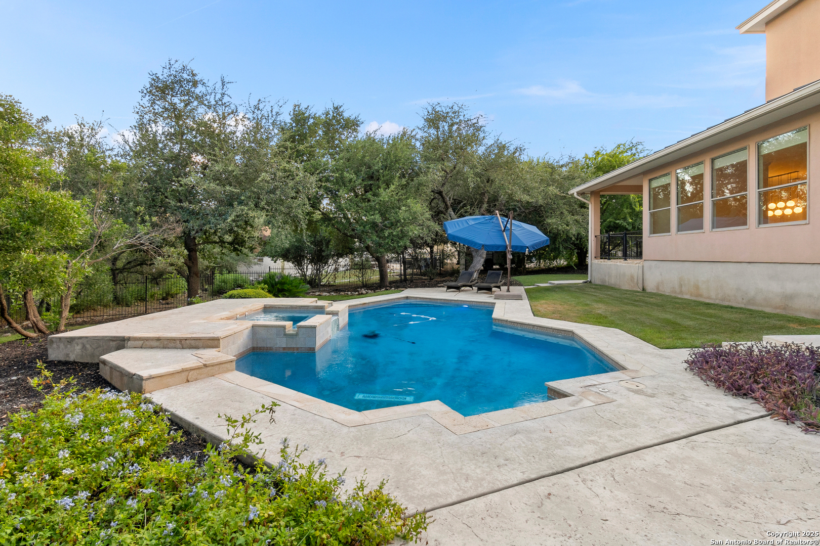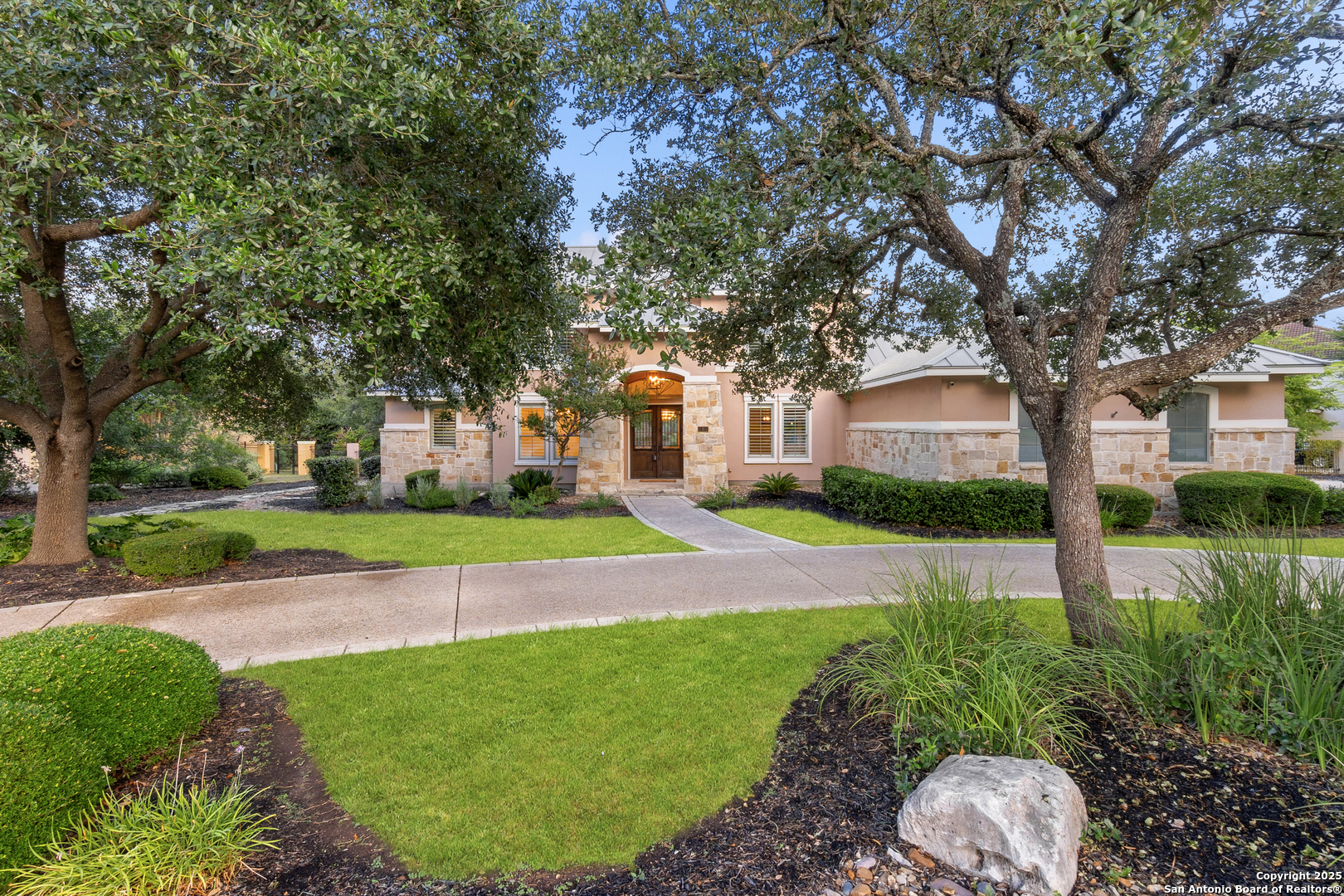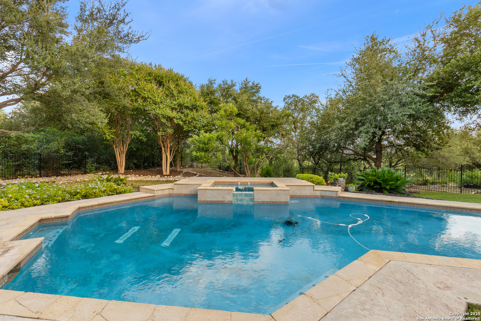 Set behind the gates of prestigious Champions Ridge in the heart of Stone Oak, 6 Champions Way blends timeless design with modern sophistication on a greenbelt lot. Updated with over $100,000 in enhancements since 2022 including a new AC unit 2025 with ten year warranty, new pool pump 2025, new carpet 2025, every detail has been curated for luxury living. Thoughtfully designed outdoor spaces include a pool with spa, covered patios, multiple balconies, and a lushly landscaped yard. Inside, Restoration Hardware lighting adds understated elegance. The gourmet kitchen features custom cabinetry, granite countertops, gas cooking, a butler's pantry, and seamless flow into the formal dining room and spacious family room with stone fireplace and built ins. The primary suite is a true retreat with its own private patio, spa like bathroom, and a generously sized walk in closet. A secondary bedroom or study, completes the first floor. Upstairs, you'll find three expansive bedrooms, a large game room with balcony, and a media room. Kitchen refrigerator, beverage fridge, media room equipment, wine fridge, washer and dryer convey. Recent updates include neutral interior paint, plantation shutters, motorized blinds, and extensive landscaping. Additional features include a circular drive and an oversized three car garage with epoxy flooring. Set within a guard gated community, close to the soon to be developed Mercantile shopping area, and zoned to top rated schools, 6 Champions Way presents an exceptional lifestyle opportunity in one of San Antonio's most sought after neighborhoods.