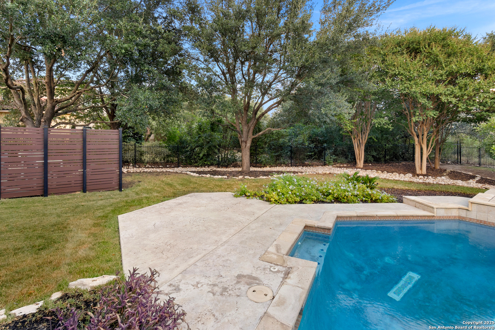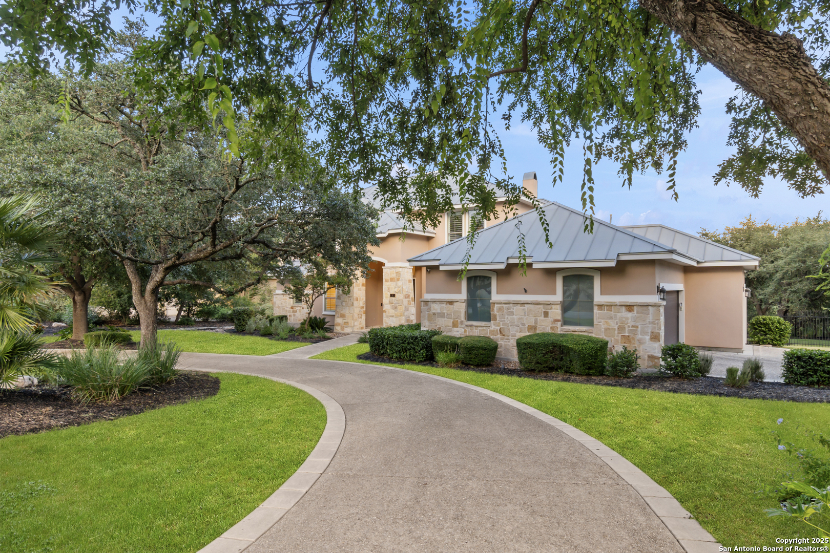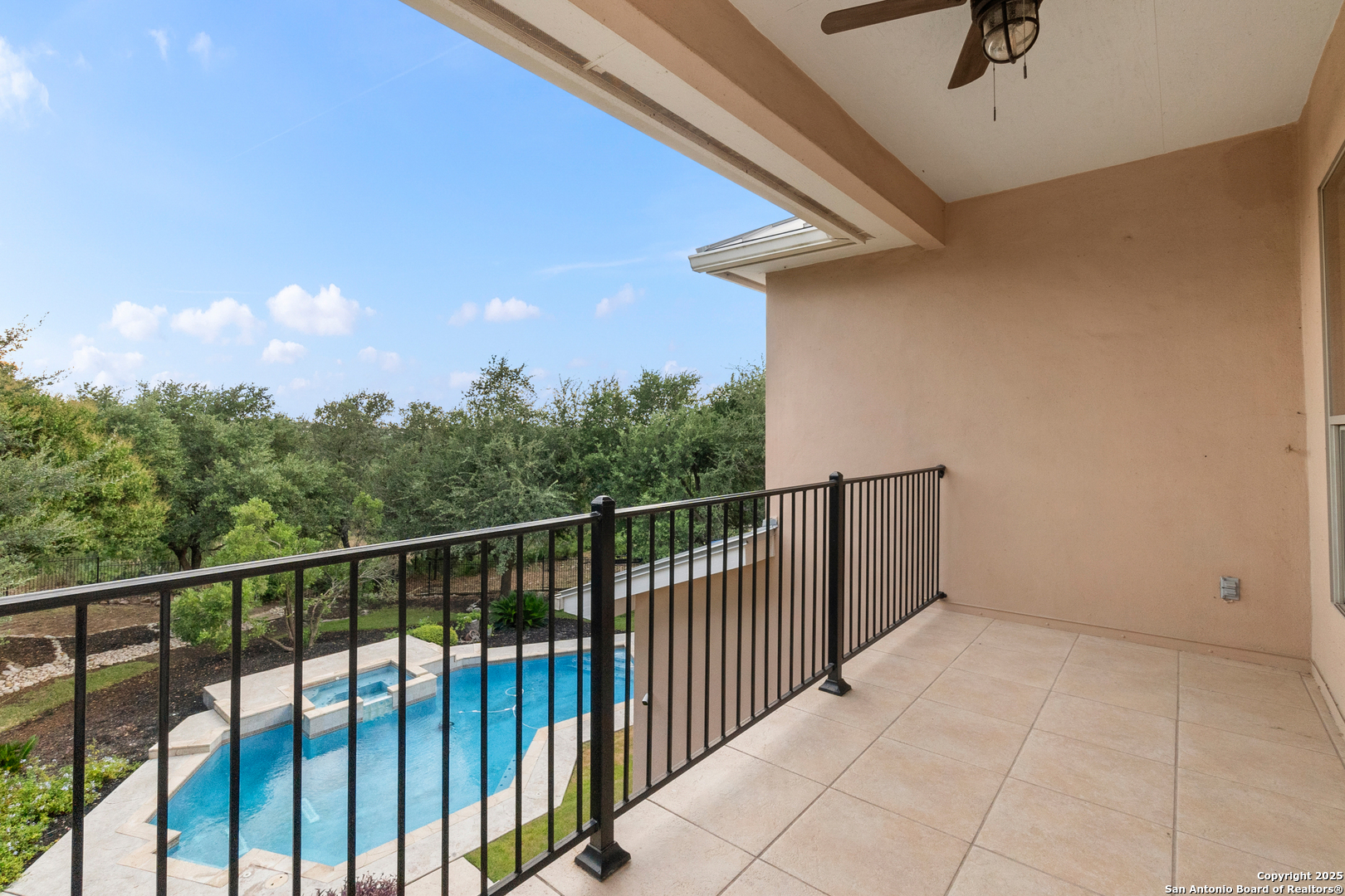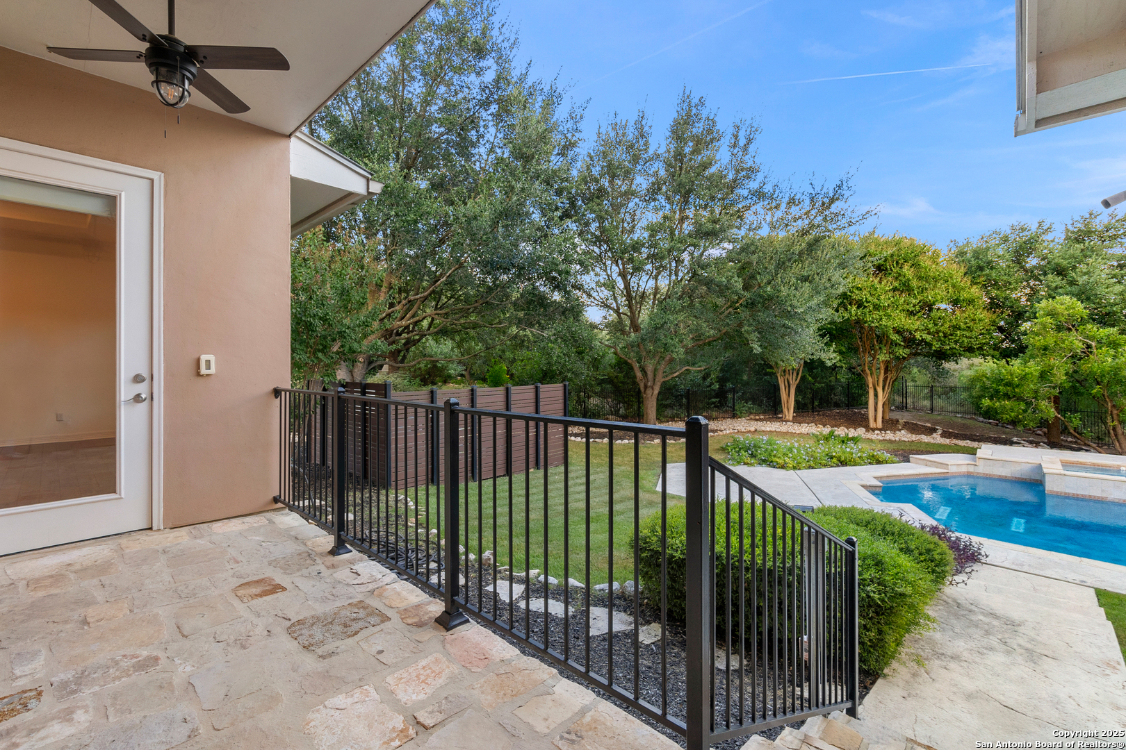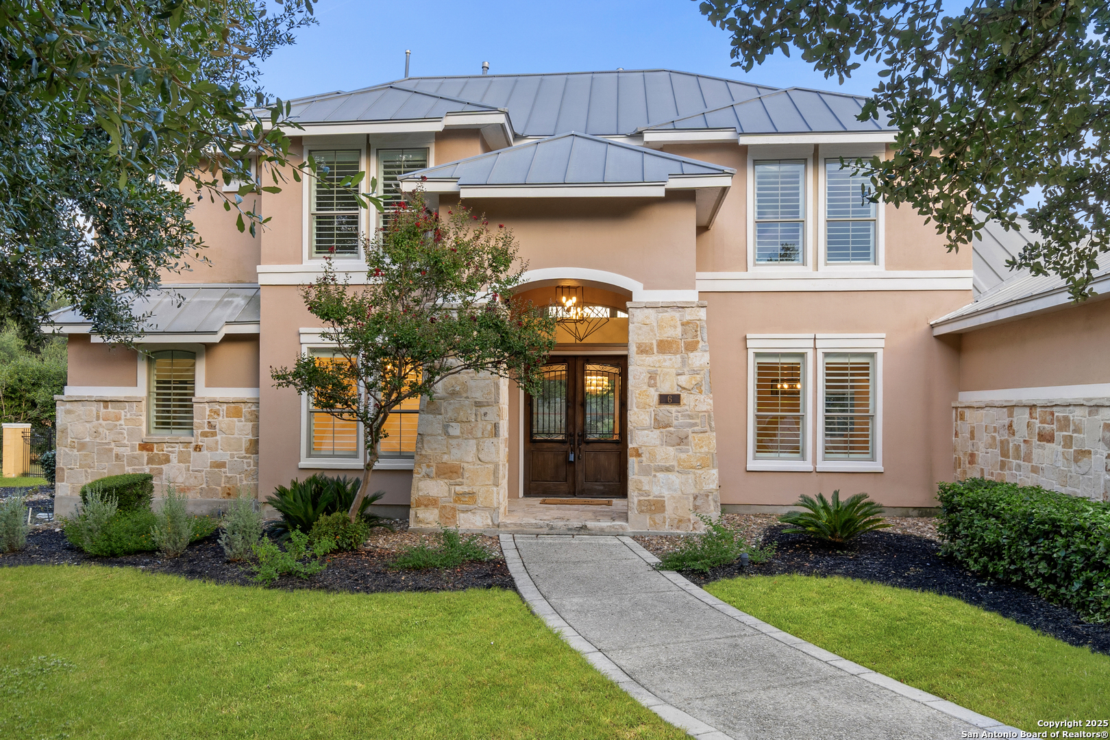 Set behind the gates of prestigious Champions Ridge in the heart of Stone Oak, 6 Champions Way blends timeless design with modern sophistication on a greenbelt lot. Updated with over $100,000 in enhancements since 2022 including a new AC unit 2025 with ten year warranty, new pool pump 2025, new carpet 2025, every detail has been curated for luxury living. Thoughtfully designed outdoor spaces include a pool with spa, covered patios, multiple balconies, and a lushly landscaped yard. Inside, Restoration Hardware lighting adds understated elegance. The gourmet kitchen features custom cabinetry, granite countertops, gas cooking, a butler's pantry, and seamless flow into the formal dining room and spacious family room with stone fireplace and built ins. The primary suite is a true retreat with its own private patio, spa like bathroom, and a generously sized walk in closet. A secondary bedroom or study, completes the first floor. Upstairs, you'll find three expansive bedrooms, a large game room with balcony, and a media room. Kitchen refrigerator, beverage fridge, media room equipment, wine fridge, washer and dryer convey. Recent updates include neutral interior paint, plantation shutters, motorized blinds, and extensive landscaping. Additional features include a circular drive and an oversized three car garage with epoxy flooring. Set within a guard gated community, close to the soon to be developed Mercantile shopping area, and zoned to top rated schools, 6 Champions Way presents an exceptional lifestyle opportunity in one of San Antonio's most sought after neighborhoods.