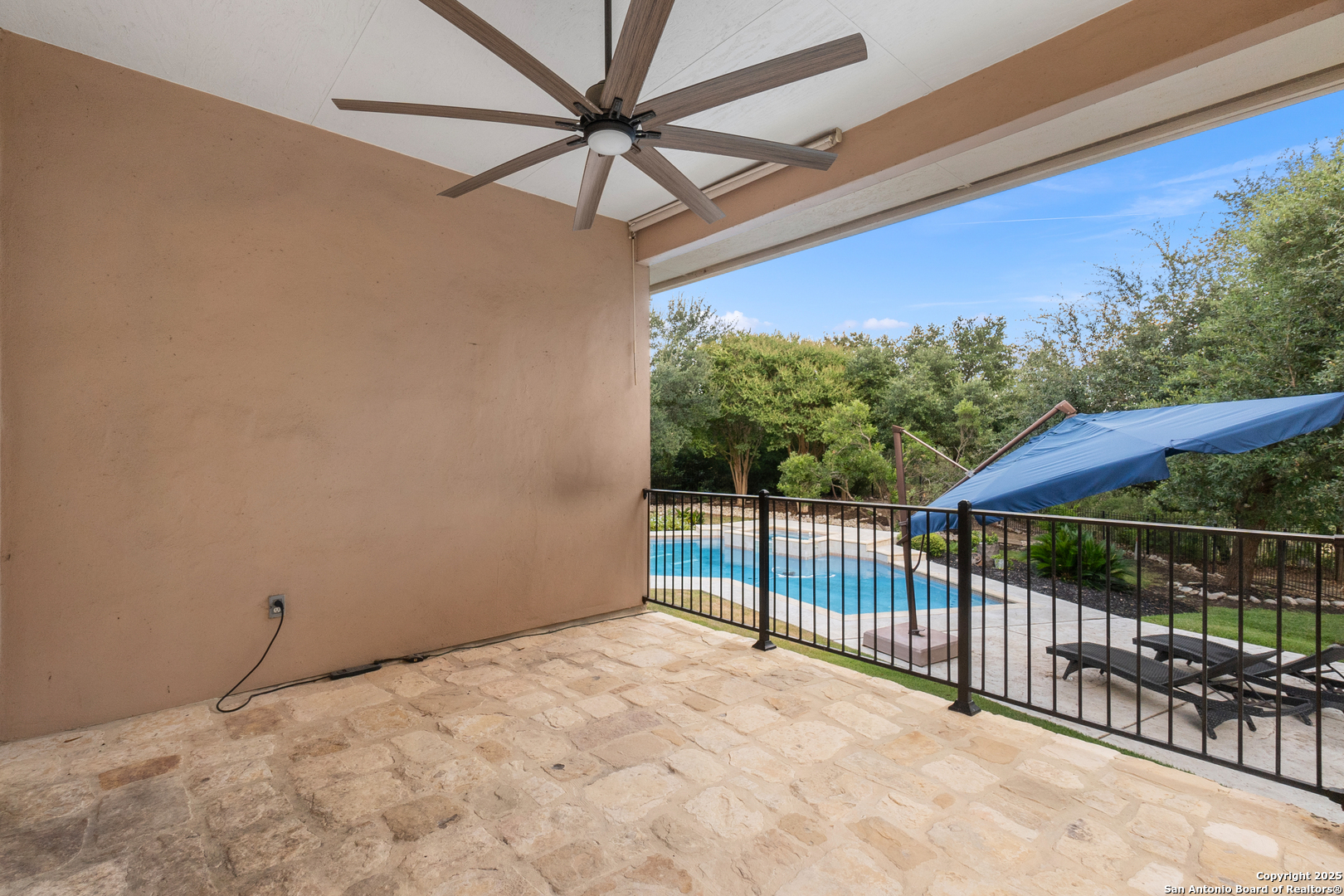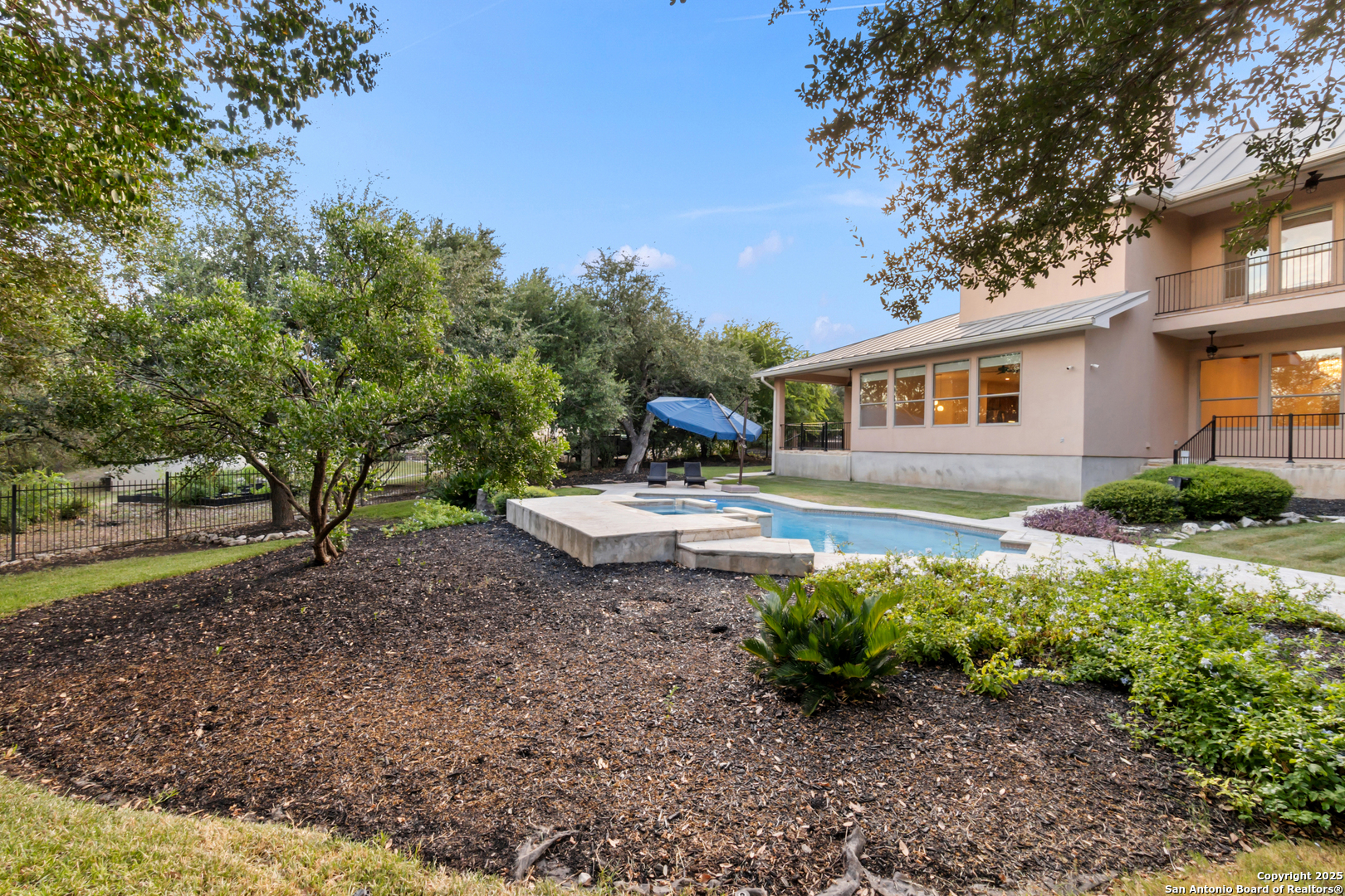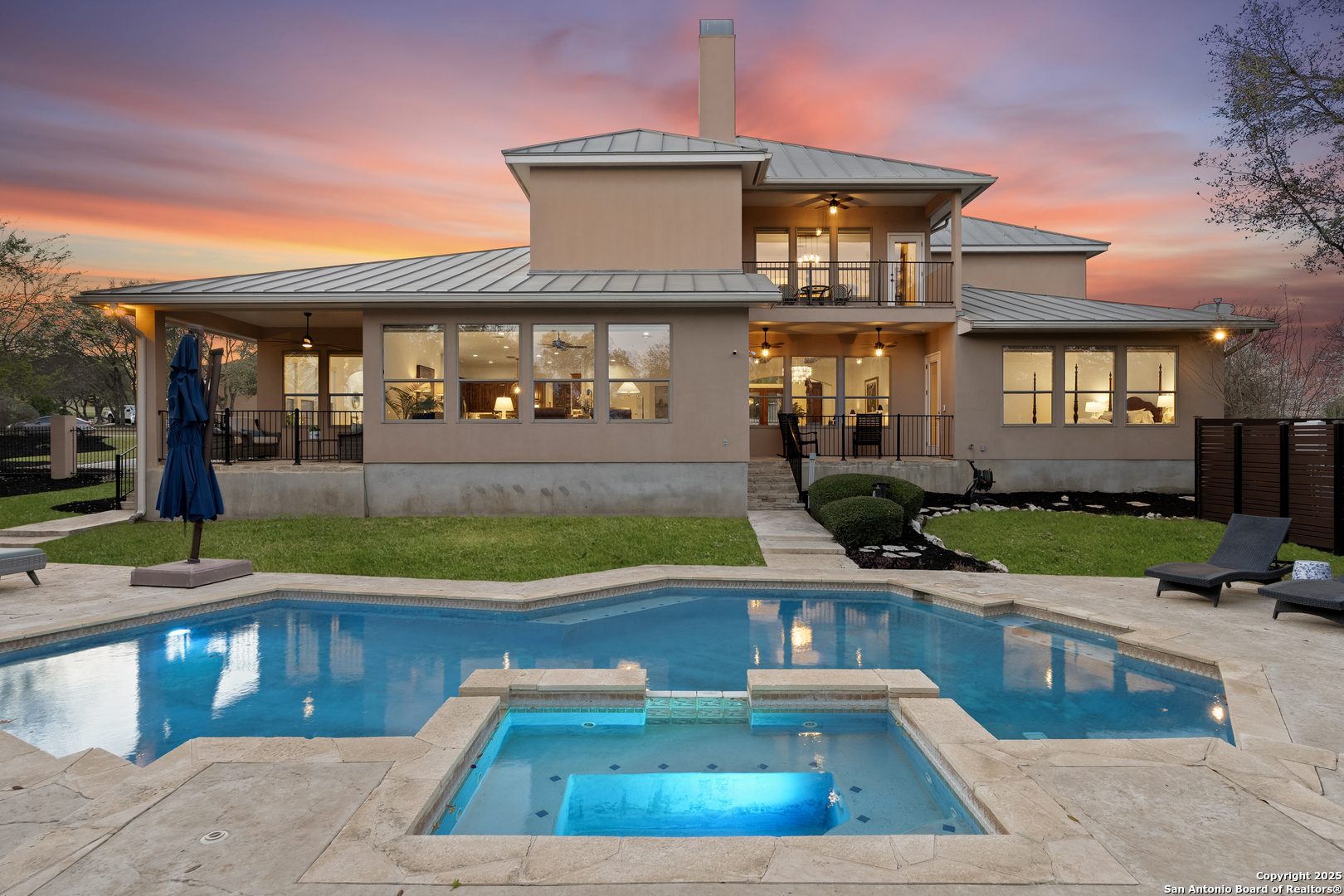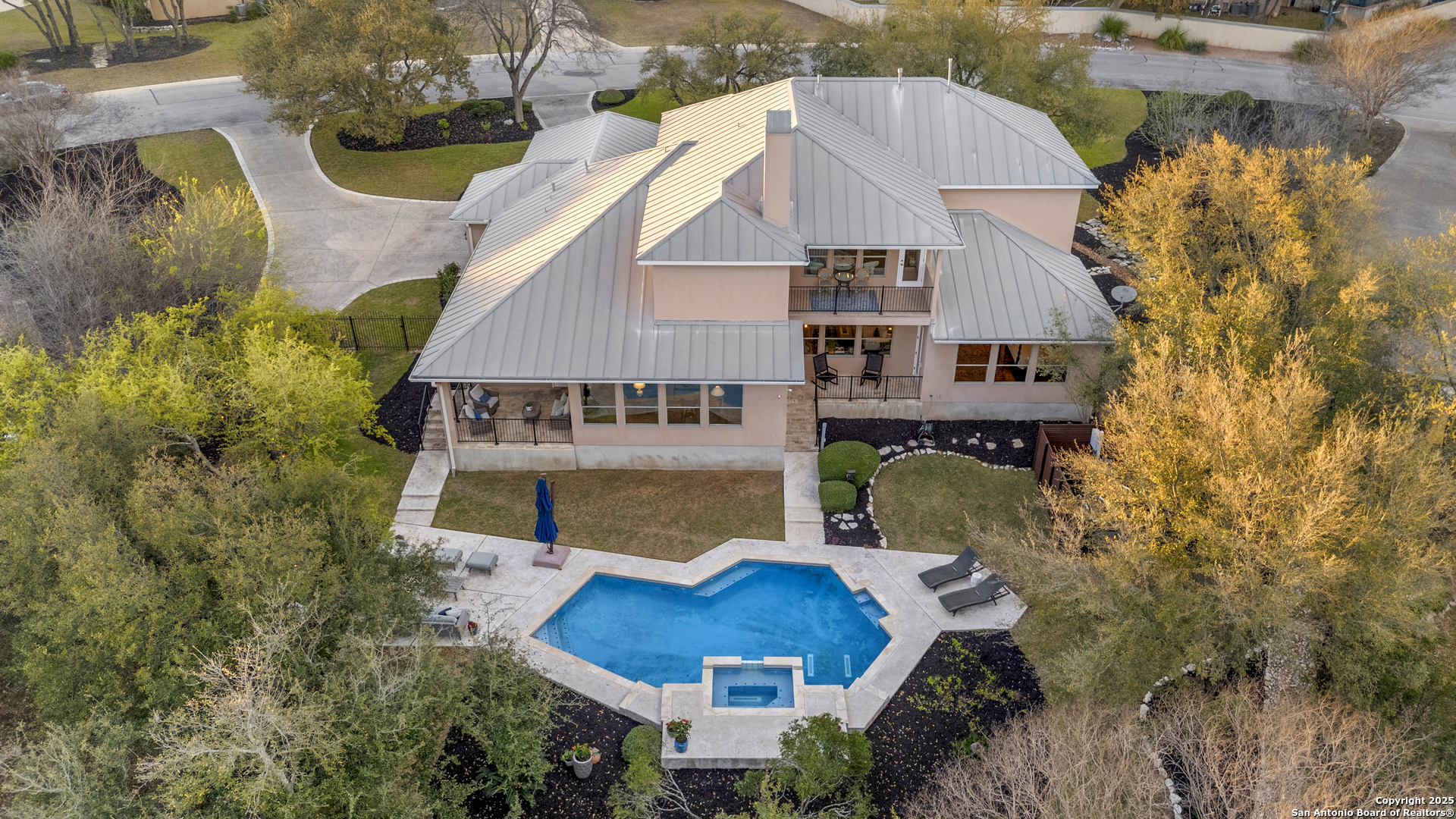 Set behind the gates of prestigious Champions Ridge in the heart of Stone Oak, 6 Champions Way blends timeless design with modern sophistication on a greenbelt lot. Updated with over $100,000 in enhancements since 2022 including a new AC unit 2025 with ten year warranty, new pool pump 2025, new carpet 2025, every detail has been curated for luxury living. Thoughtfully designed outdoor spaces include a pool with spa, covered patios, multiple balconies, and a lushly landscaped yard. Inside, Restoration Hardware lighting adds understated elegance. The gourmet kitchen features custom cabinetry, granite countertops, gas cooking, a butler's pantry, and seamless flow into the formal dining room and spacious family room with stone fireplace and built ins. The primary suite is a true retreat with its own private patio, spa like bathroom, and a generously sized walk in closet. A secondary bedroom or study, completes the first floor. Upstairs, you'll find three expansive bedrooms, a large game room with balcony, and a media room. Kitchen refrigerator, beverage fridge, media room equipment, wine fridge, washer and dryer convey. Recent updates include neutral interior paint, plantation shutters, motorized blinds, and extensive landscaping. Additional features include a circular drive and an oversized three car garage with epoxy flooring. Set within a guard gated community, close to the soon to be developed Mercantile shopping area, and zoned to top rated schools, 6 Champions Way presents an exceptional lifestyle opportunity in one of San Antonio's most sought after neighborhoods.
