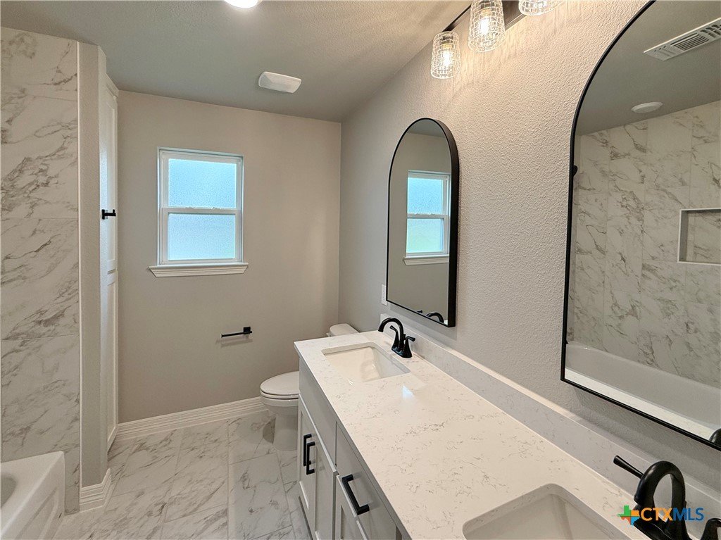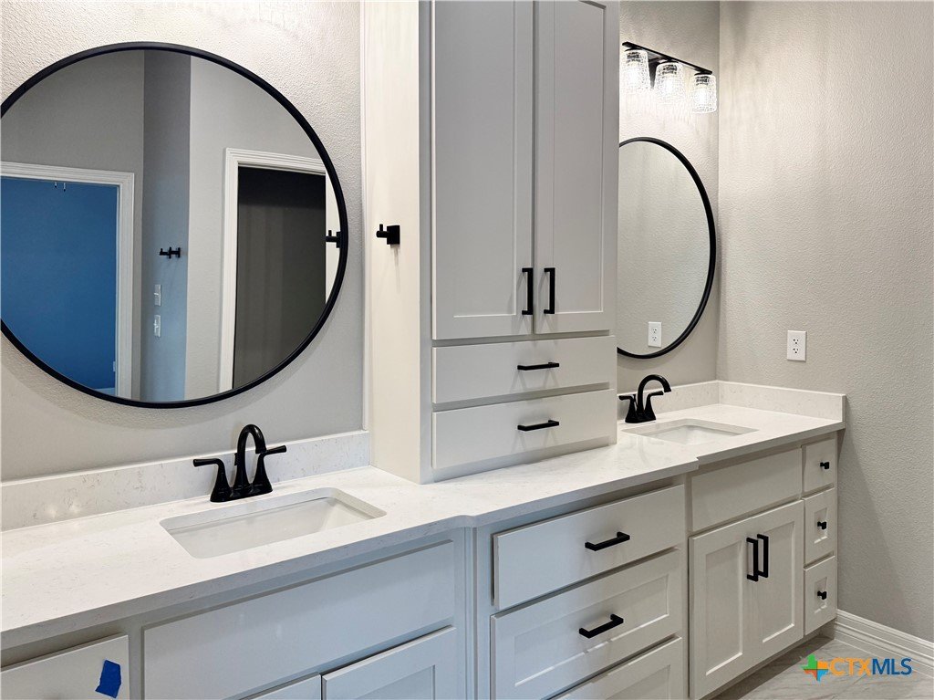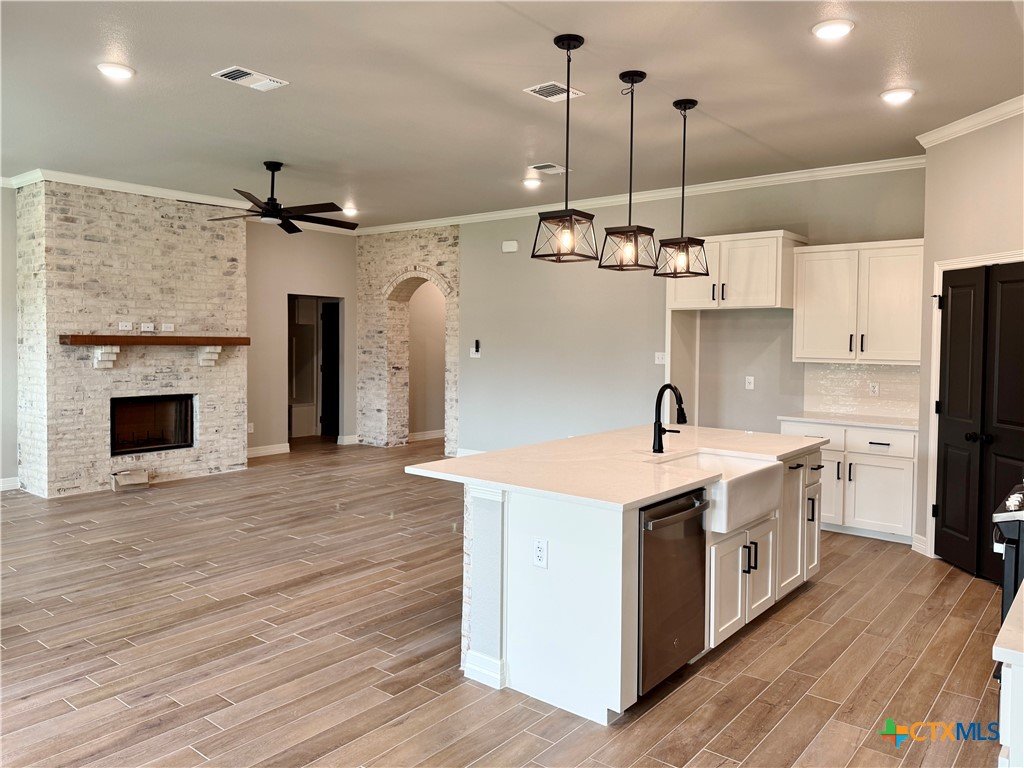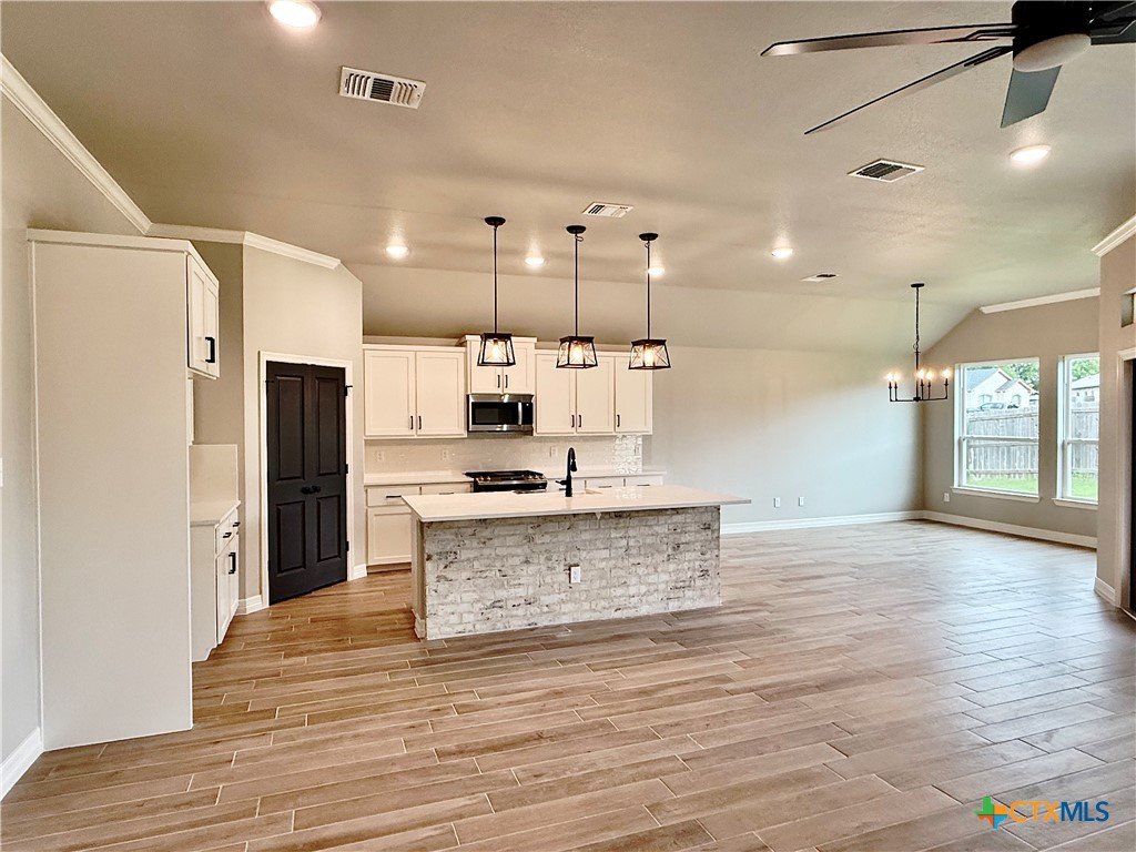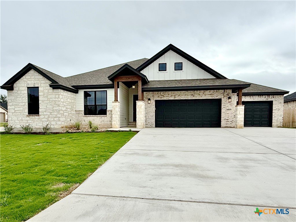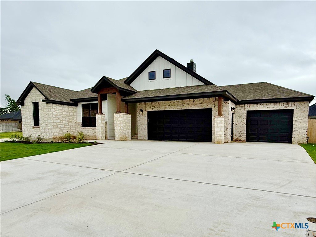 New 4Bd/2.5Ba home by Hodges Eagle Ridge Builders, Inc. in Bella Terra. Master suite has double vanities, large tiled shower and a walk-in closet, 4th bedroom could be study, mud area, crown molding, fireplace, quartz counters, island in kitchen with breakfast bar, pendant lights, farm sink, gas range, walk-in pantry, foamed insulation, interior brick accents, covered patio, 3 car attached garage, full sod/sprinkler, cedar accents, and privacy fence. Subdivision has park area and pool.