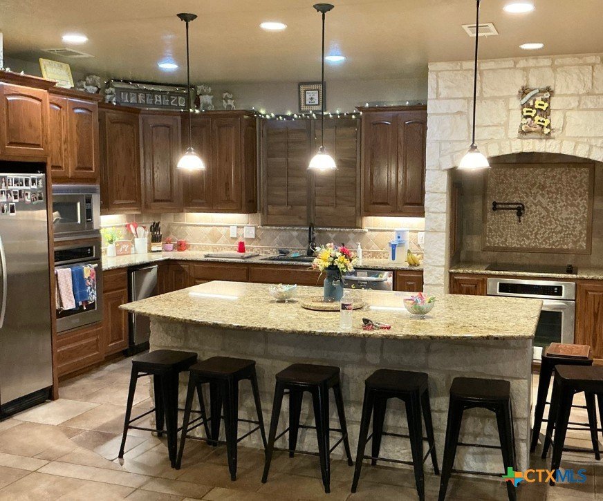 So much to see in this custom-built 5 bedroom, 4 bath home on an oversized lot just minutes from downtown Stockdale shops and restaurants. The spacious downstairs area includes a comfortable sitting room, French-door access playroom, office with built-ins, and breakfast nook in addition to an open floor-plan living, dining, and kitchen area. the kitchen includes a large island for prep space, stove with pot-filler, and butler's pantry with built-ins. All of the bedrooms are upstairs including the primary bedroom, bathroom with walk-in shower and double vanities, and custom built closet. The third bedroom could be used as secondary primary with on-suite bathroom and walk-in closet. The detached 800 sq feet shop/garage has electric and has been partially insulated for potential additional dwelling.