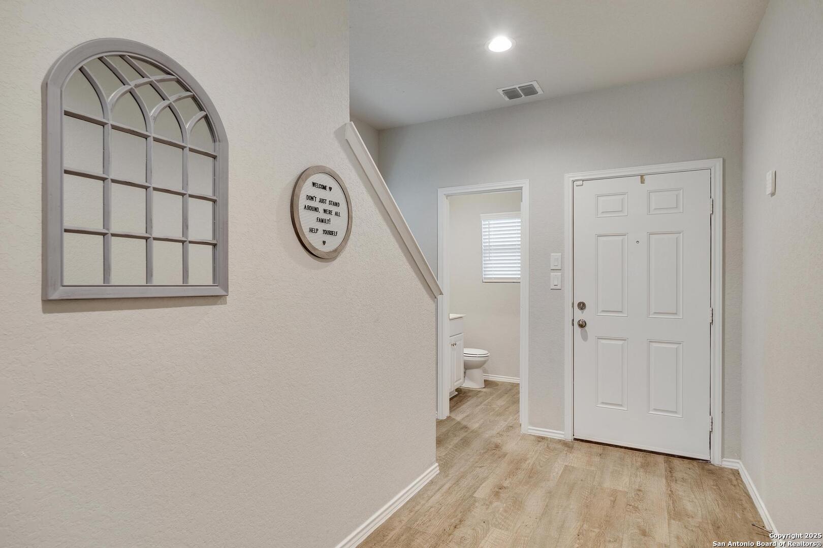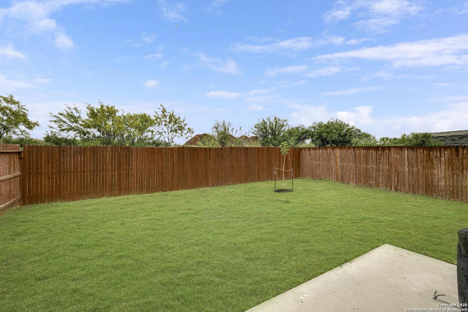 You'll enjoy living in this well-designed two-story home featuring thoughtful details and modern finishes. Located near major highways, and a growing dining and shopping scene, this home should be a good investment for years to come. The first floor offers a convenient powder bath near the entry, a well-placed coat closet, and easy-care vinyl wood-look flooring throughout. The kitchen includes stylish white cabinets with crown molding, durable granite countertops, and a double-door pantry that provides plenty of storage. A stainless steel Frigidaire appliance package includes a five-burner smooth-top range with a vent hood above. Outside, privacy is a standout feature, with greenbelt space on two sides of the home-meaning no immediate neighbors behind or next door. (Grass color enhanced) Upstairs, you'll find an oversized linen closet and extended bathroom countertops with knee space-ideal for makeup application or added functionality. Other touches throughout the home include five-panel interior doors, rocker-style light switches, and attractive sconce lighting along the stairway. Energy-efficient vinyl windows and 9-foot ceilings on the first floor add to the home's comfort and appeal. Enjoy the outdoors with a fully fenced backyard and a patio slab-perfect for relaxing or entertaining. Homes in this price range that are only five years old tend to sell quickly, so schedule your visit soon! [Grass color enhanced]